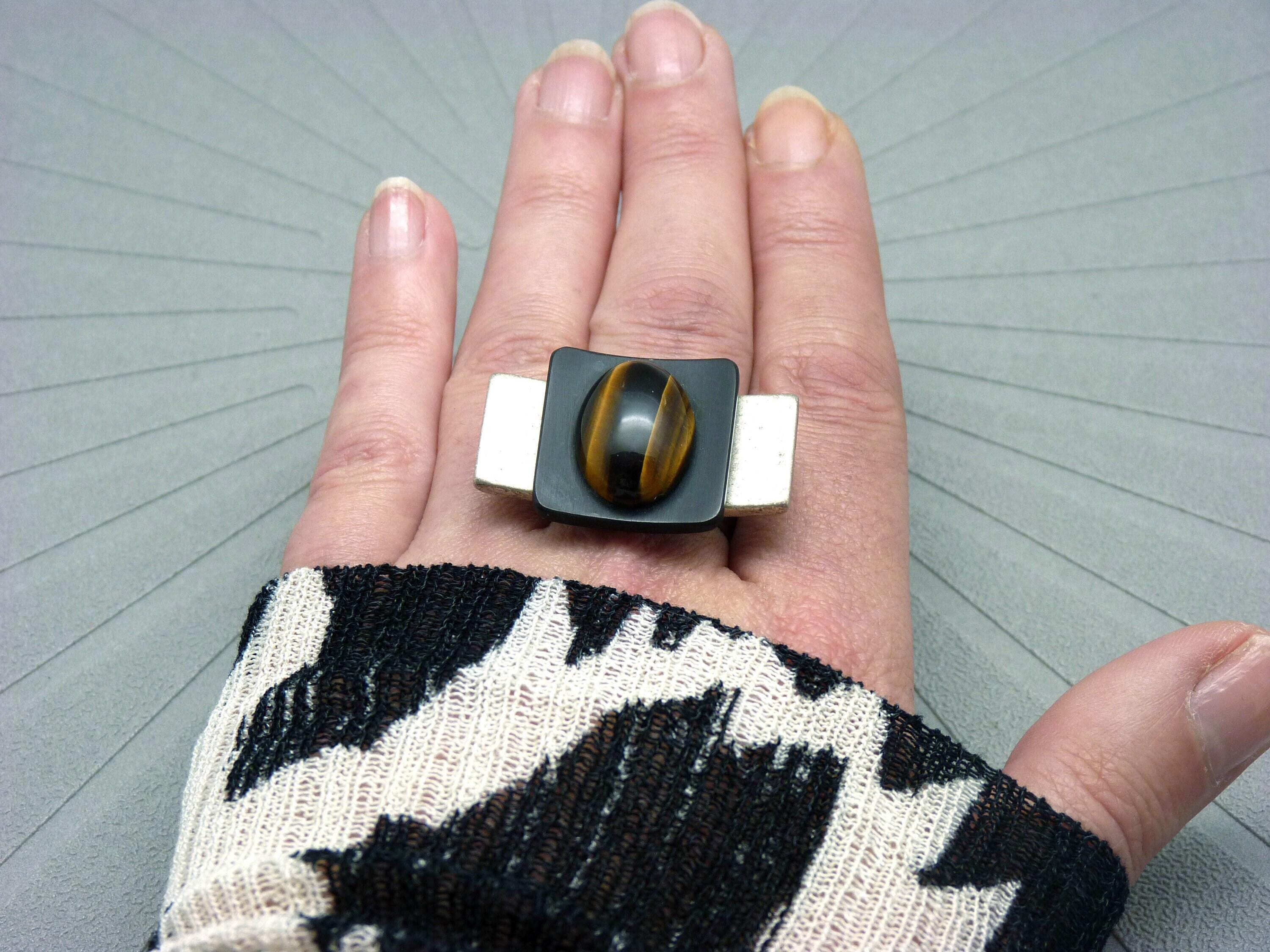Antique matte silver ring in a curved, rectangular metal band that sits horizontally across the hand. It features a curved square of black horn and a brown and ochre tiger's eye semi-precious stone. Its horizontal shape is unique, reflecting a minimalist and ethnic aesthetic.