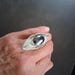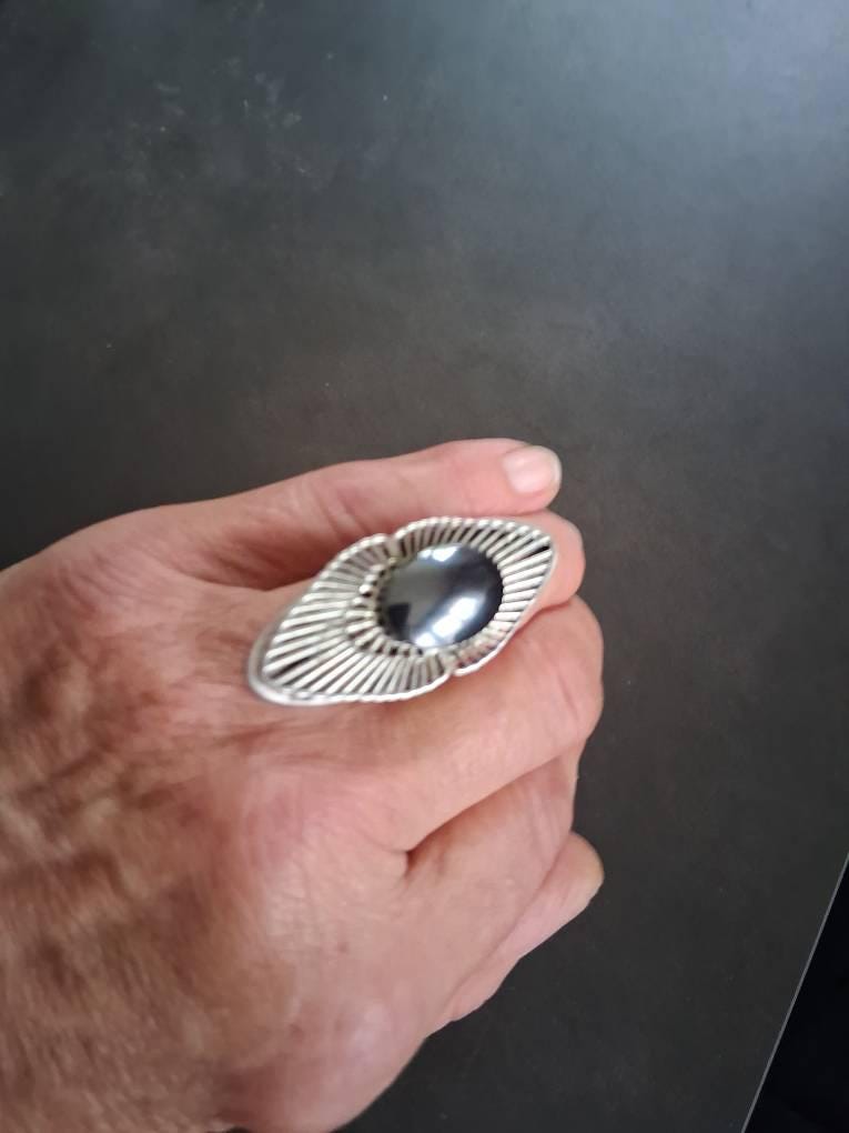 Long ring in aged silver with hammered metallic resin and semi-precious hematite stone in grey silver. Graphic openwork metal piece with art deco style stripes.