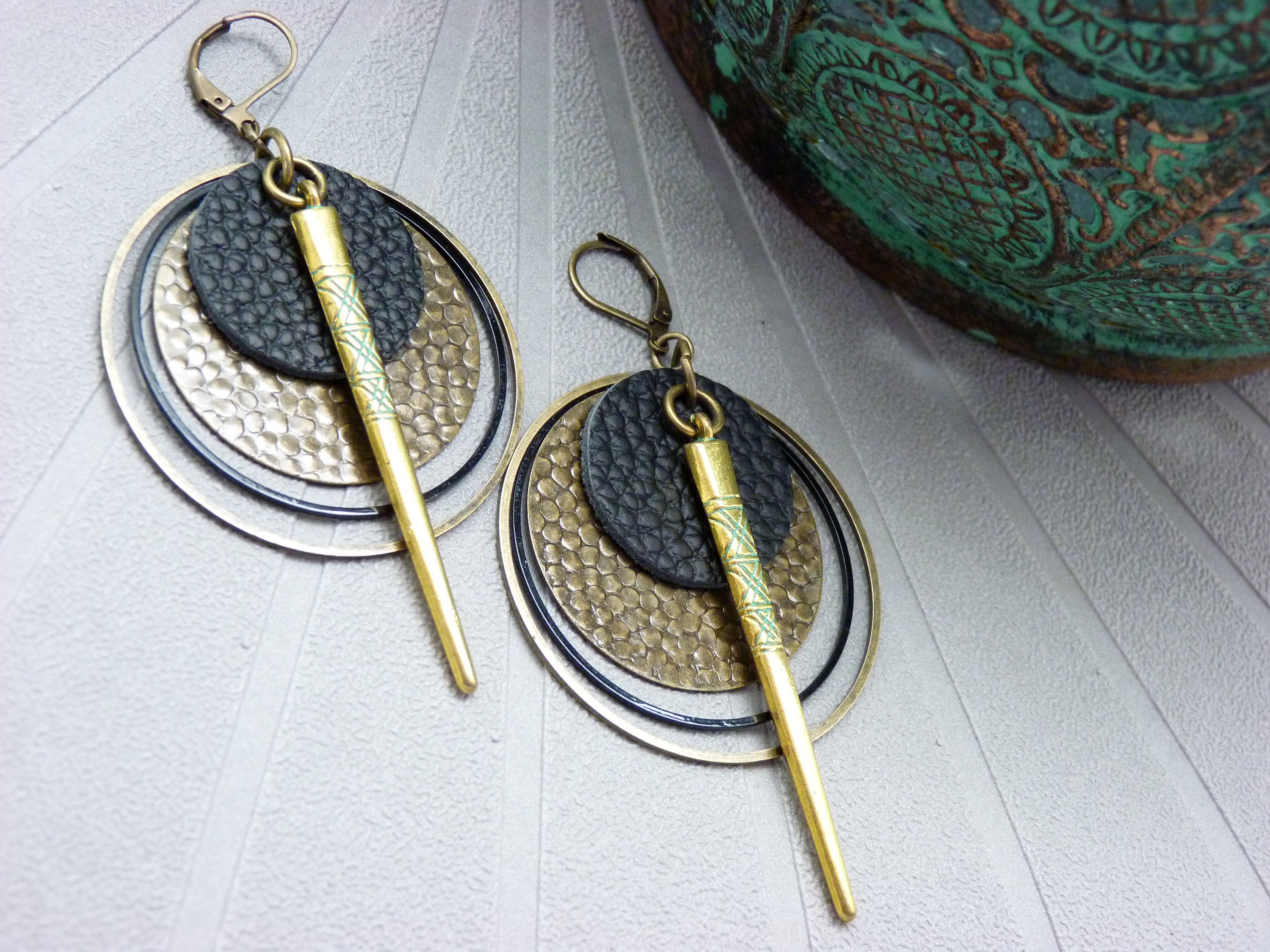 These bronze metal hoop earrings consist of round circles of different sizes and a hammered bronze metal disc.