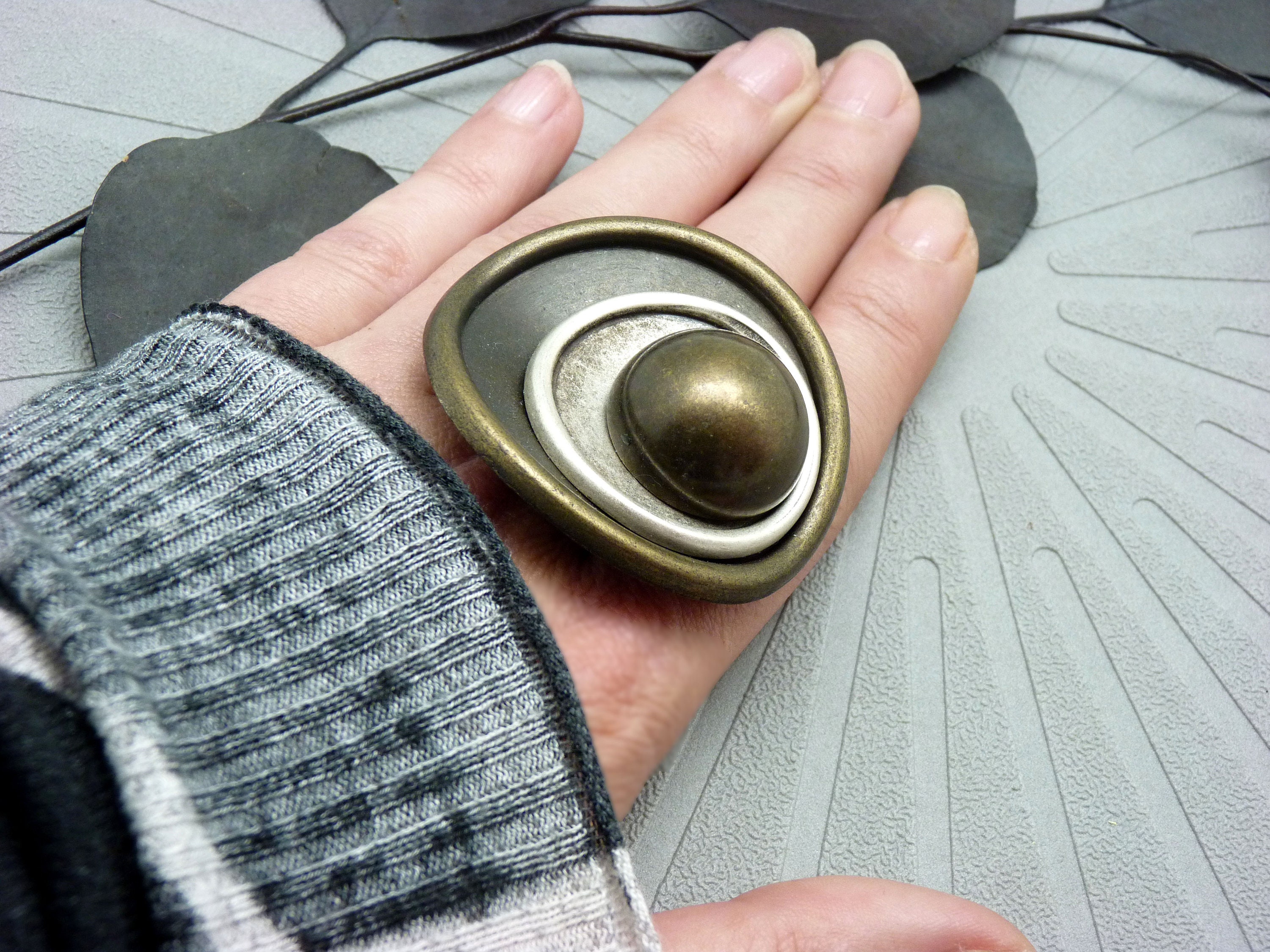 An XXL ring where bronze and silver metal domes fit together to create a pure and powerful design piece.