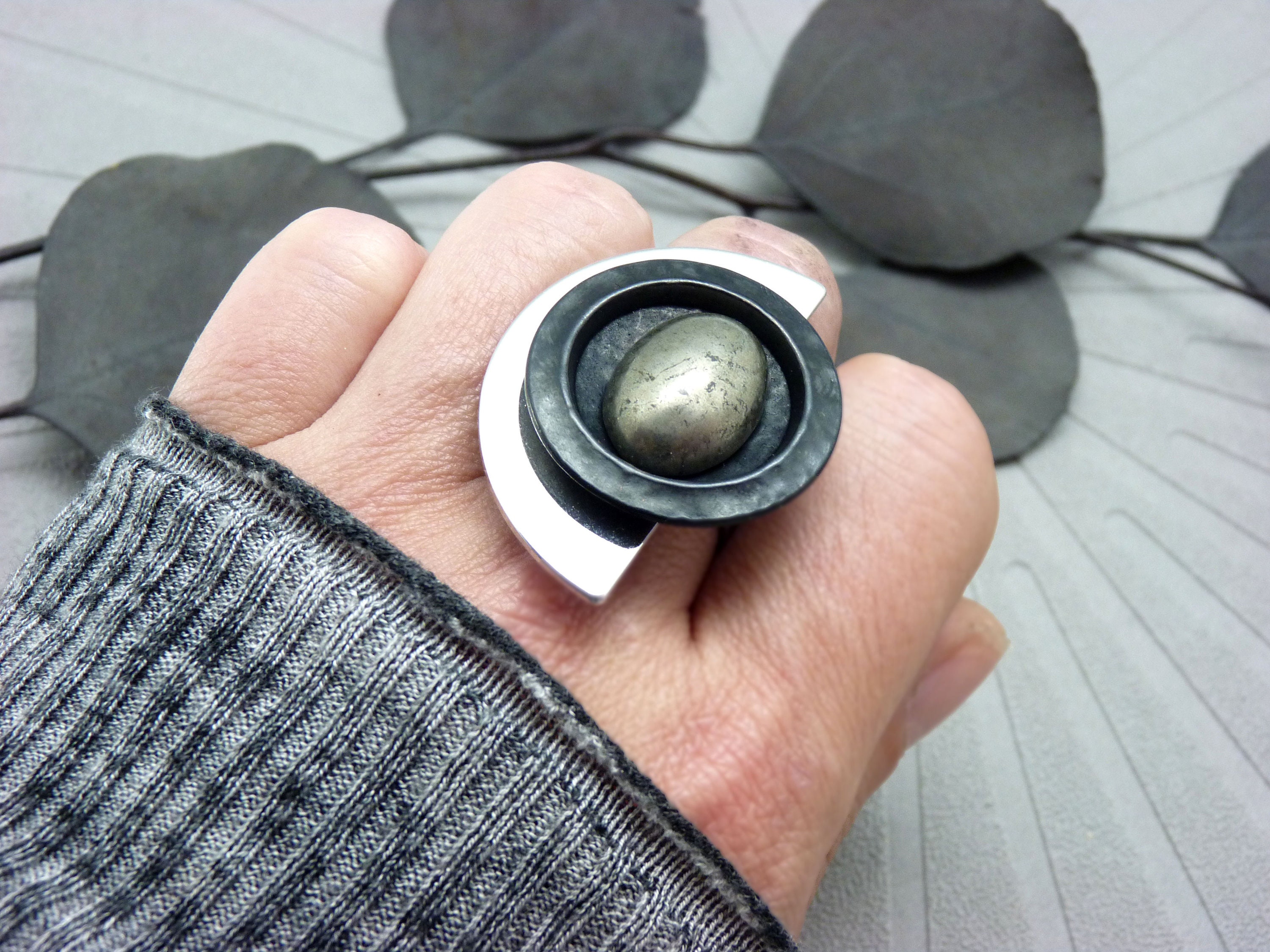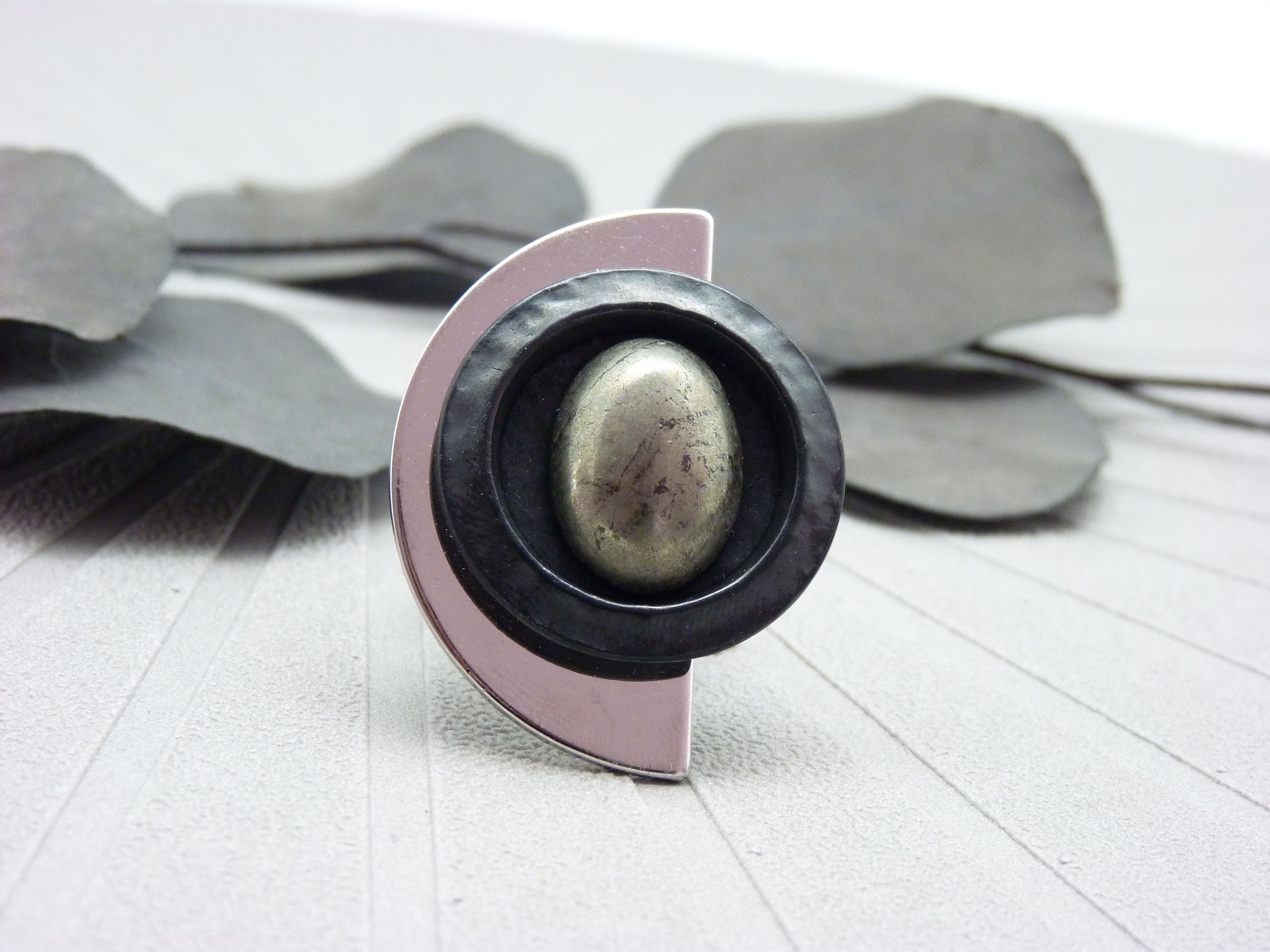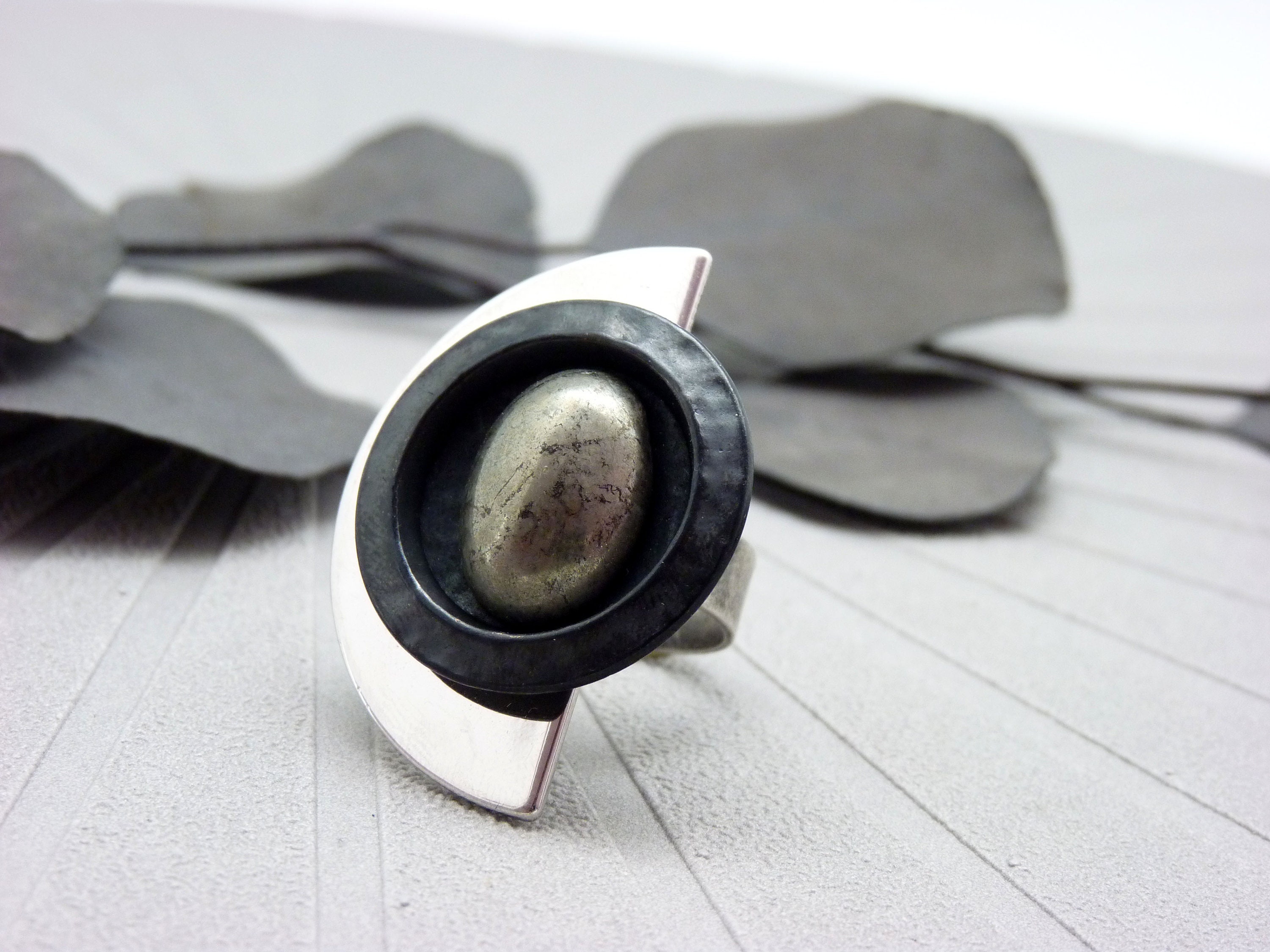 Une bague au design graphique où une demi-lune en métal argenté enlace une pierre Pyrite brute.