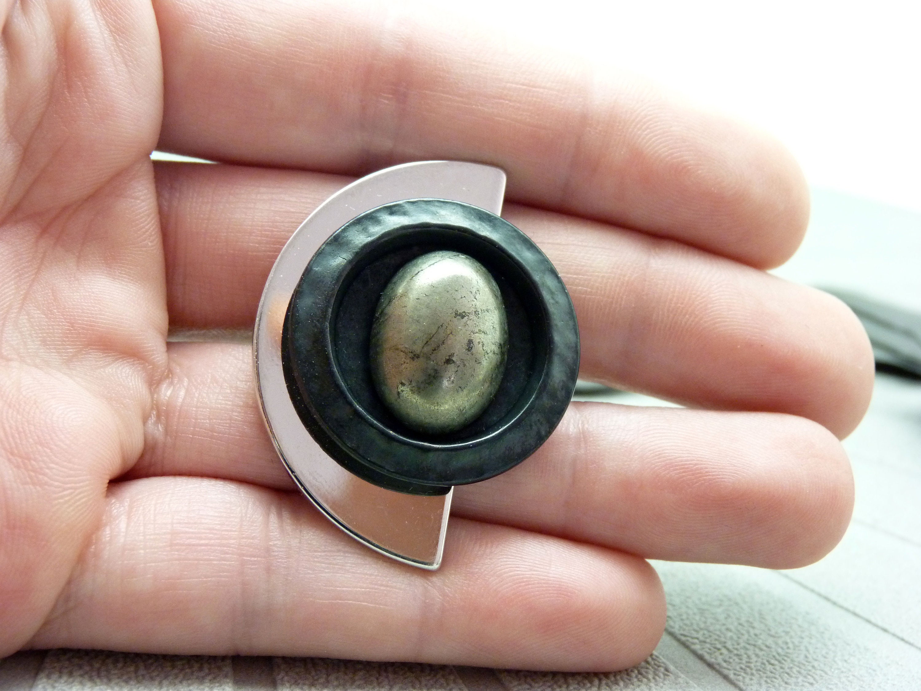• Matériaux : Pyrite véritable, laiton plaqué argent et noir