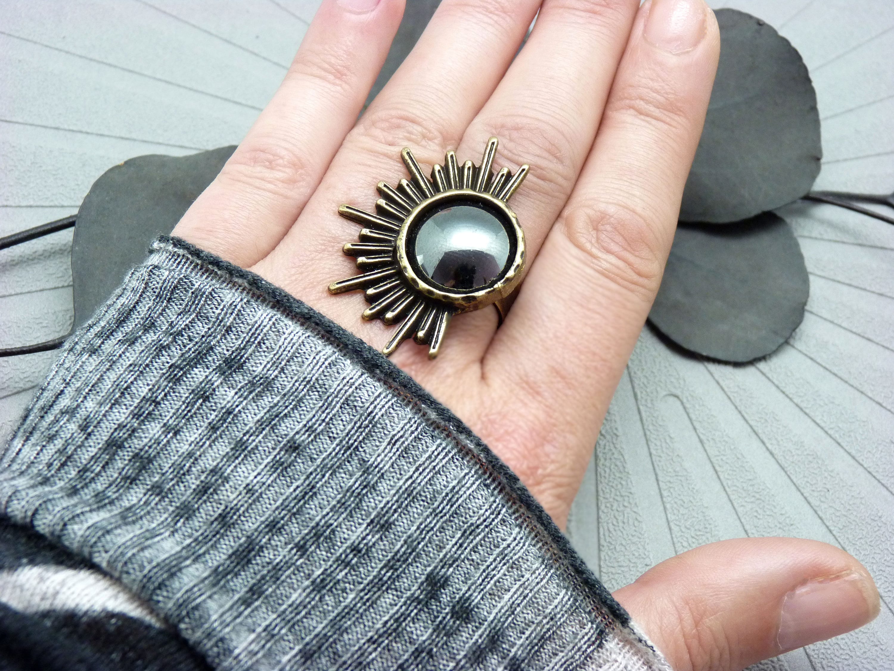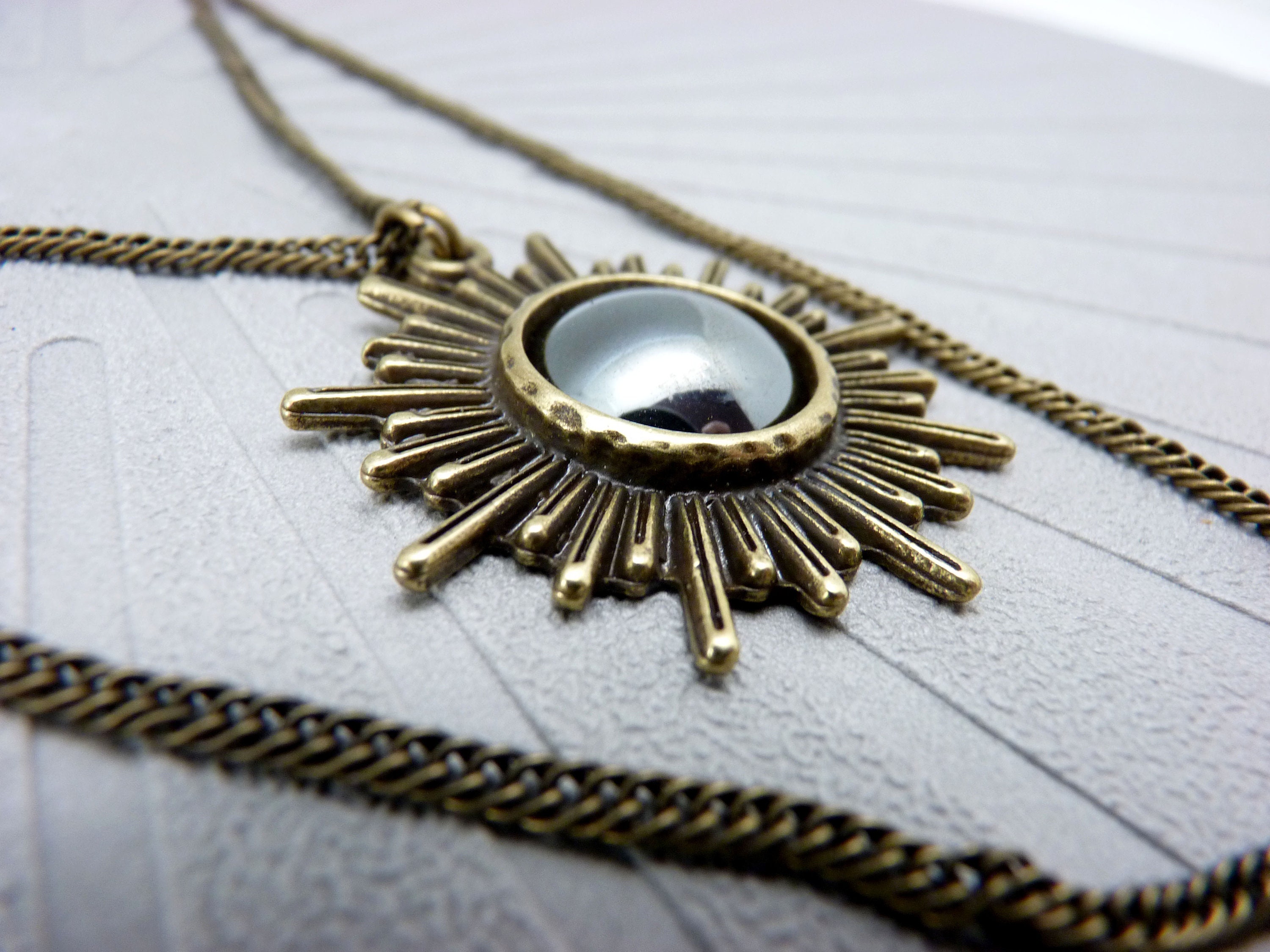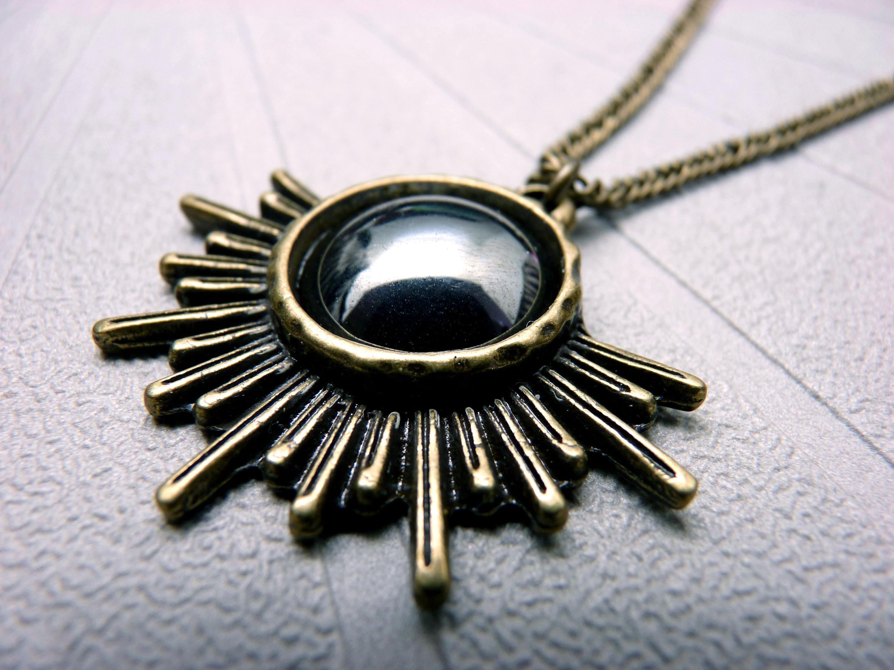 Her bronze brass “sun” pendant, adorned with a brilliant hematite stone, captures the light like a miniature star.