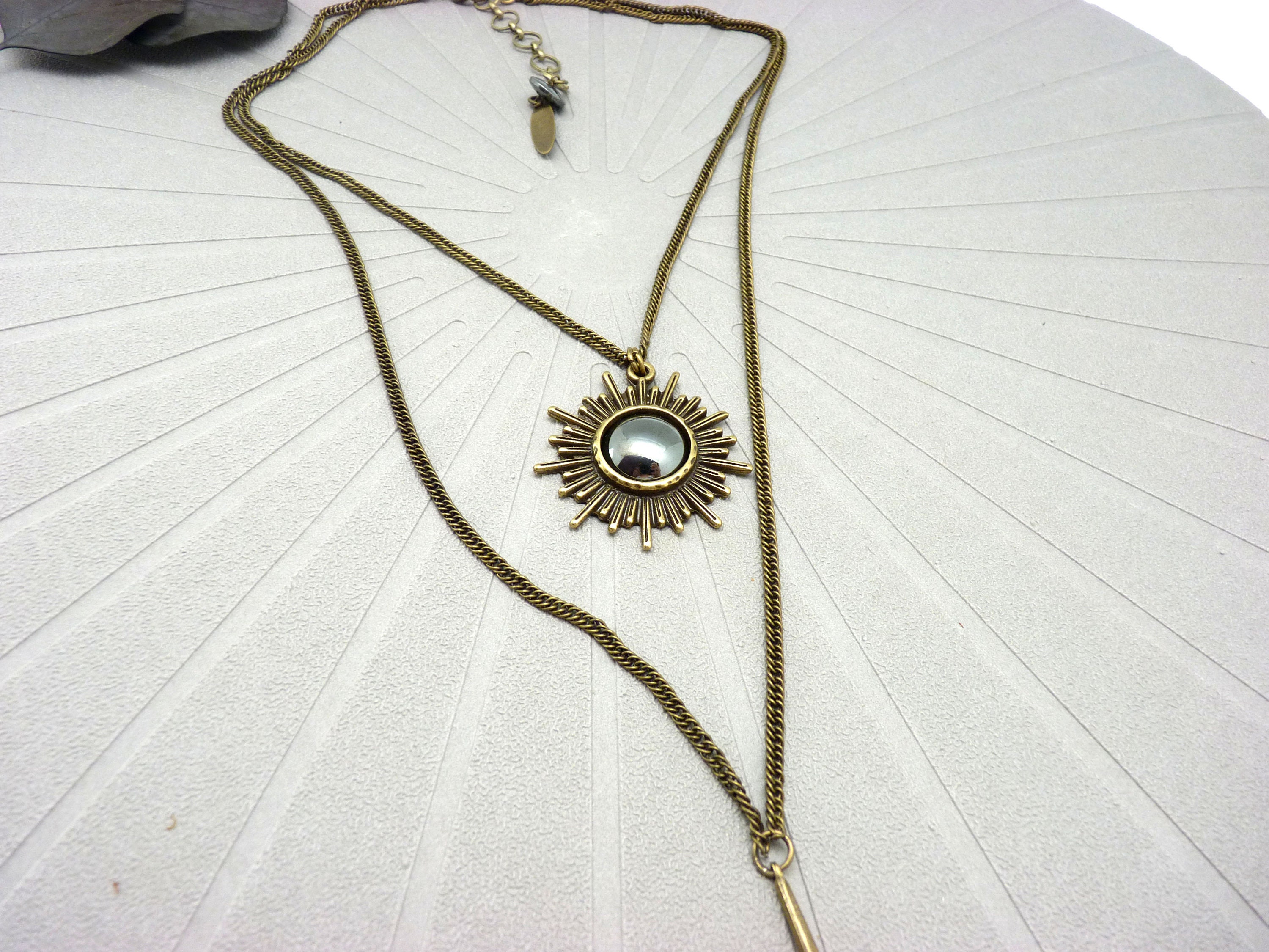 FULLSUN necklace, a two-row solar jewel in bronze metal and grey metal hematite stone.