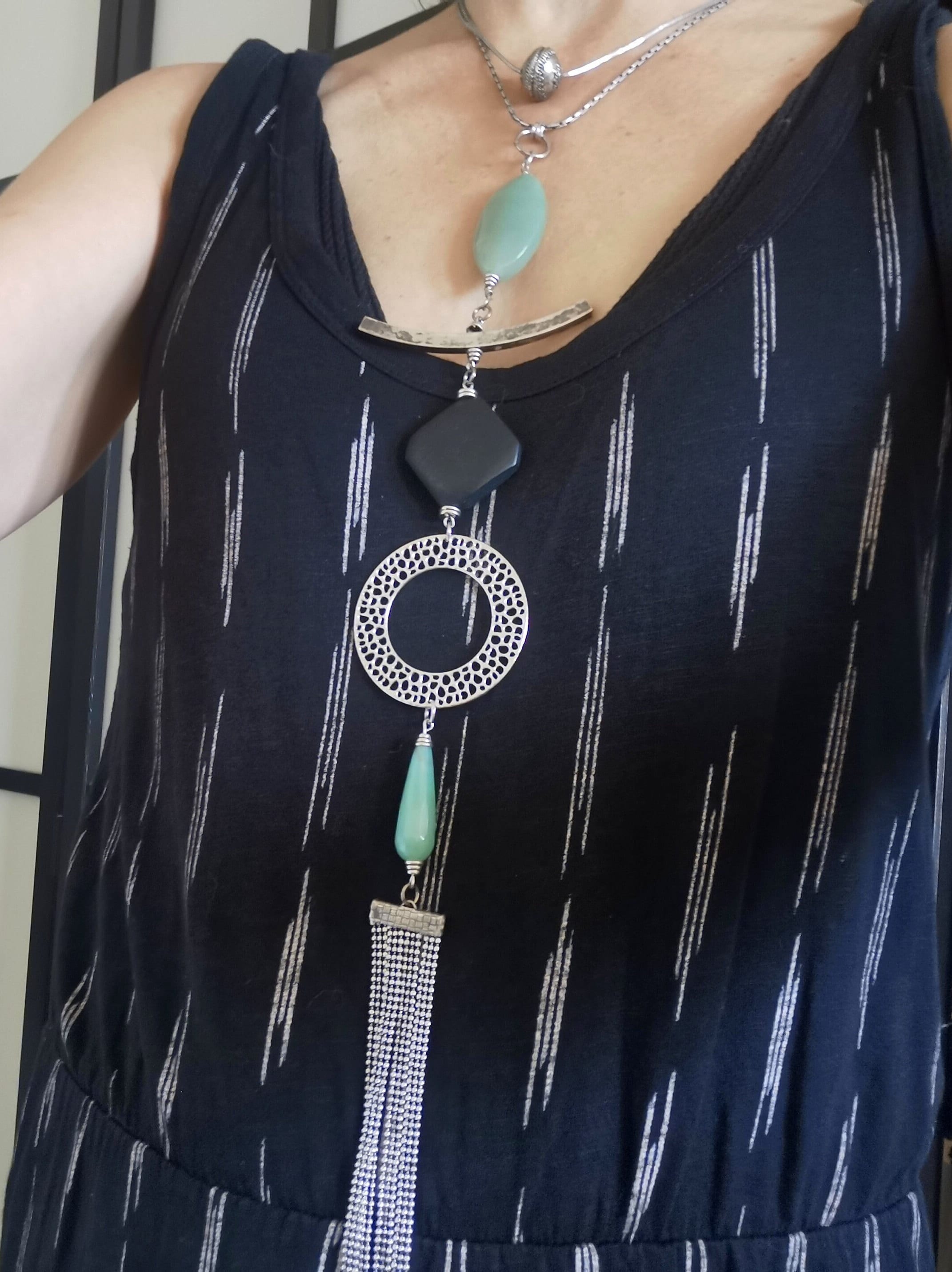 Worked silver circle followed by another aventurine stone in the shape of an elongated drop and flat chain metal tassel.