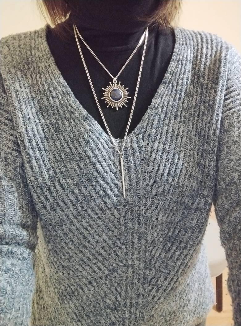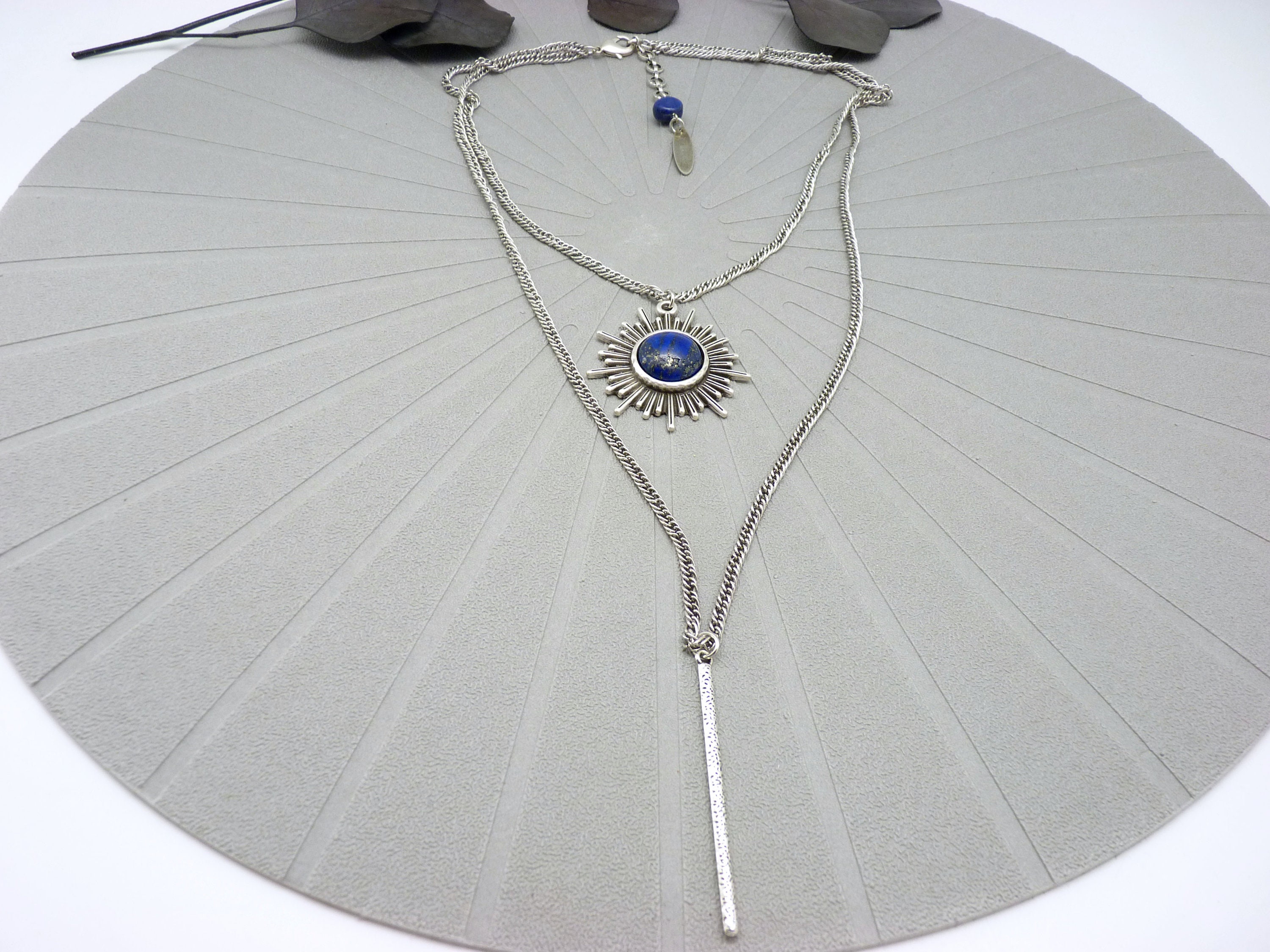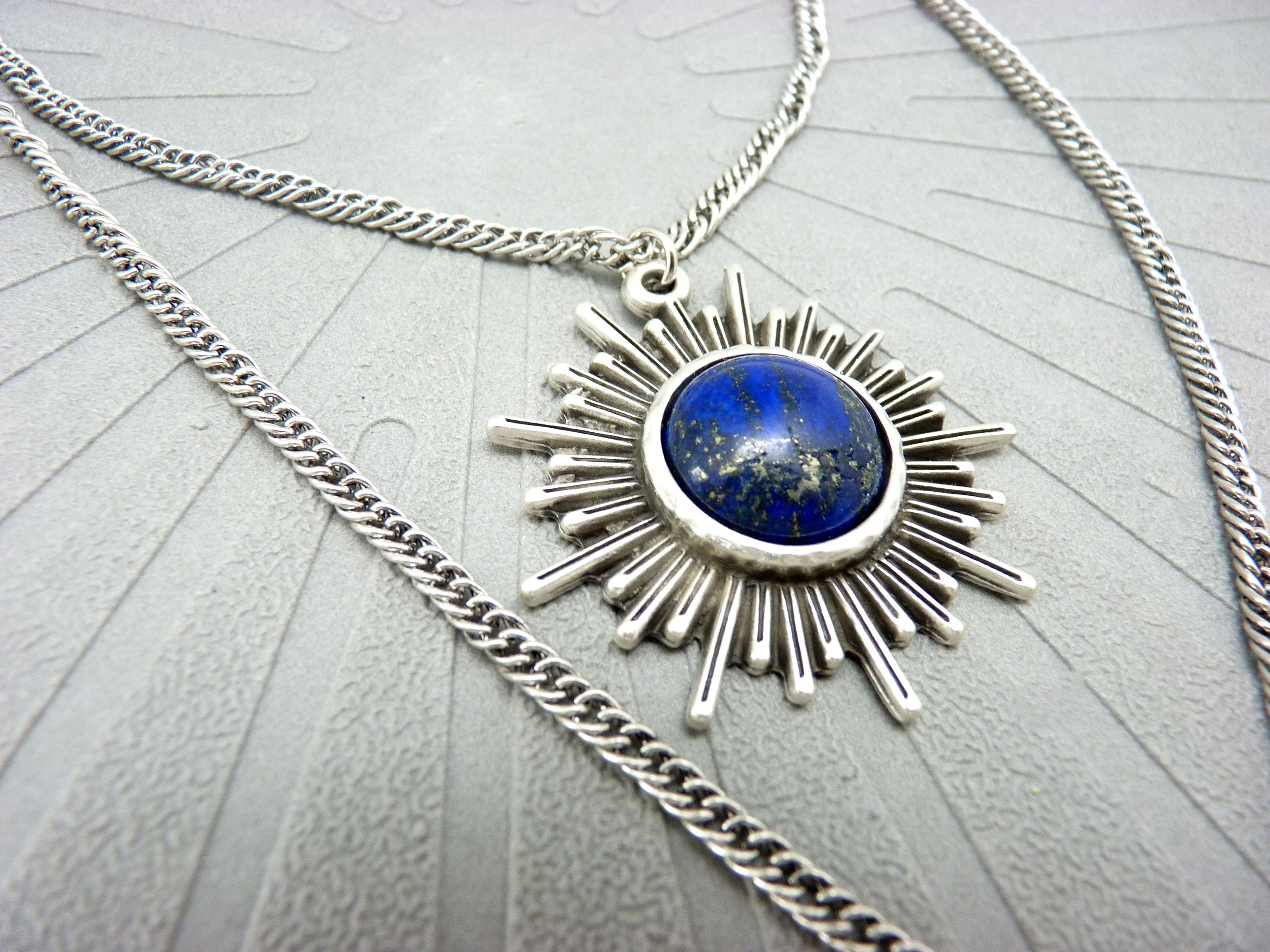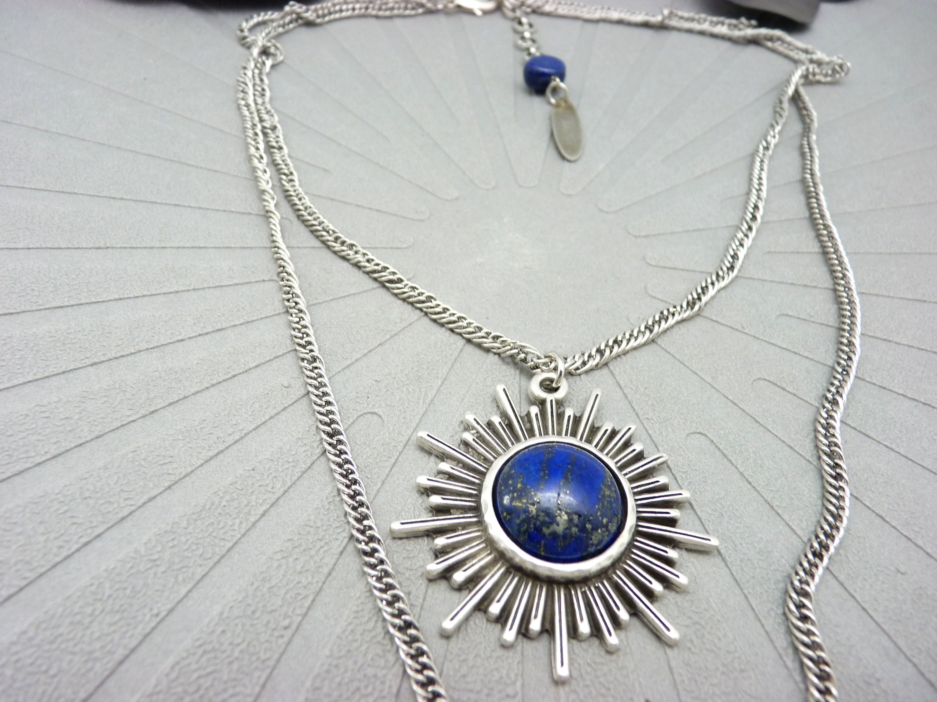 The silver-plated brass “sun” pendant is set with a lapis lazuli cabochon, with blue and gold reflections.