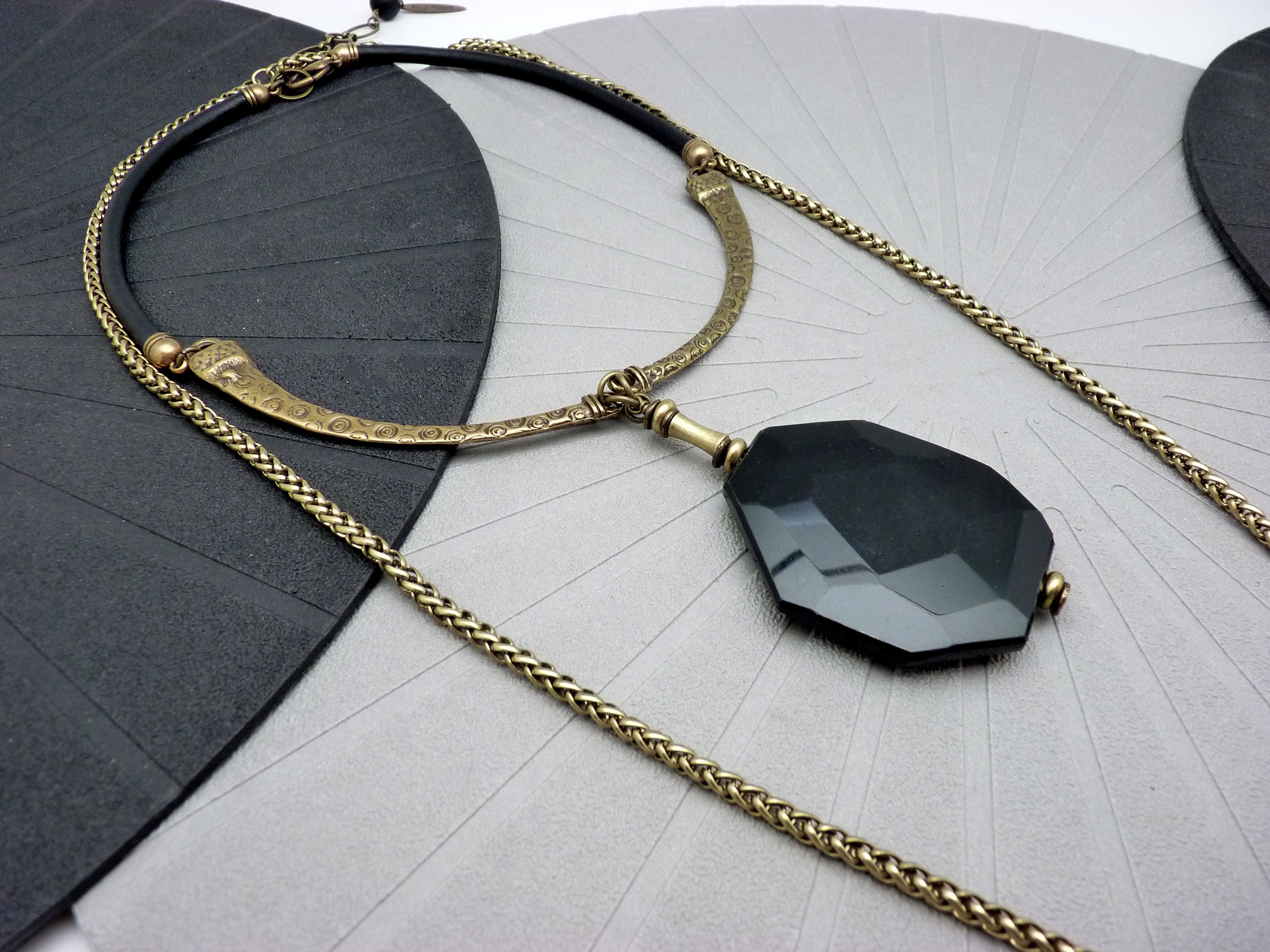 Bib necklace with large faceted polygonal black onyx stone pendant.