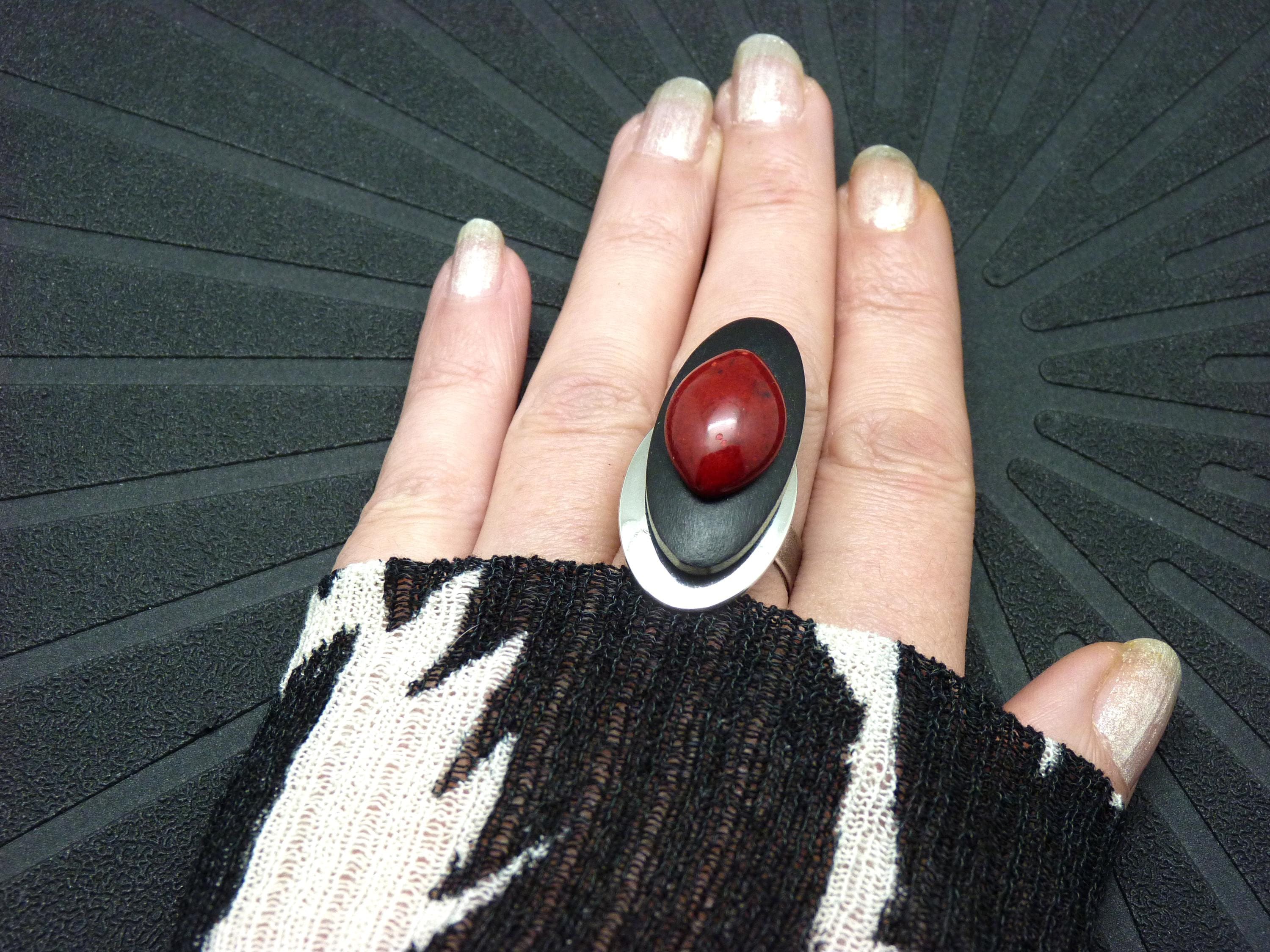 Long oval ring in silver-plated metal, black wood and cherry-red howlite stone, shuttle shape.