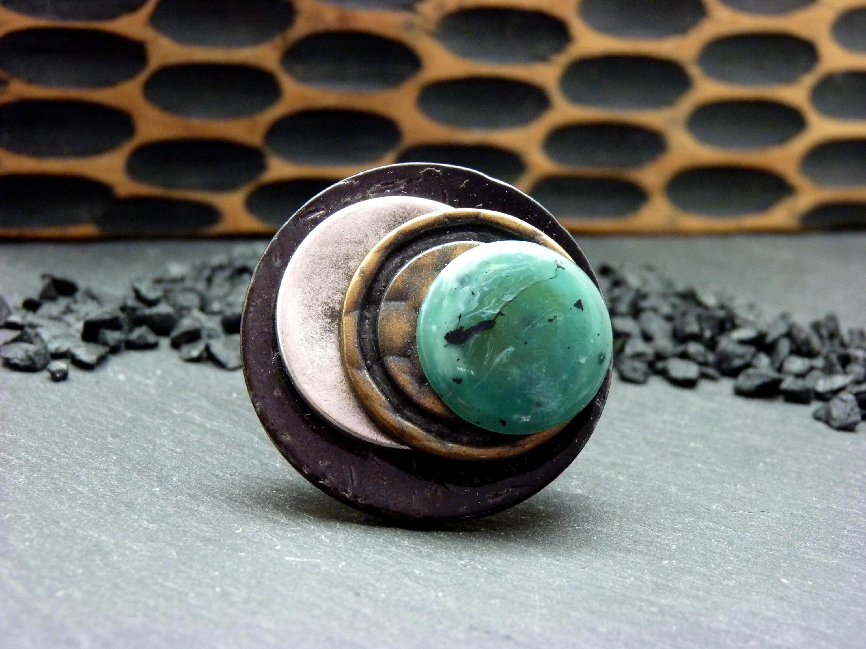 A large round ring that layers discs of black wood, silver and bronze metal, all enlivened by a touch of emerald green.