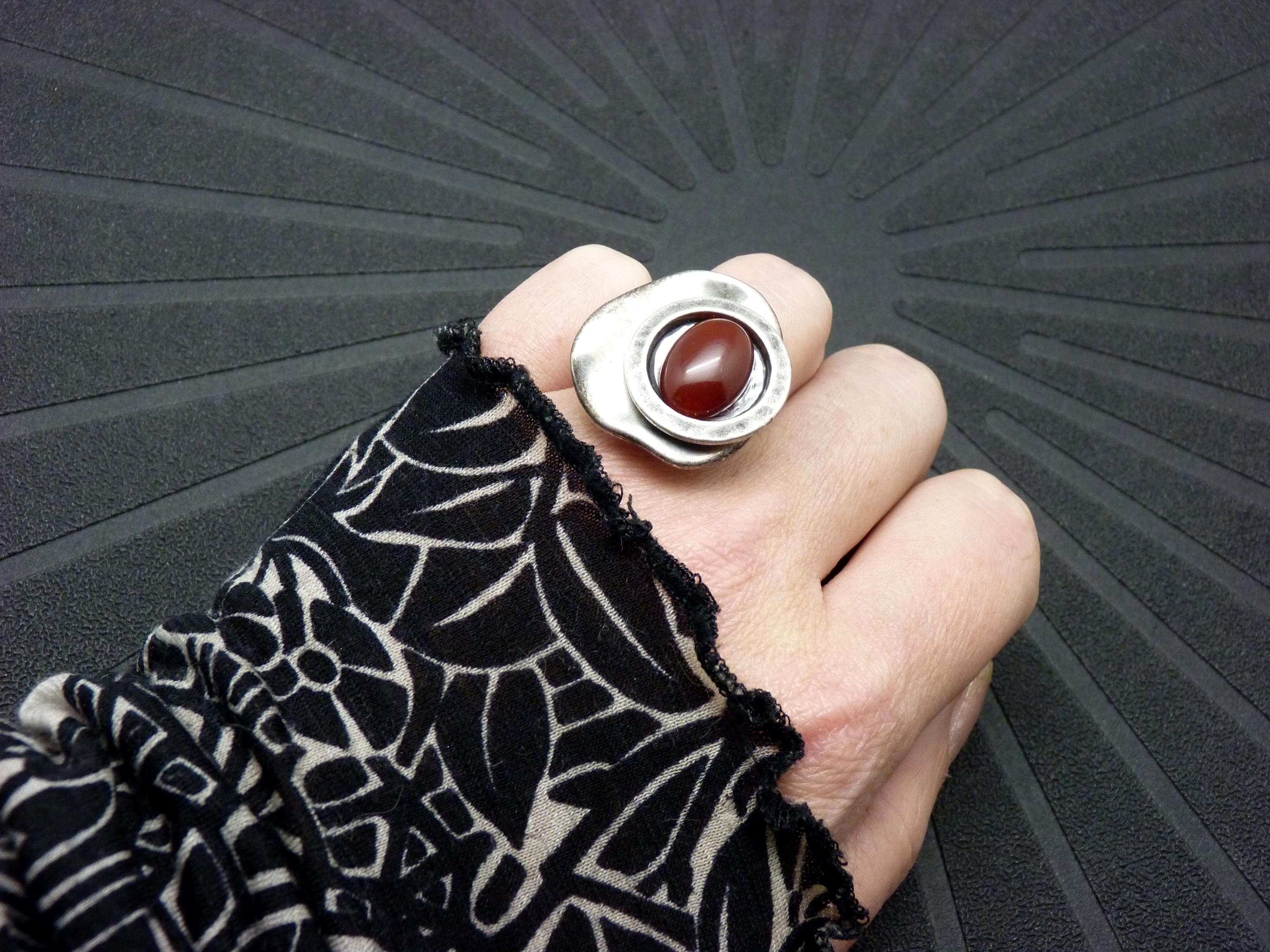 A small ring in aged silver with an organic design, where a warm-toned Carnelian stone is nestled in an asymmetrical setting.