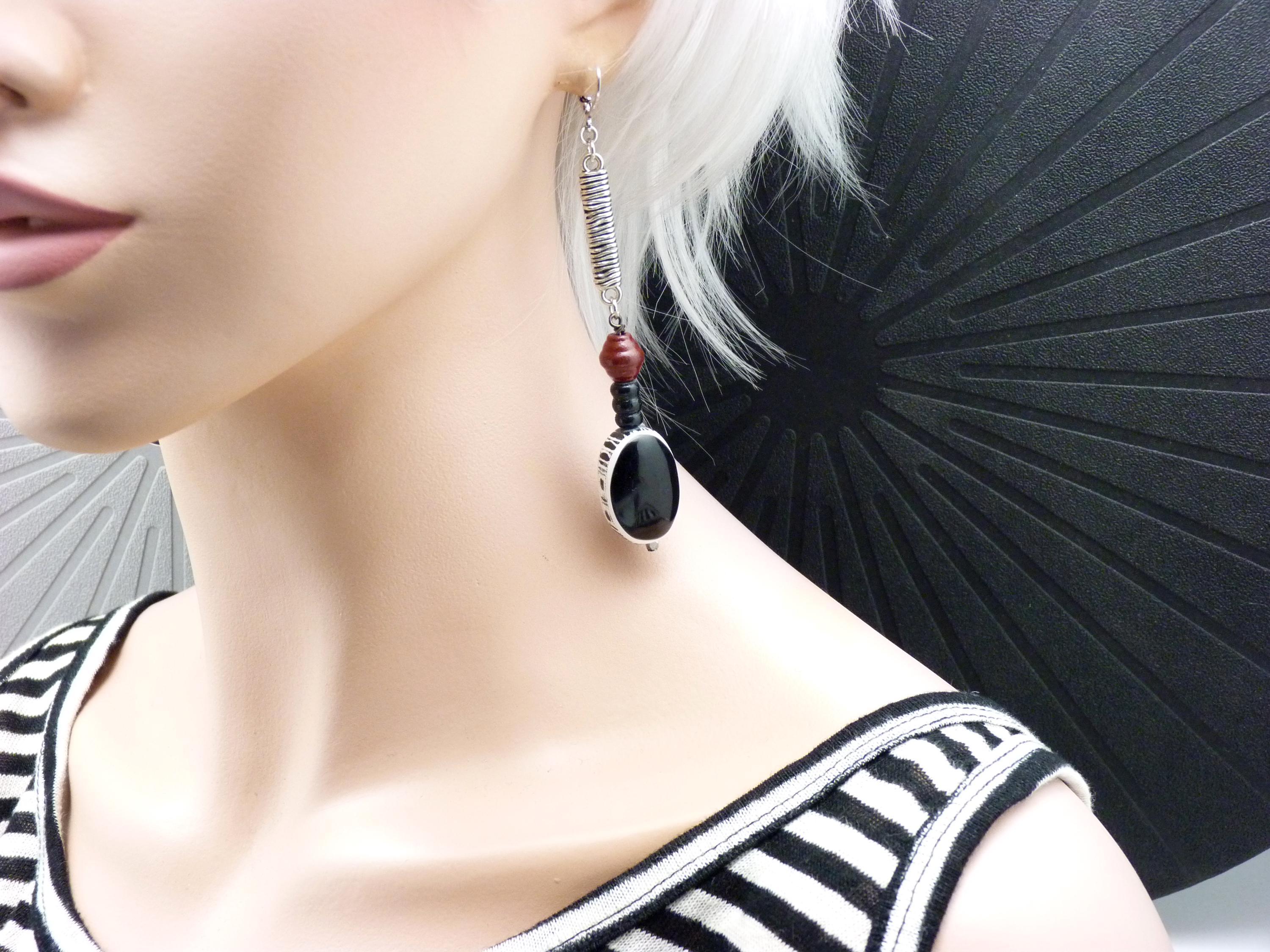 A pair of asymmetrical earrings where wood, bone and metal come together in a tribal spirit.