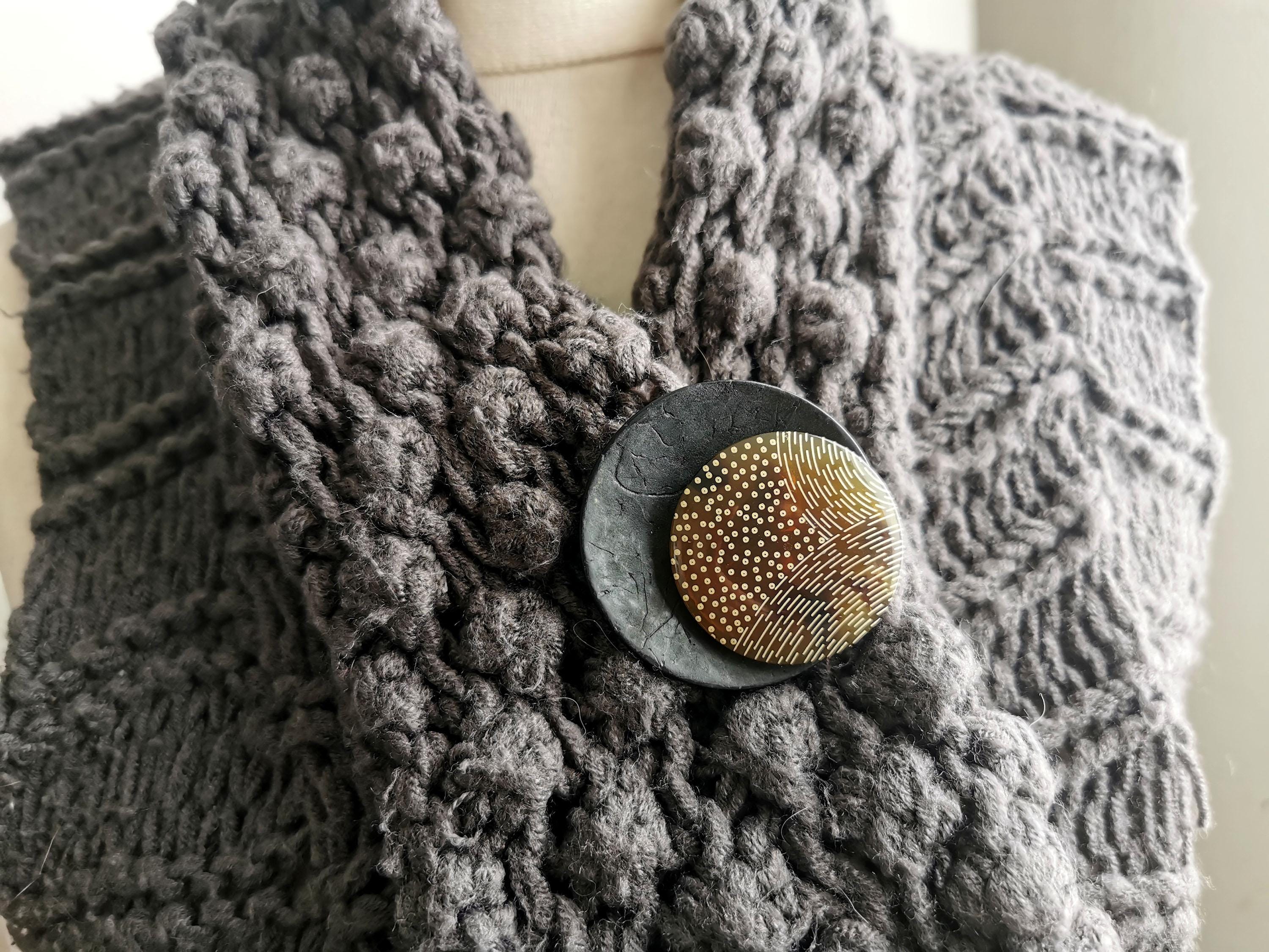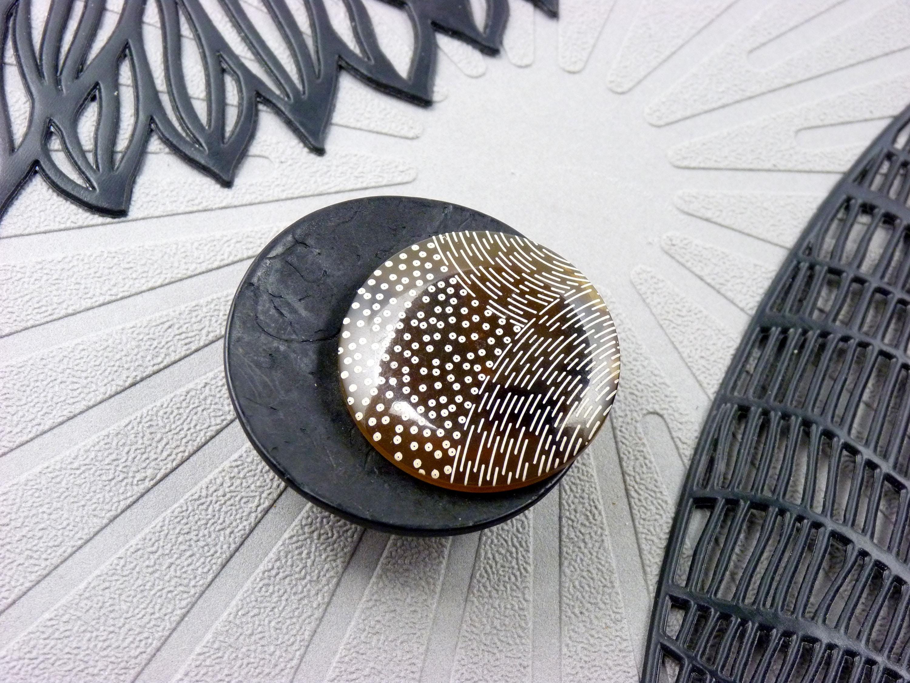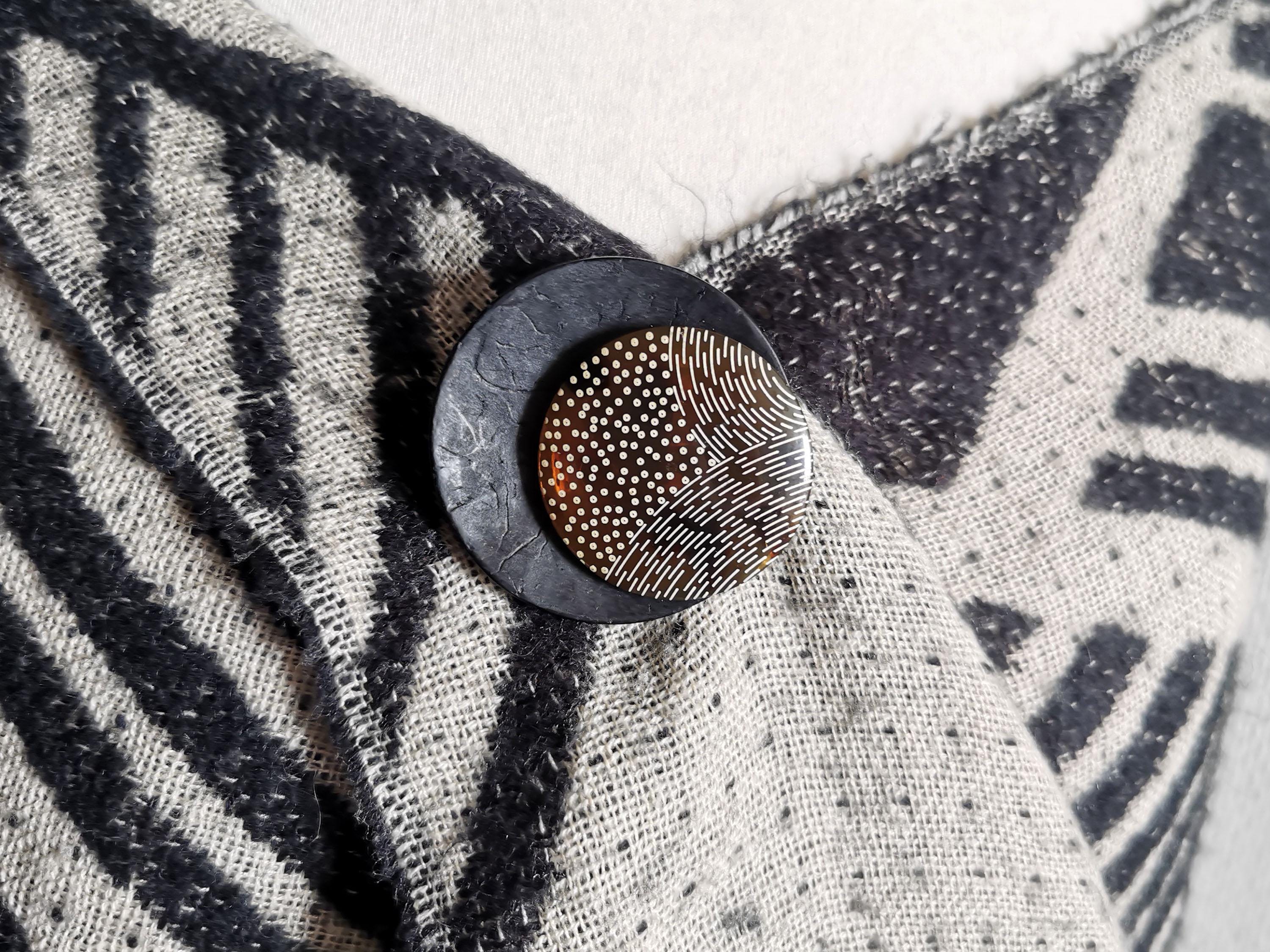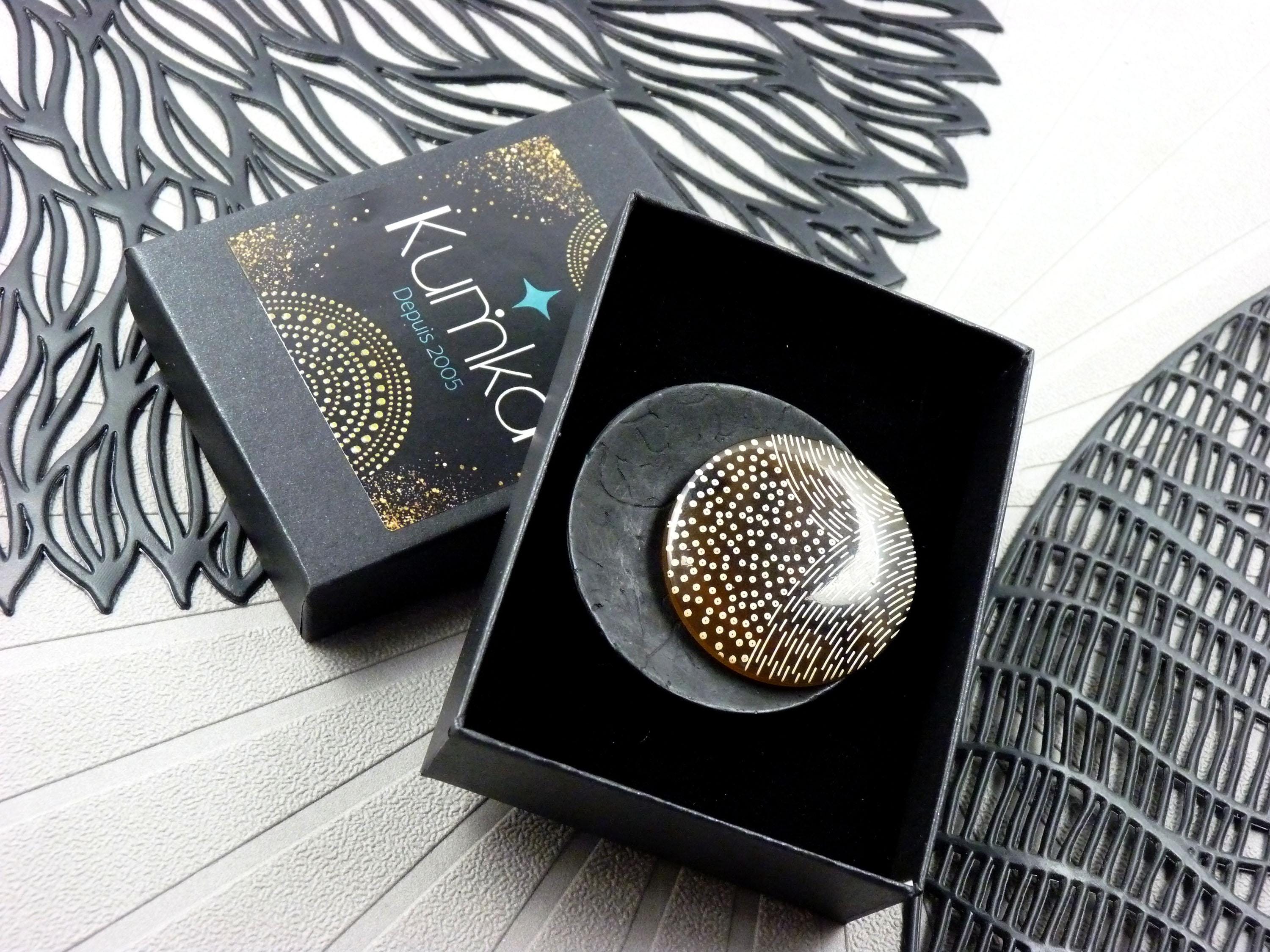 The PIXEL brooch is a small, wearable work of art: a slightly curved black wooden pebble topped with a brown and beige resin disc featuring geometric patterns. A piece of jewelry with character, warm, vibrant… and incredibly chic.
