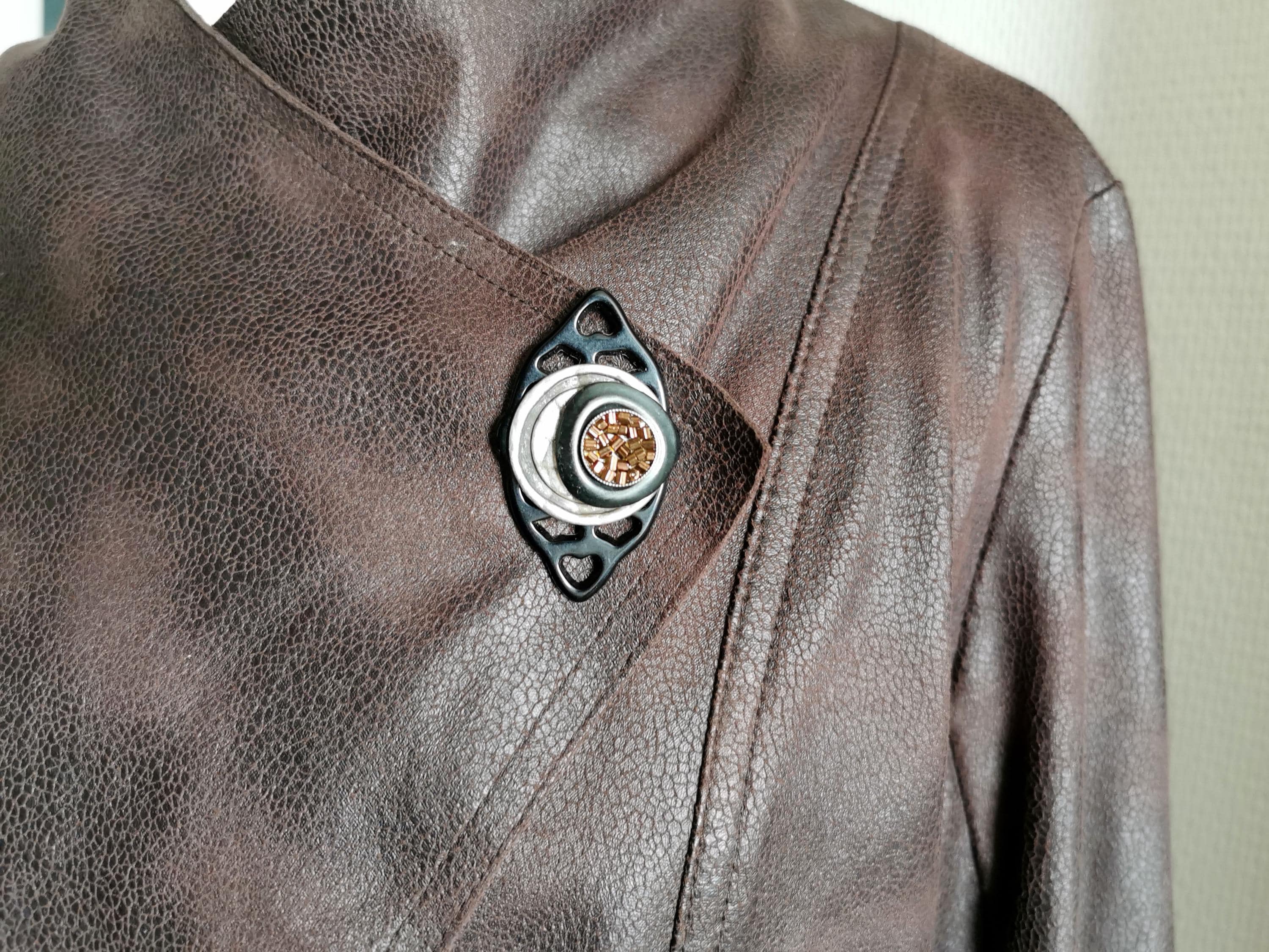 On a base of openwork black resin, discs of hammered silver and gunmetal metal are layered. At the heart of this spiral, a sparkling cabochon of glass beads with brown and copper reflections attracts all eyes.