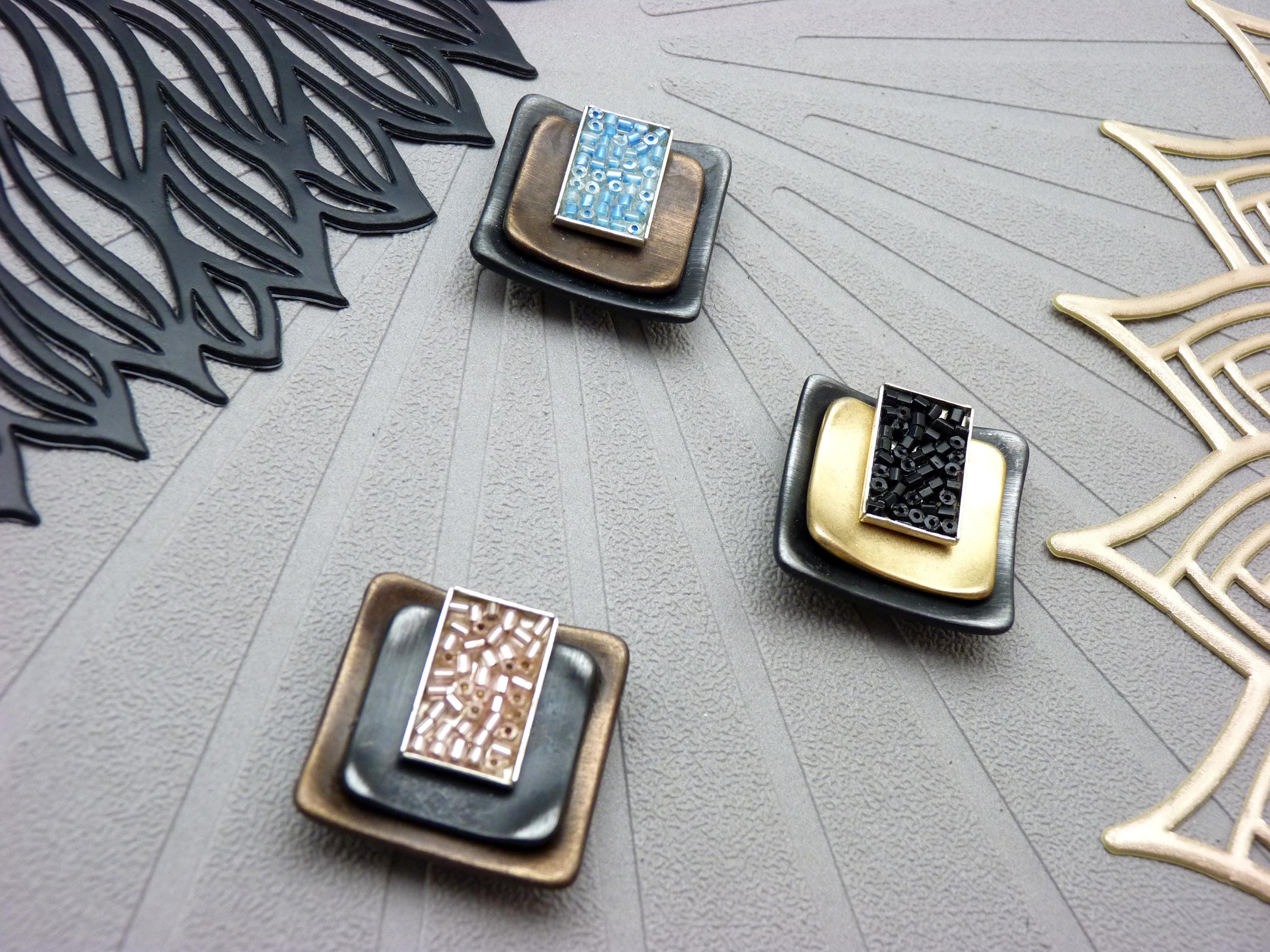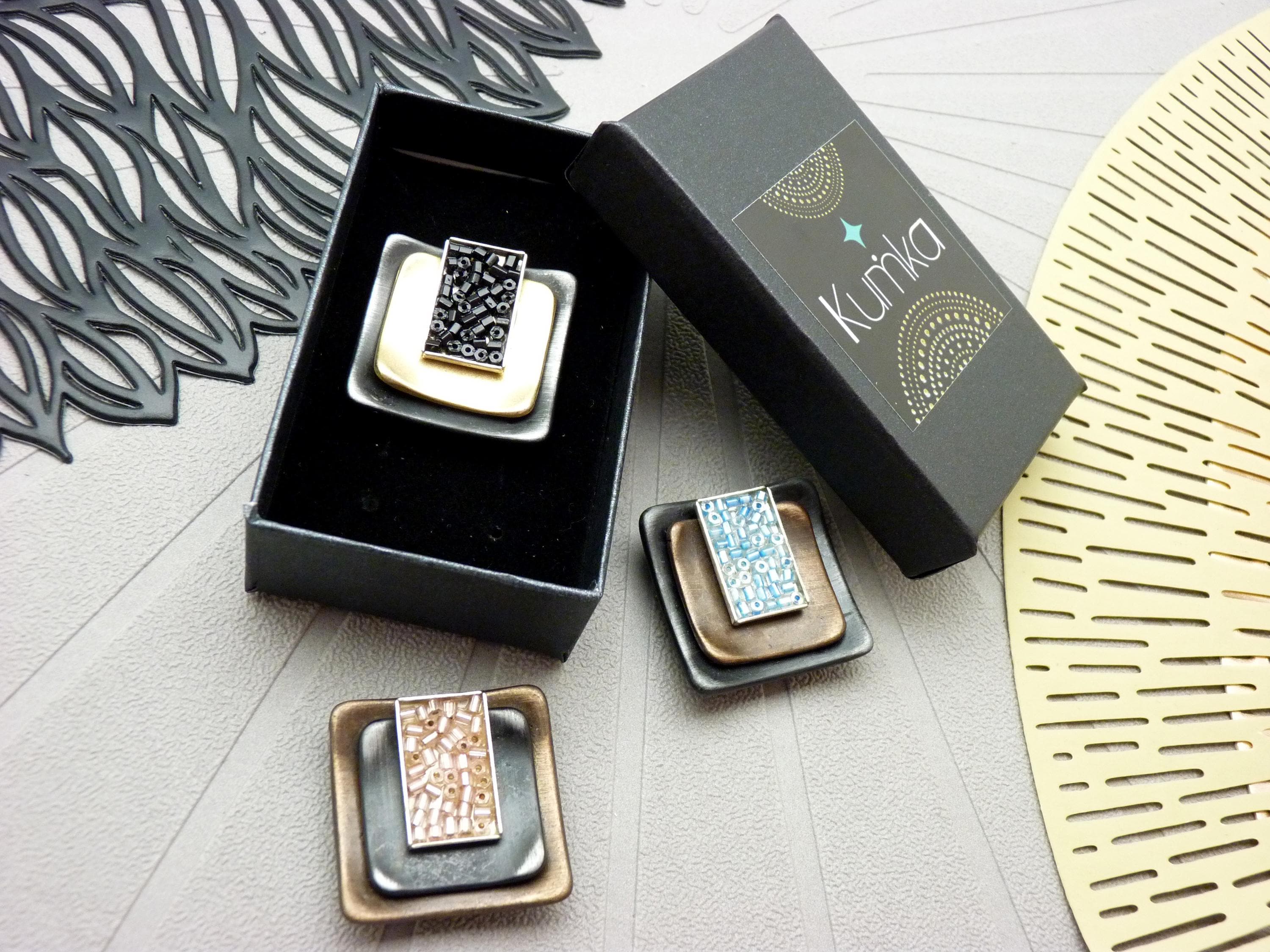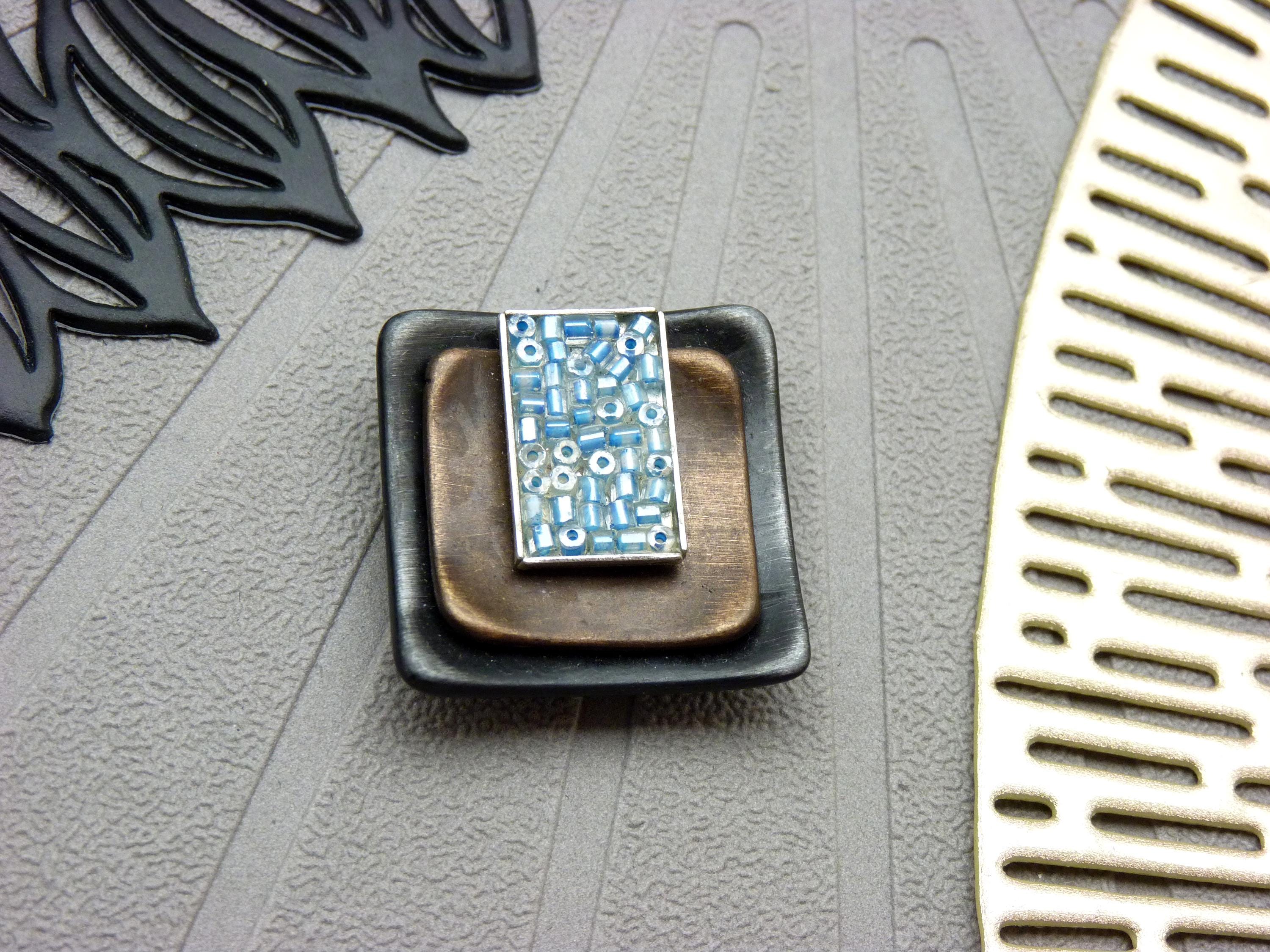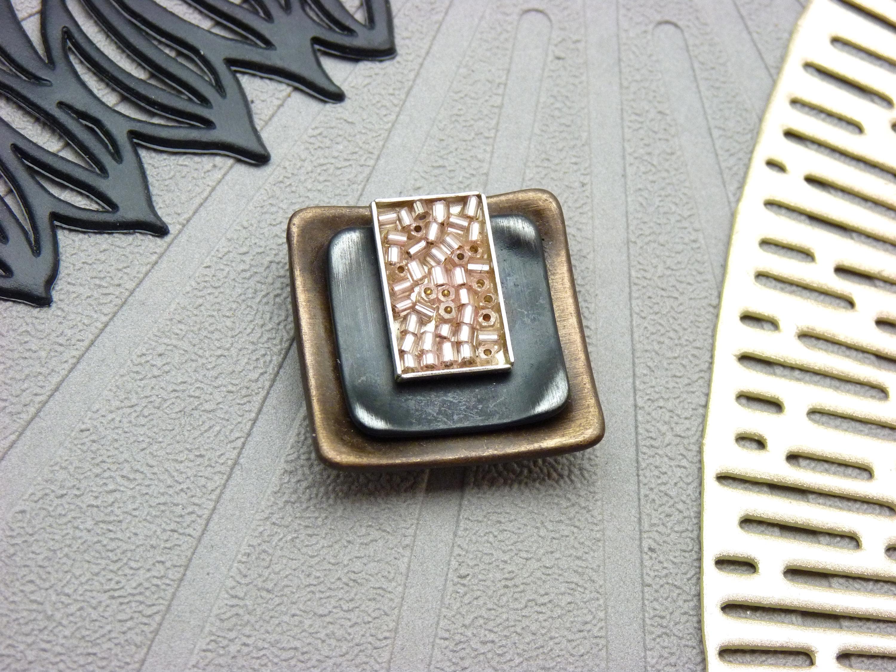 The QUARTY brooch's design is a miniature geometric tableau. Its slightly curved square base holds a rectangle "embroidered" with shimmering glass beads. It's a jewel of contrasts, between the simplicity of the shapes and the subtle sparkle of the beads.