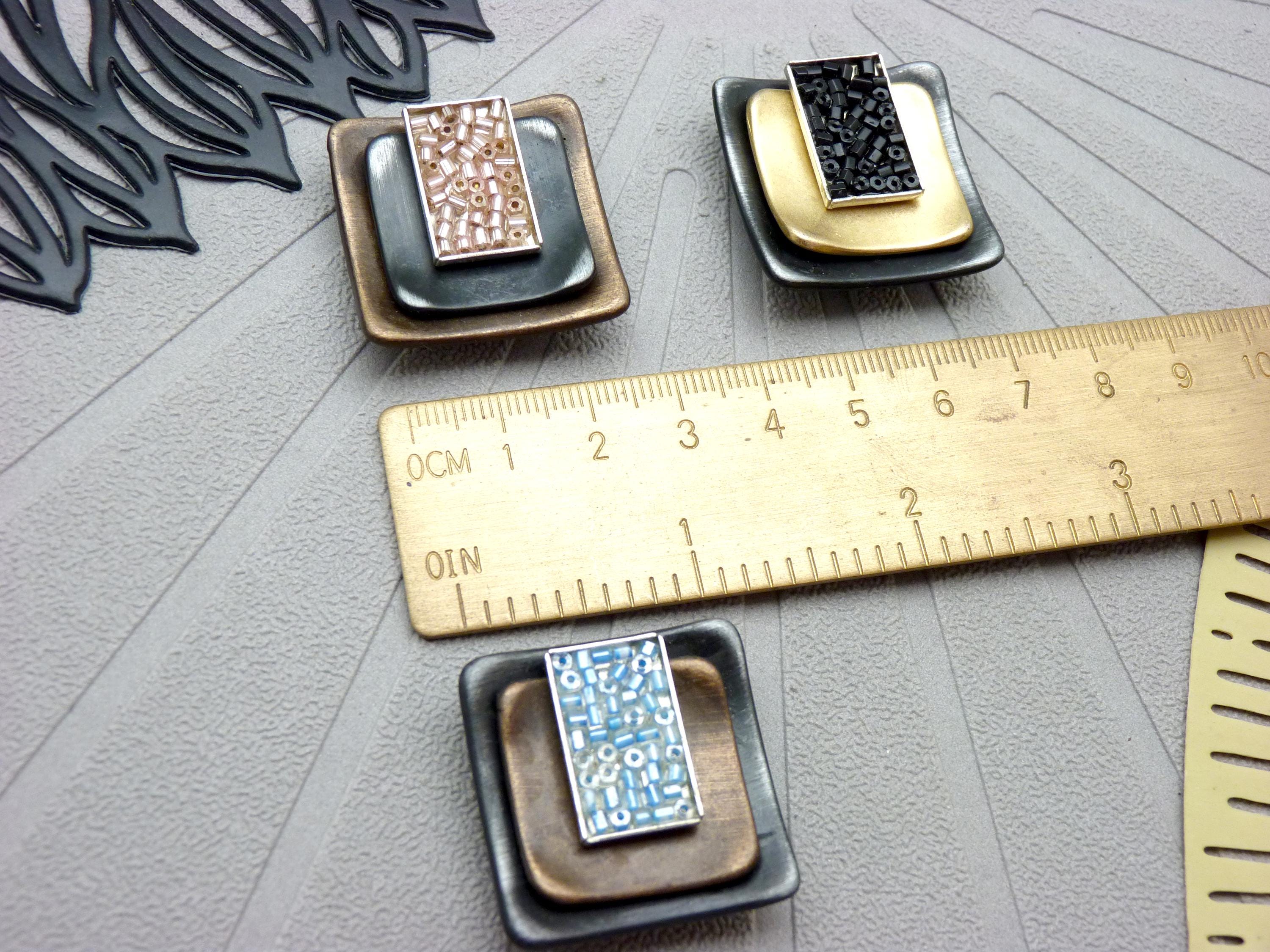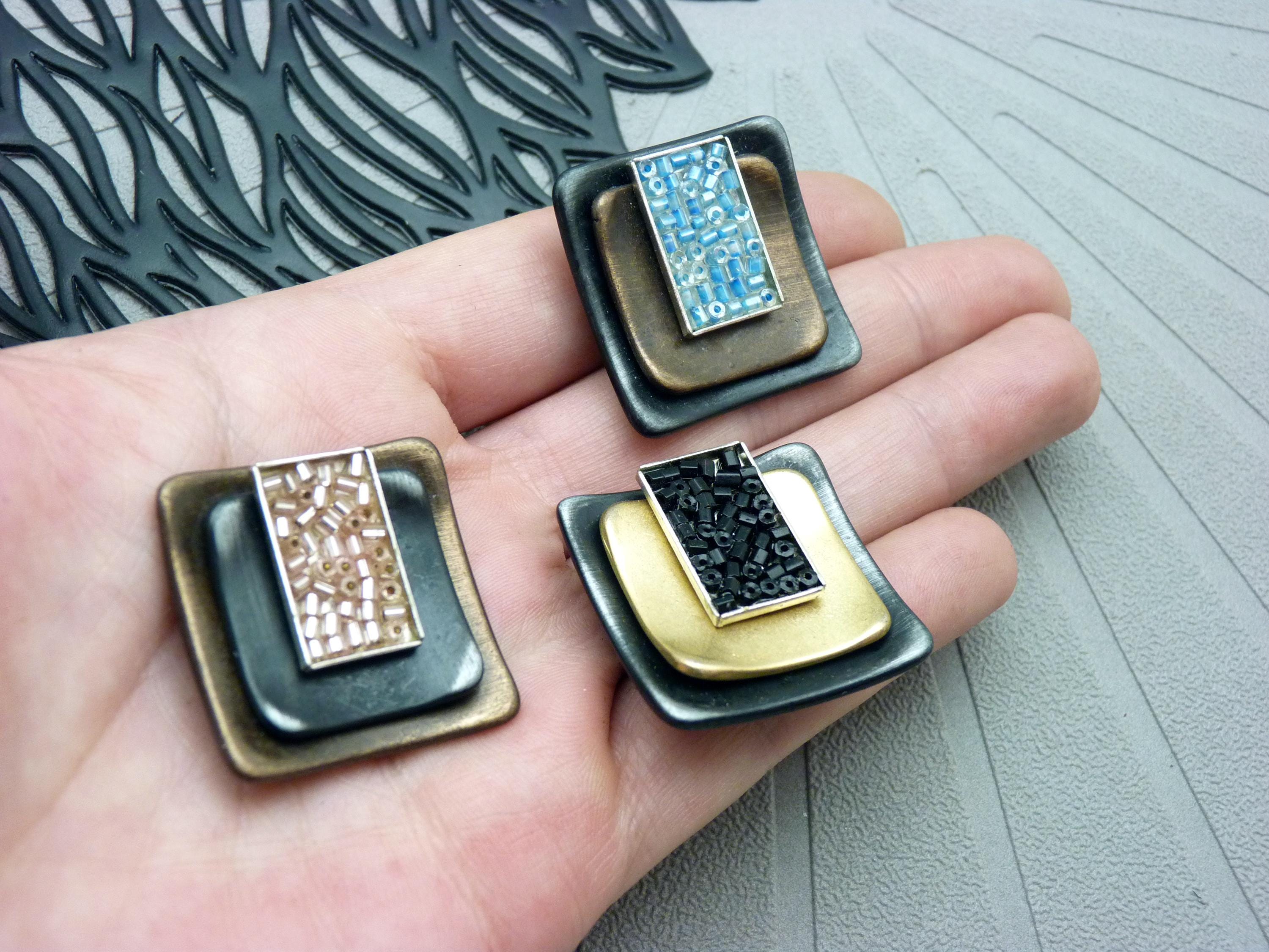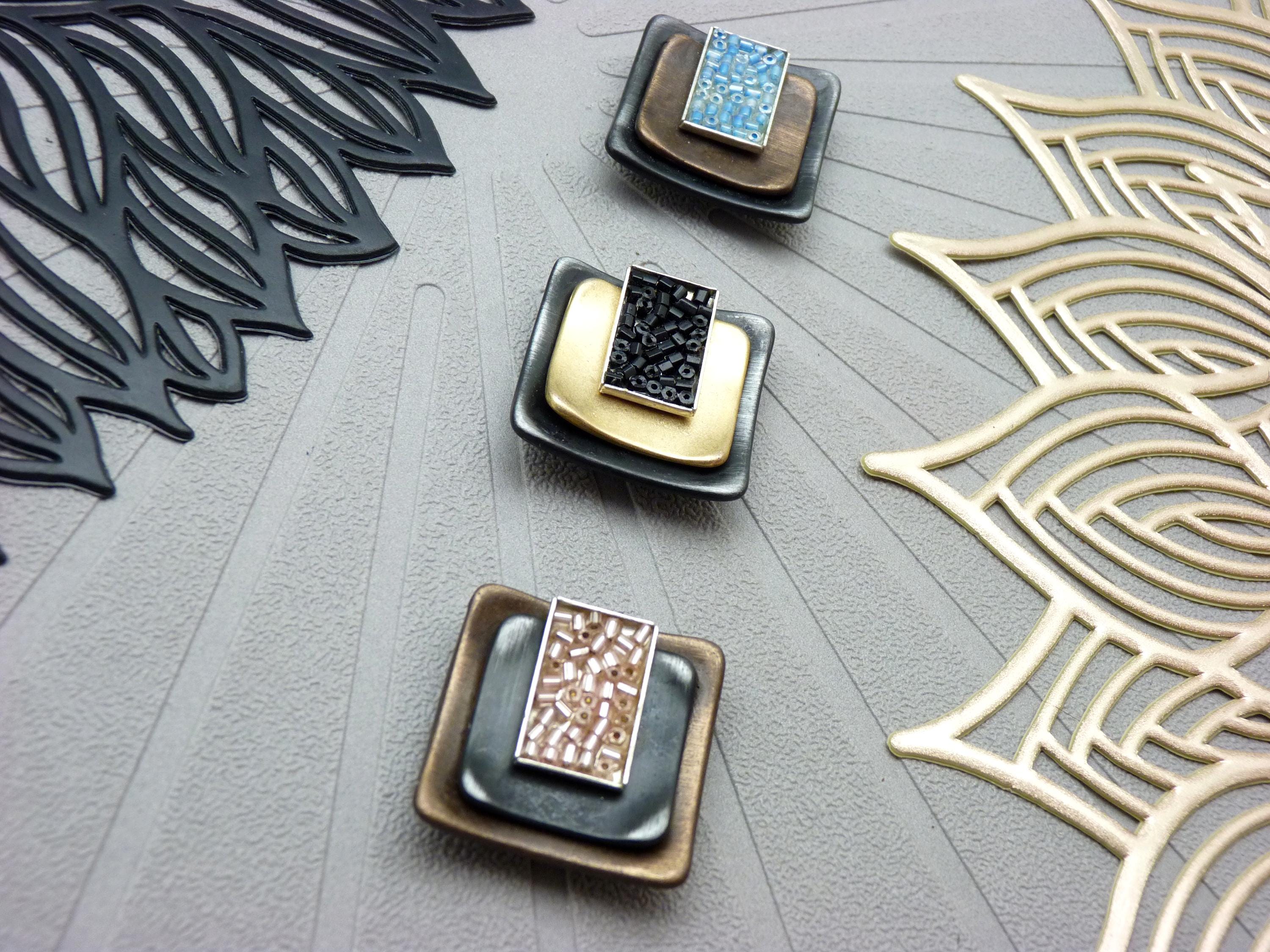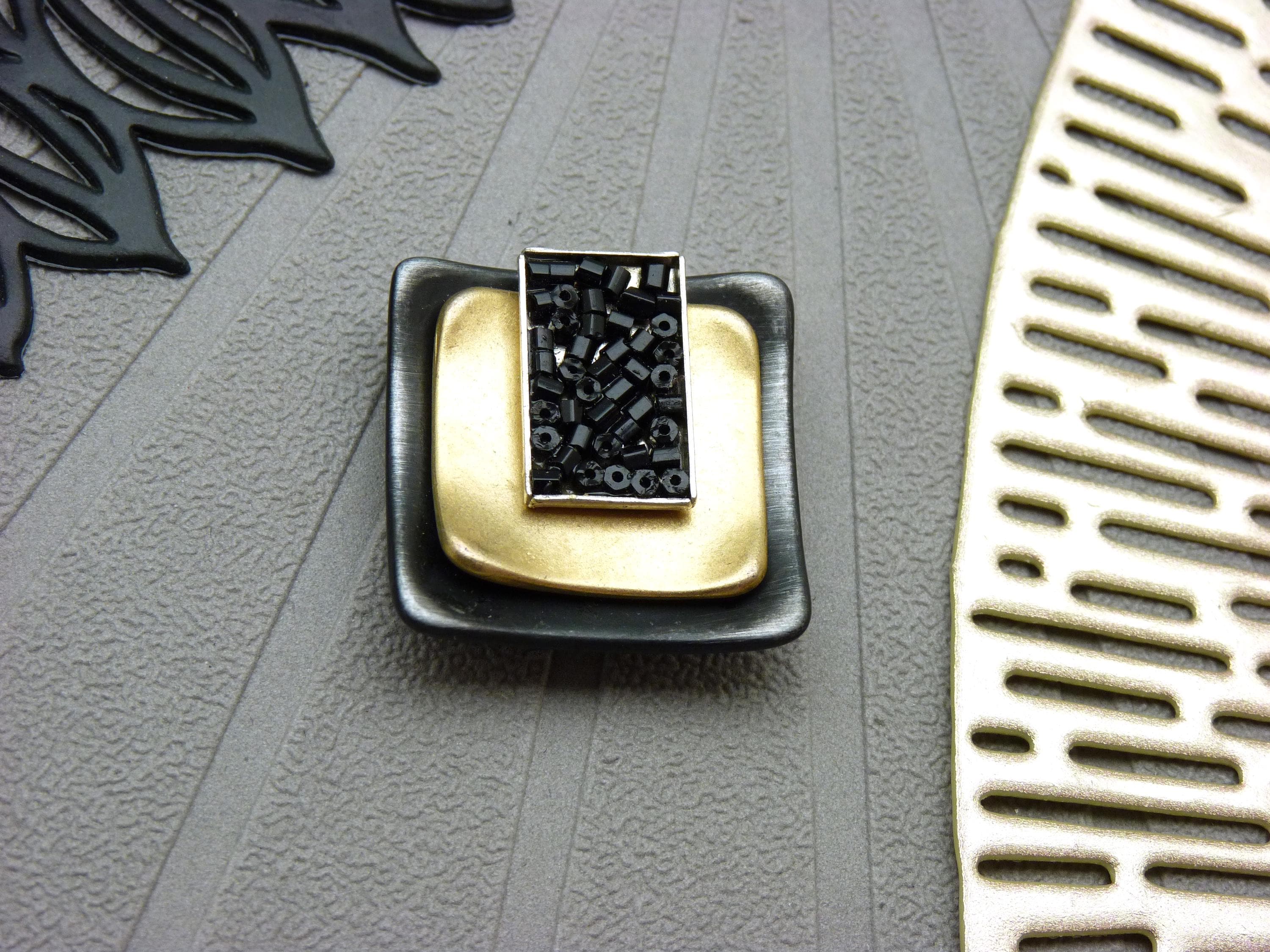 The QUARTY brooch's design is a miniature geometric tableau. Its slightly curved square base holds a rectangle "embroidered" with shimmering glass beads. It's a jewel of contrasts, between the simplicity of the shapes and the subtle sparkle of the beads.