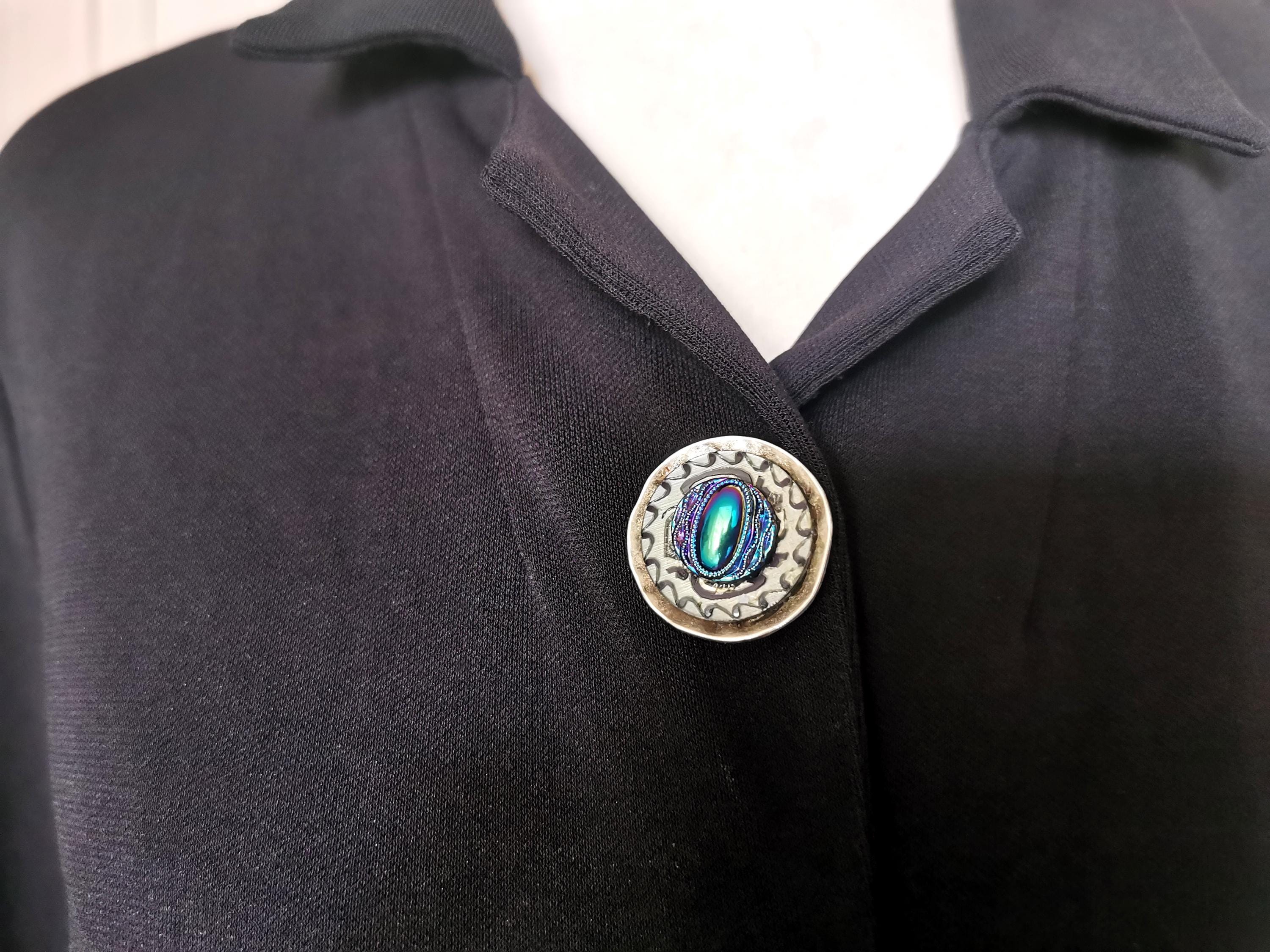 The AURA brooch's design is a play of light and reflections. On a pearly gray resin disc, an iridescent glass cabochon captures the light and reveals shifting shades of blue, green, and purple. It's a mesmerizing little gem that's sure to turn heads.