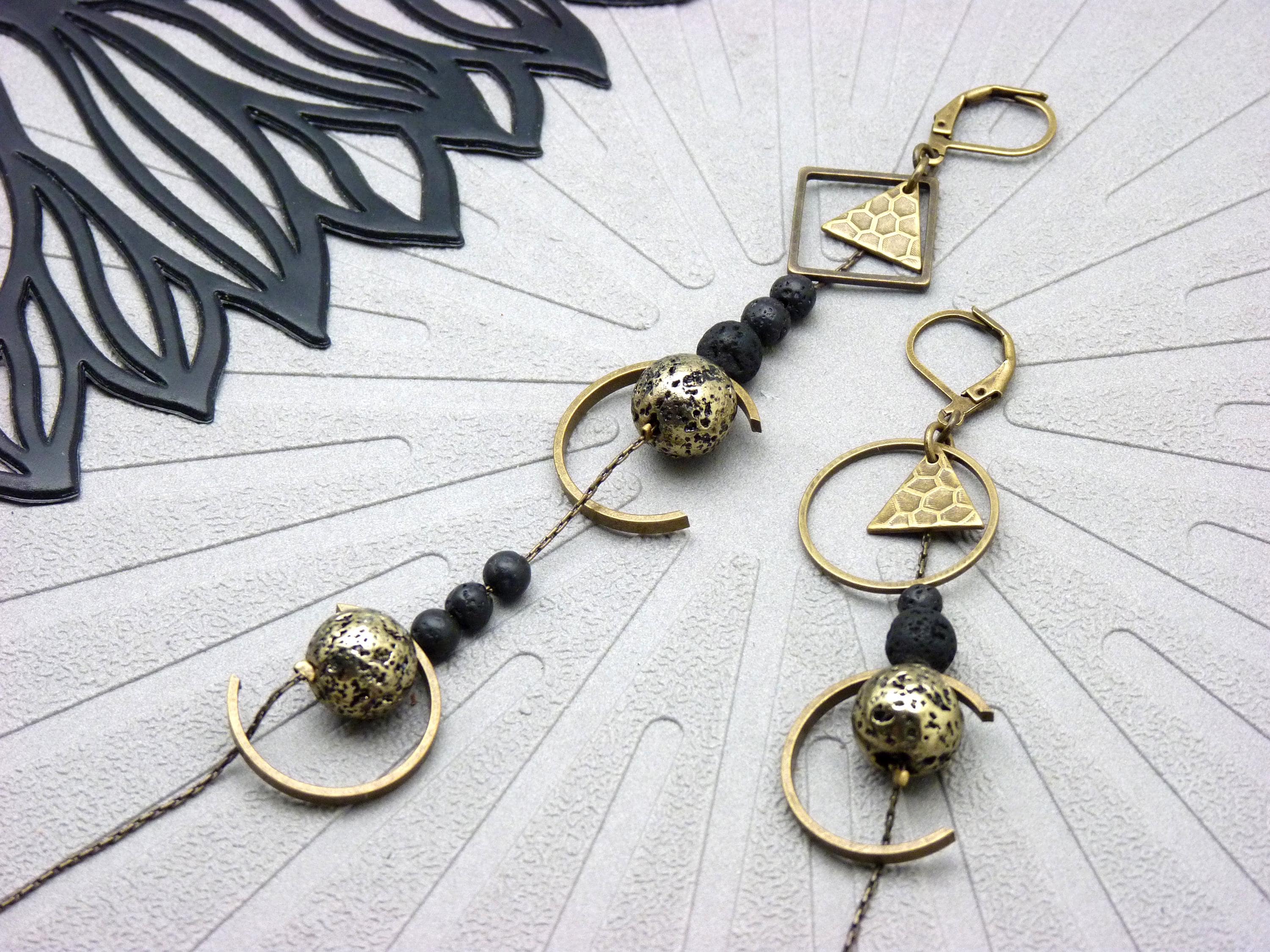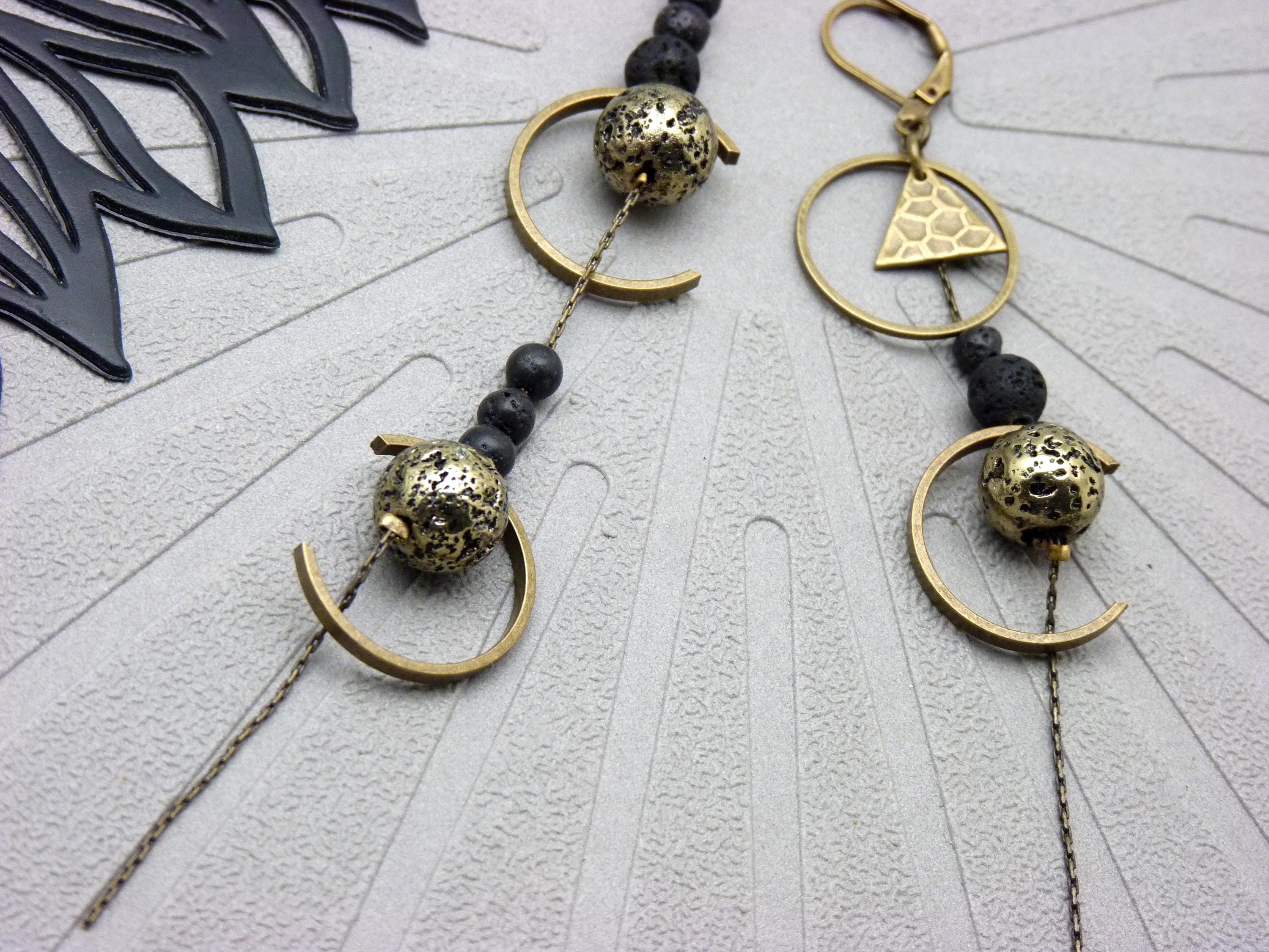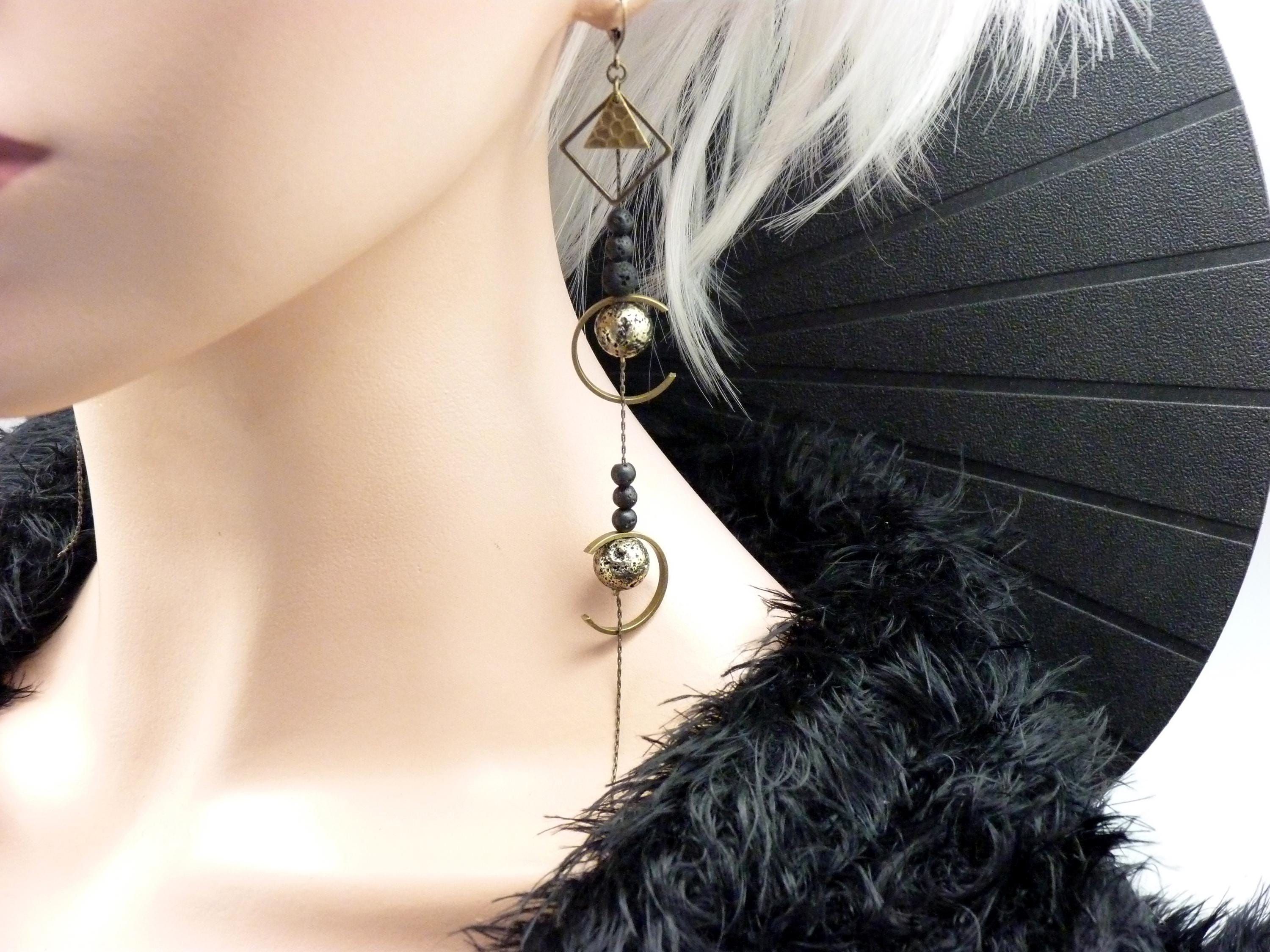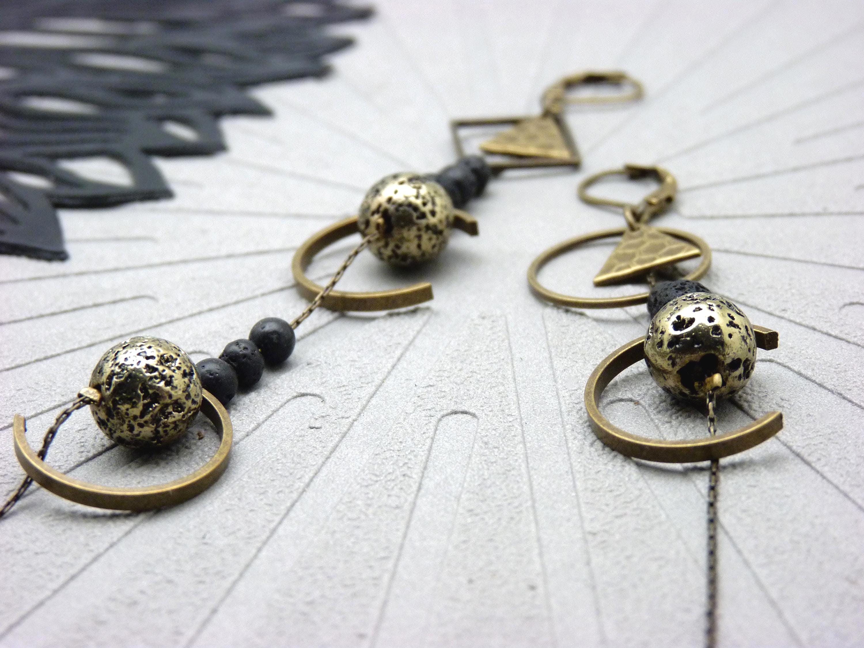 Imagine this celestial play of asymmetry: on one side, a cascade of lava stone beads with bronze and black reflections; on the other, a shorter composition, like two constellations echoing each other. The whole thing is suspended from delicate chains that dance with the slightest movement.