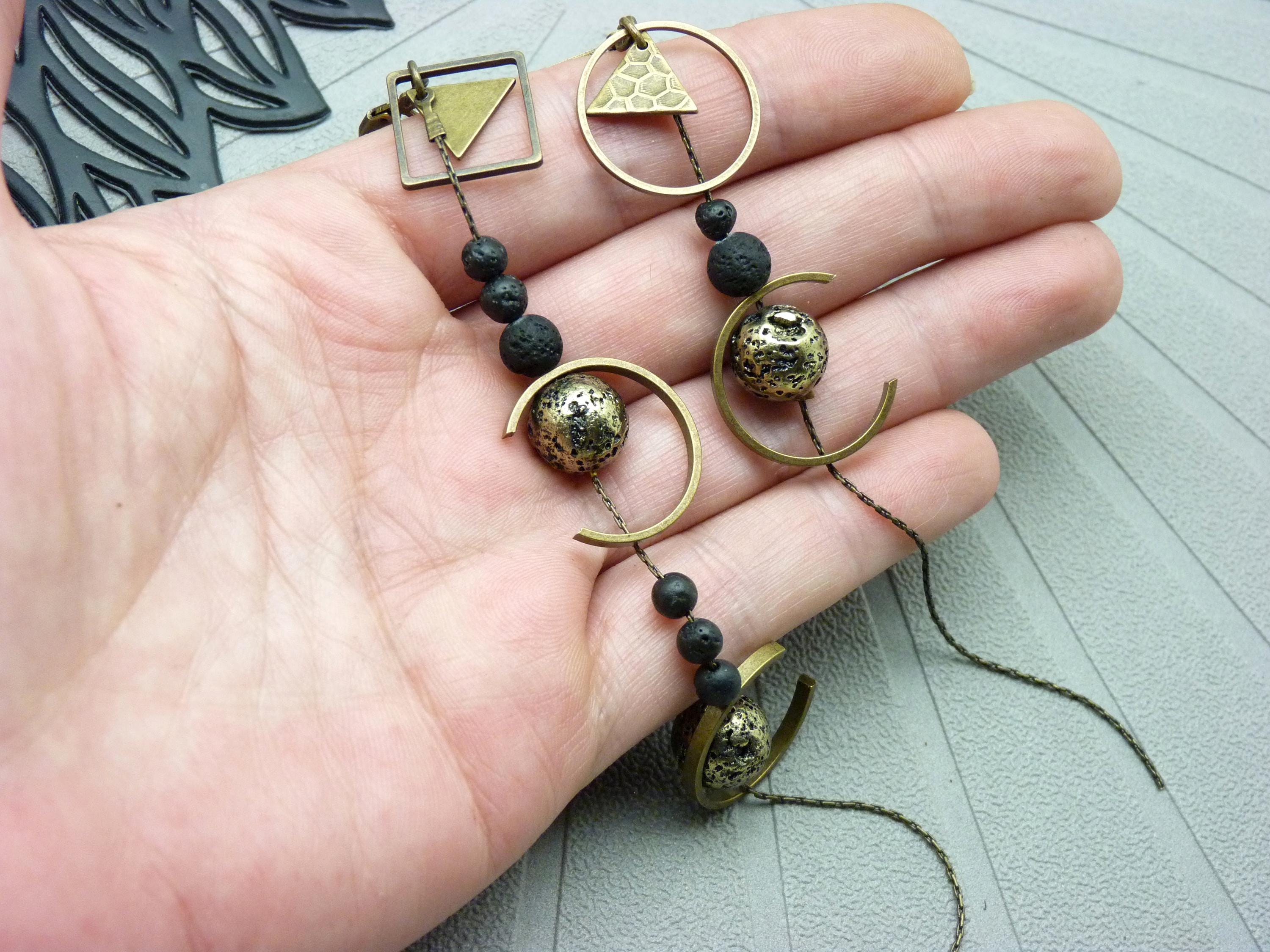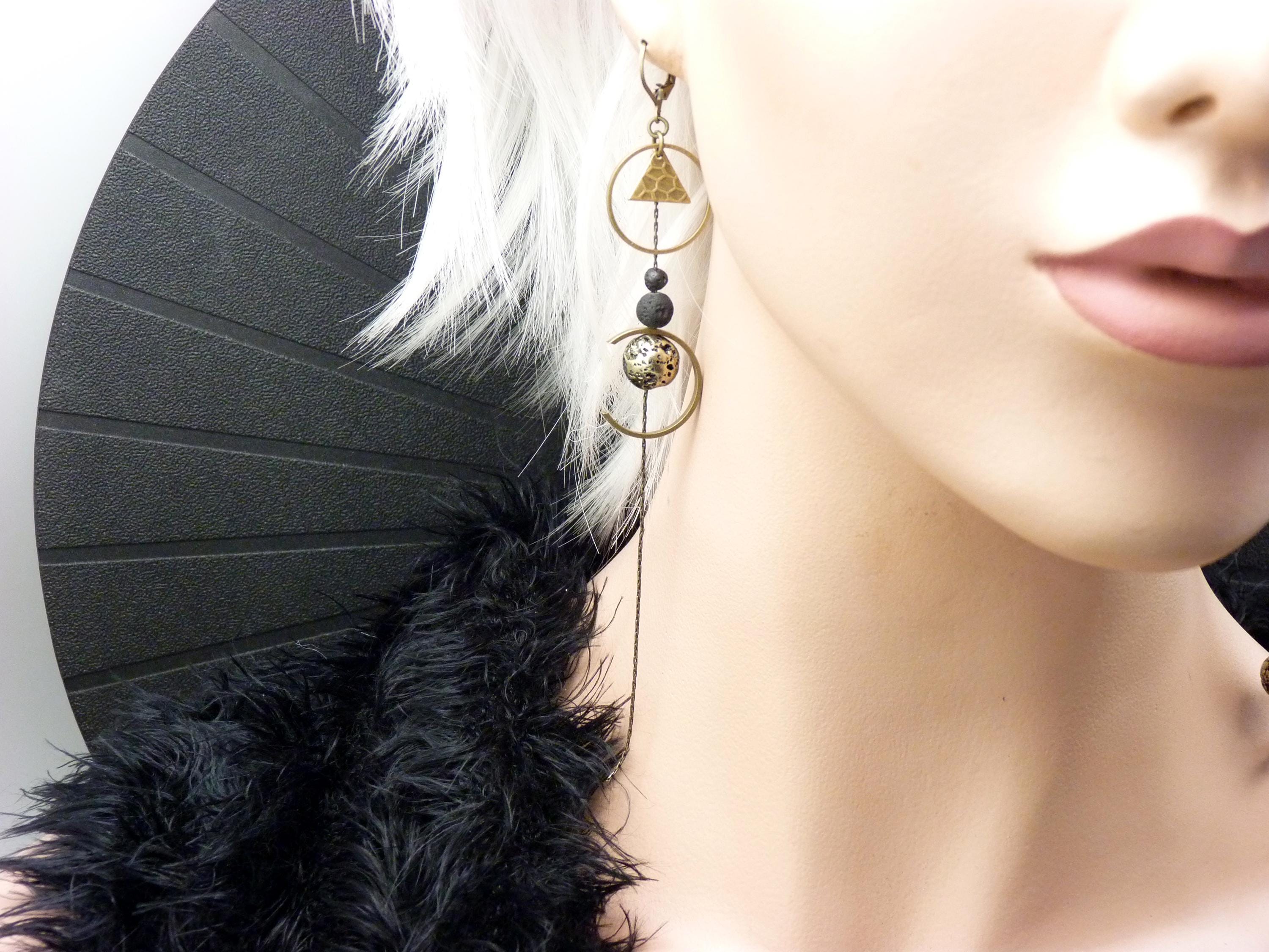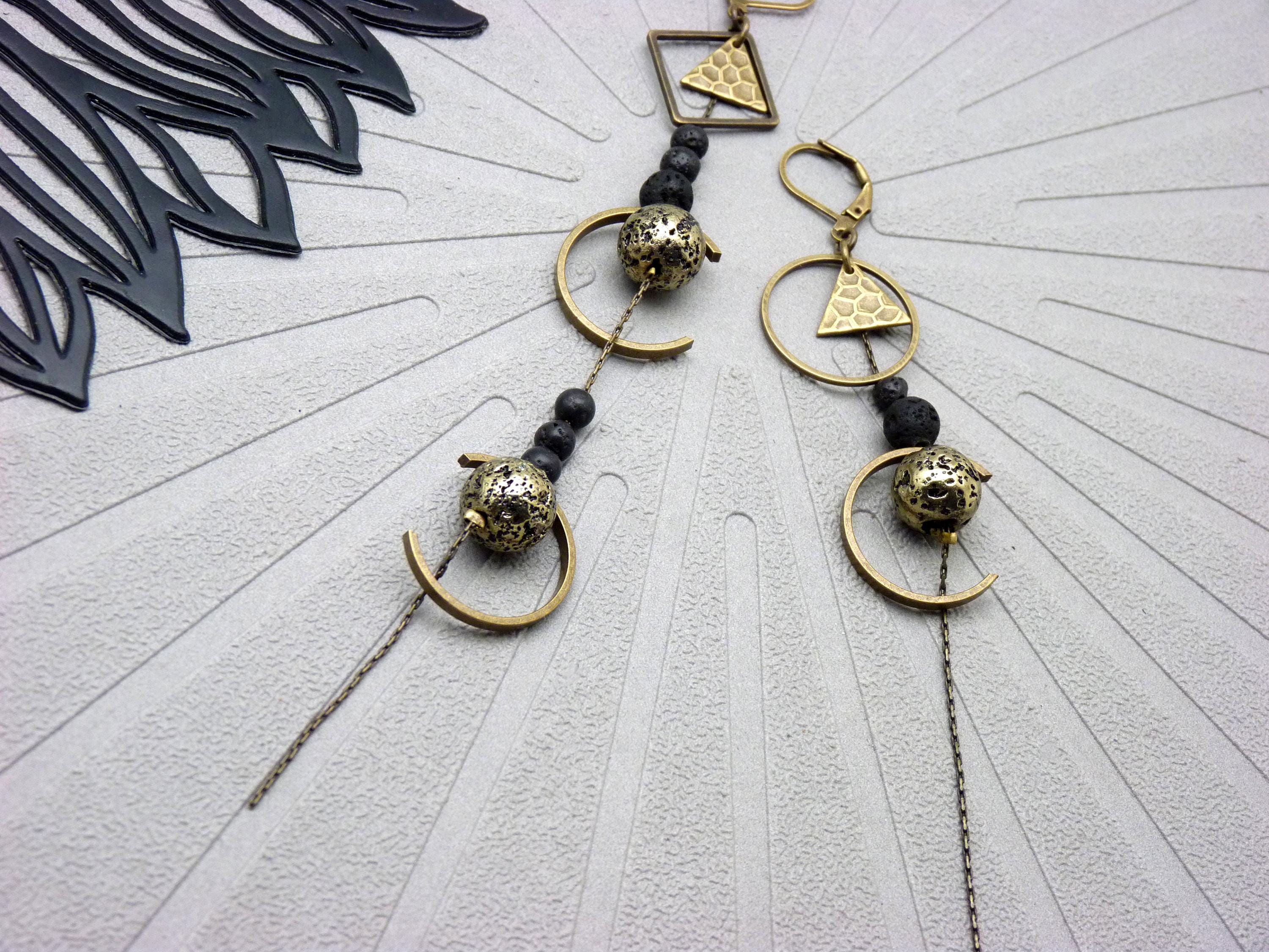 Imagine this celestial play of asymmetry: on one side, a cascade of lava stone beads with bronze and black reflections; on the other, a shorter composition, like two constellations echoing each other. The whole thing is suspended from delicate chains that dance with the slightest movement.