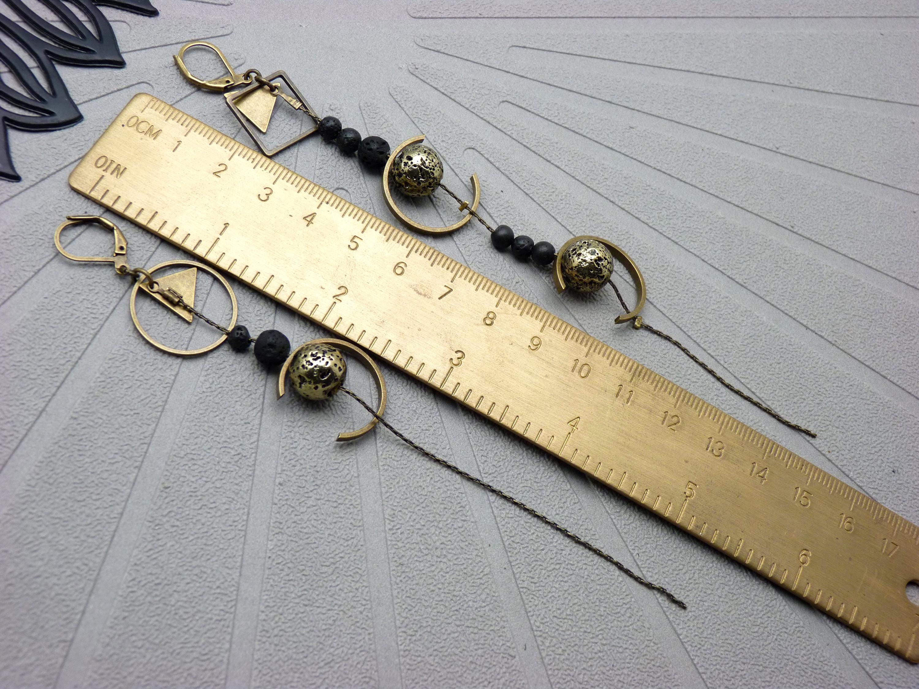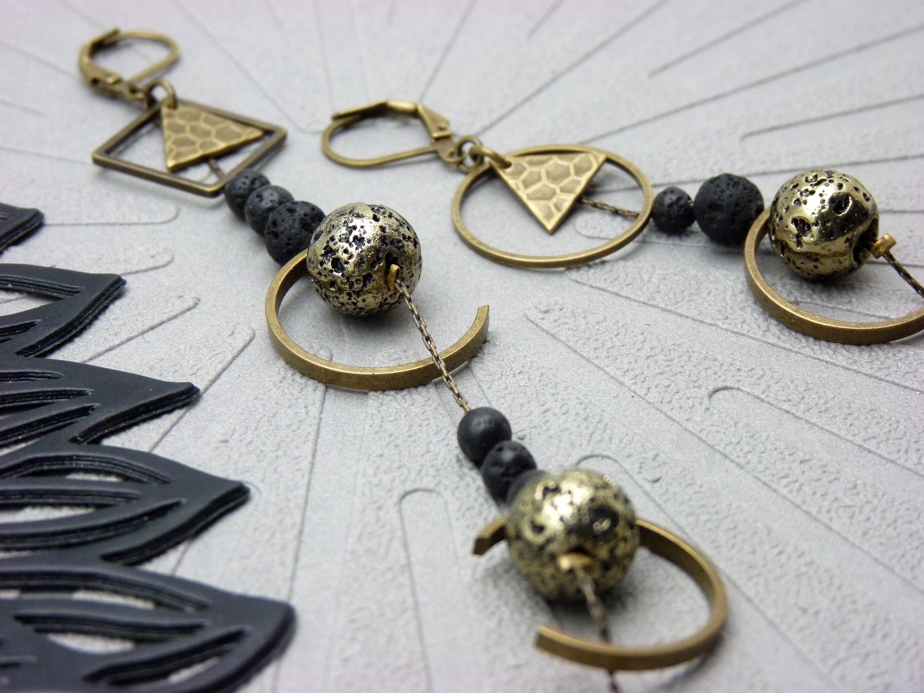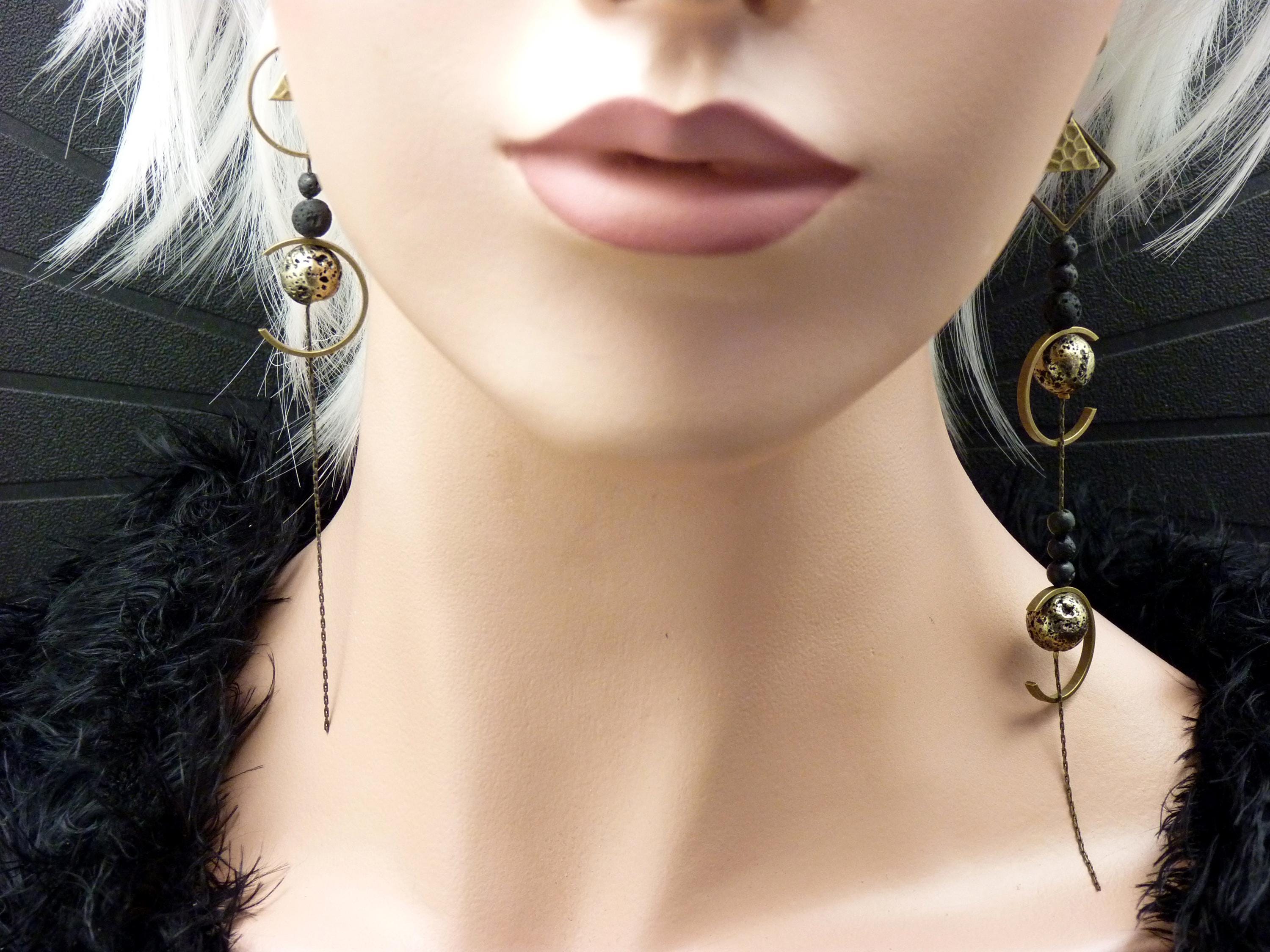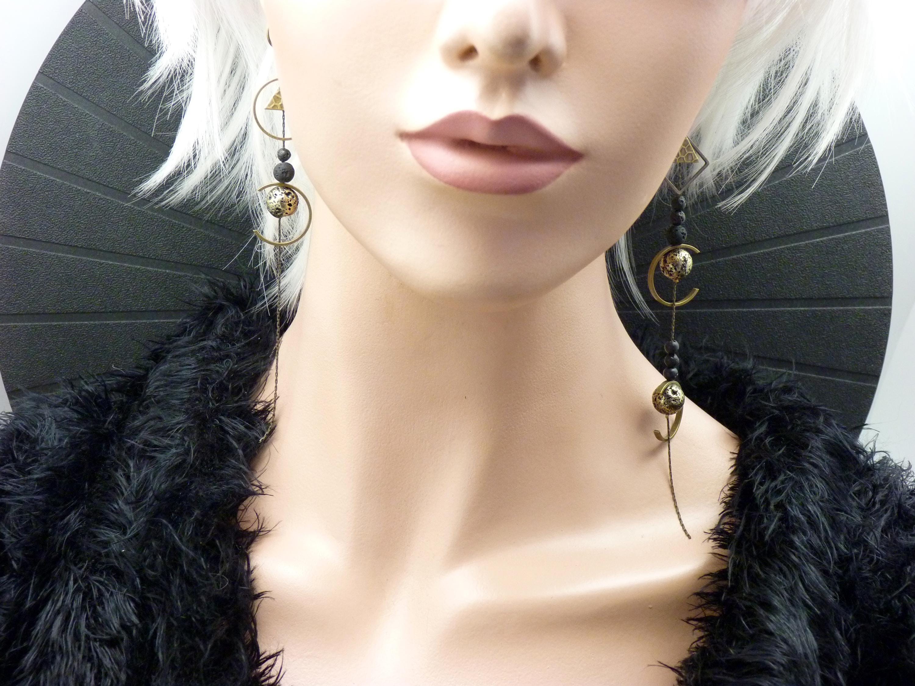 Imagine this celestial play of asymmetry: on one side, a cascade of lava stone beads with bronze and black reflections; on the other, a shorter composition, like two constellations echoing each other. The whole thing is suspended from delicate chains that dance with the slightest movement.