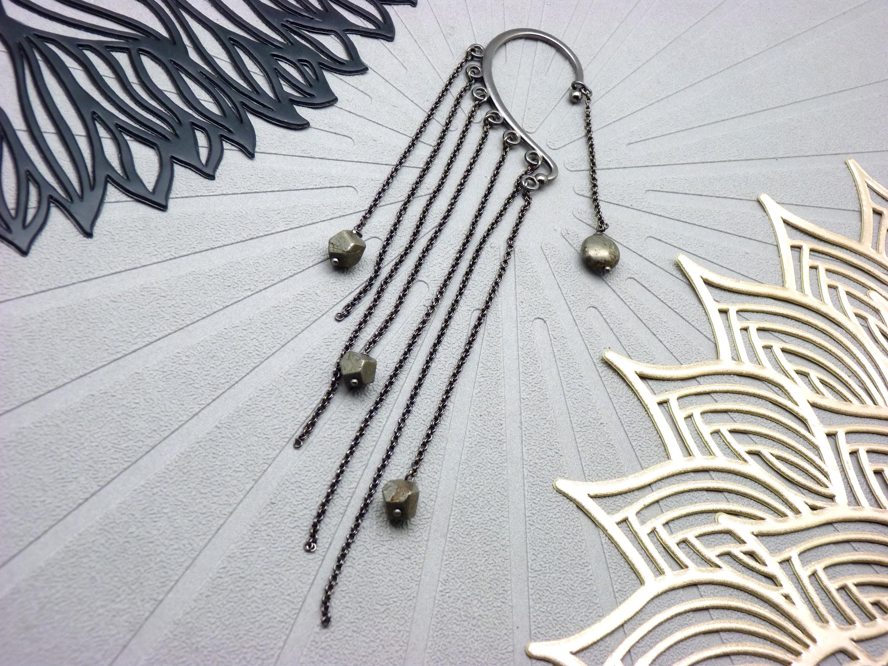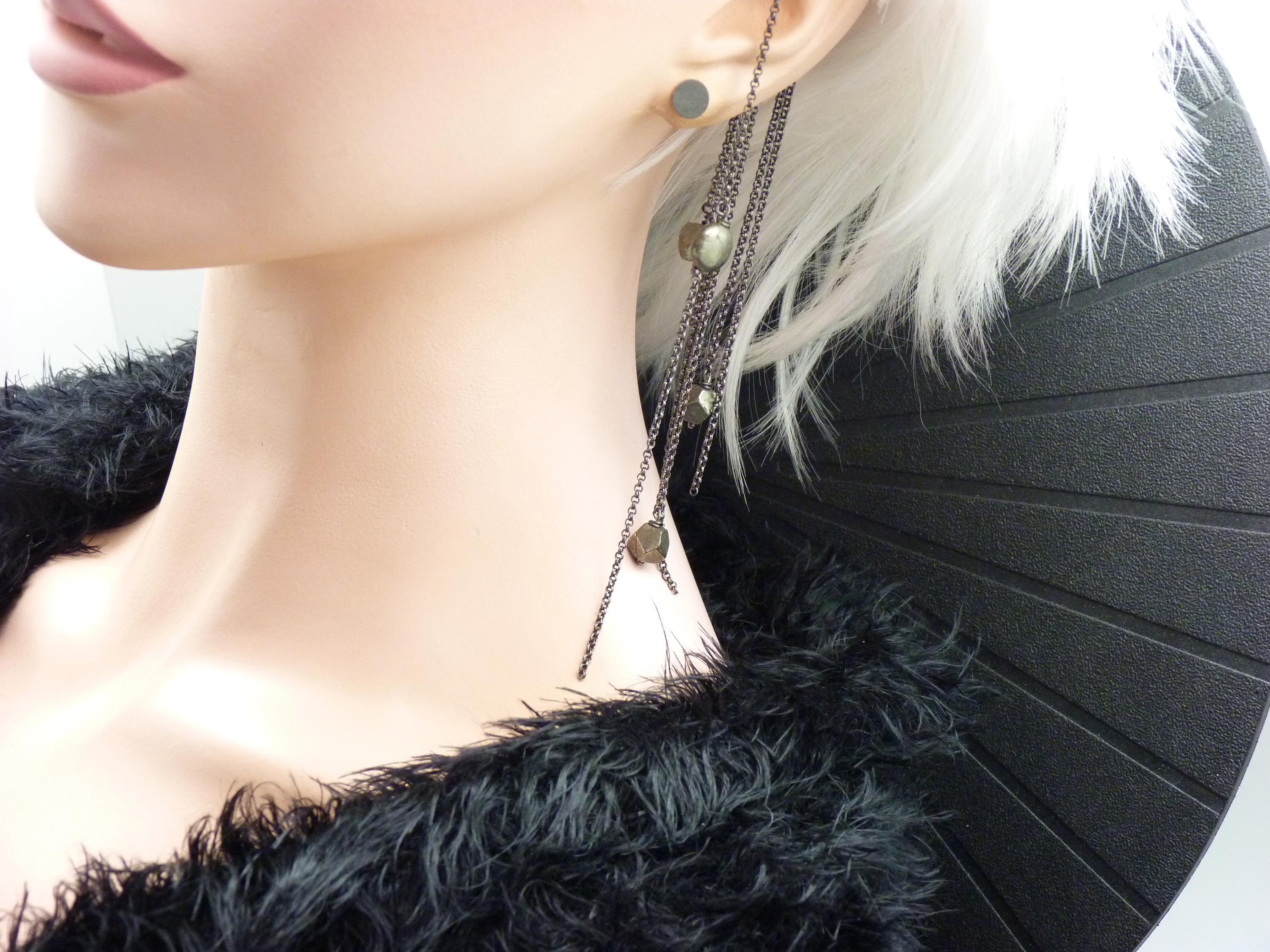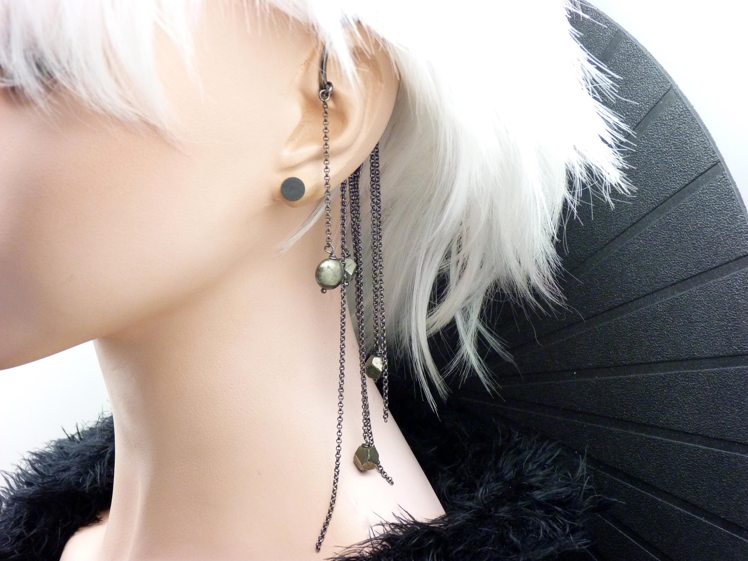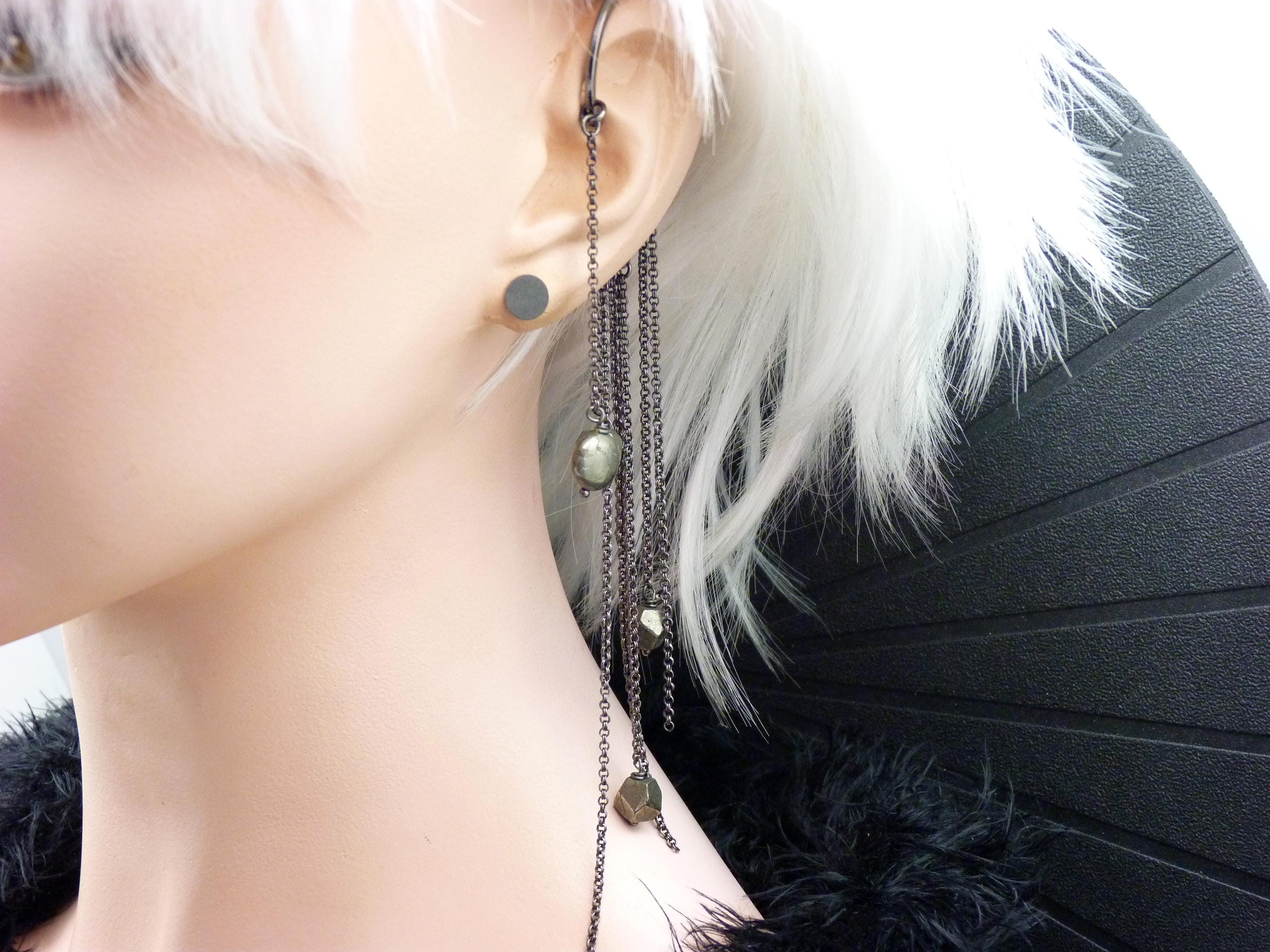 Imagine this cascade of fine black metal (gunmetal) chains that hugs the earlobe and falls gracefully over the shoulder. Each chain is punctuated with nuggets of genuine Pyrite, a stone with a khaki metallic sheen that catches the light with every movement.