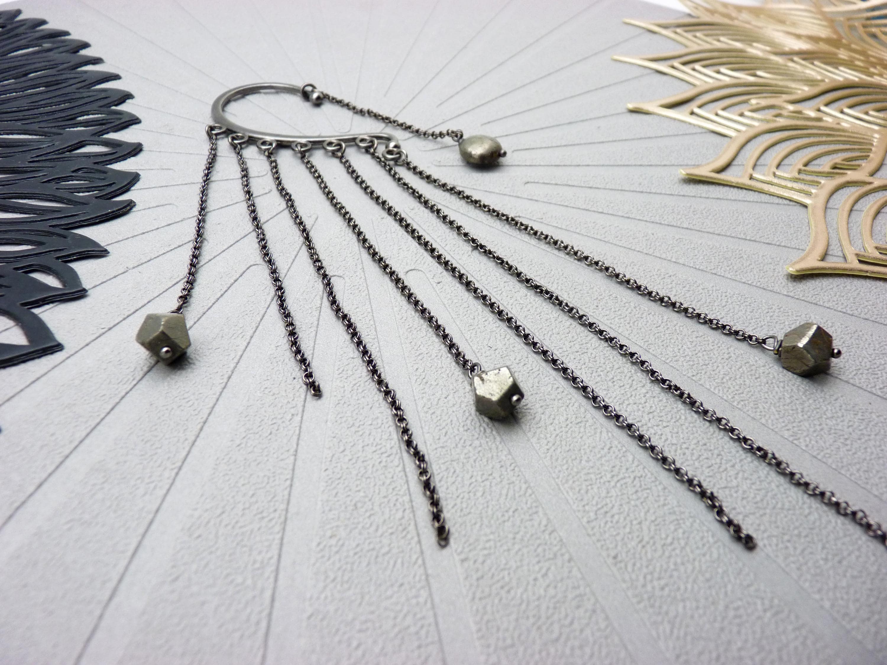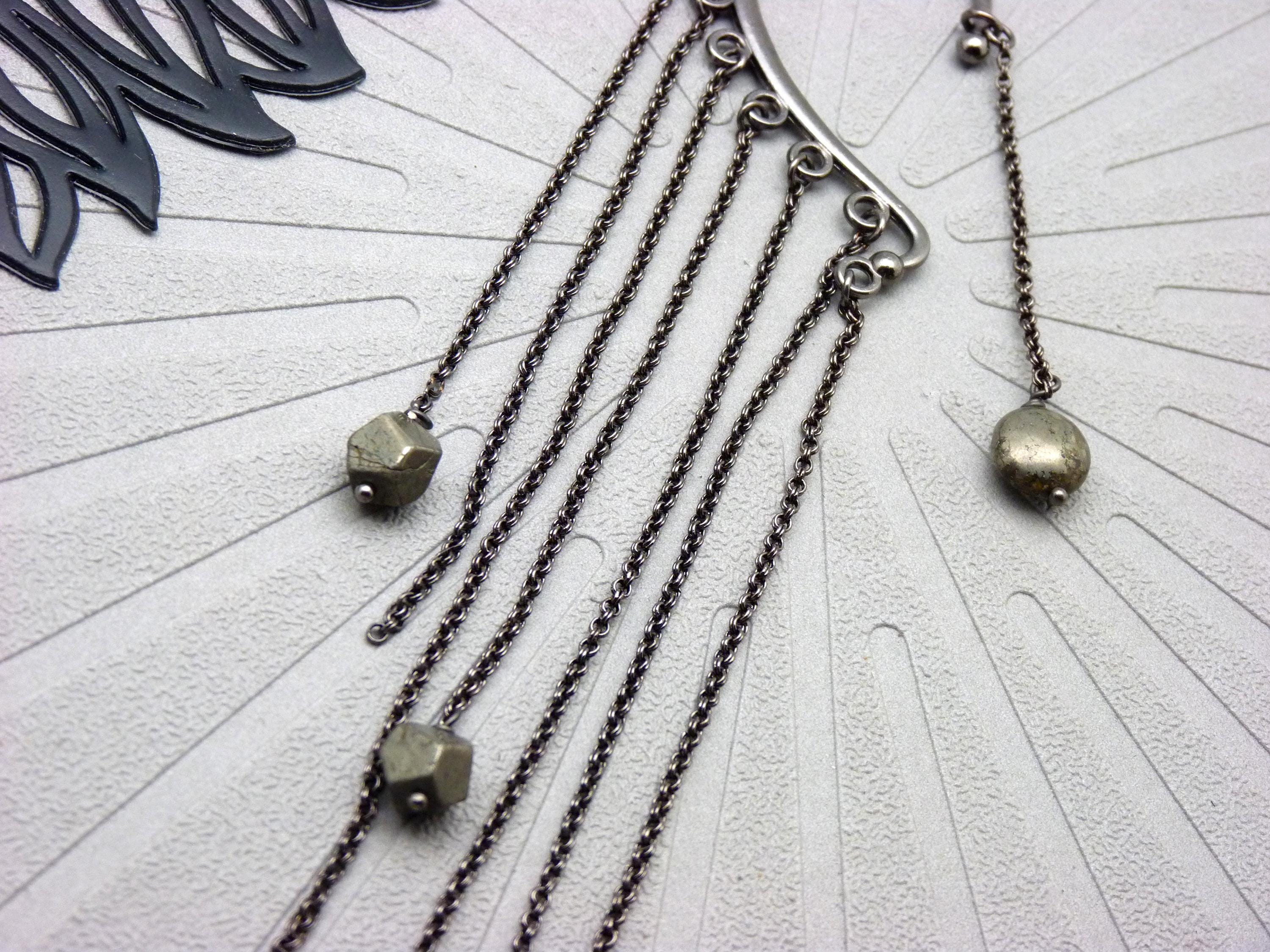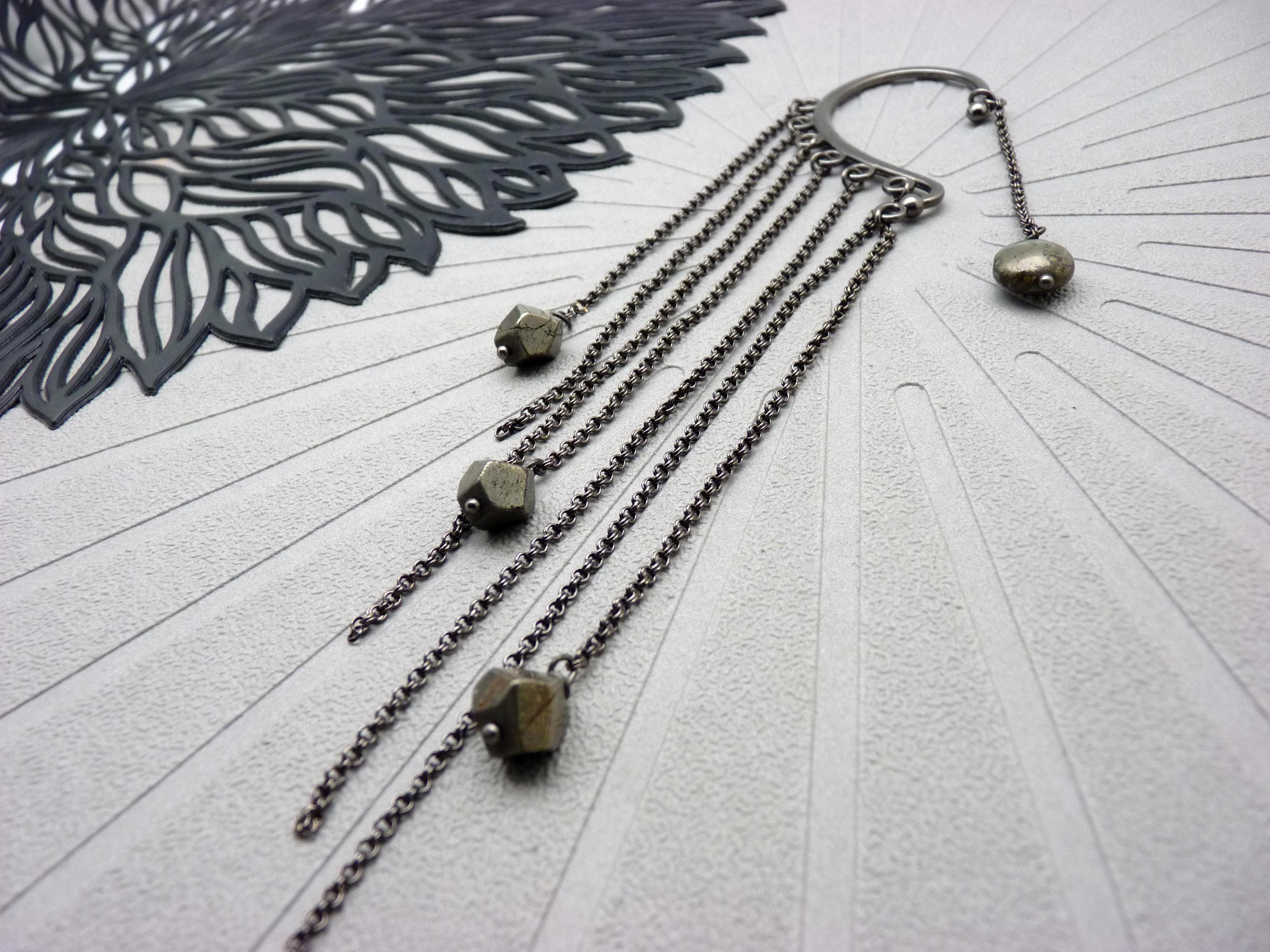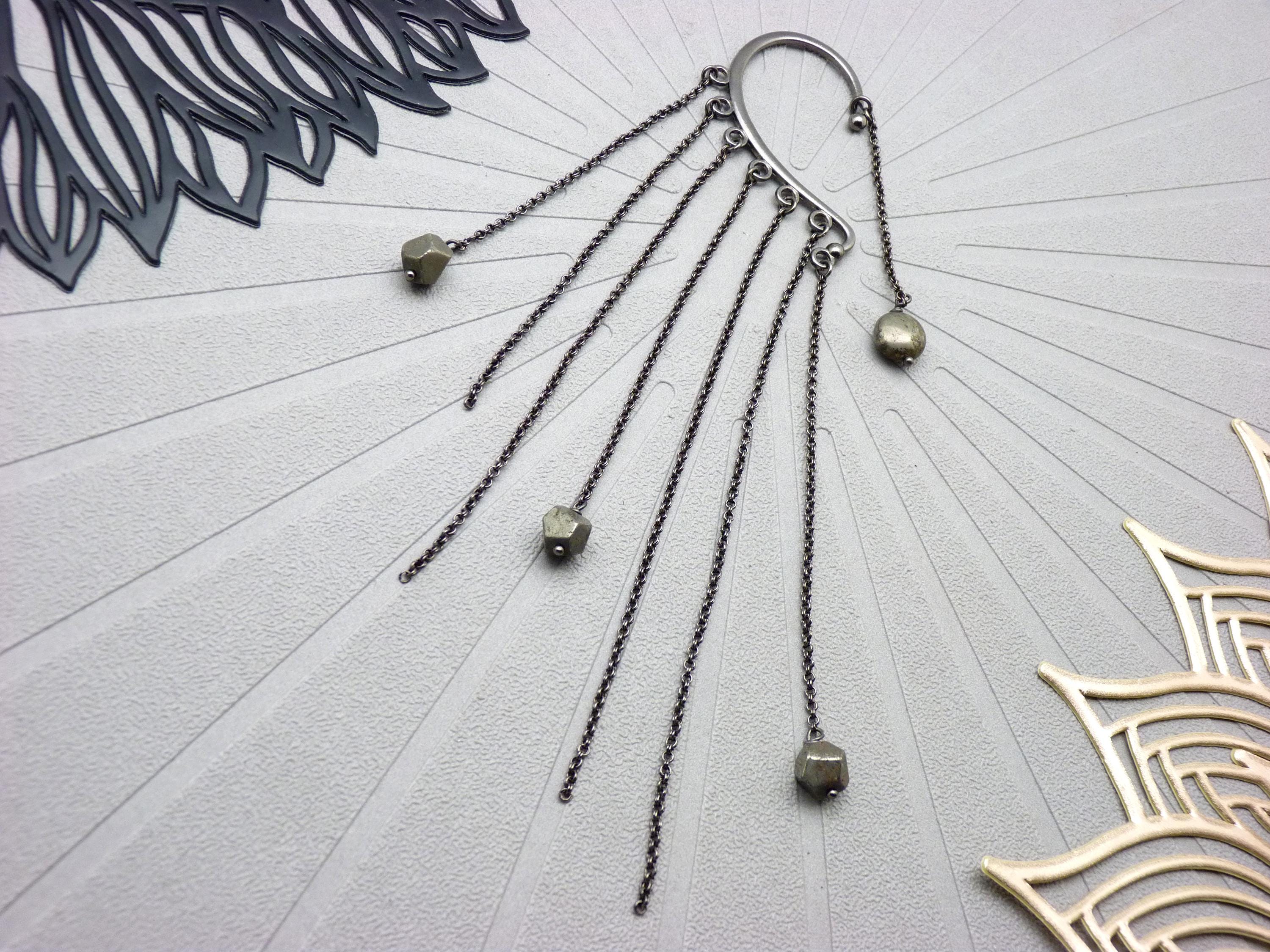 Imagine this cascade of fine black metal (gunmetal) chains that hugs the earlobe and falls gracefully over the shoulder. Each chain is punctuated with nuggets of genuine Pyrite, a stone with a khaki metallic sheen that catches the light with every movement.