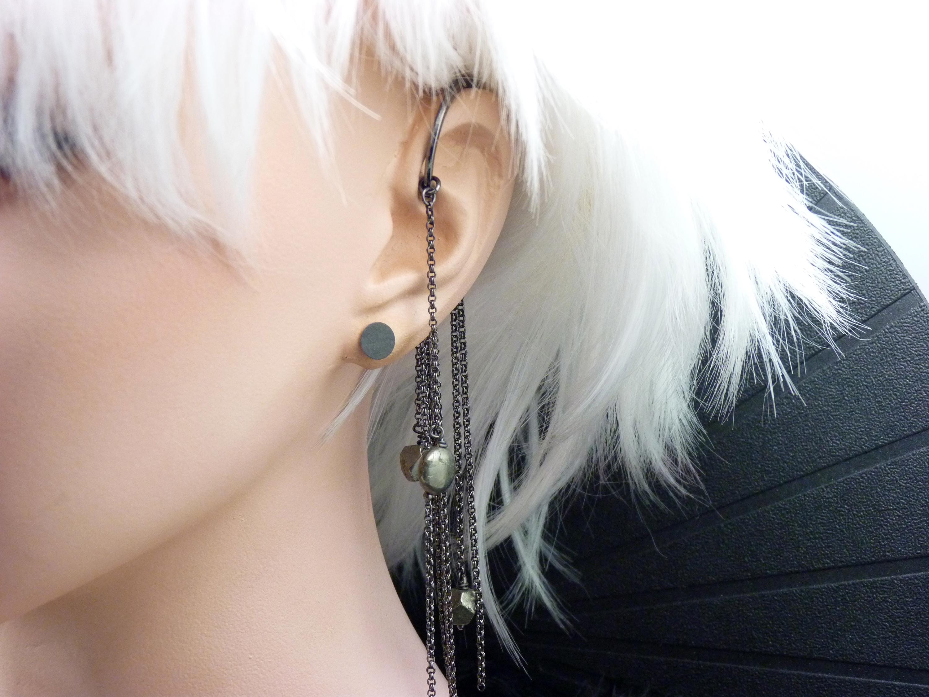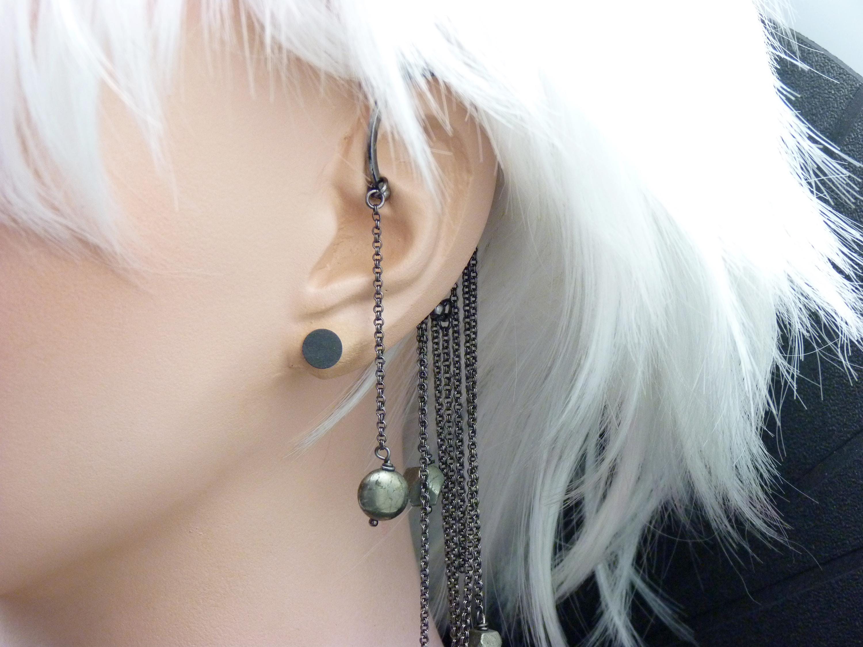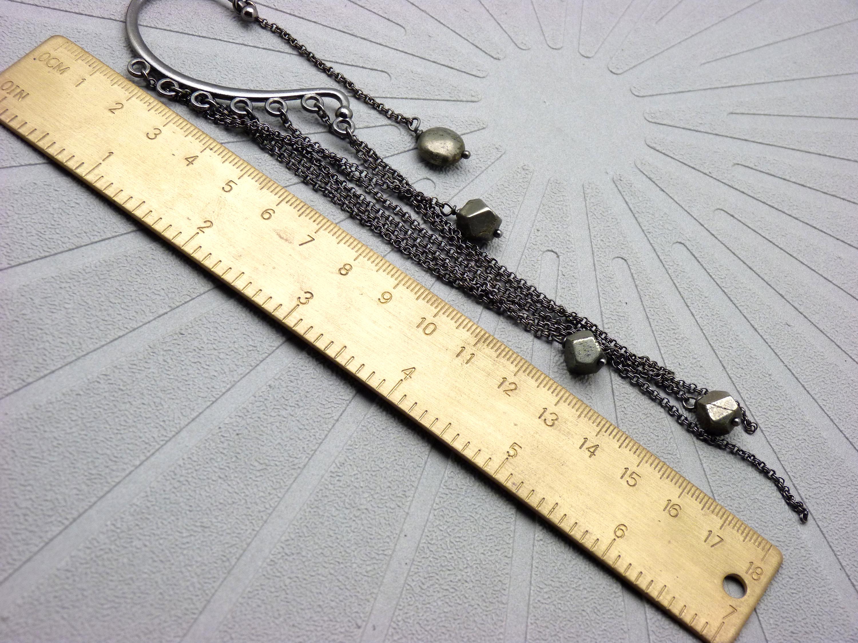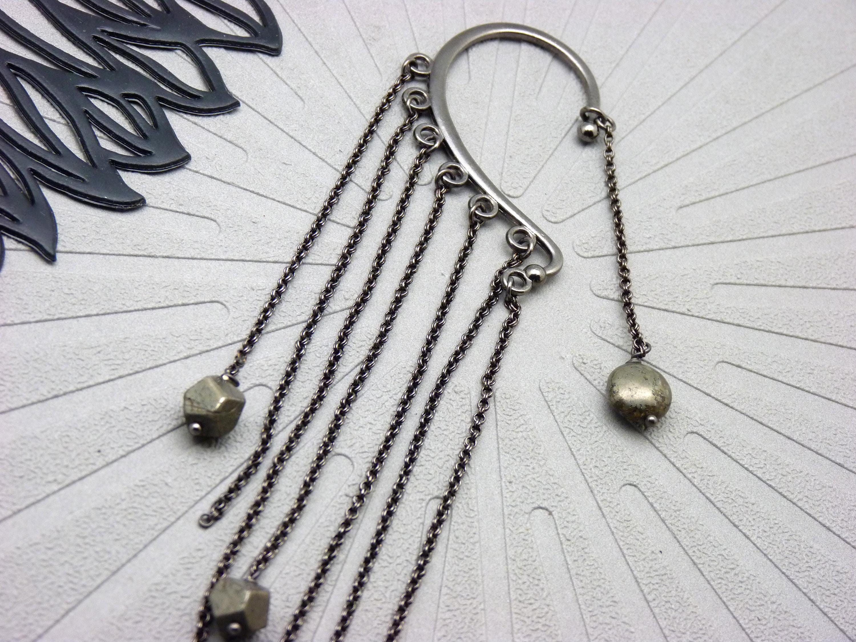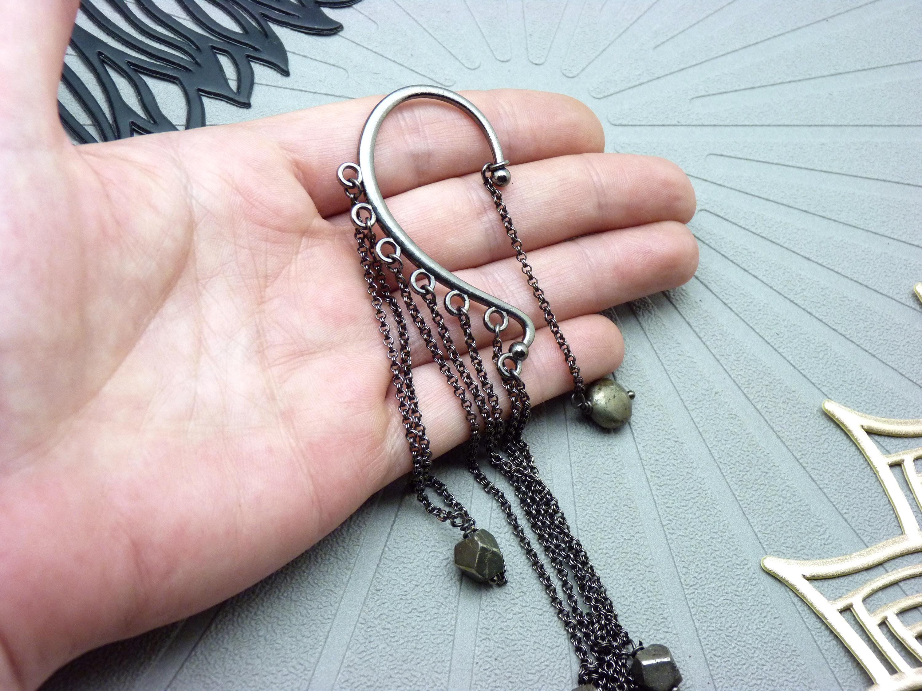 Imagine this cascade of fine black metal (gunmetal) chains that hugs the earlobe and falls gracefully over the shoulder. Each chain is punctuated with nuggets of genuine Pyrite, a stone with a khaki metallic sheen that catches the light with every movement.