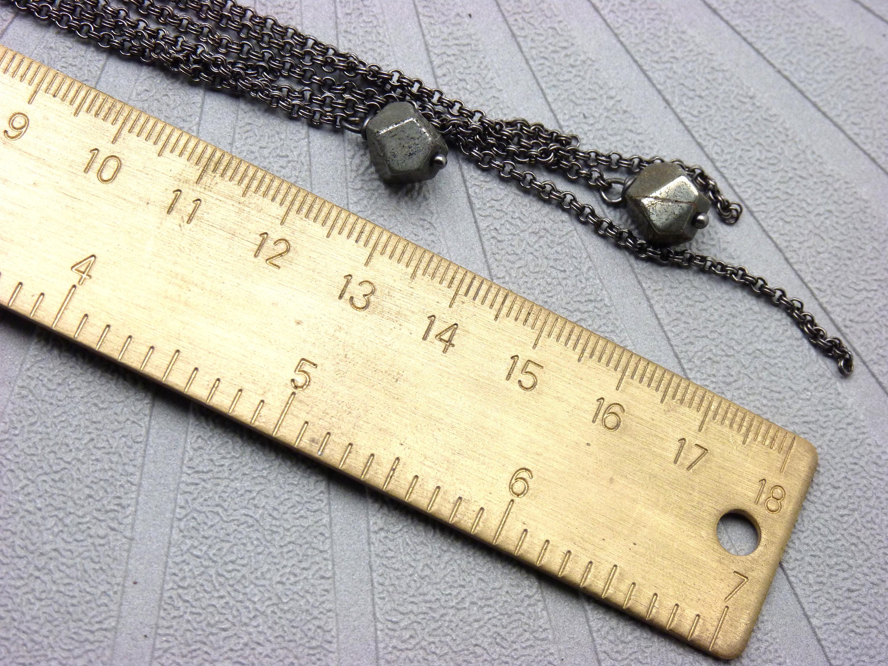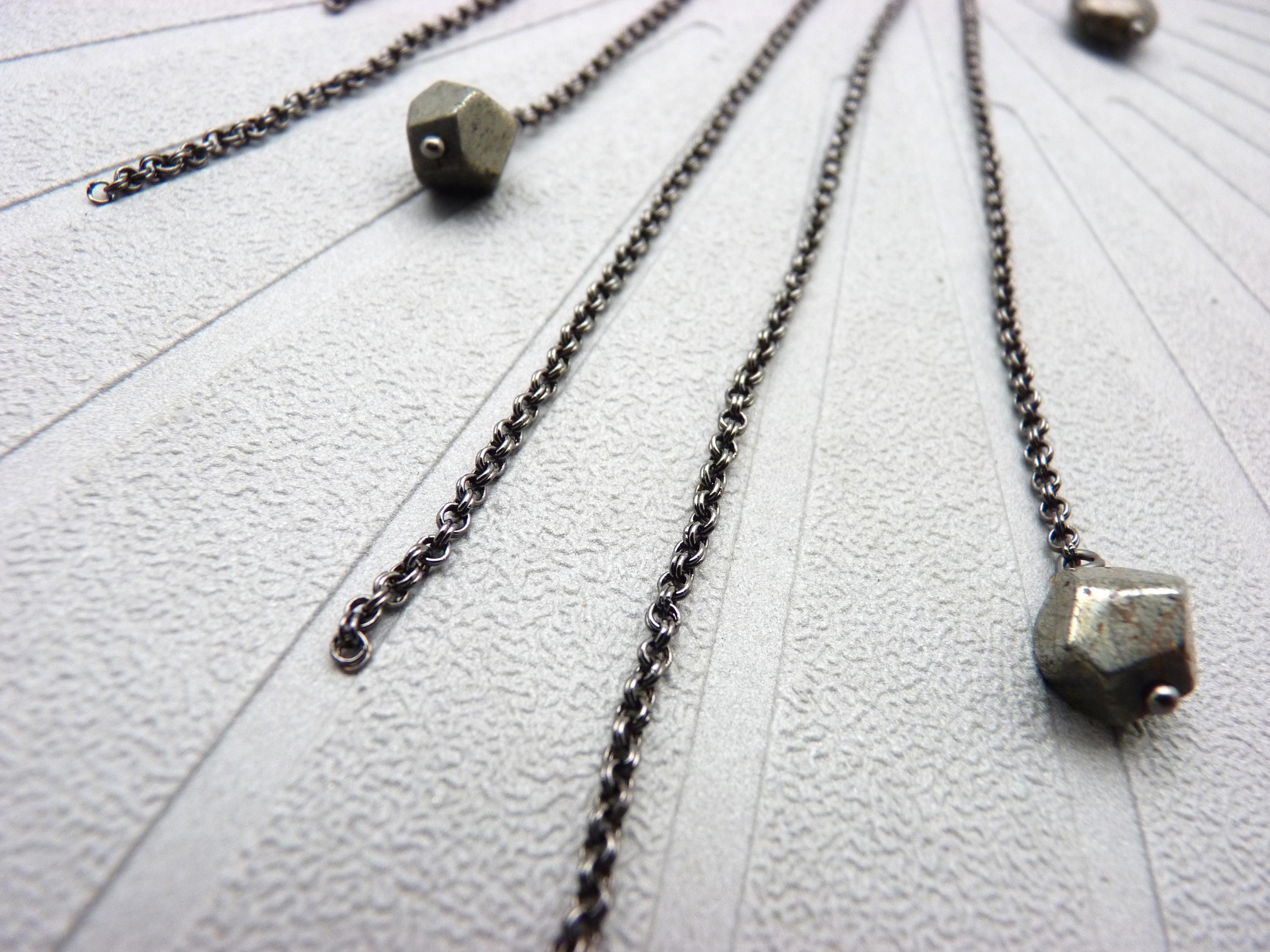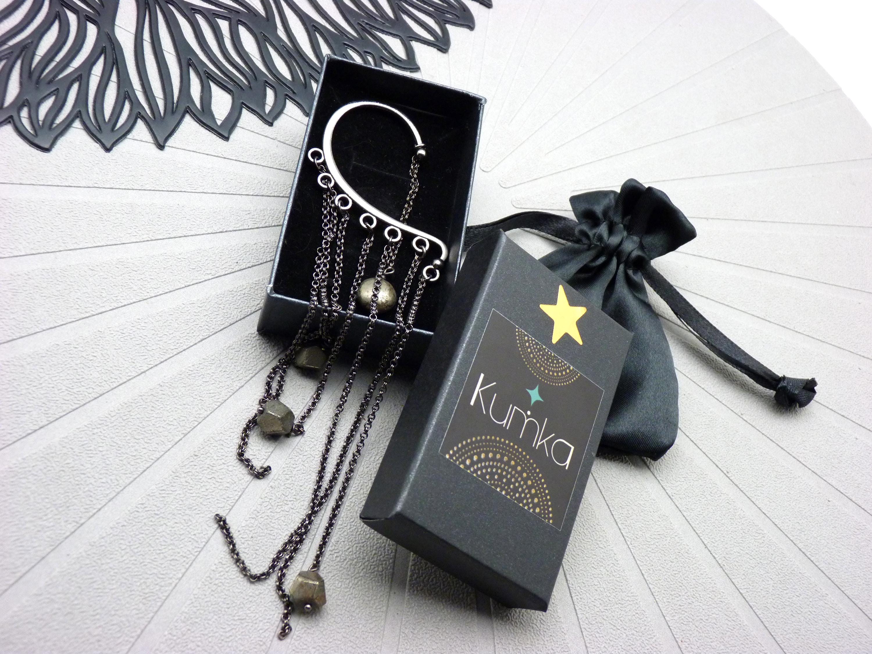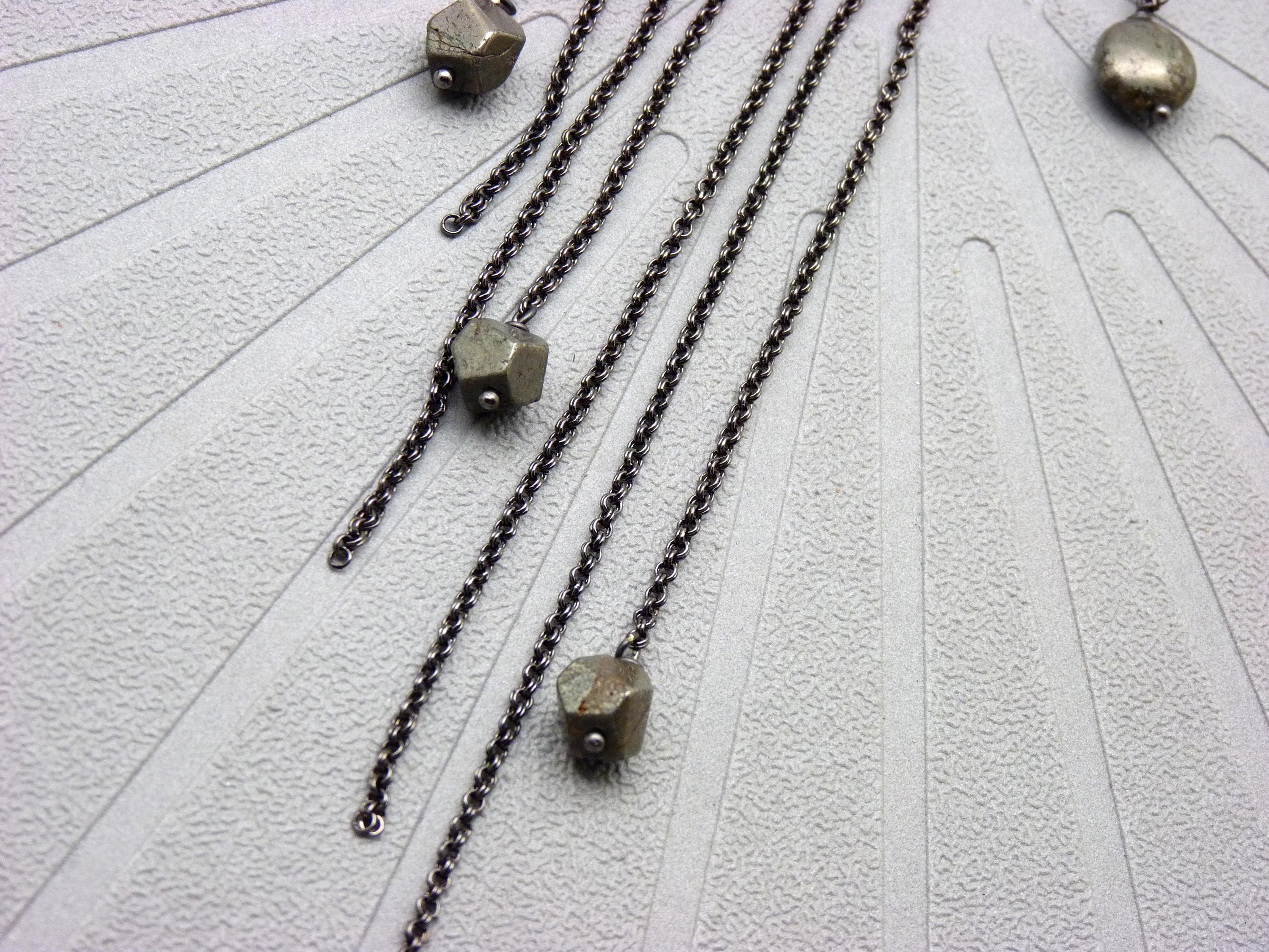 Imagine this cascade of fine black metal (gunmetal) chains that hugs the earlobe and falls gracefully over the shoulder. Each chain is punctuated with nuggets of genuine Pyrite, a stone with a khaki metallic sheen that catches the light with every movement.