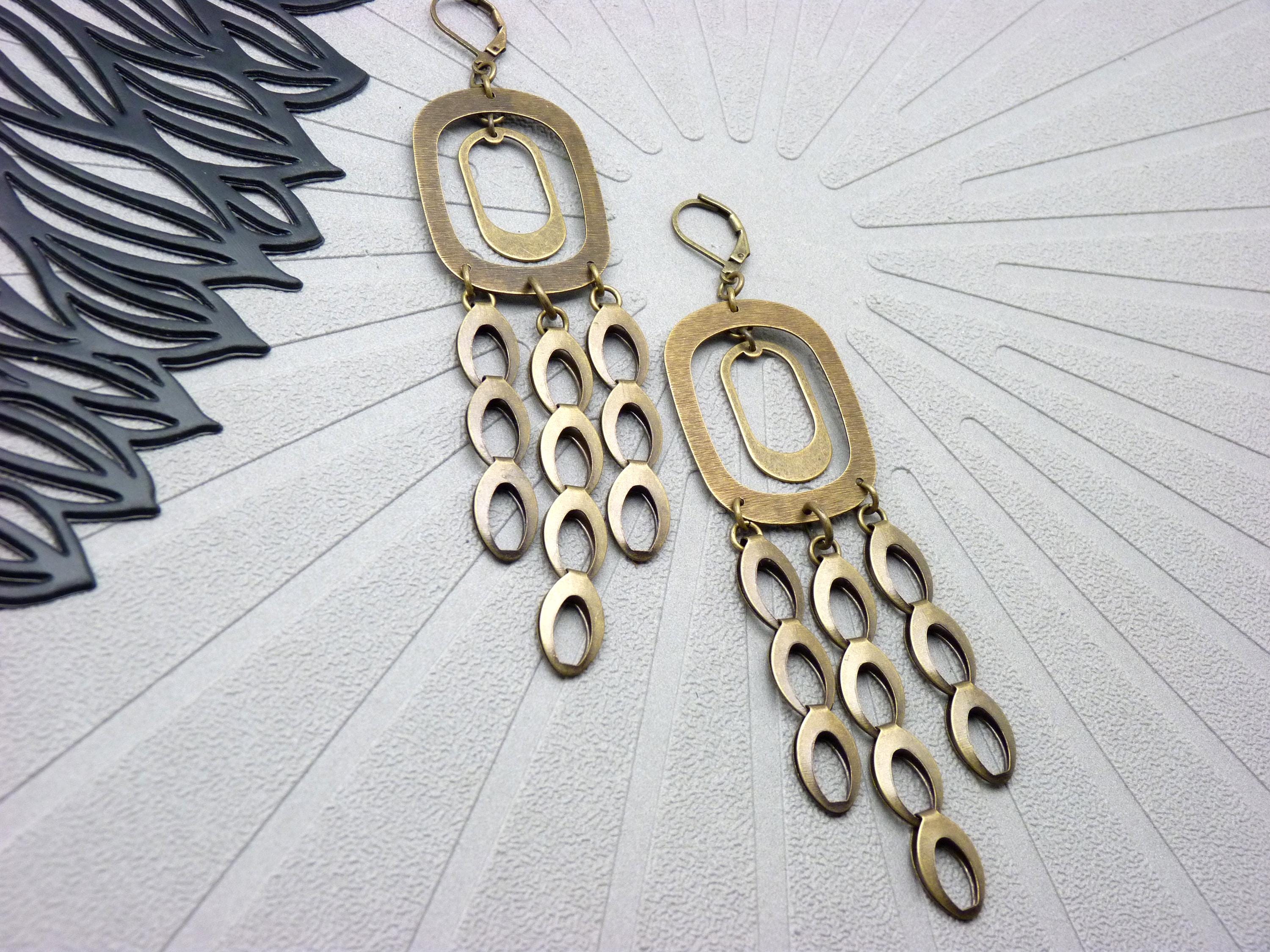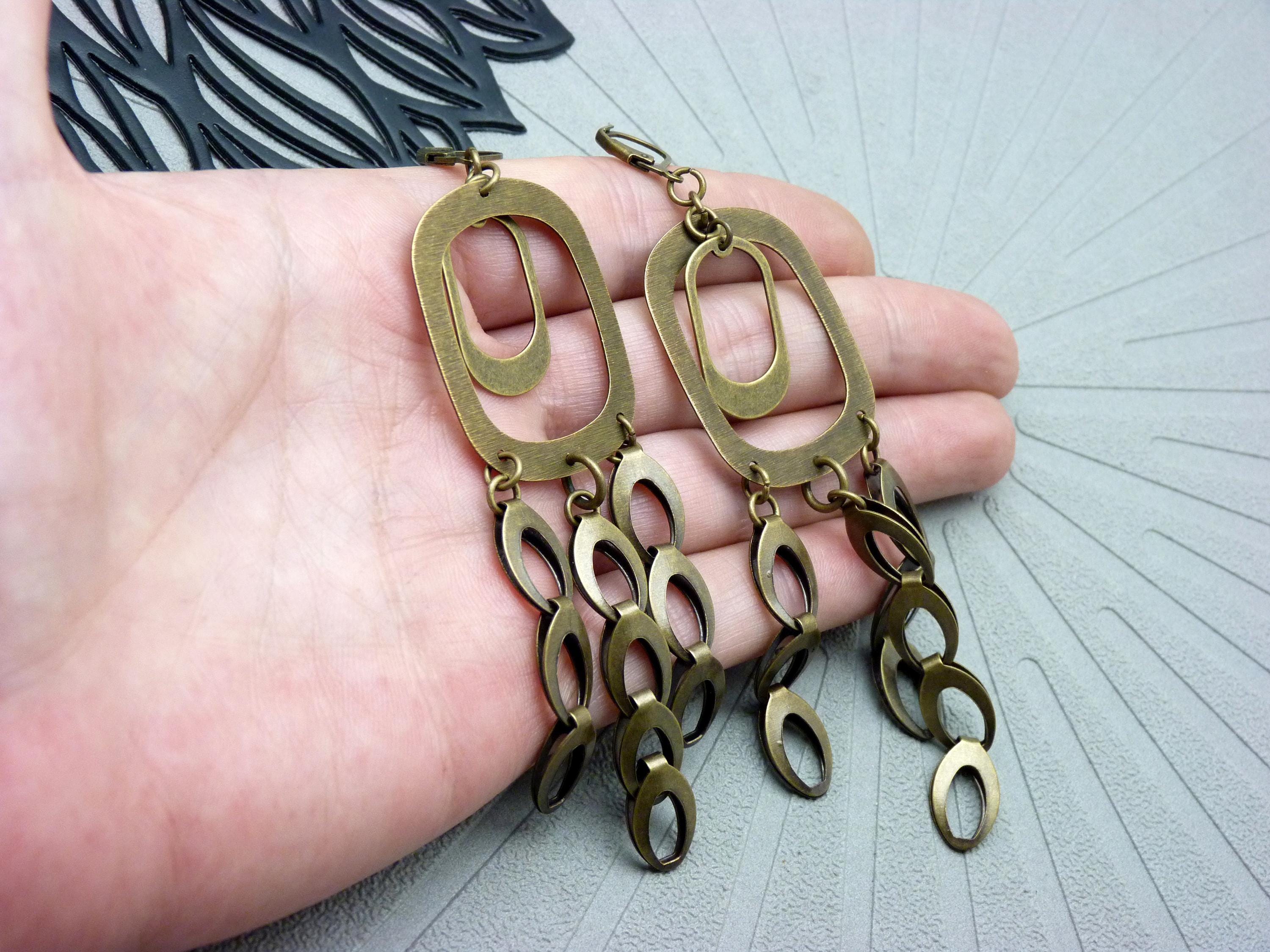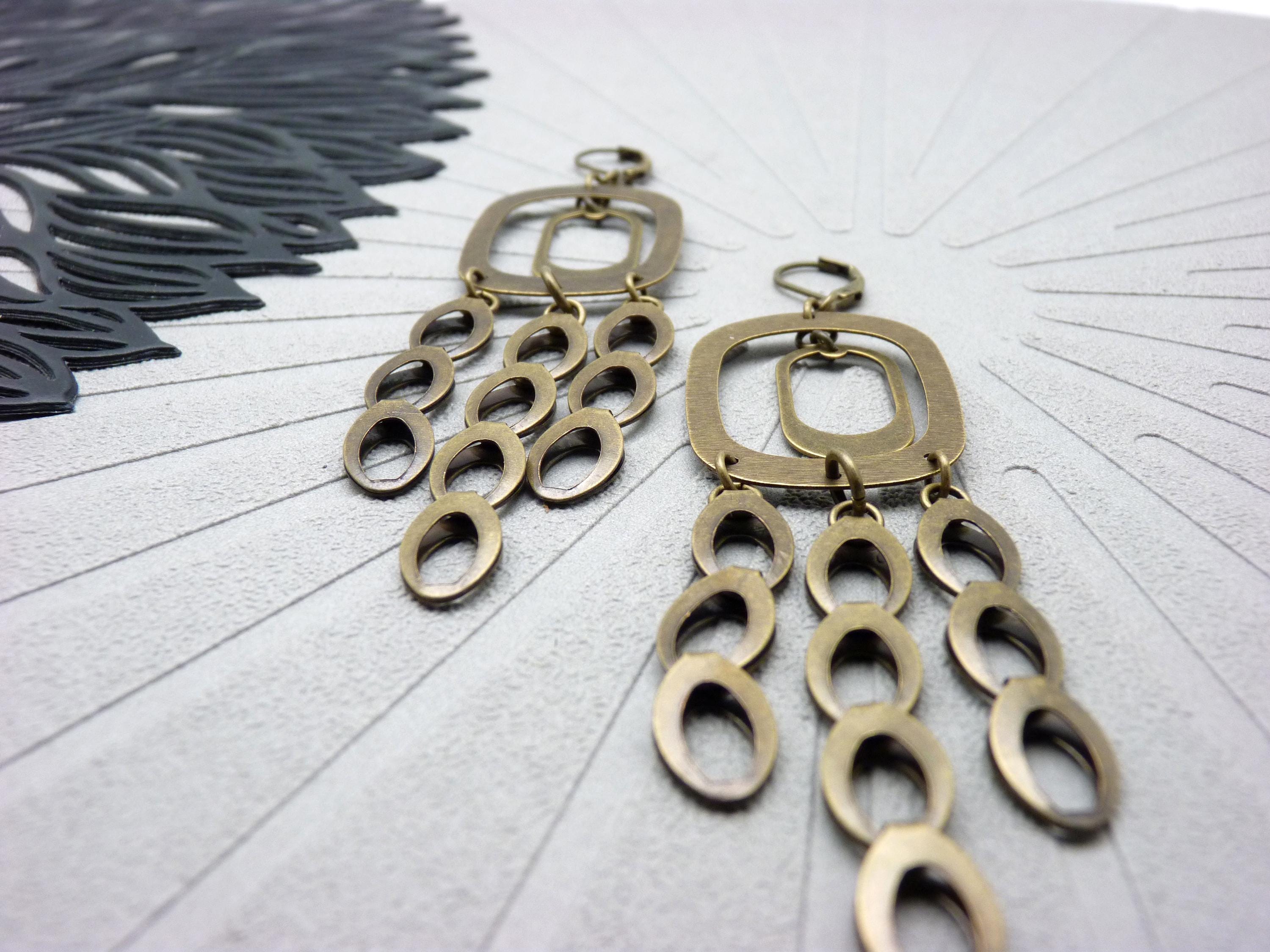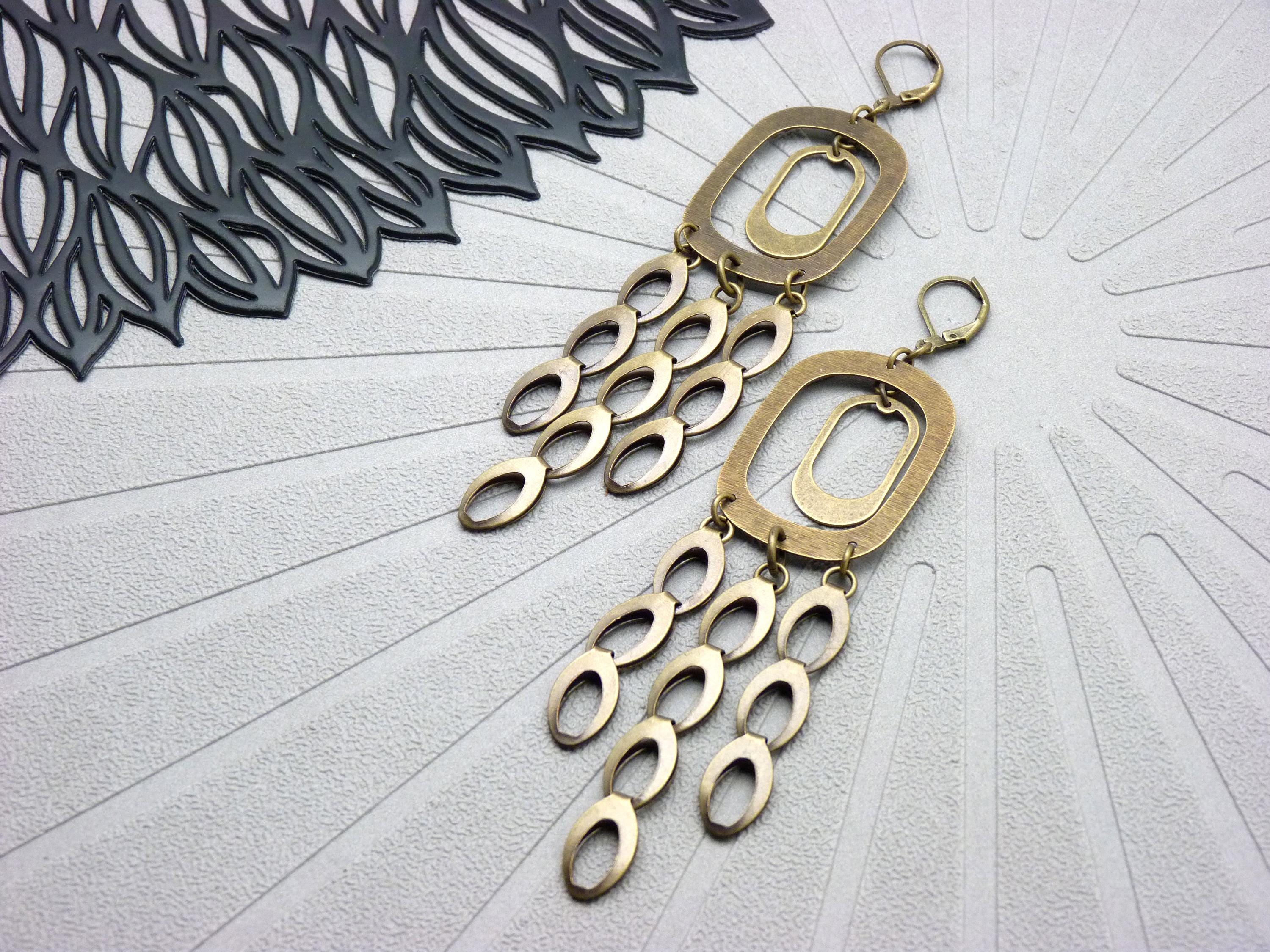A cascade of oval bronze metal discs is suspended from a graphic brushed metal structure, creating a piece of jewelry that is constantly in motion. They come alive with the rhythm of your steps or your dances in the evening!