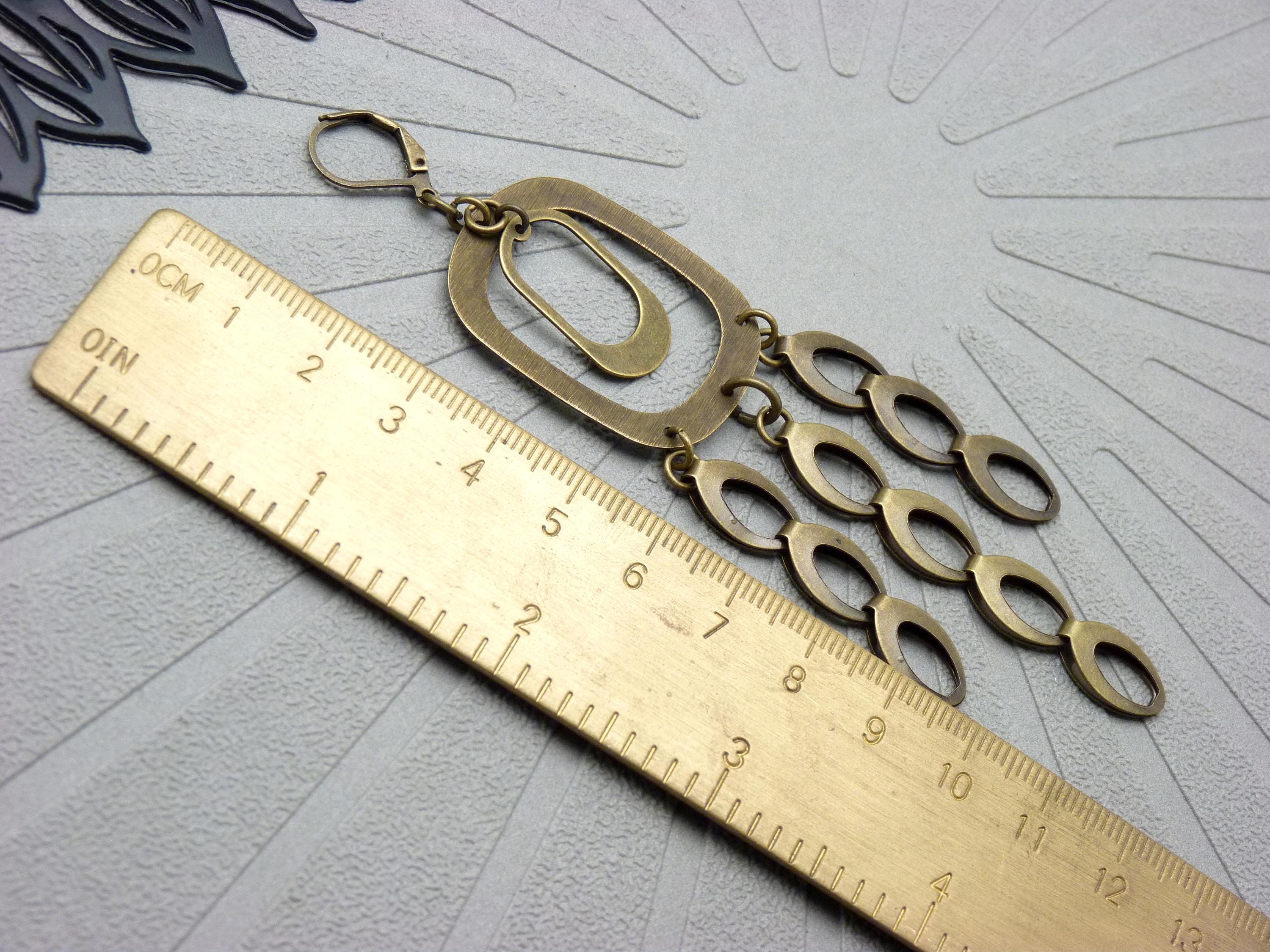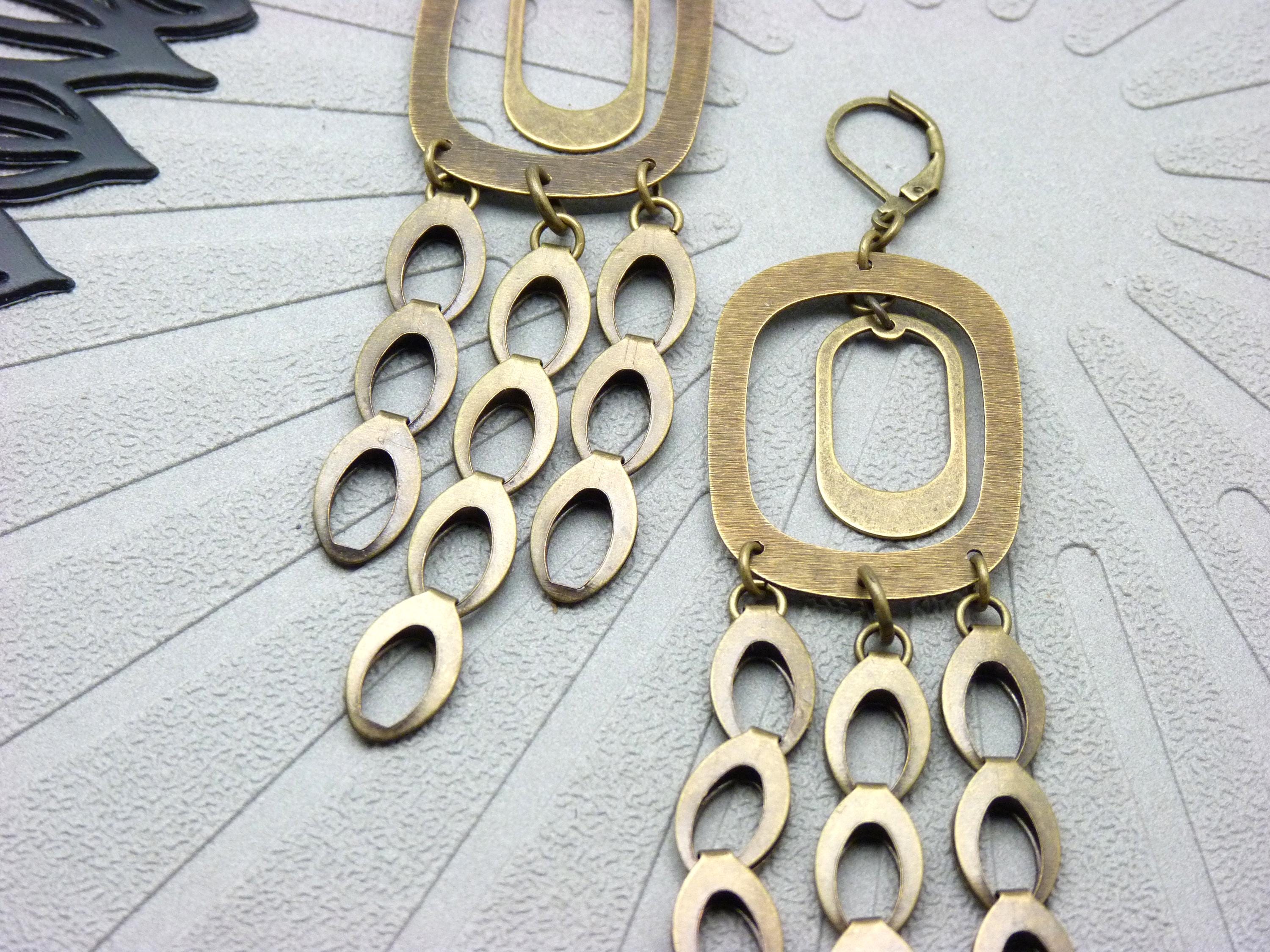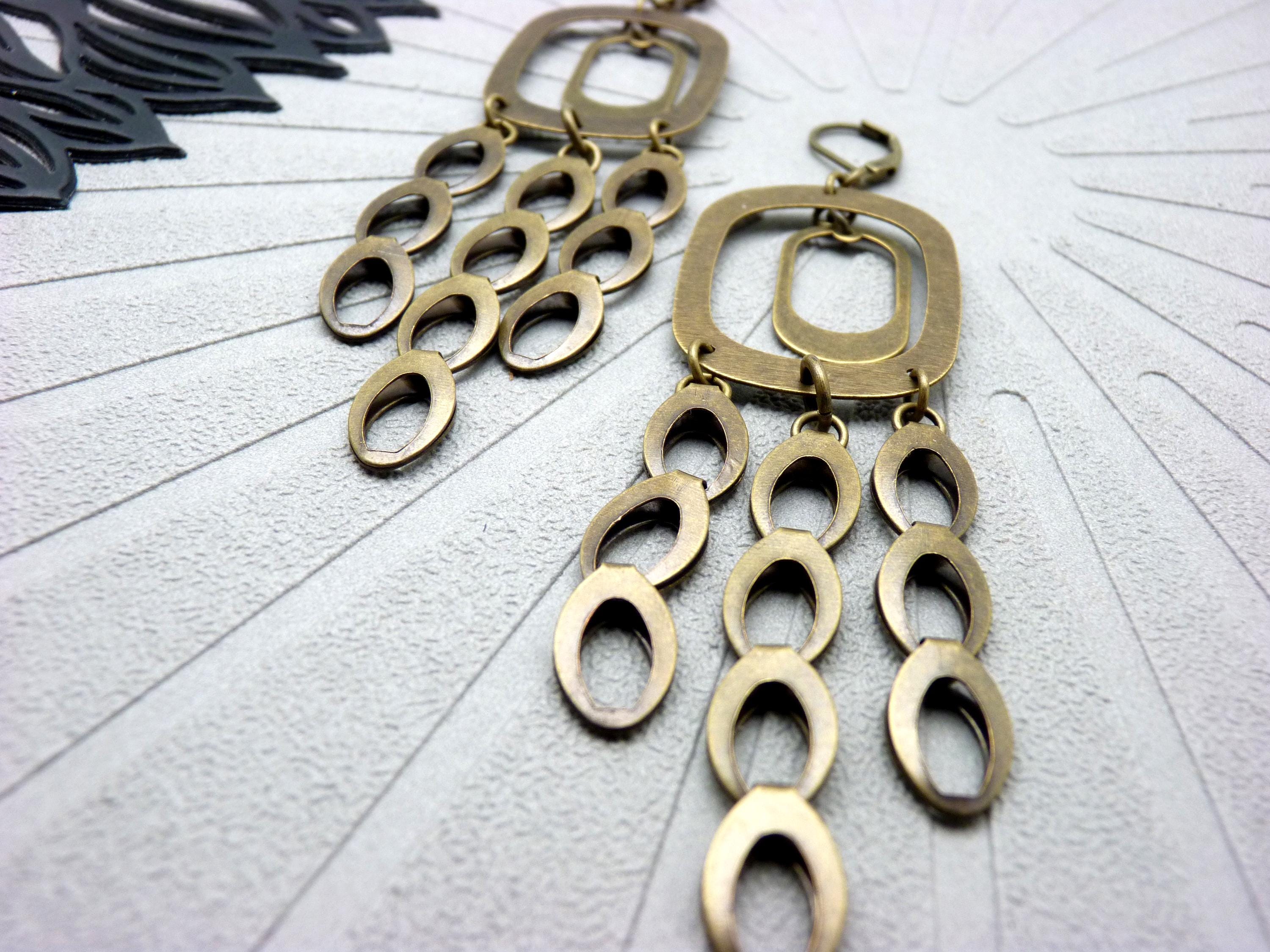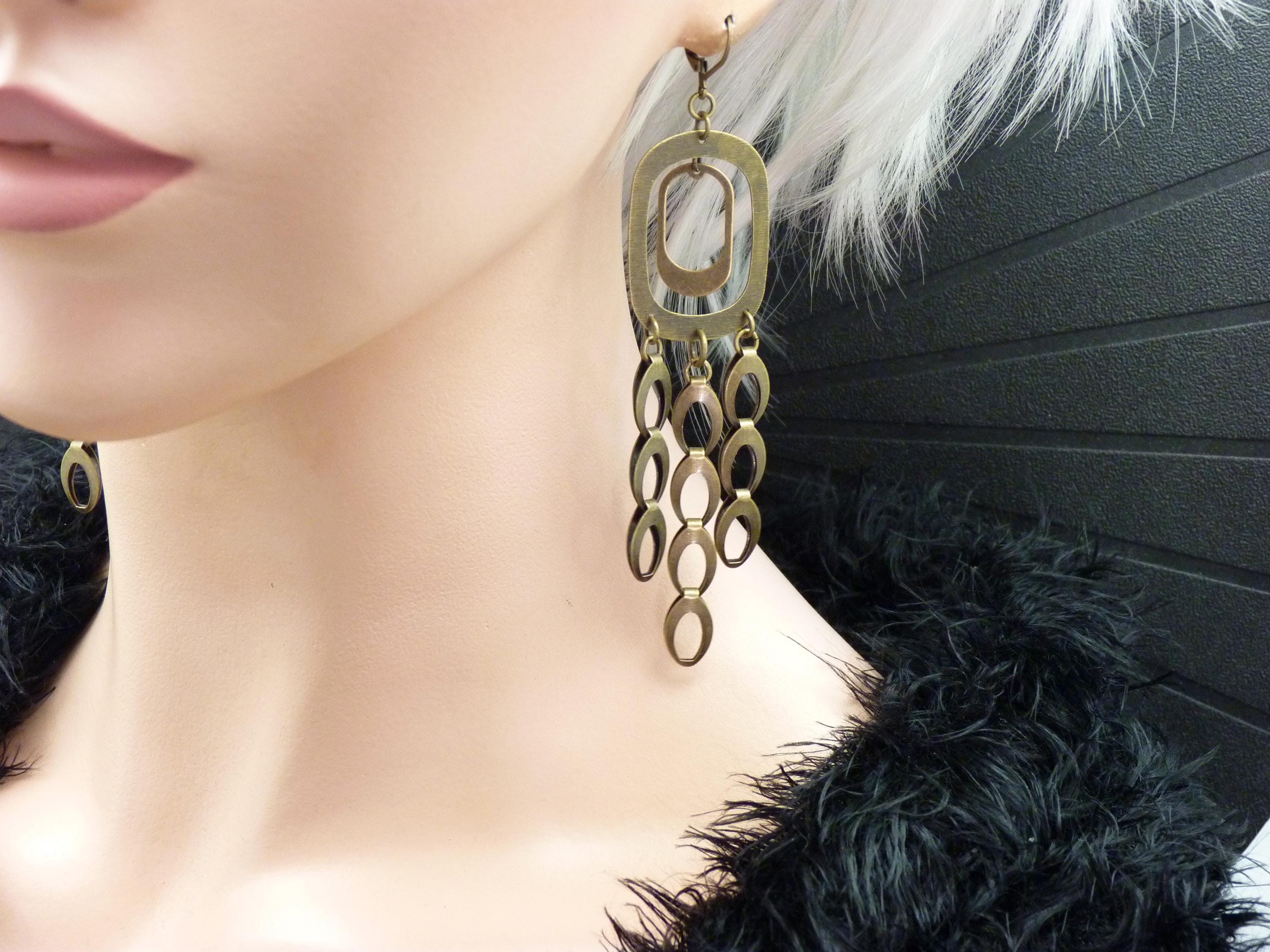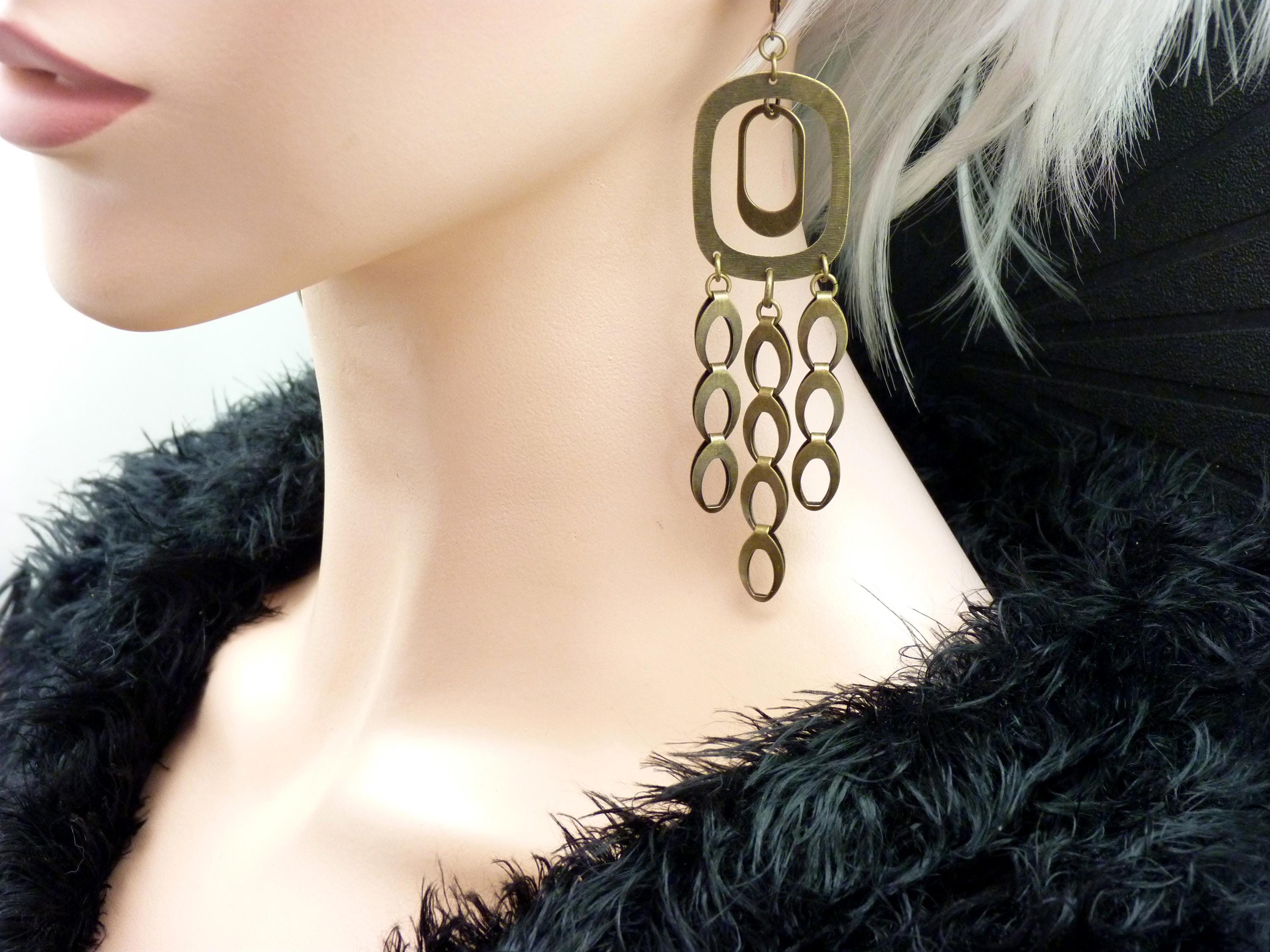 A cascade of oval bronze metal discs is suspended from a graphic brushed metal structure, creating a piece of jewelry that is constantly in motion. They come alive with the rhythm of your steps or your dances in the evening!