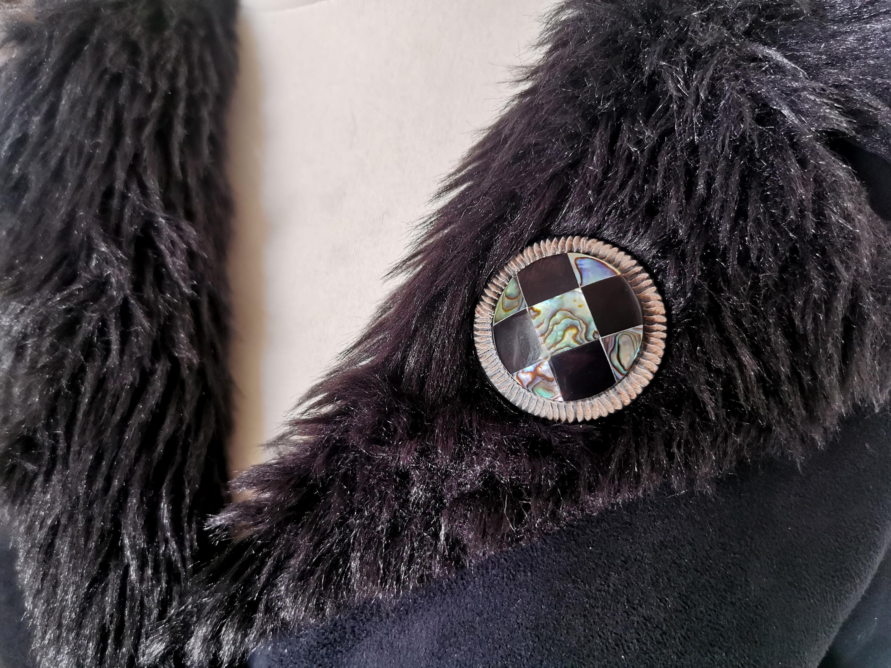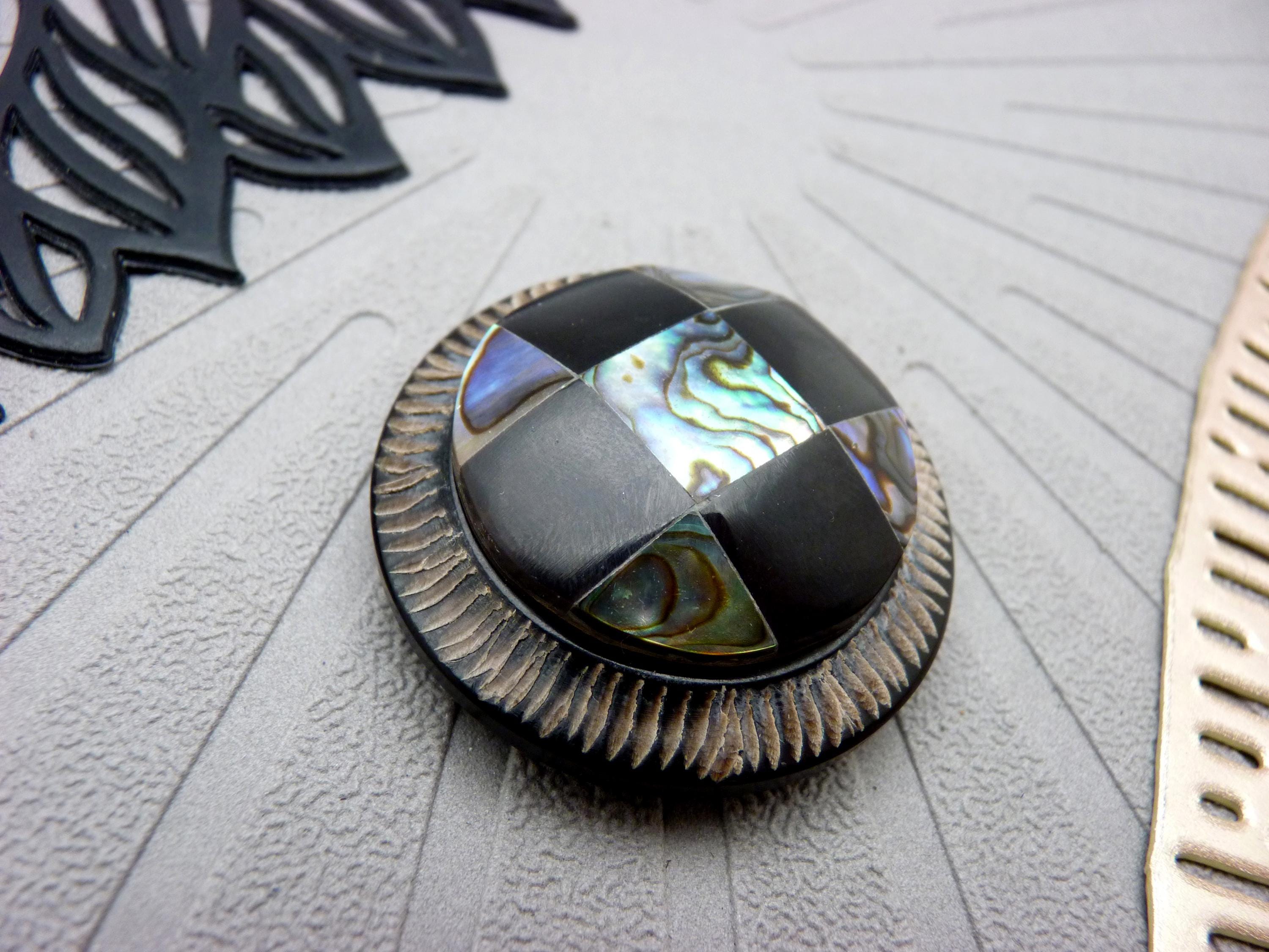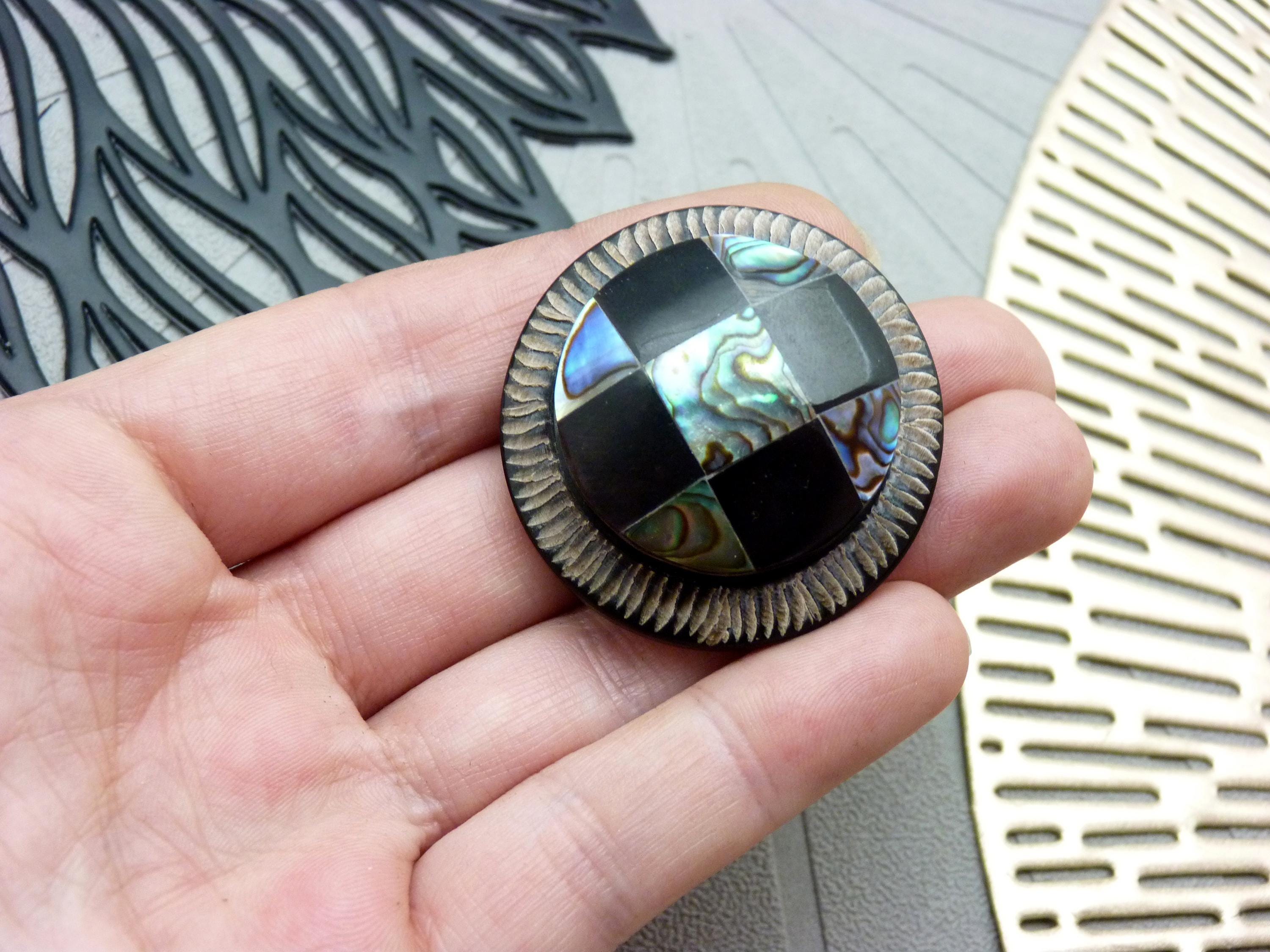 The CHESSBOARD brooch's design is a precious checkerboard. Its mesmerizing composition alternates deep black horn squares with the iridescent reflections of abalone mother-of-pearl. Each corner reveals a new color, a new brilliance. The whole is encircled by a striated horn border, like an ethnic frame.