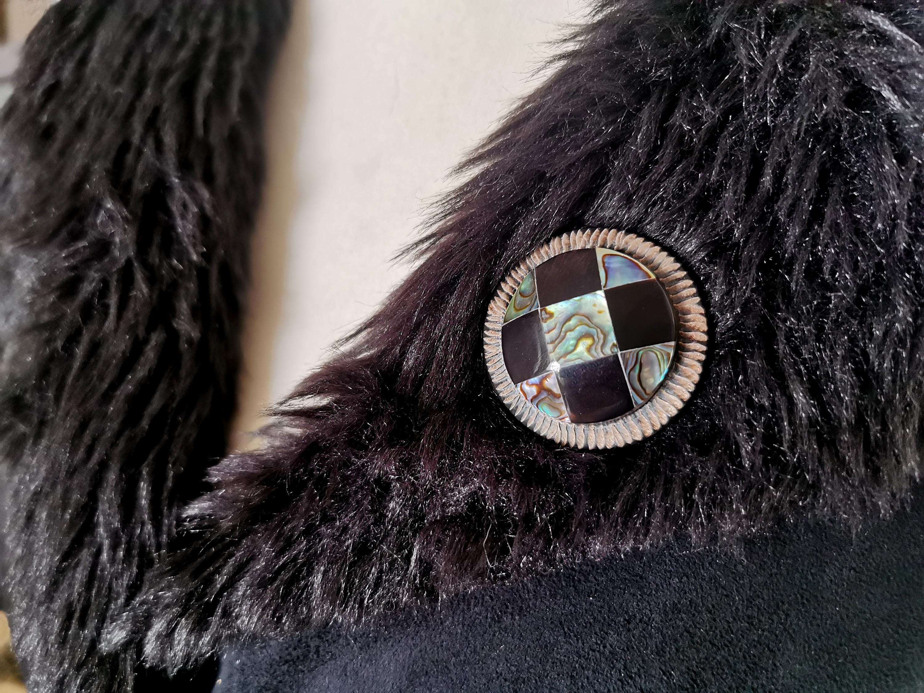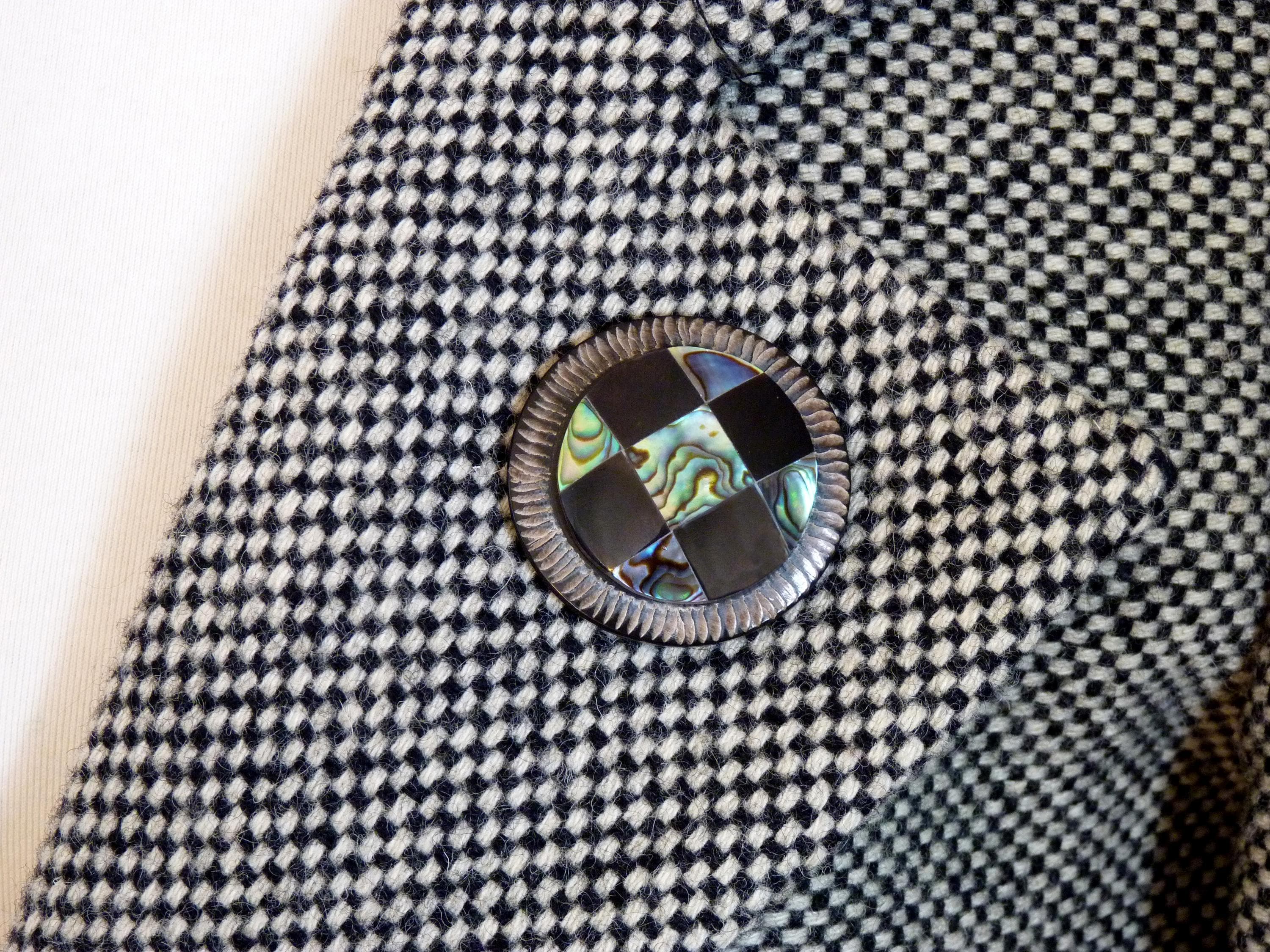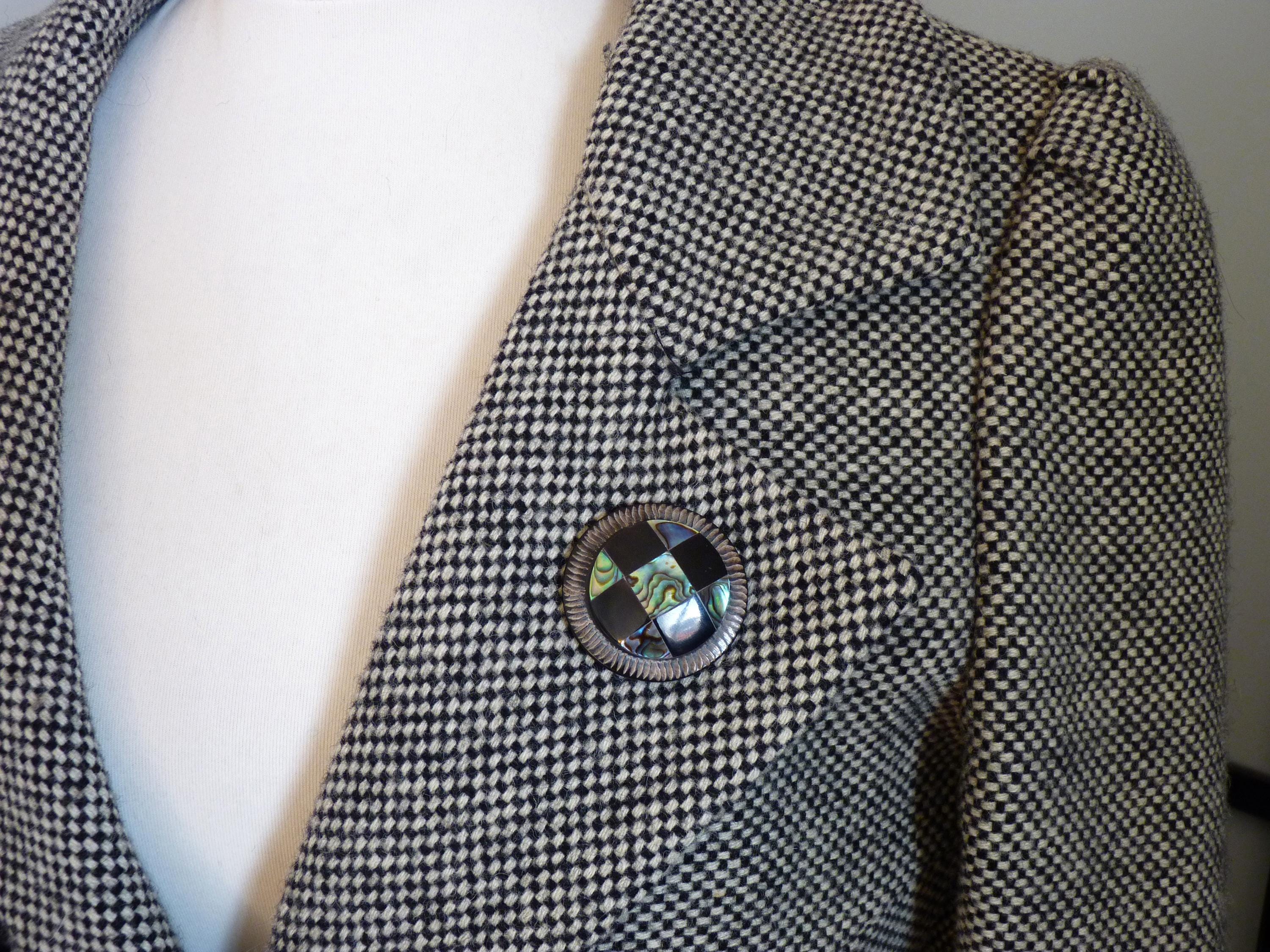 The CHESSBOARD brooch's design is a precious checkerboard. Its mesmerizing composition alternates deep black horn squares with the iridescent reflections of abalone mother-of-pearl. Each corner reveals a new color, a new brilliance. The whole is encircled by a striated horn border, like an ethnic frame.