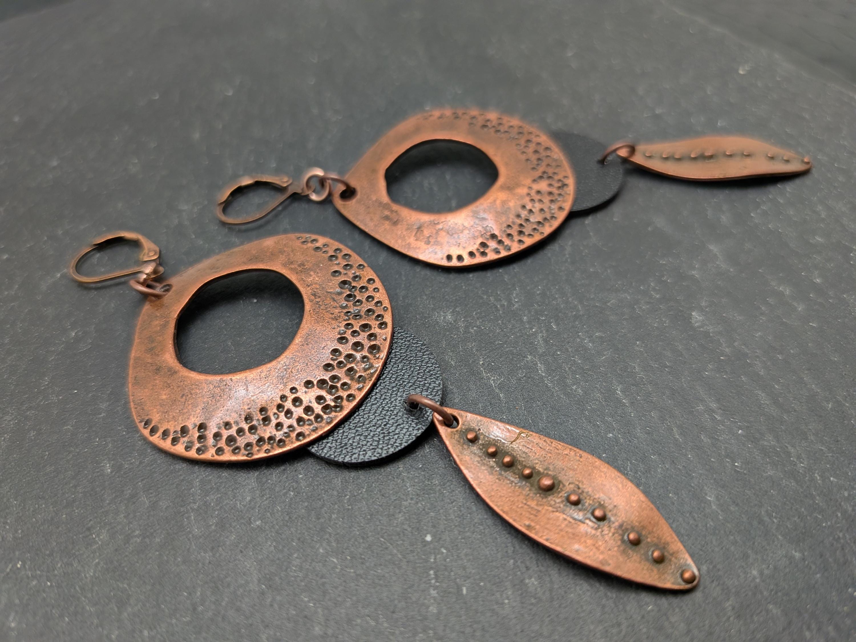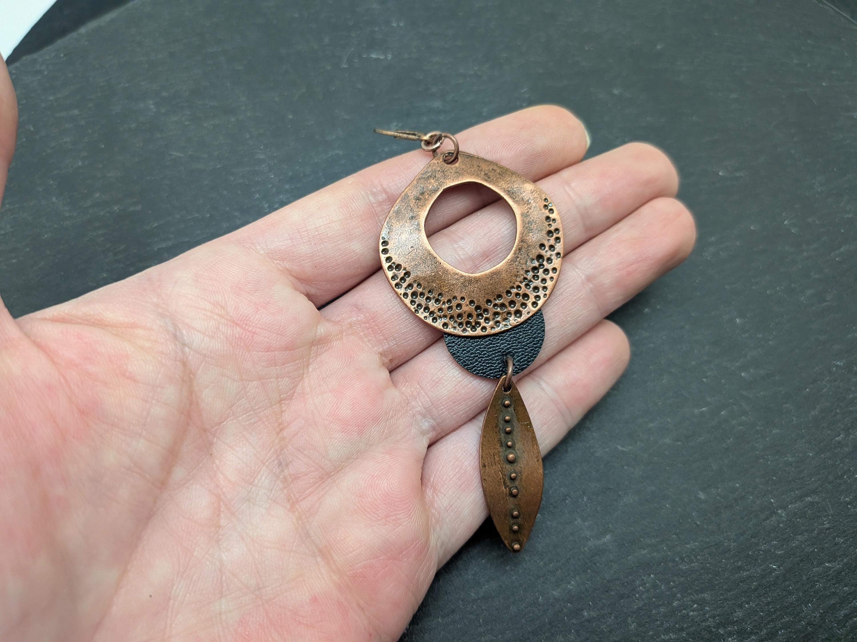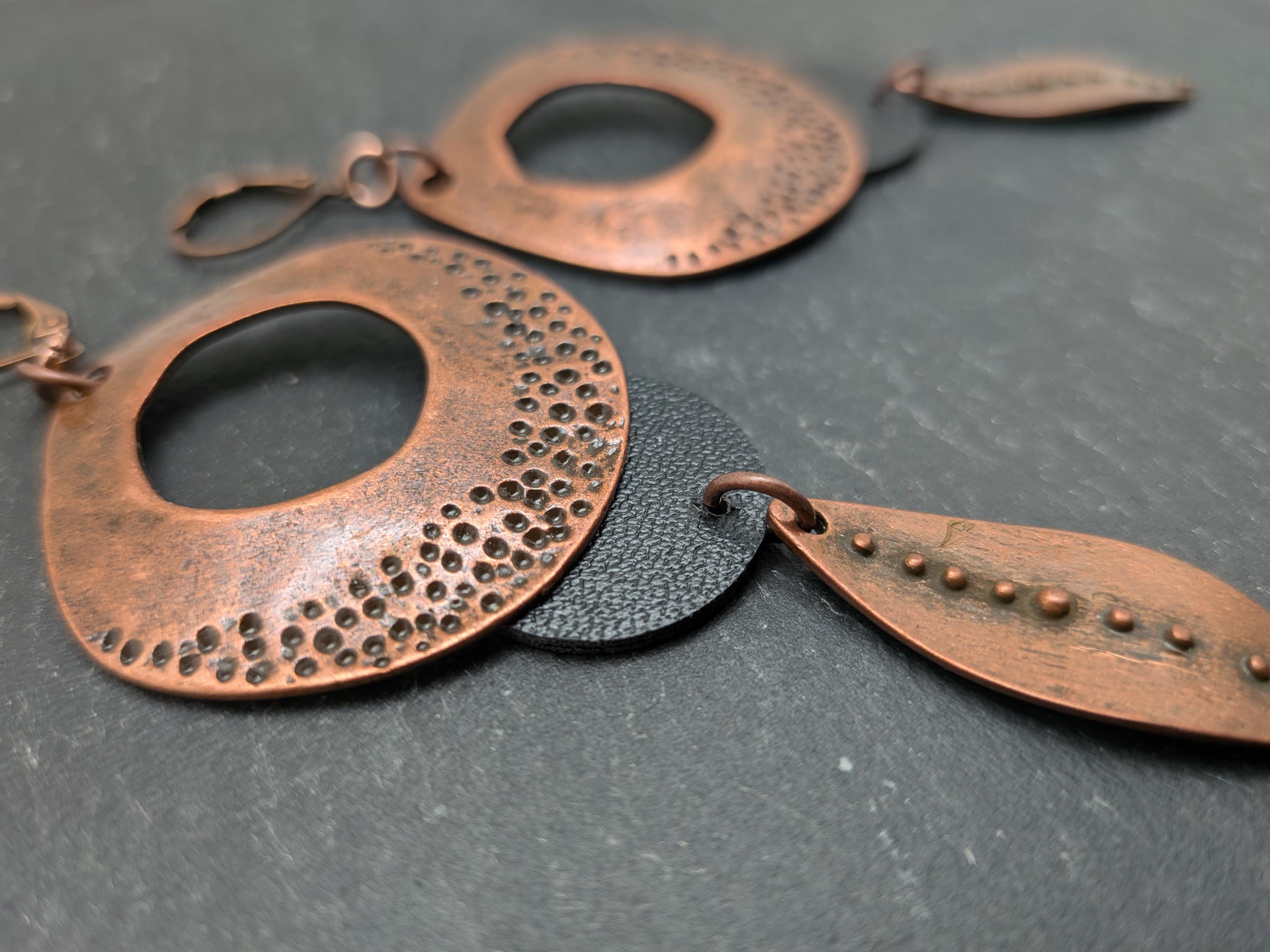 The design of the MASAÏ earrings is a play on raw materials and refined details. A wide, organic ring in copper-colored metal, textured with dots like an antique coin, is paired with a black leather disc.