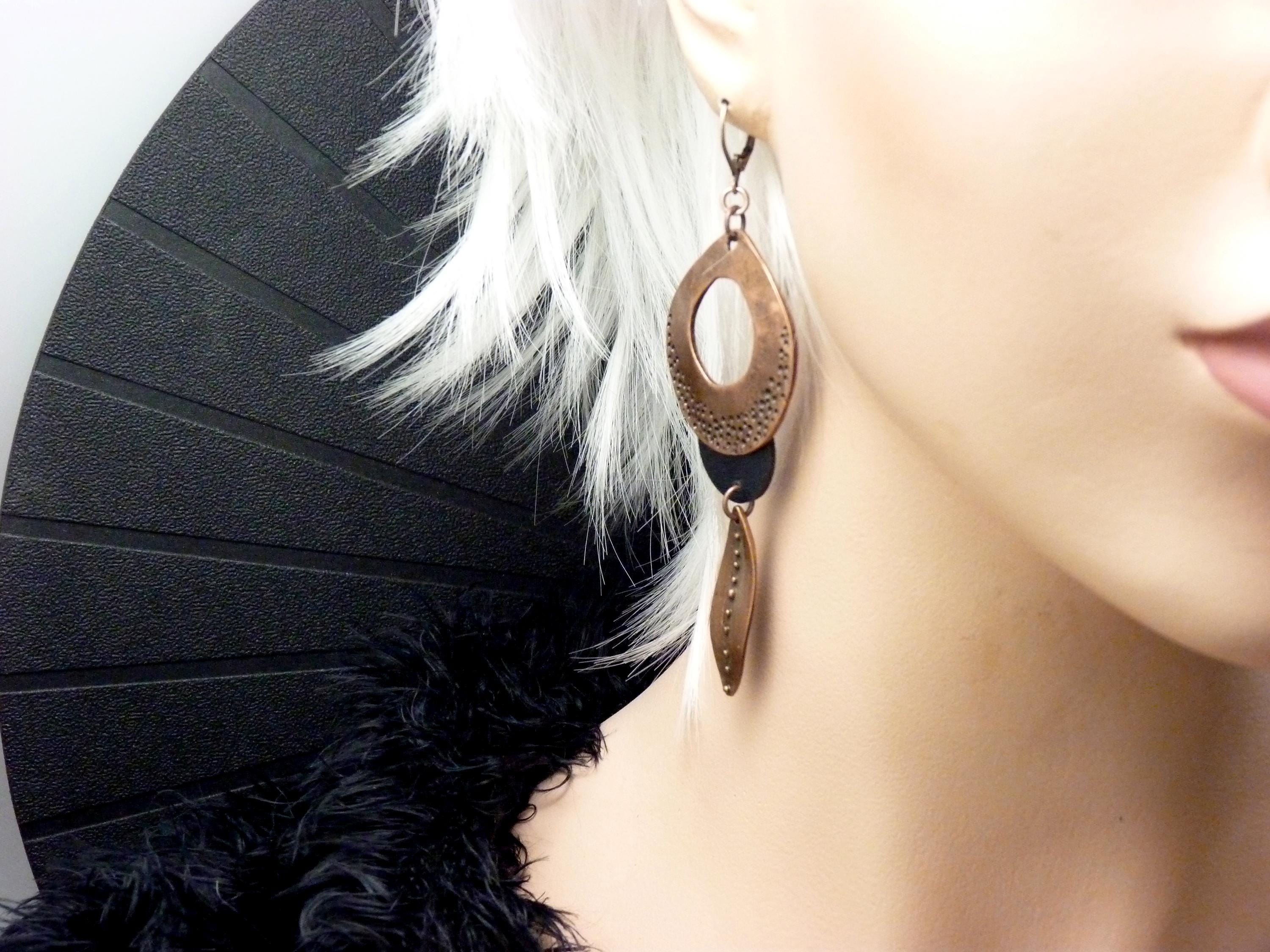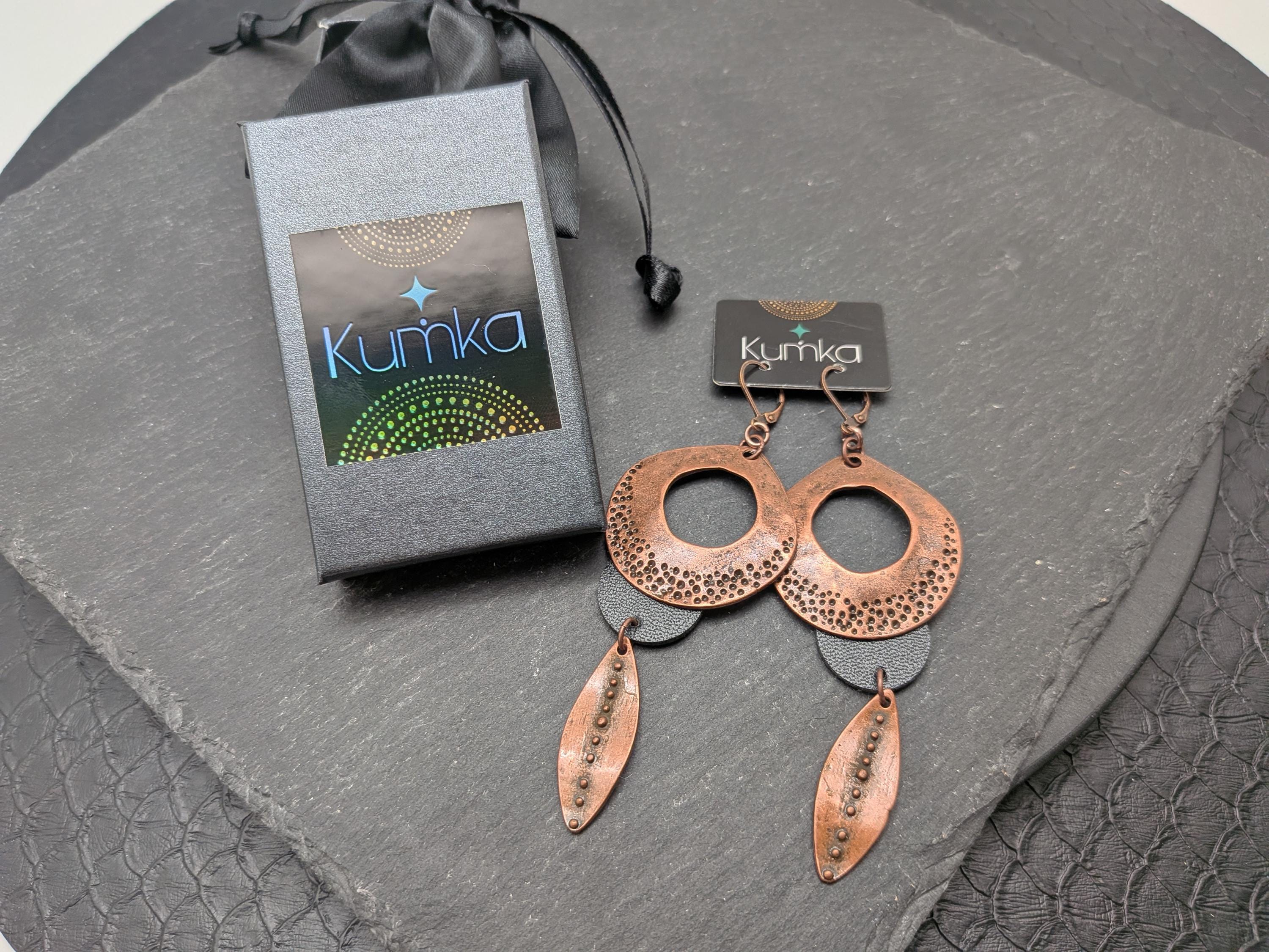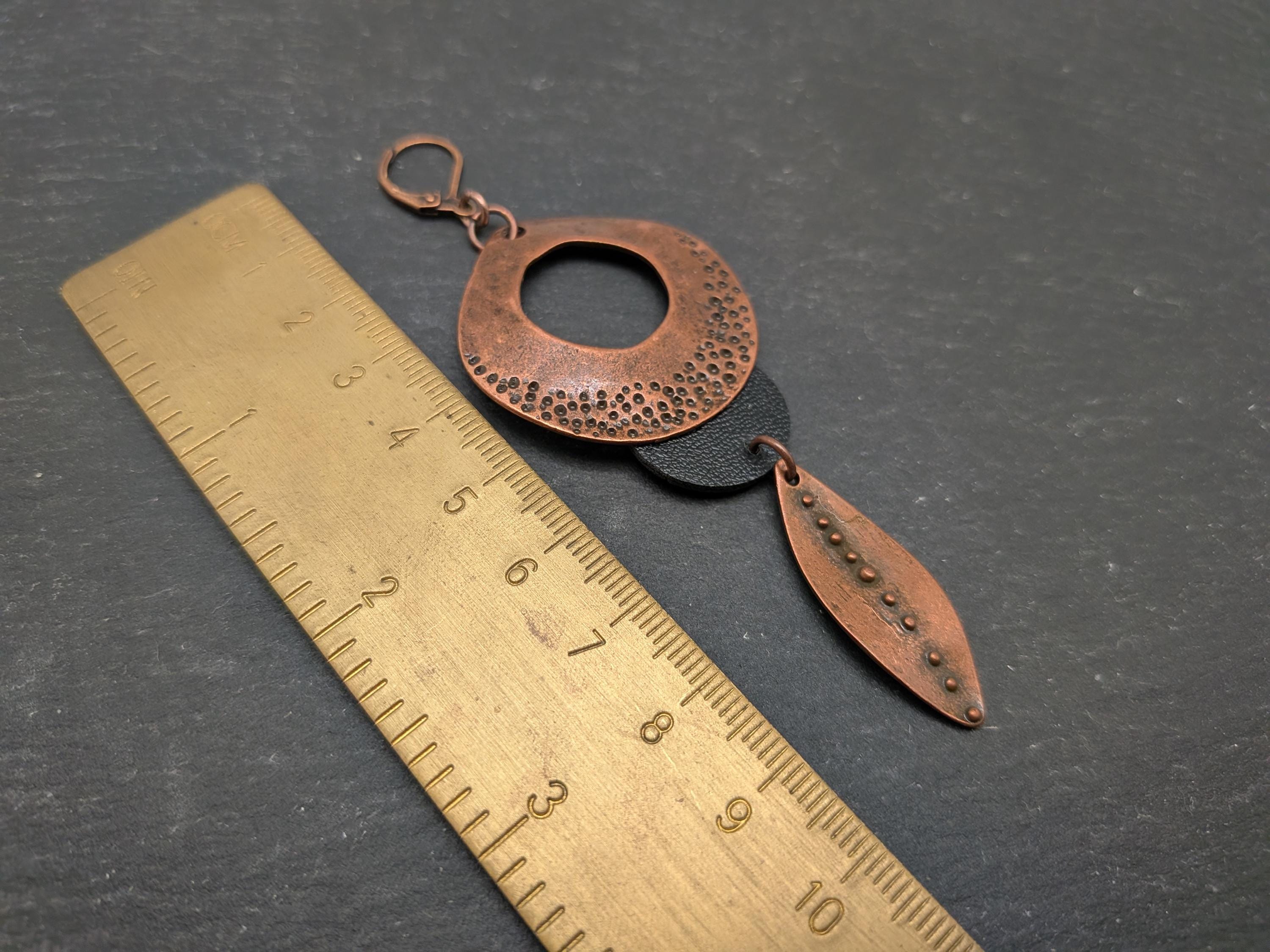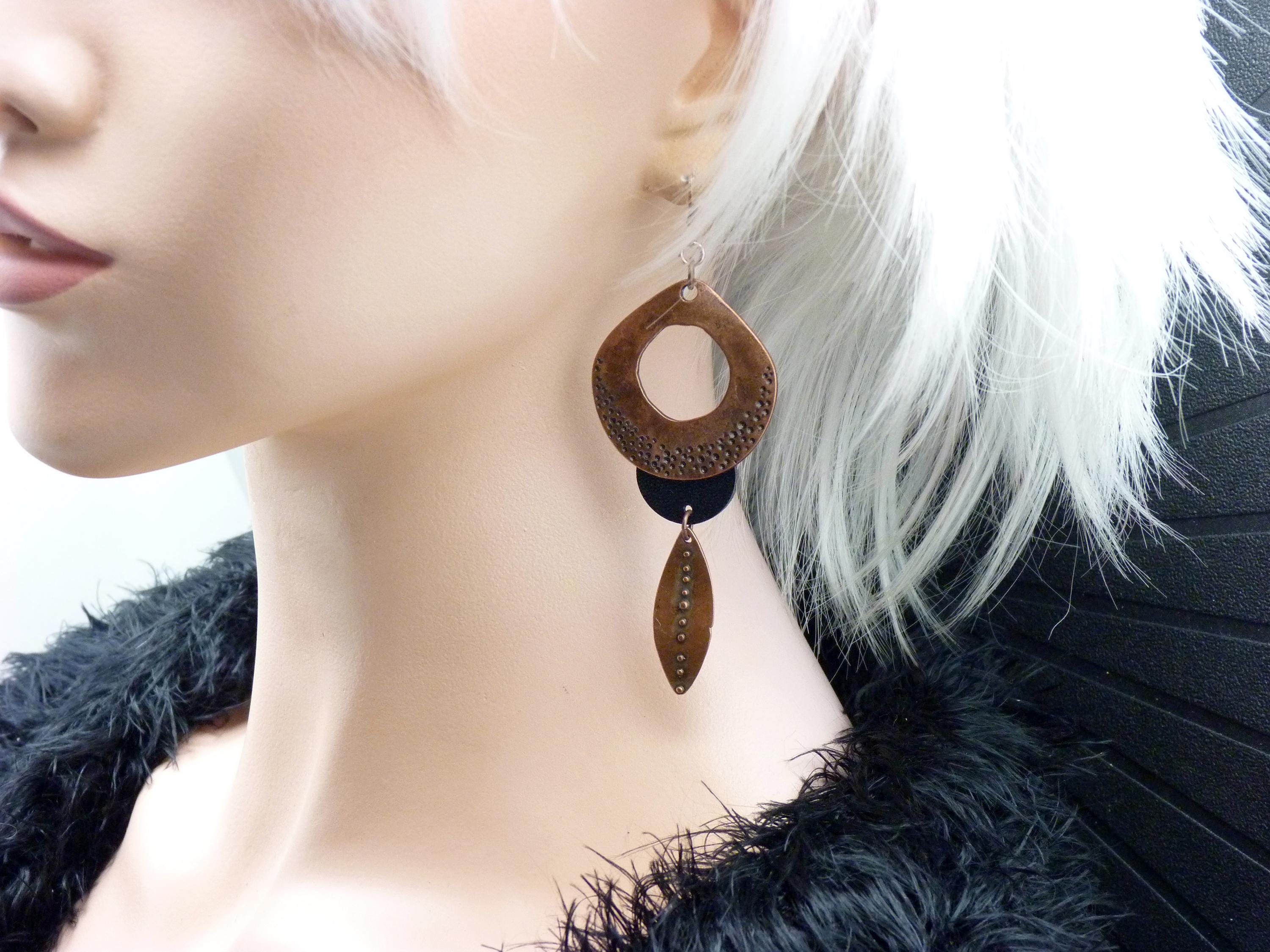 The design of the MASAÏ earrings is a play on raw materials and refined details. A wide, organic ring in copper-colored metal, textured with dots like an antique coin, is paired with a black leather disc.