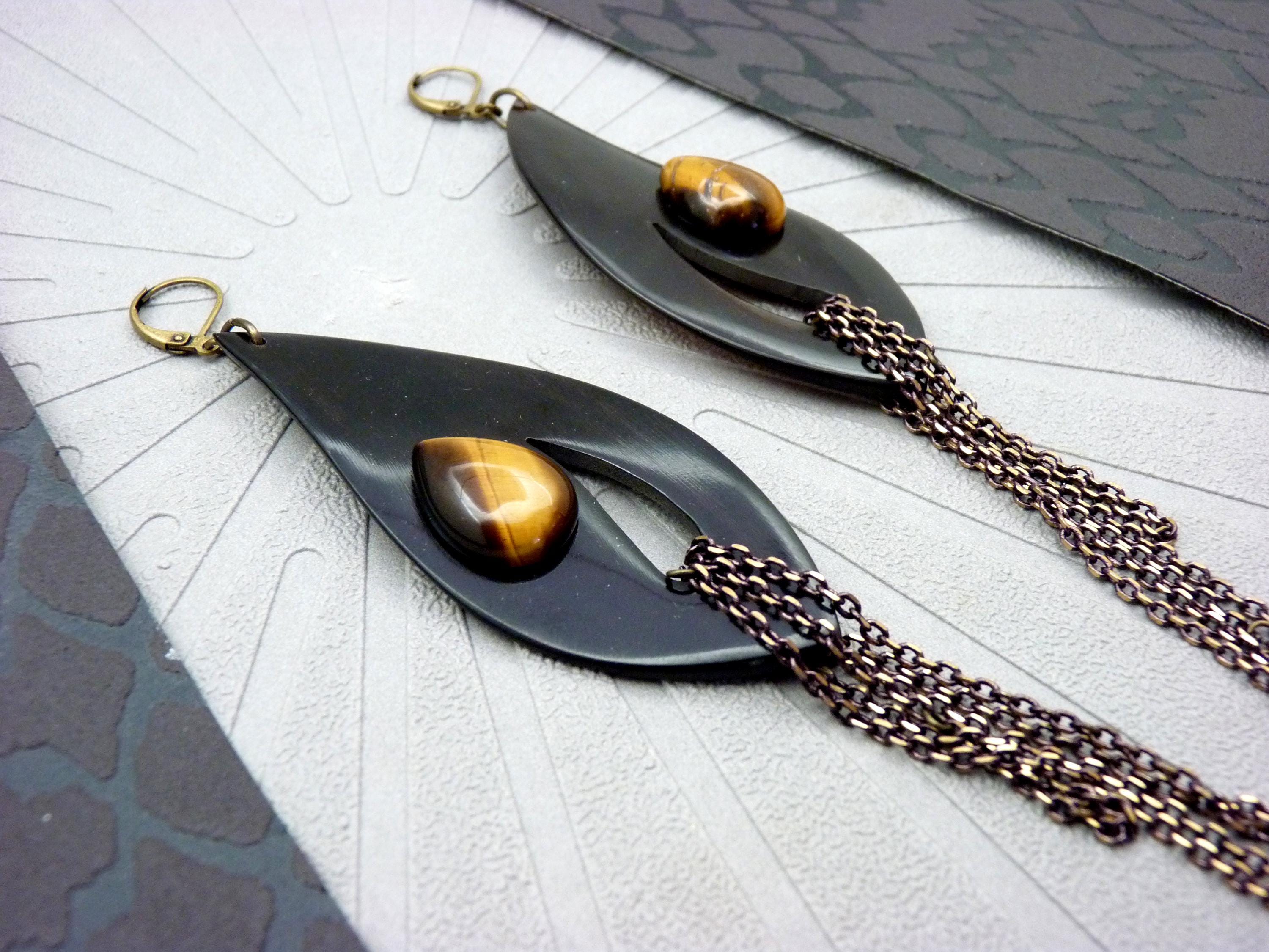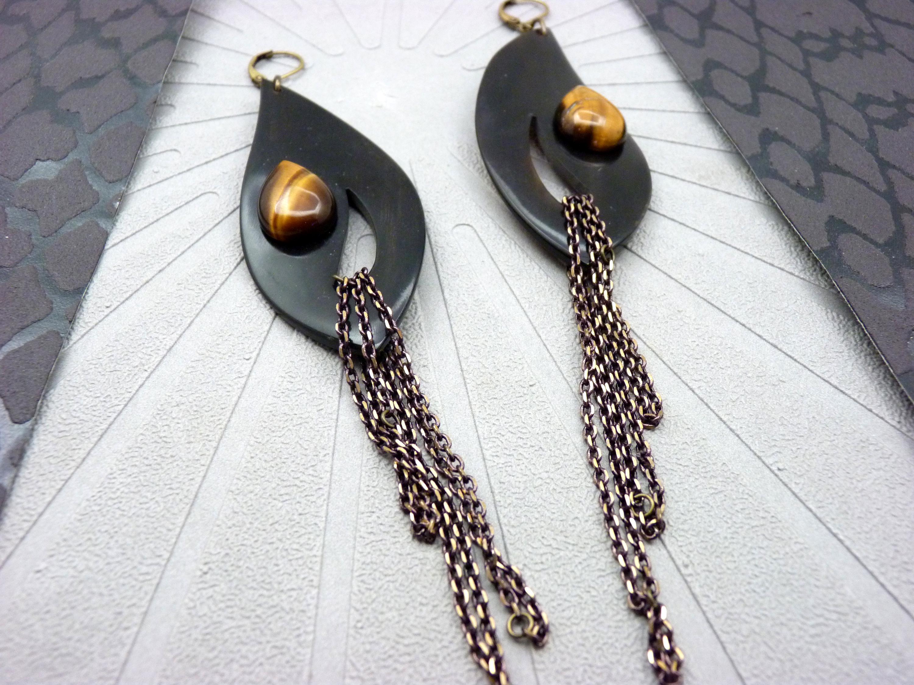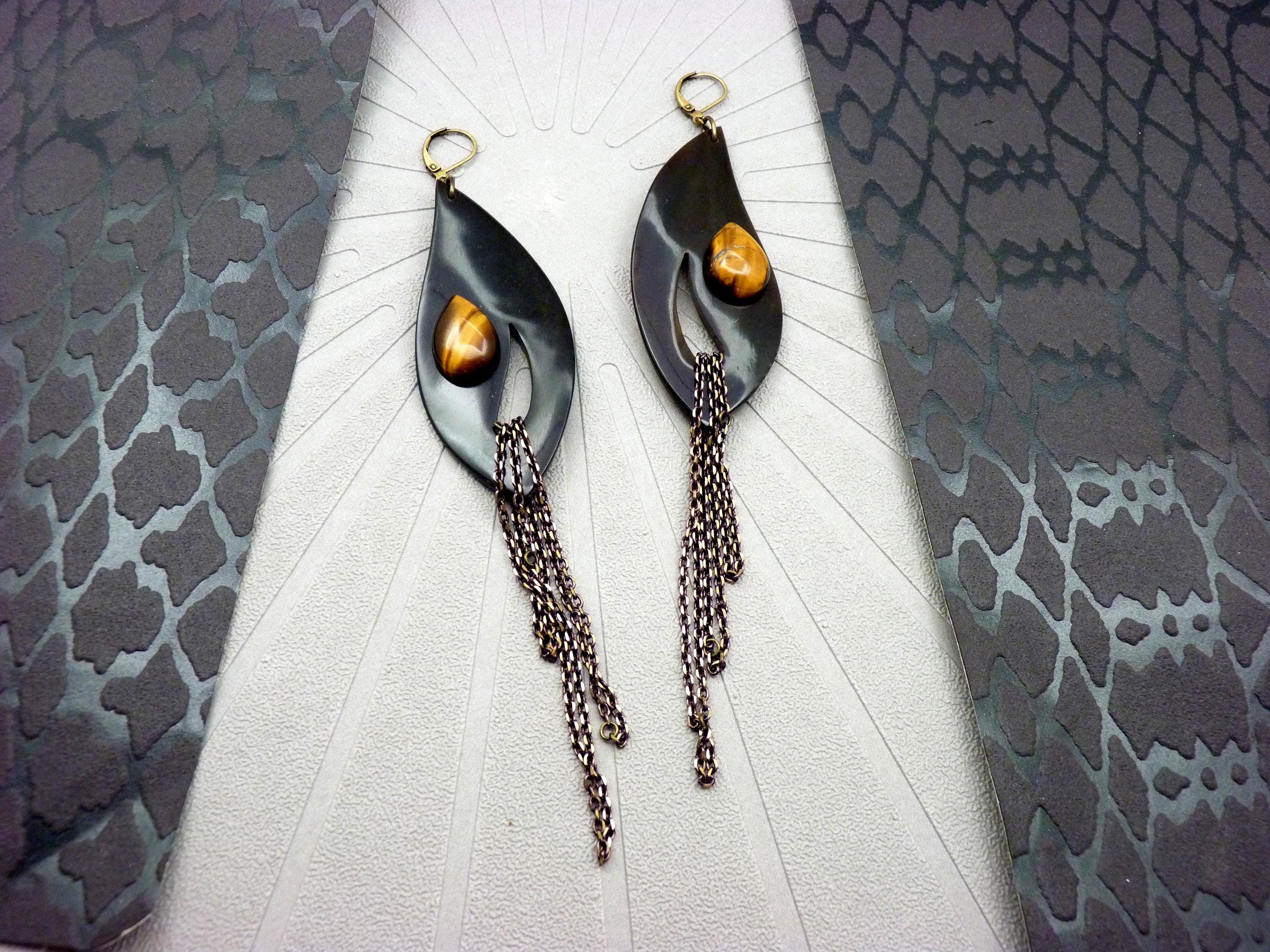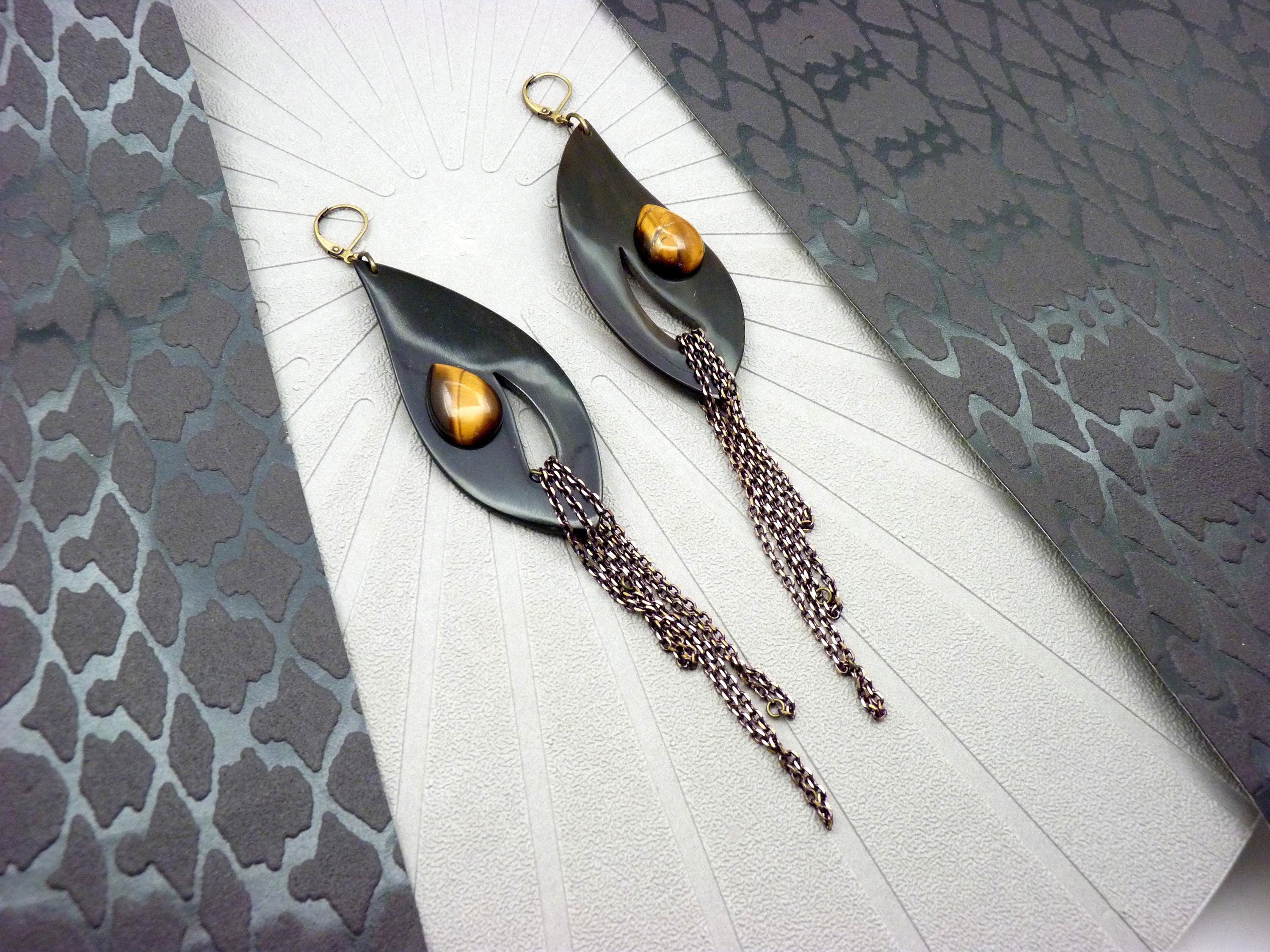 The design of the SHAMANE earrings is a play on raw materials and precious details. A large piece of black horn, sculpted and openwork, is illuminated by a cabochon of genuine Tiger's Eye, whose golden brown reflections capture the light.