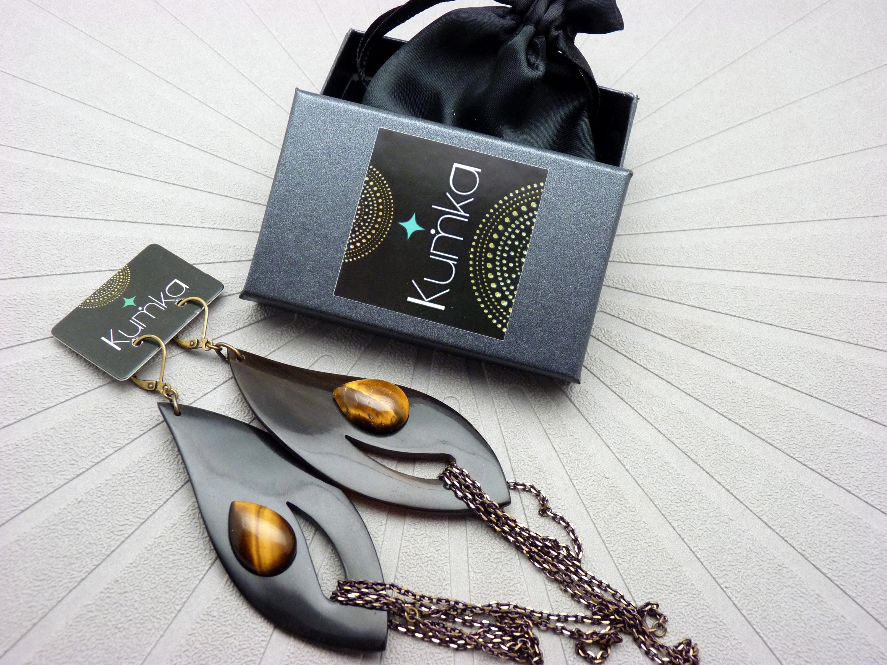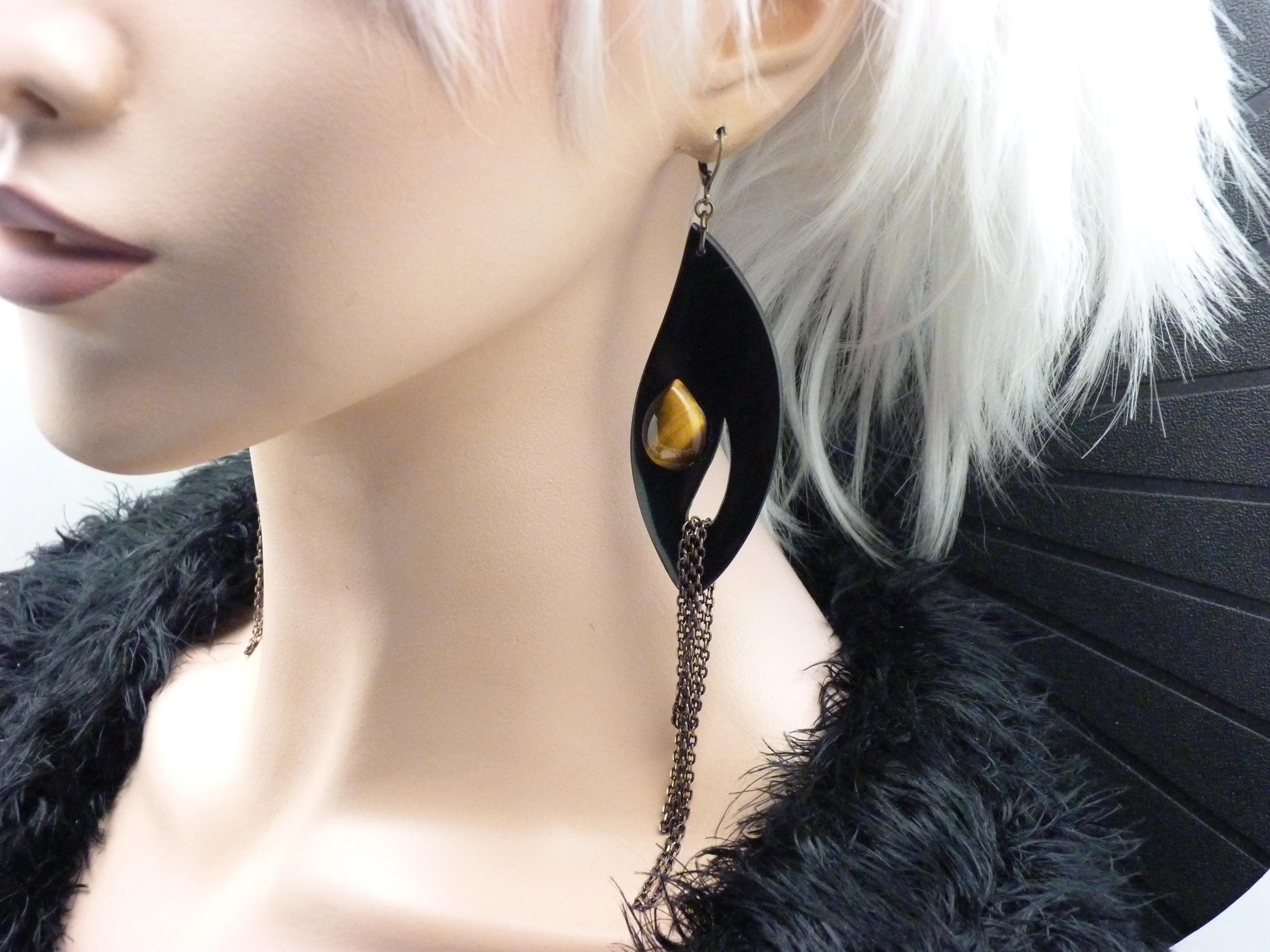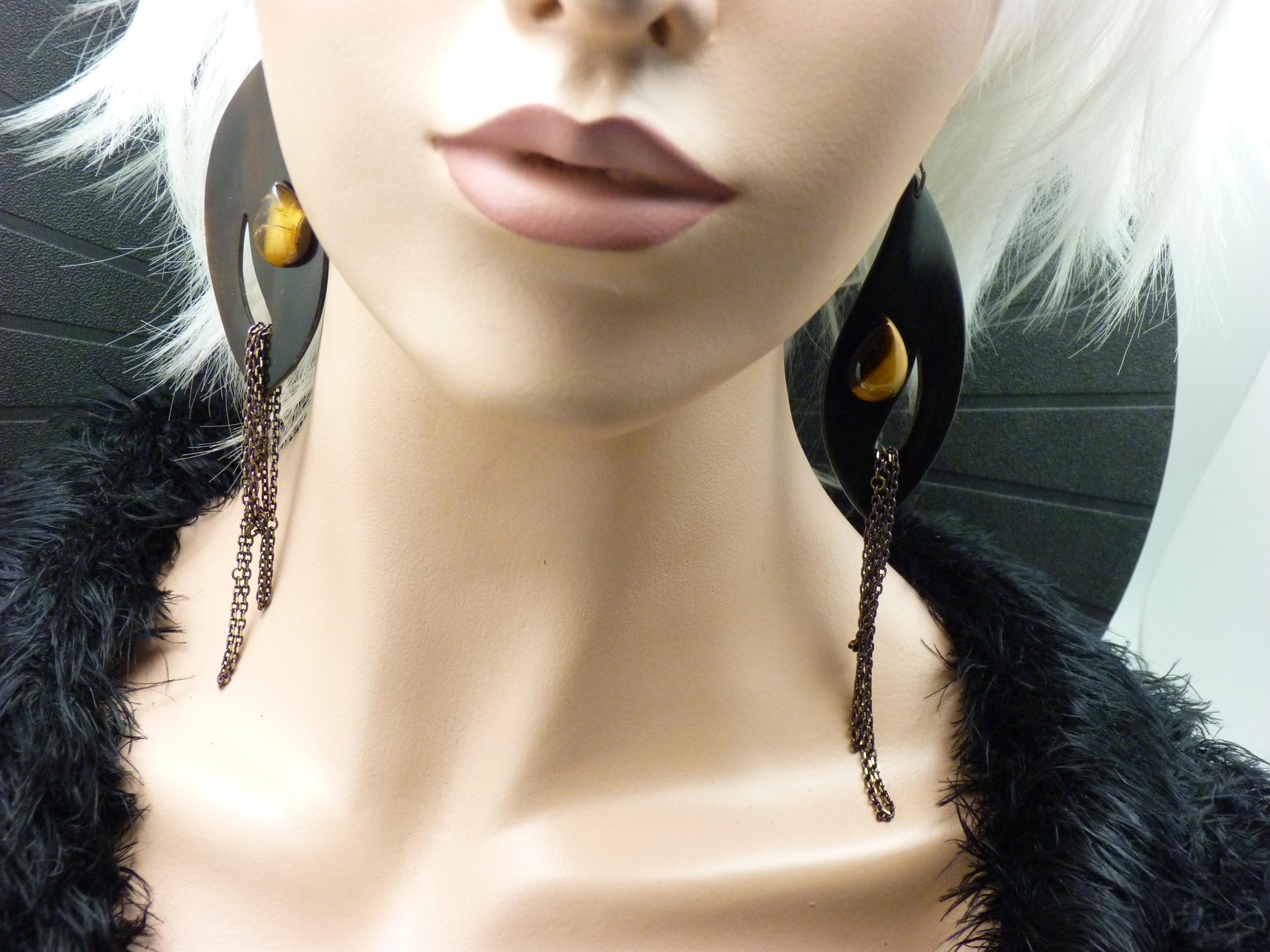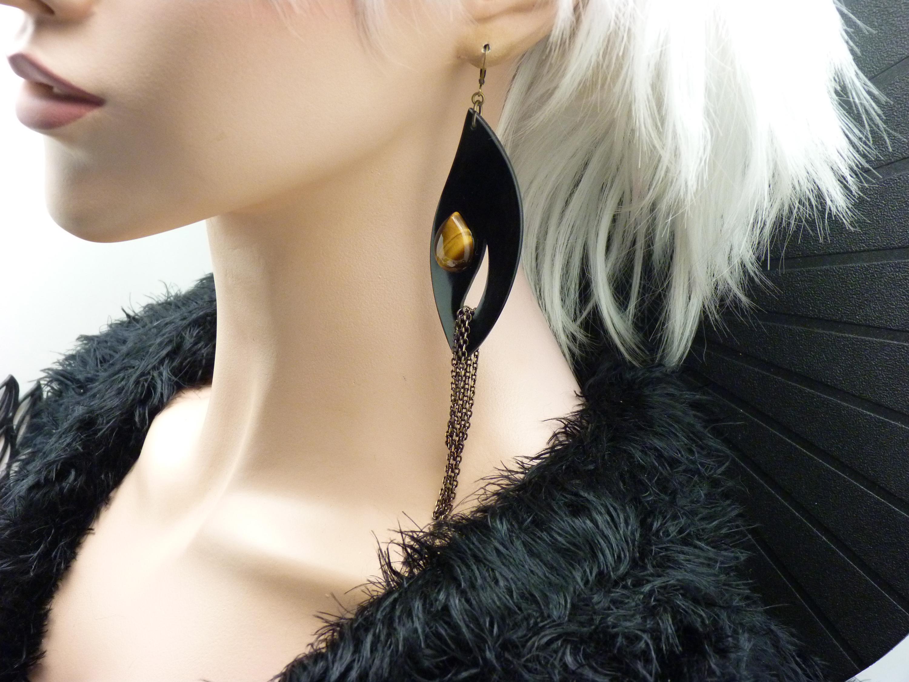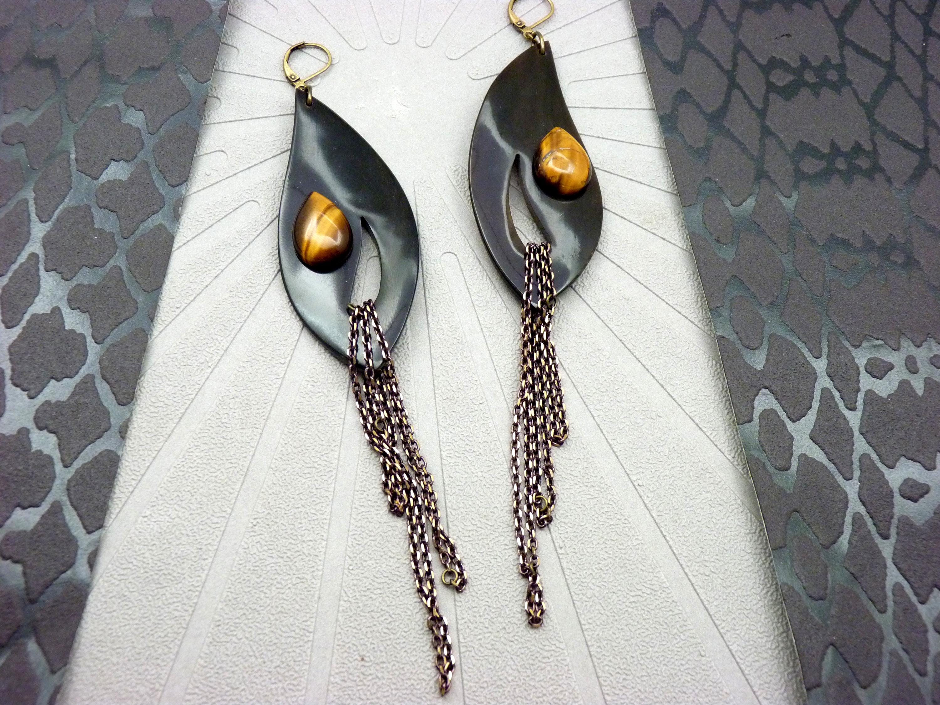 The design of the SHAMANE earrings is a play on raw materials and precious details. A large piece of black horn, sculpted and openwork, is illuminated by a cabochon of genuine Tiger's Eye, whose golden brown reflections capture the light.