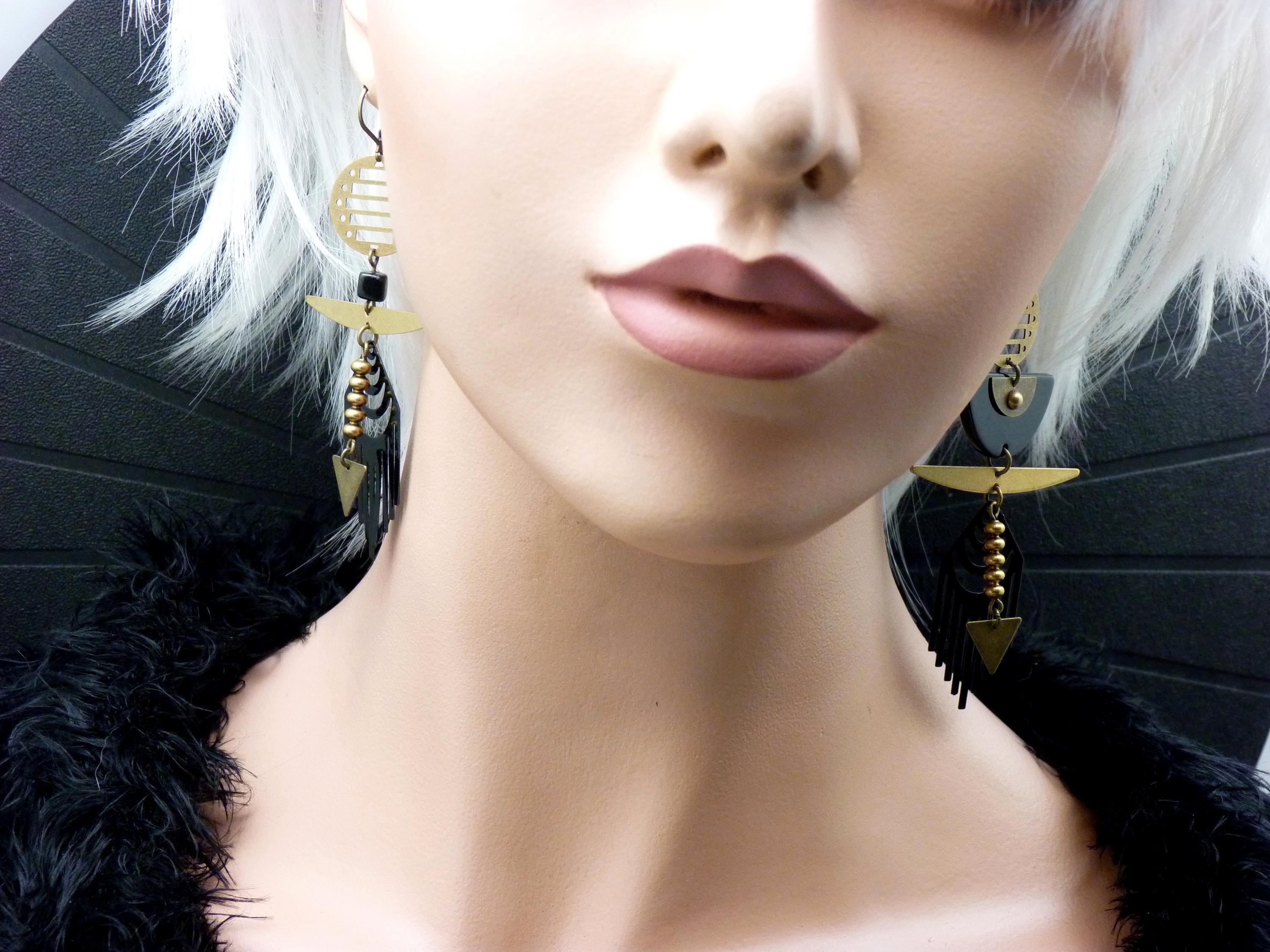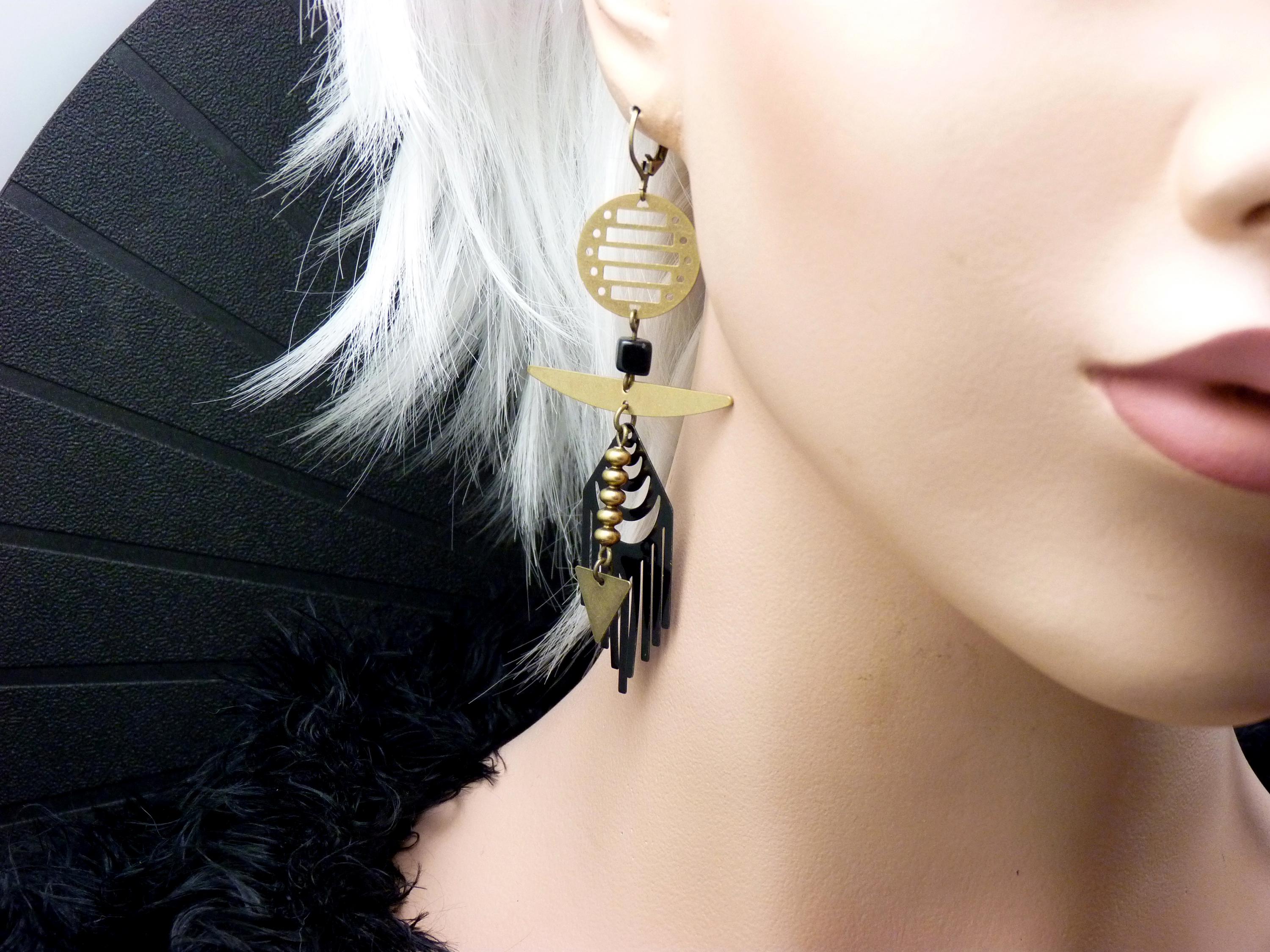 The design of the NEO ARTDECO earrings is a graphic composition, inspired by and revisited from the Roaring Twenties. It's a play on balance between solid shapes, like the black crescent moon, and airy filigree. Each element is articulated to create a living piece of jewelry that dances to the rhythm of your steps.