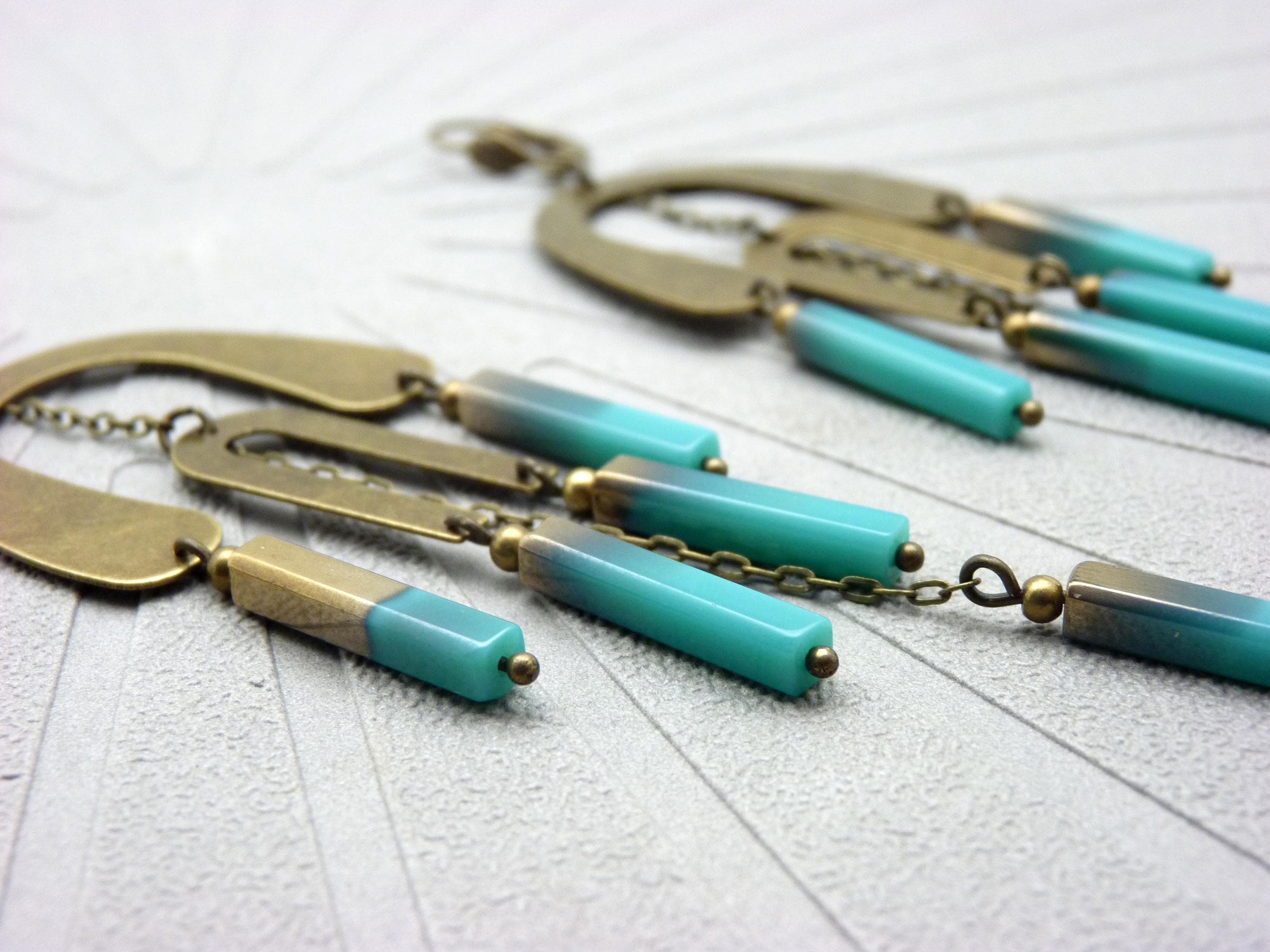 From there, a shower of two-tone glass rods, in luminous turquoise blue and bronze gold, illuminates the jewel with grace.