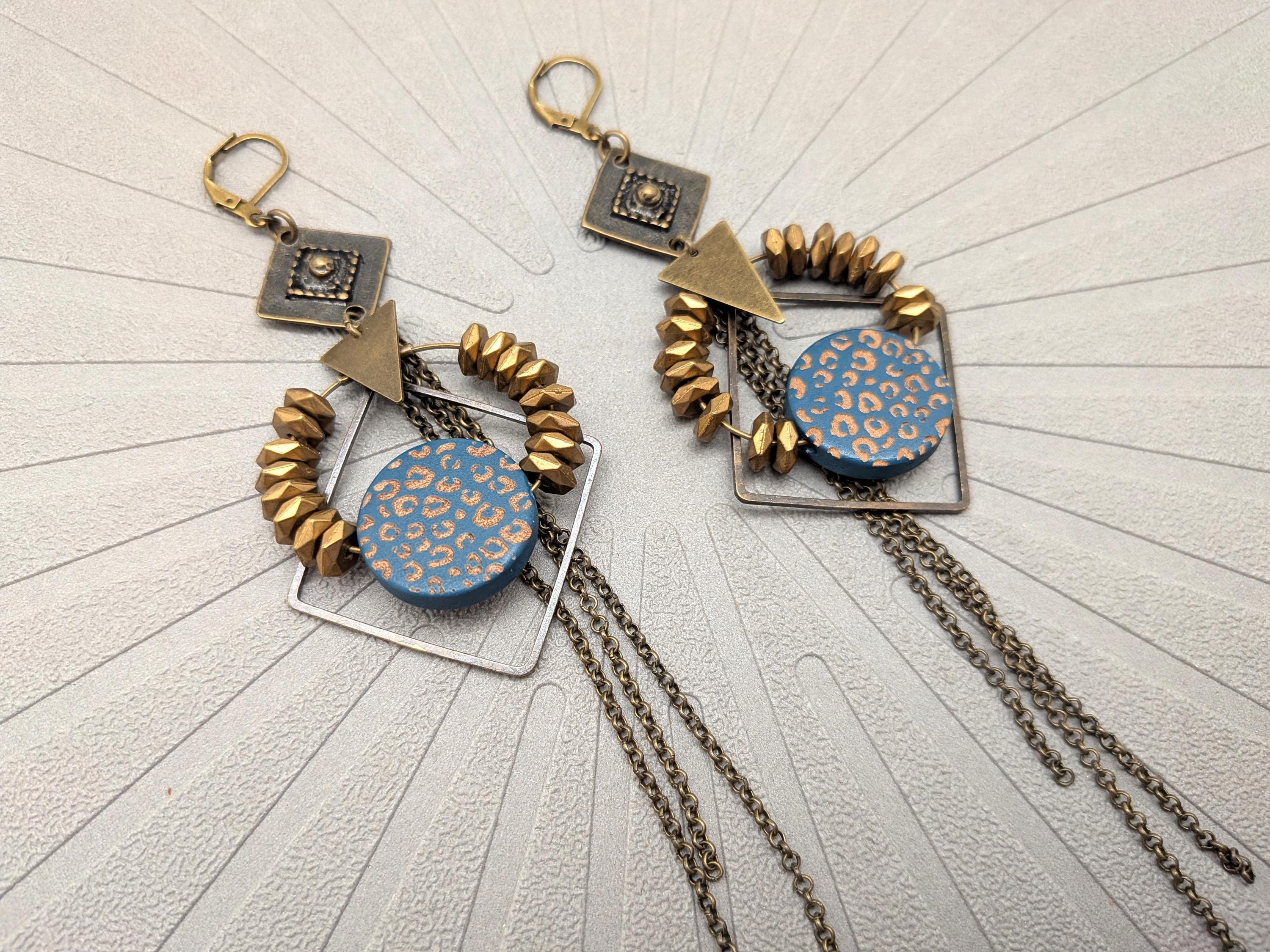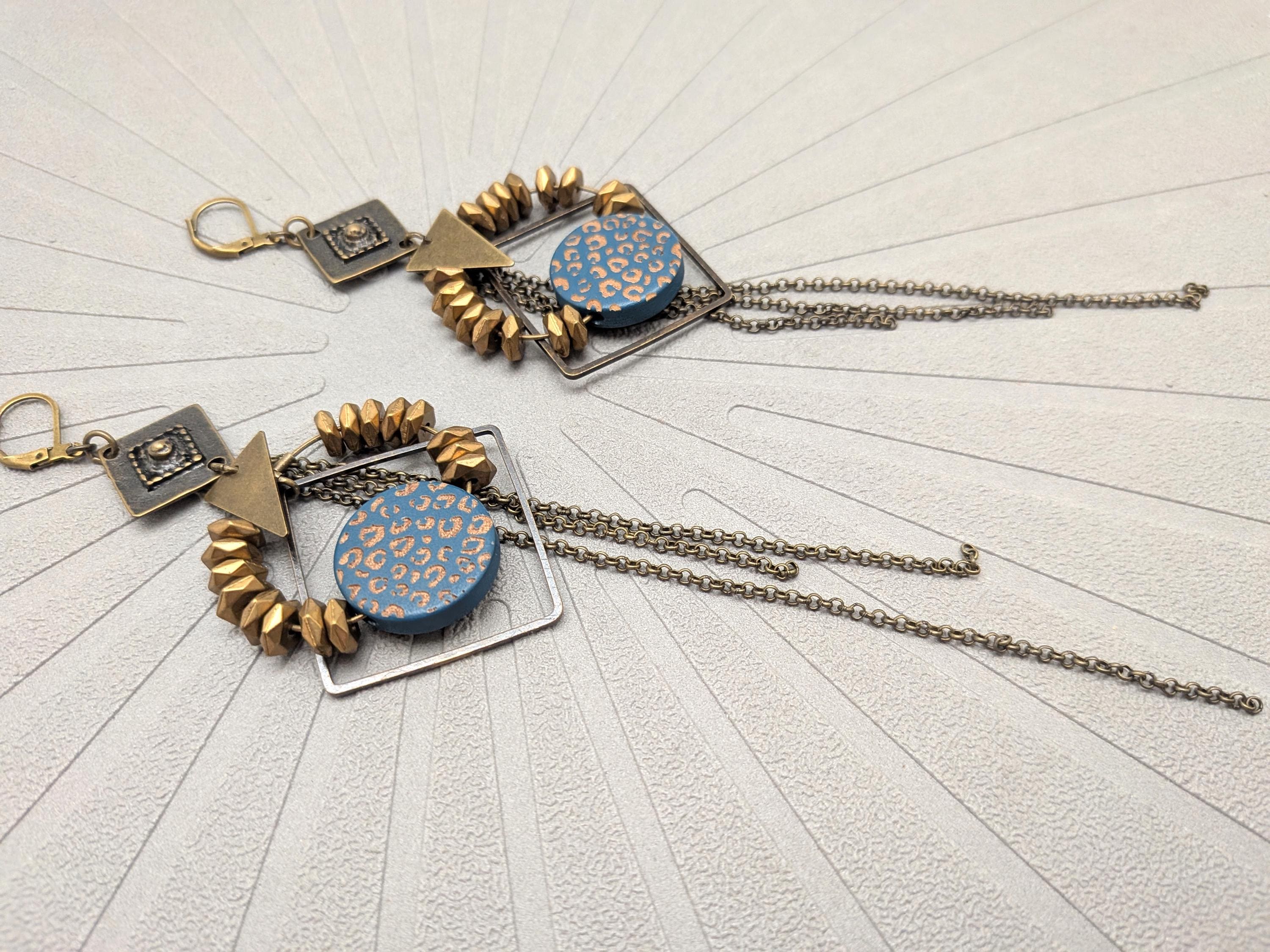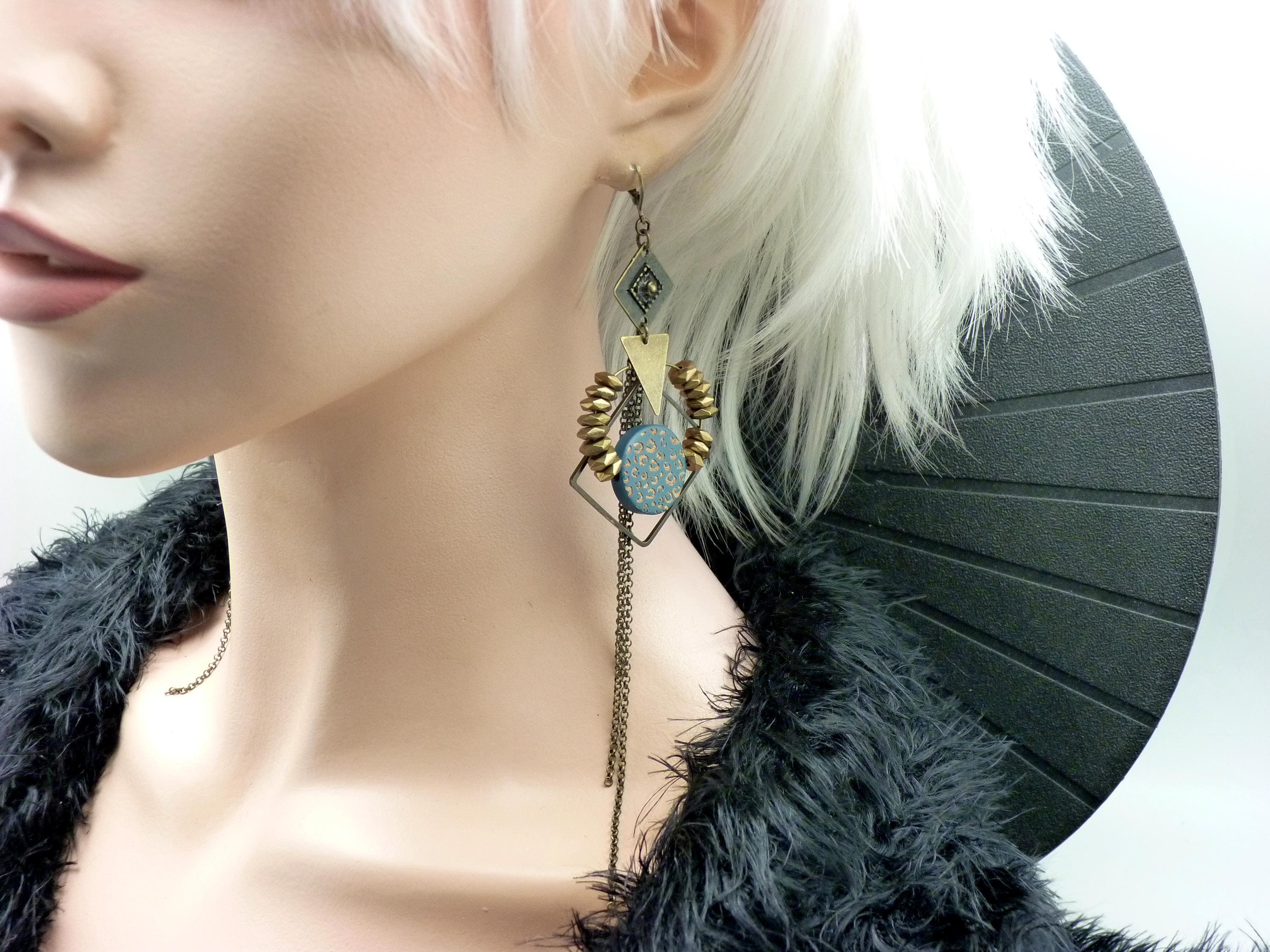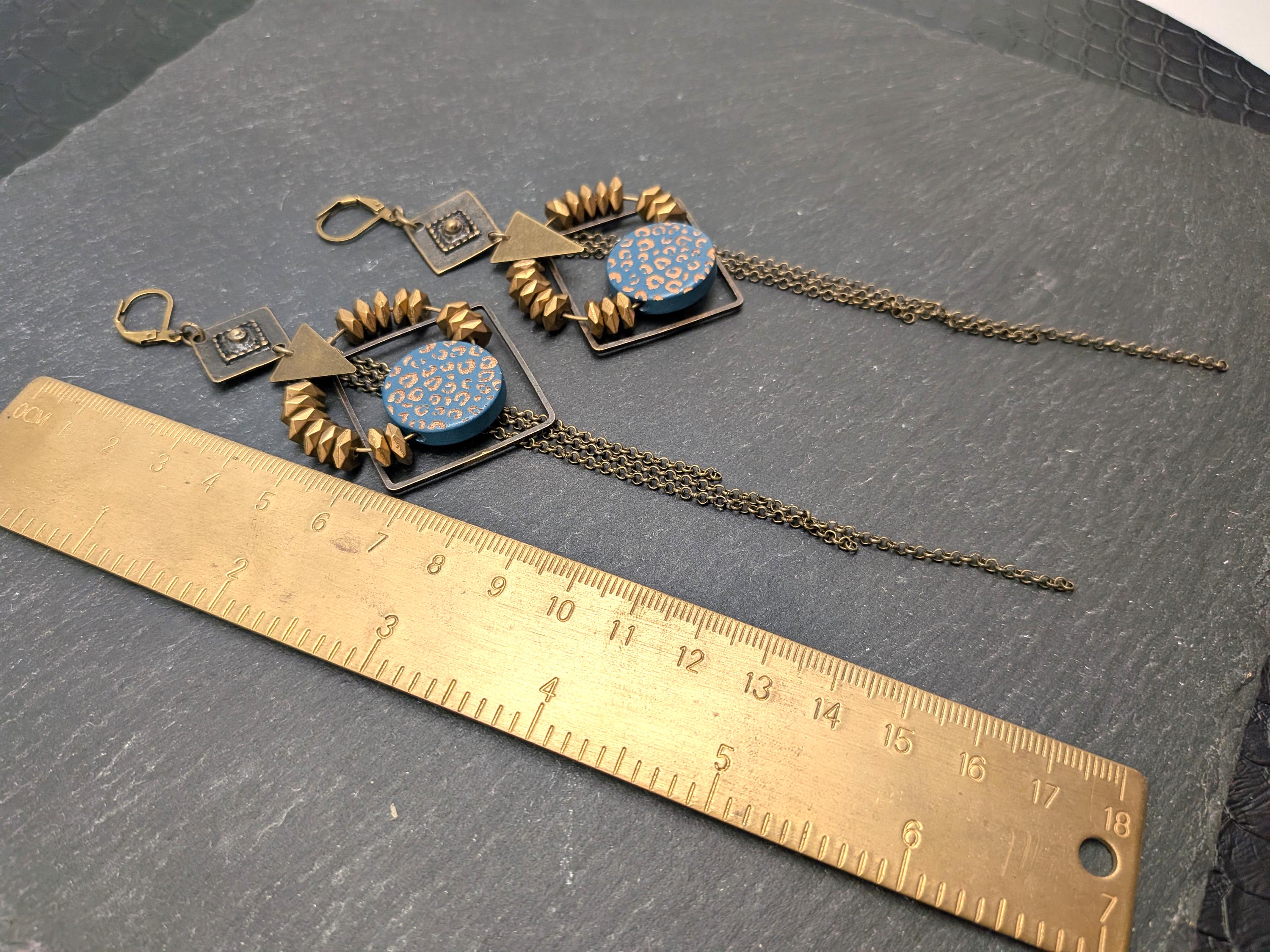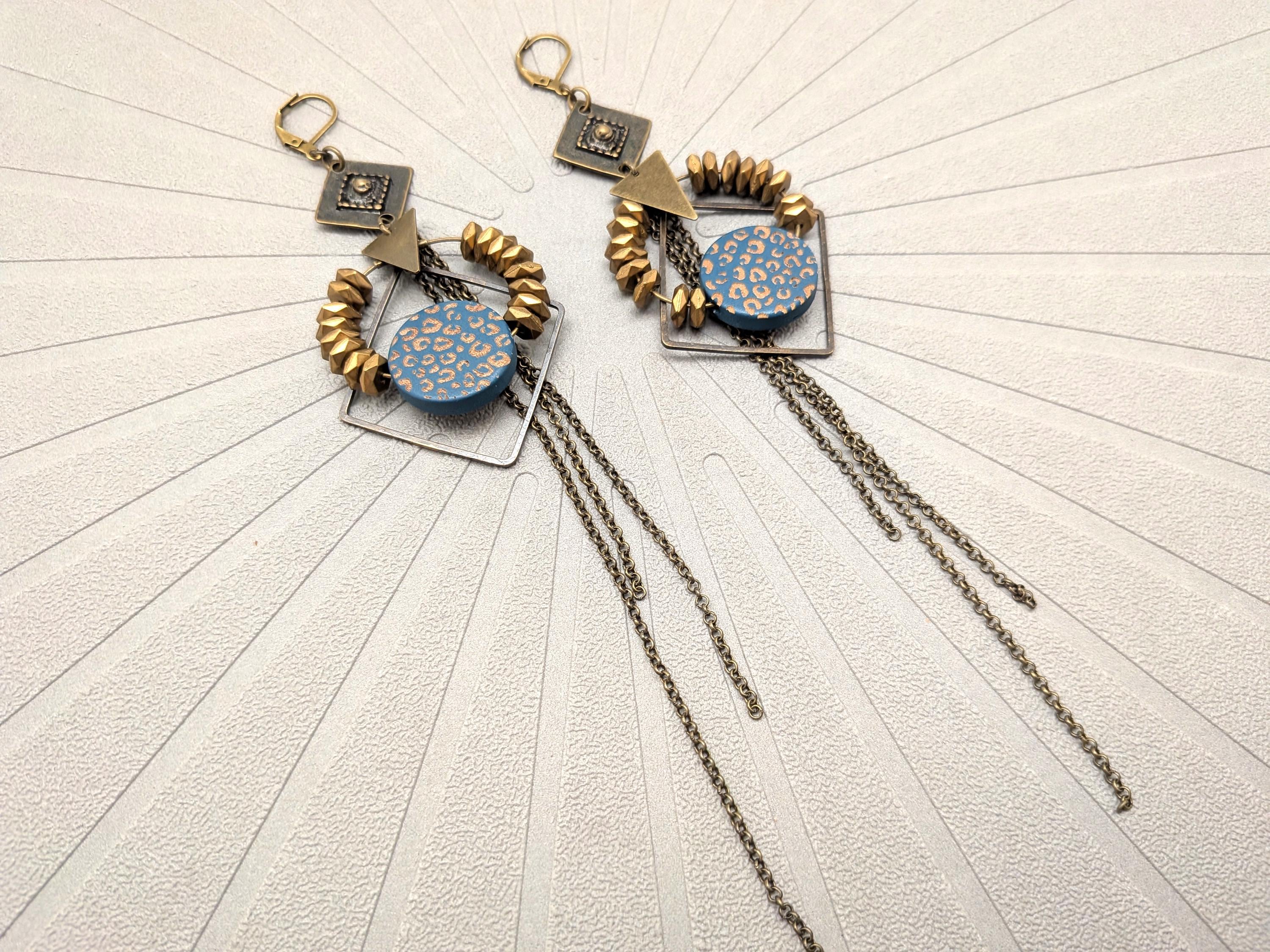 The design of the ZORA earrings is a joyful mix of styles. Geometric shapes in bronze metal are combined with a wooden disc painted with a blue and bronze leopard pattern.