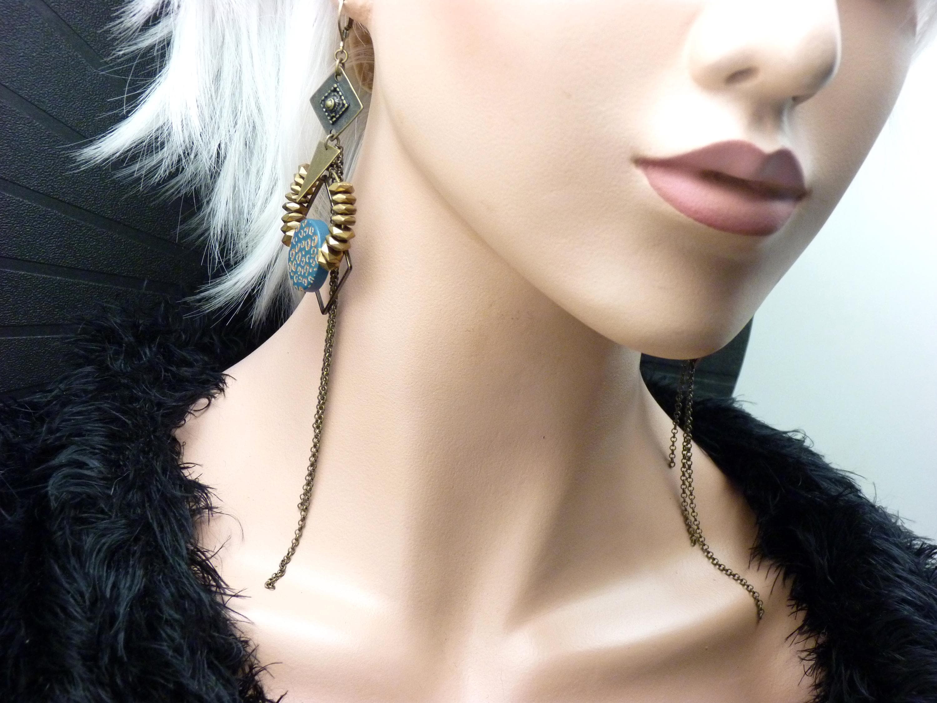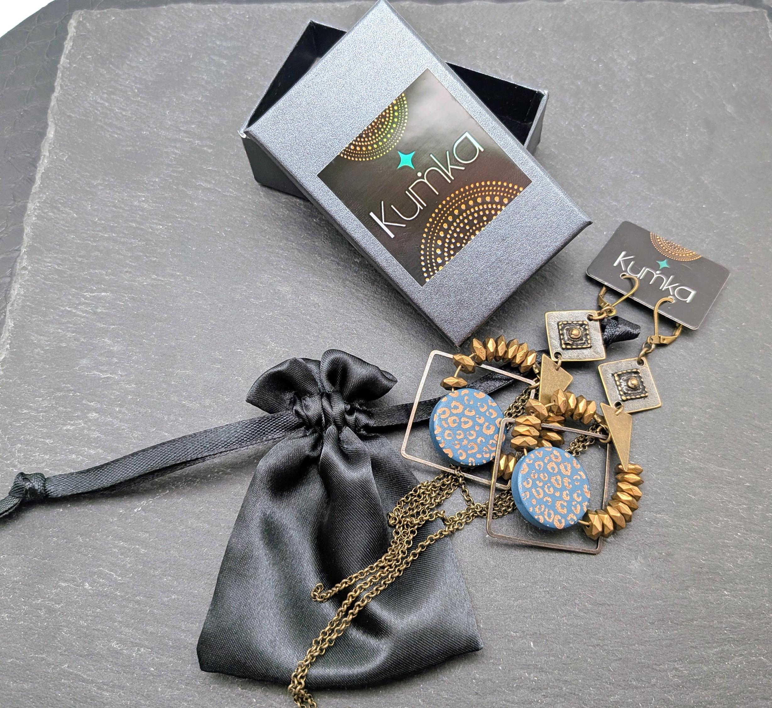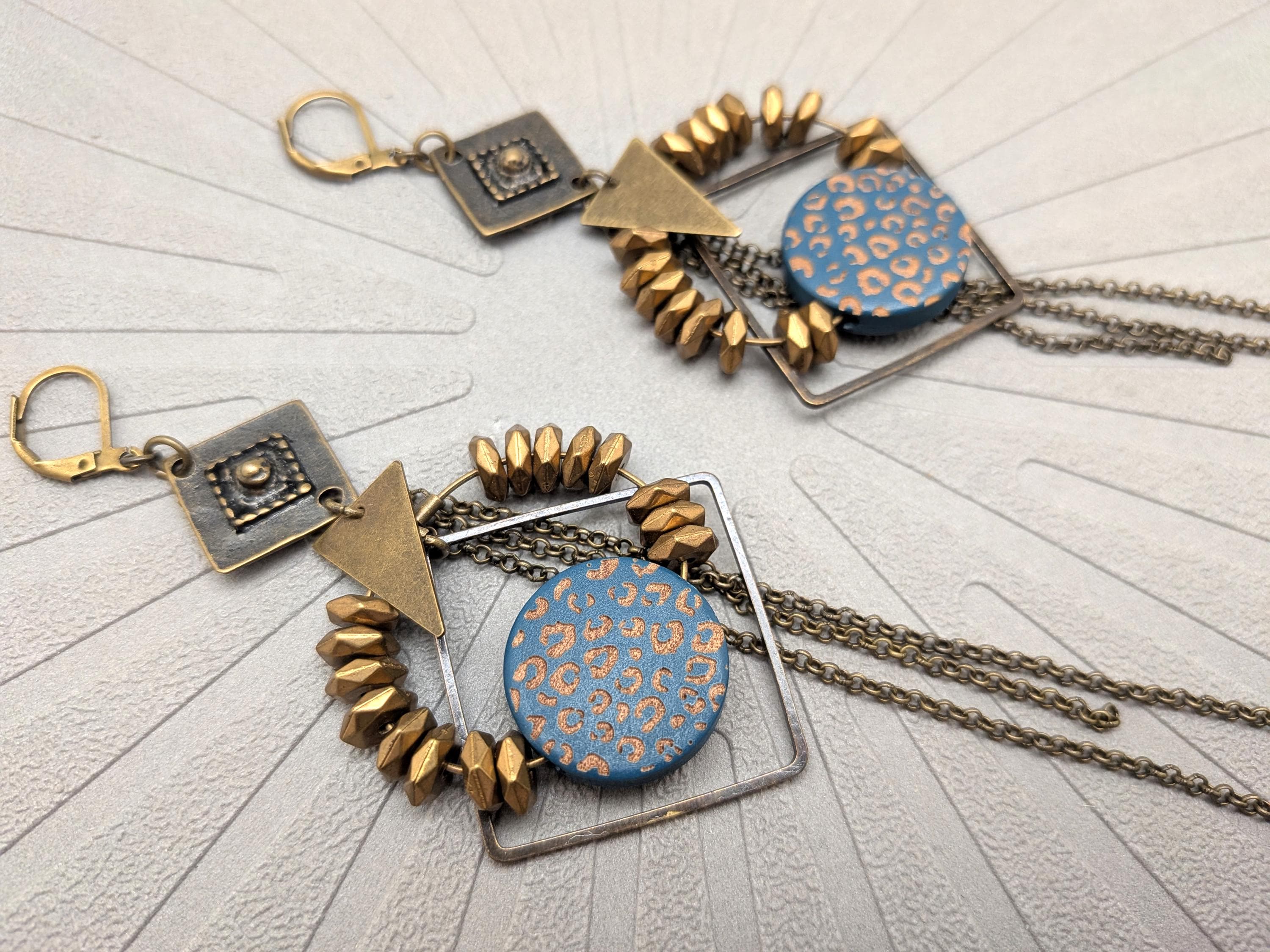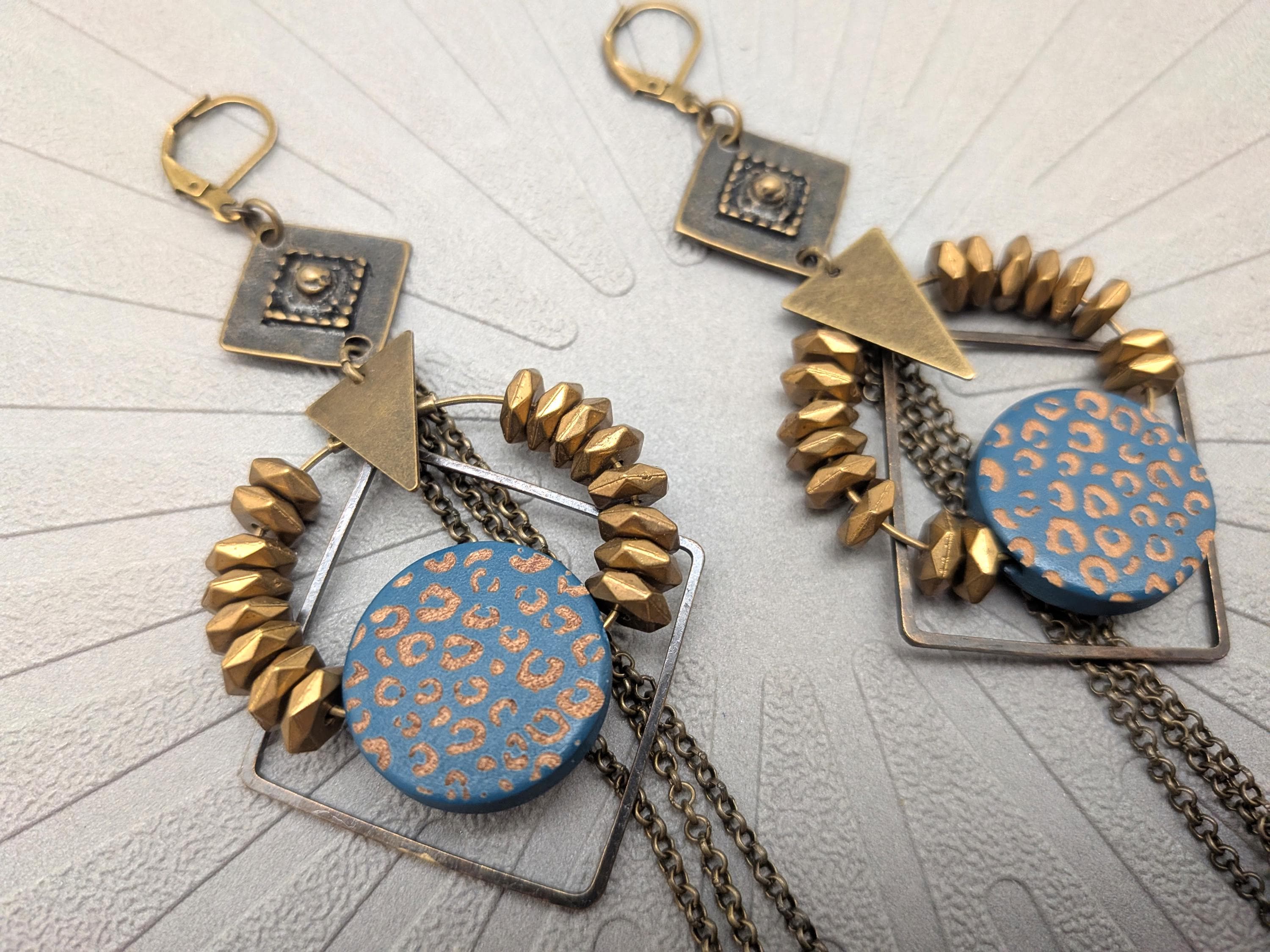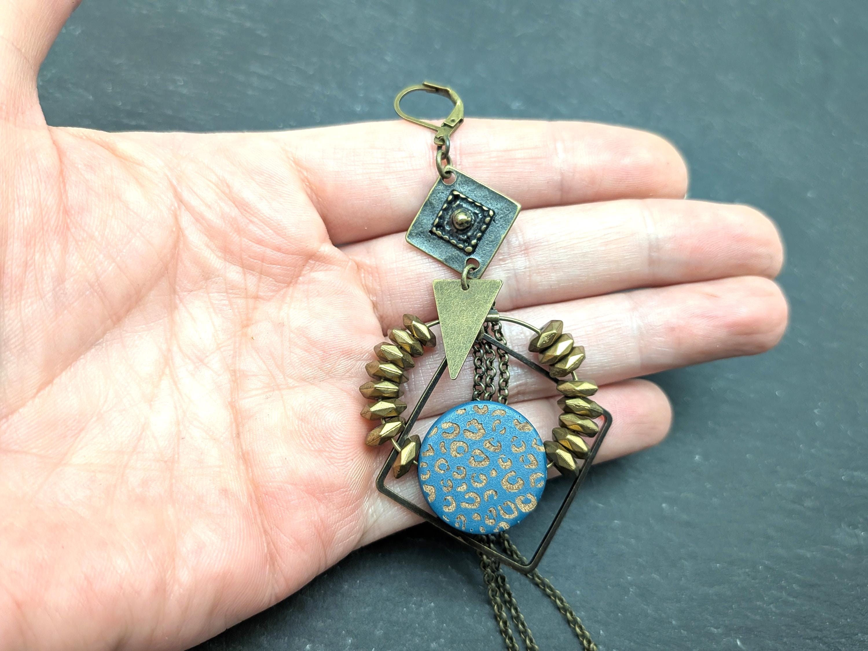 The design of the ZORA earrings is a joyful mix of styles. Geometric shapes in bronze metal are combined with a wooden disc painted with a blue and bronze leopard pattern.
