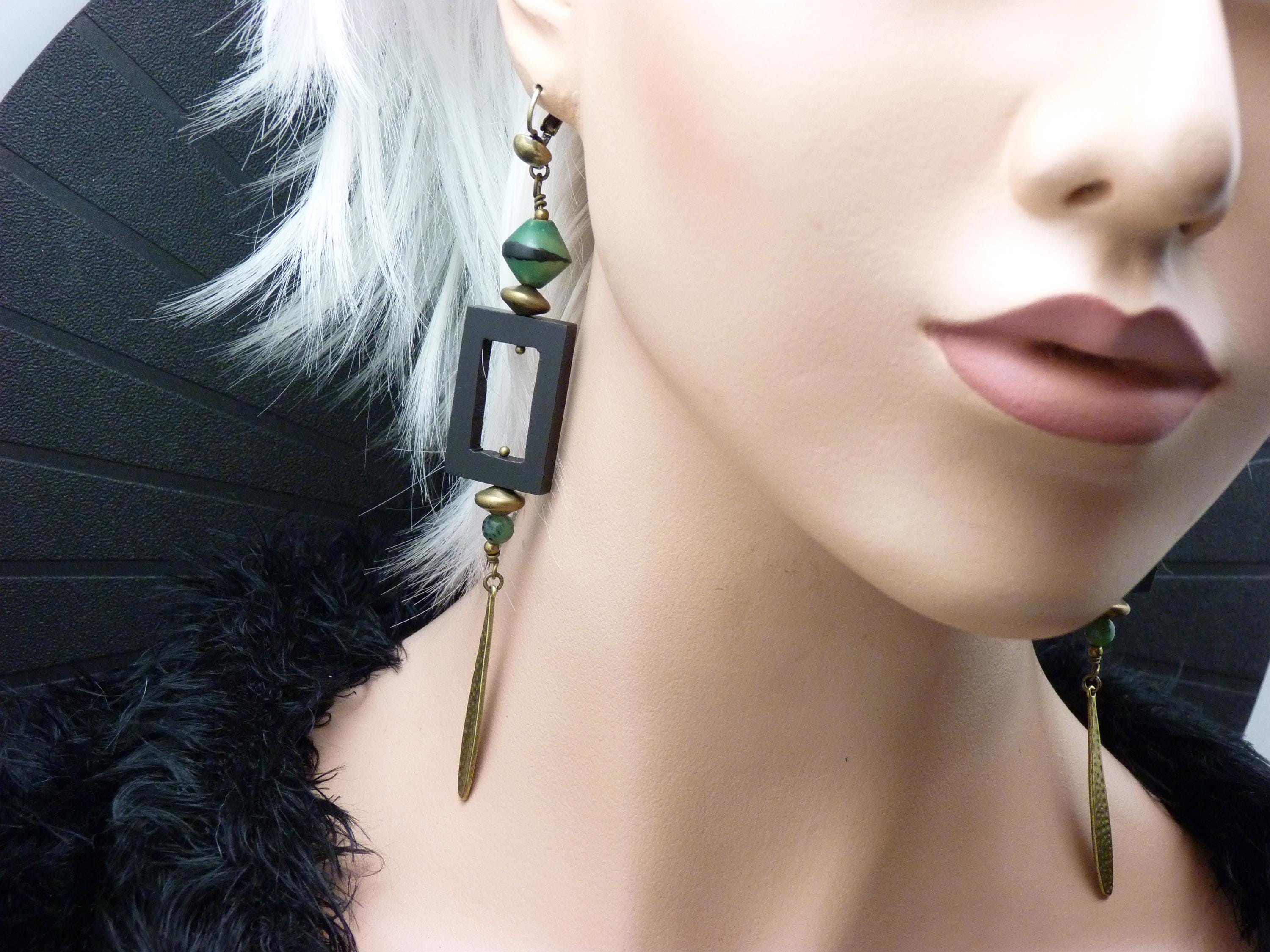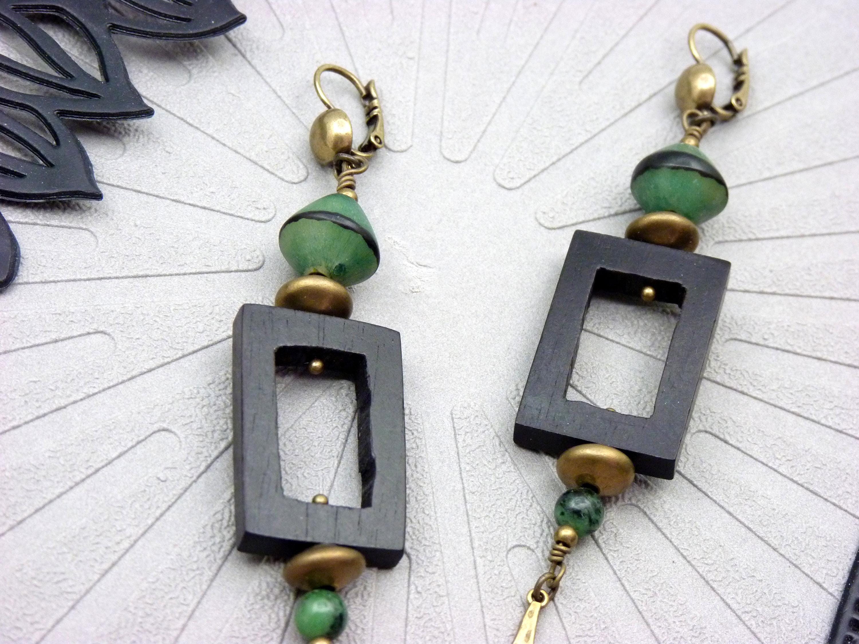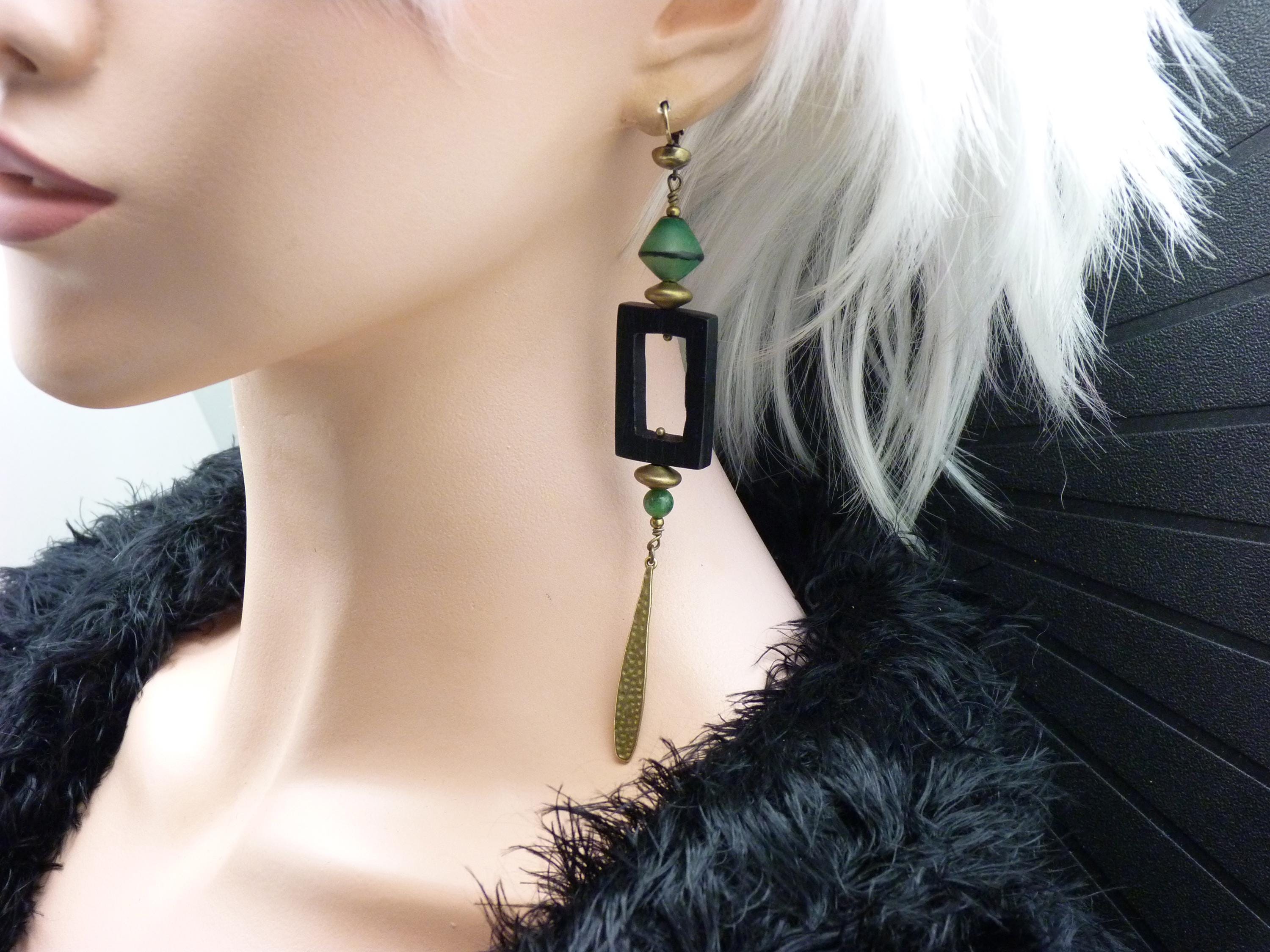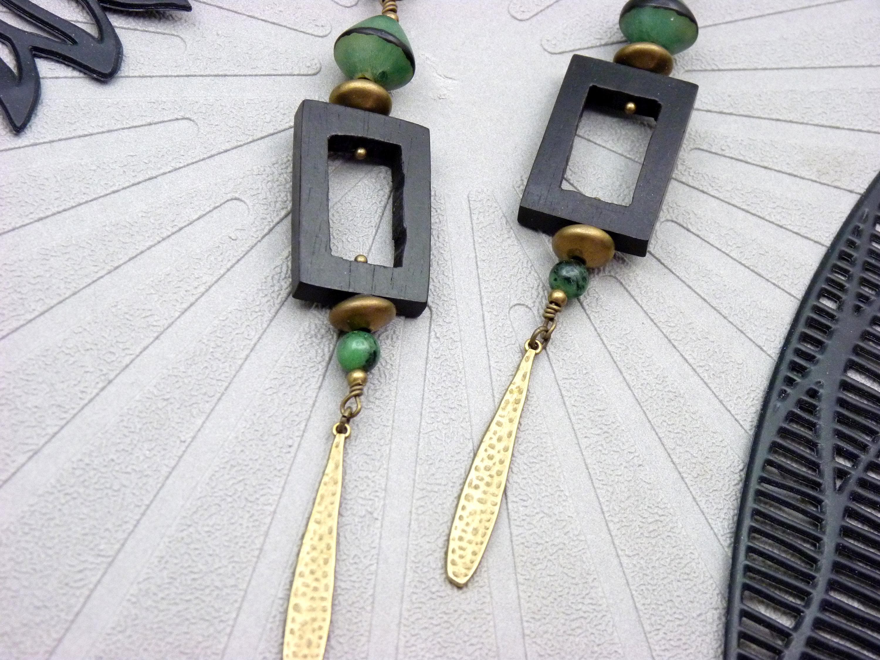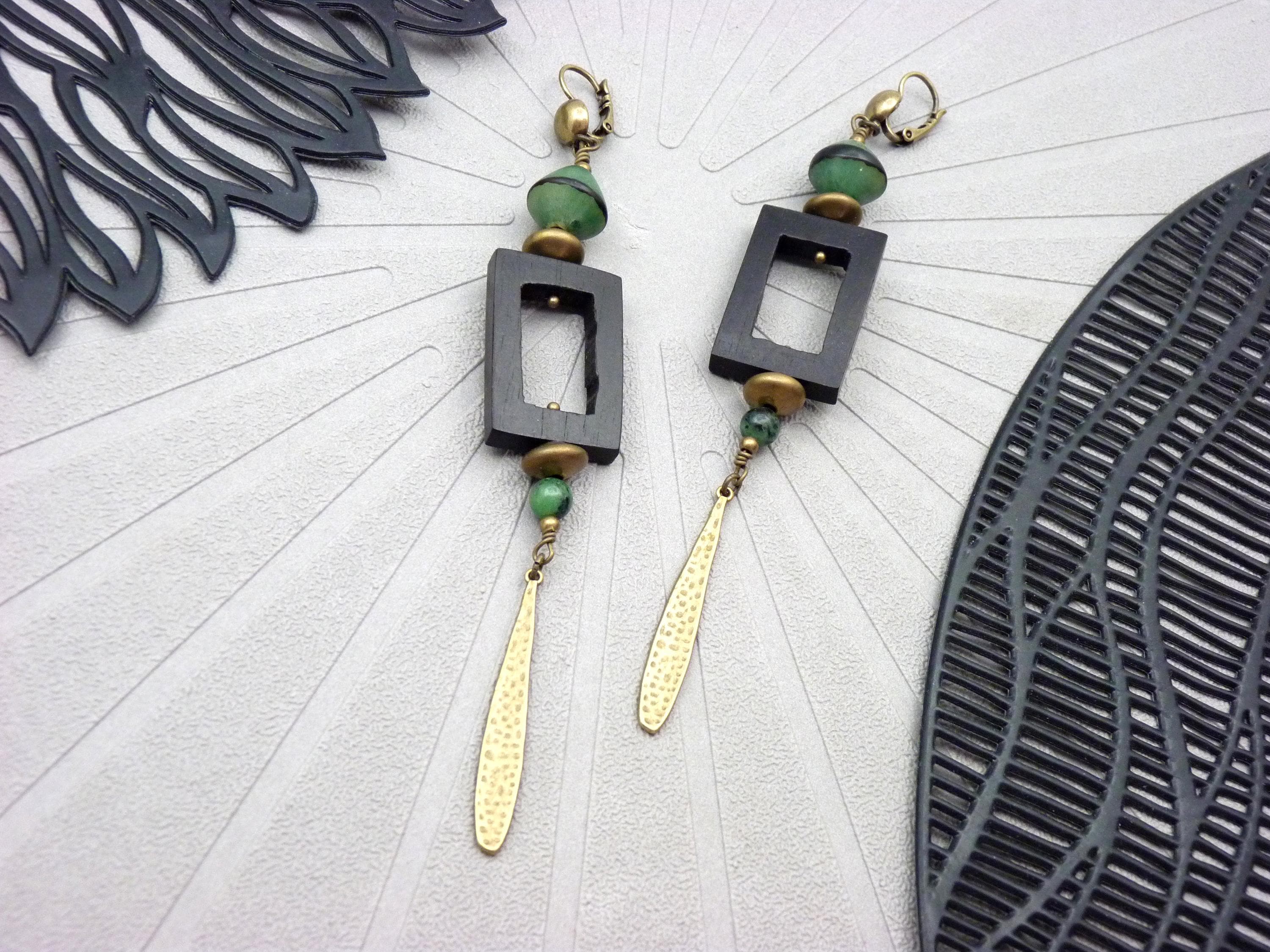 Long earrings, where black wood, green resin and bronze metal come together in a totem-like spirit.