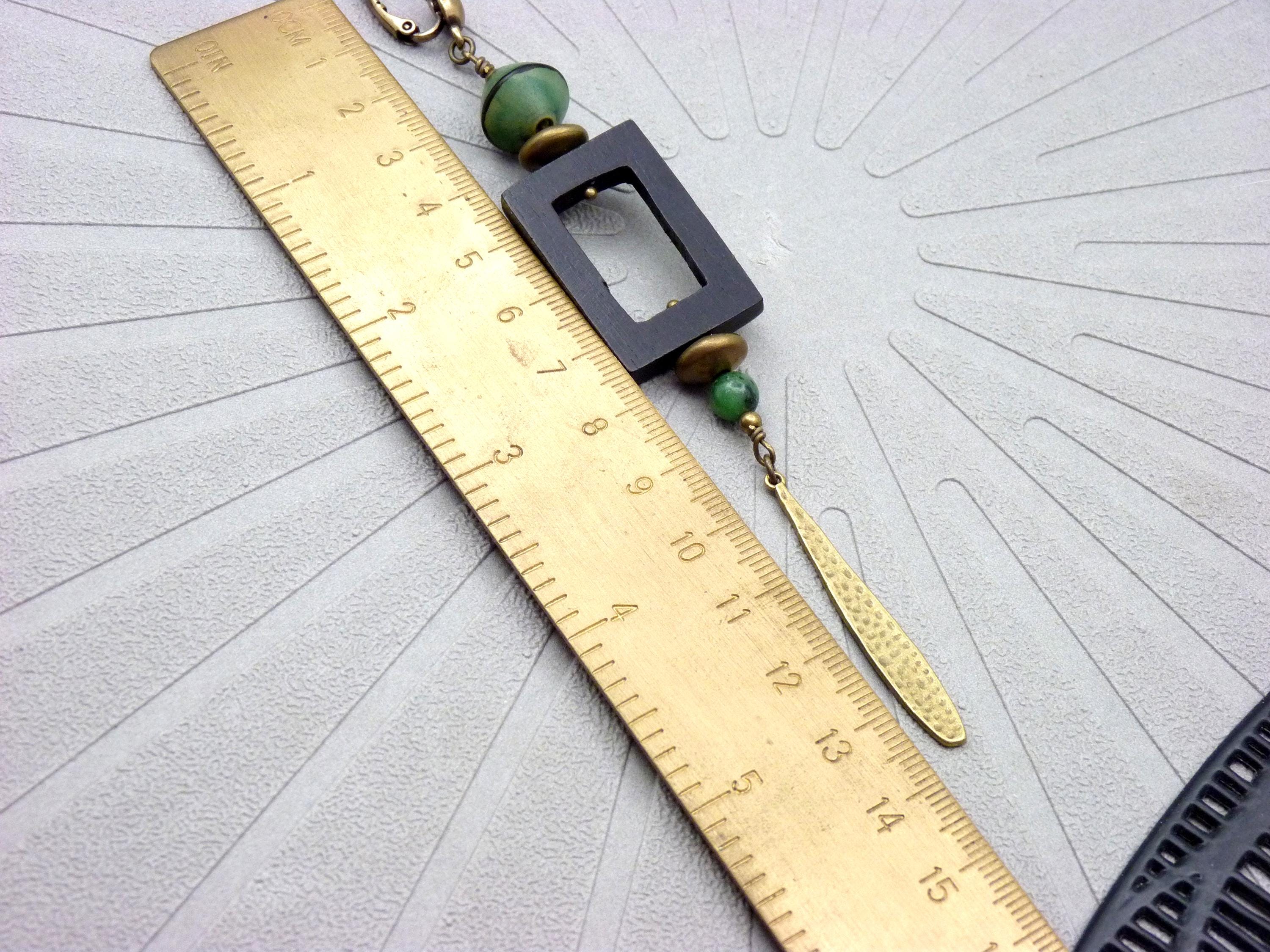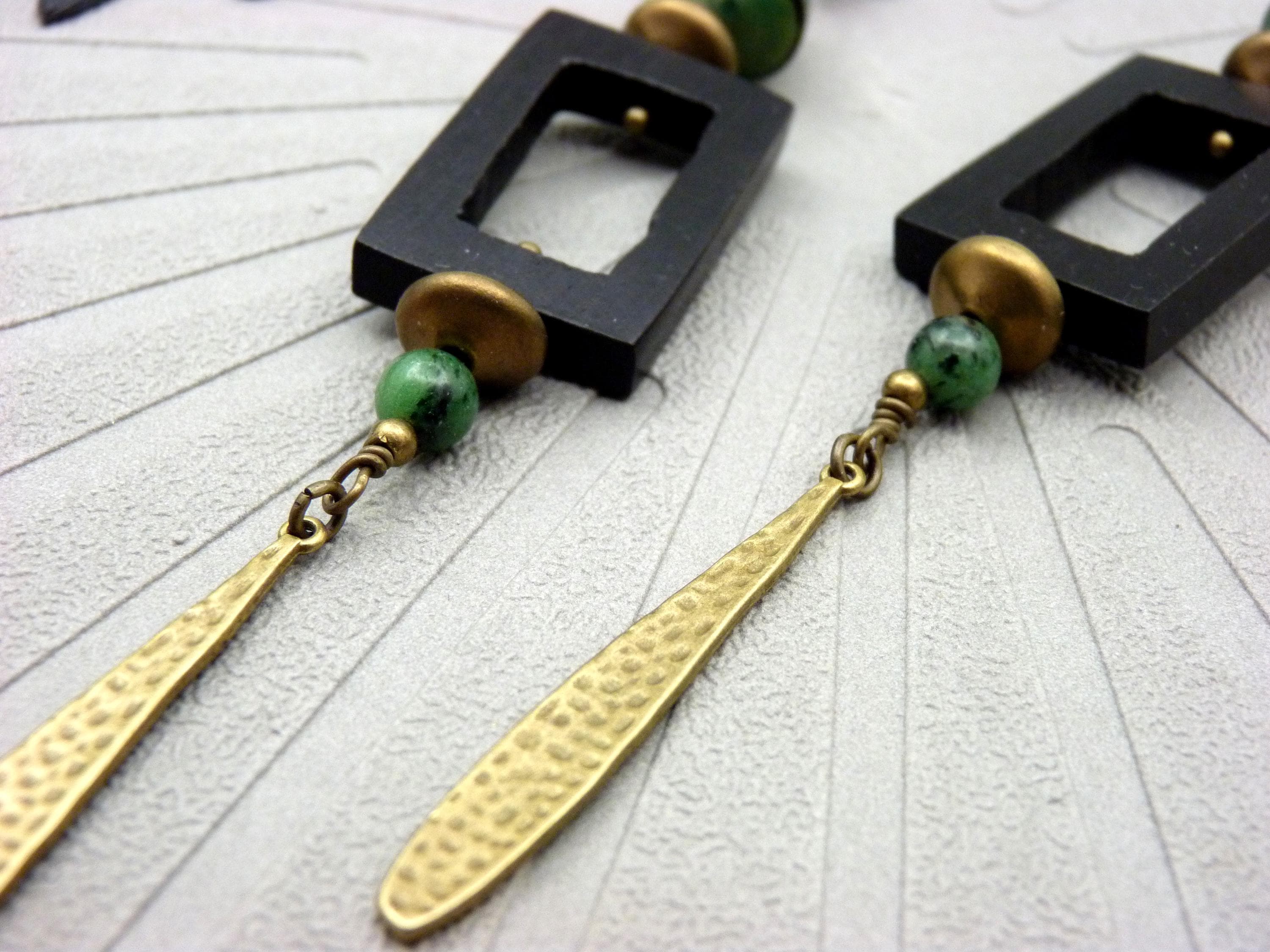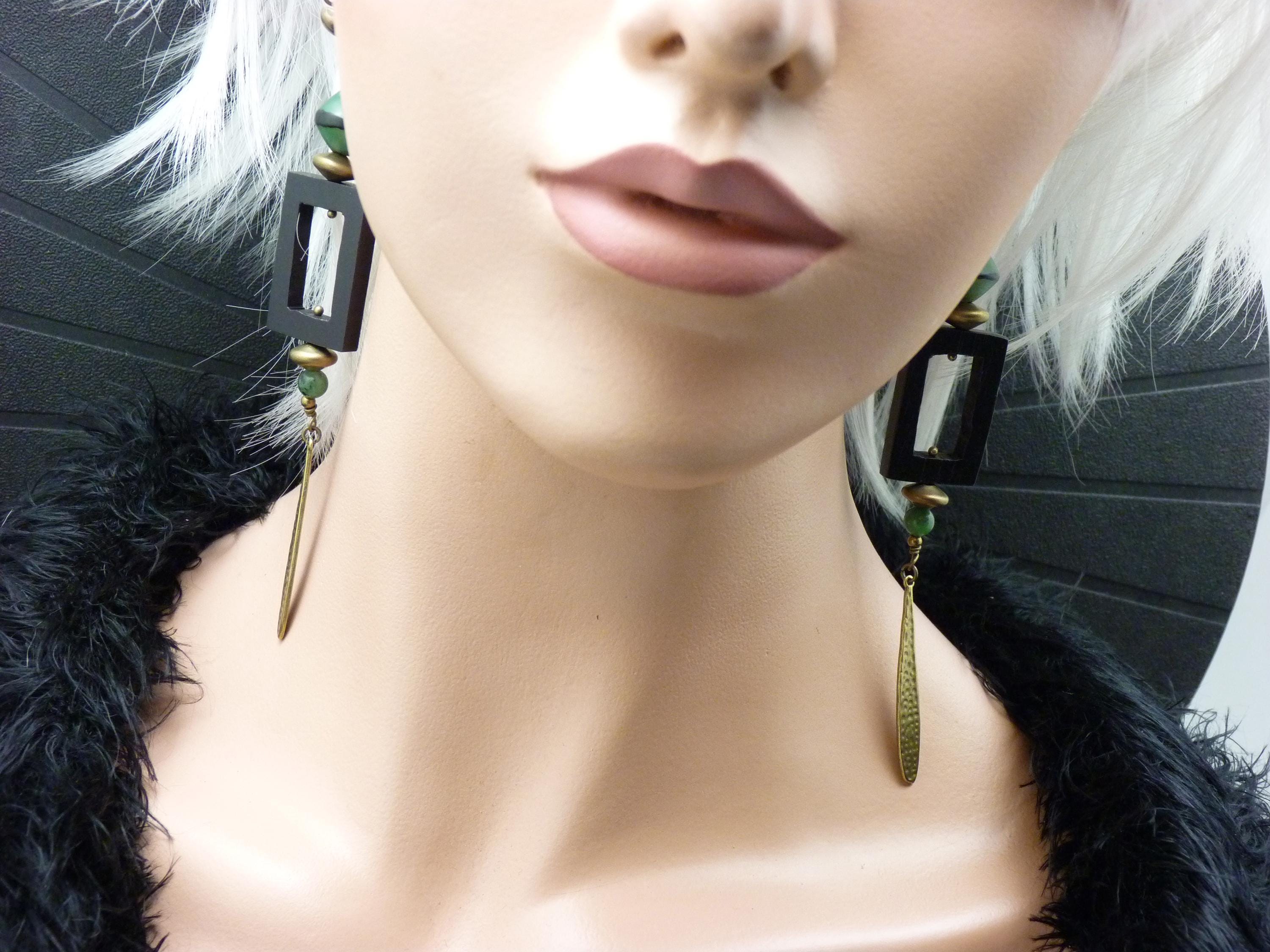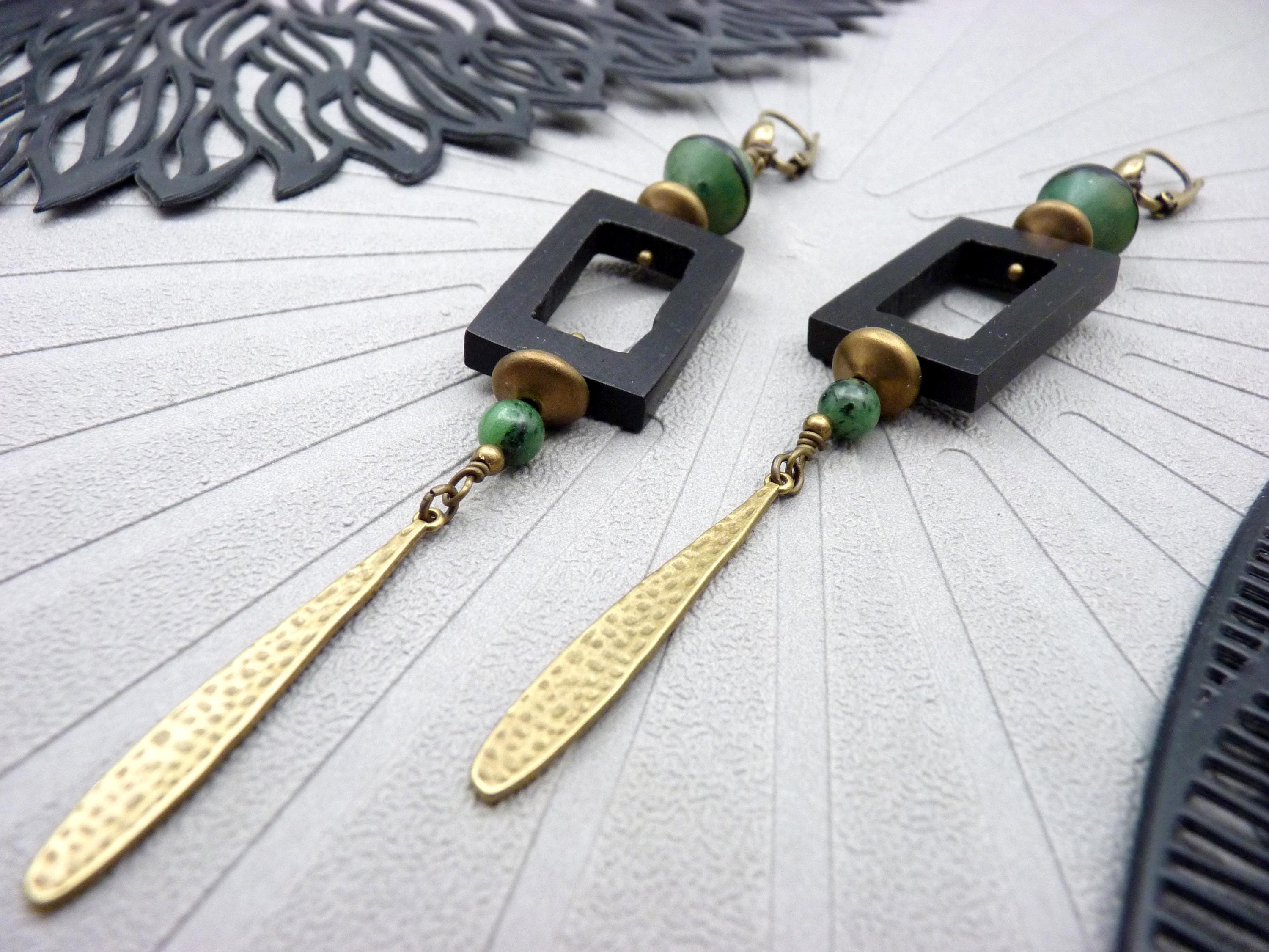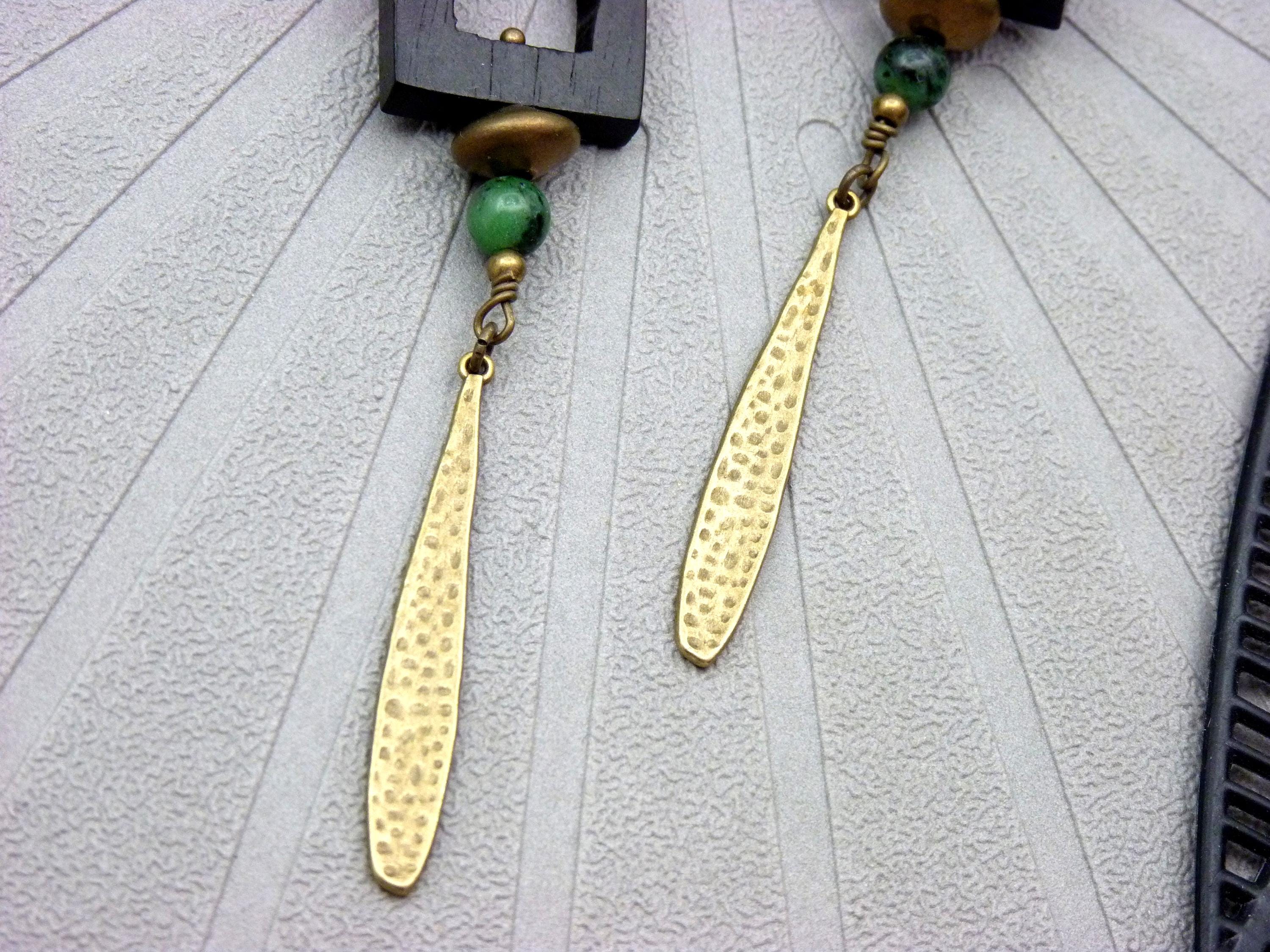 Long earrings, where black wood, green resin and bronze metal come together in a totem-like spirit.