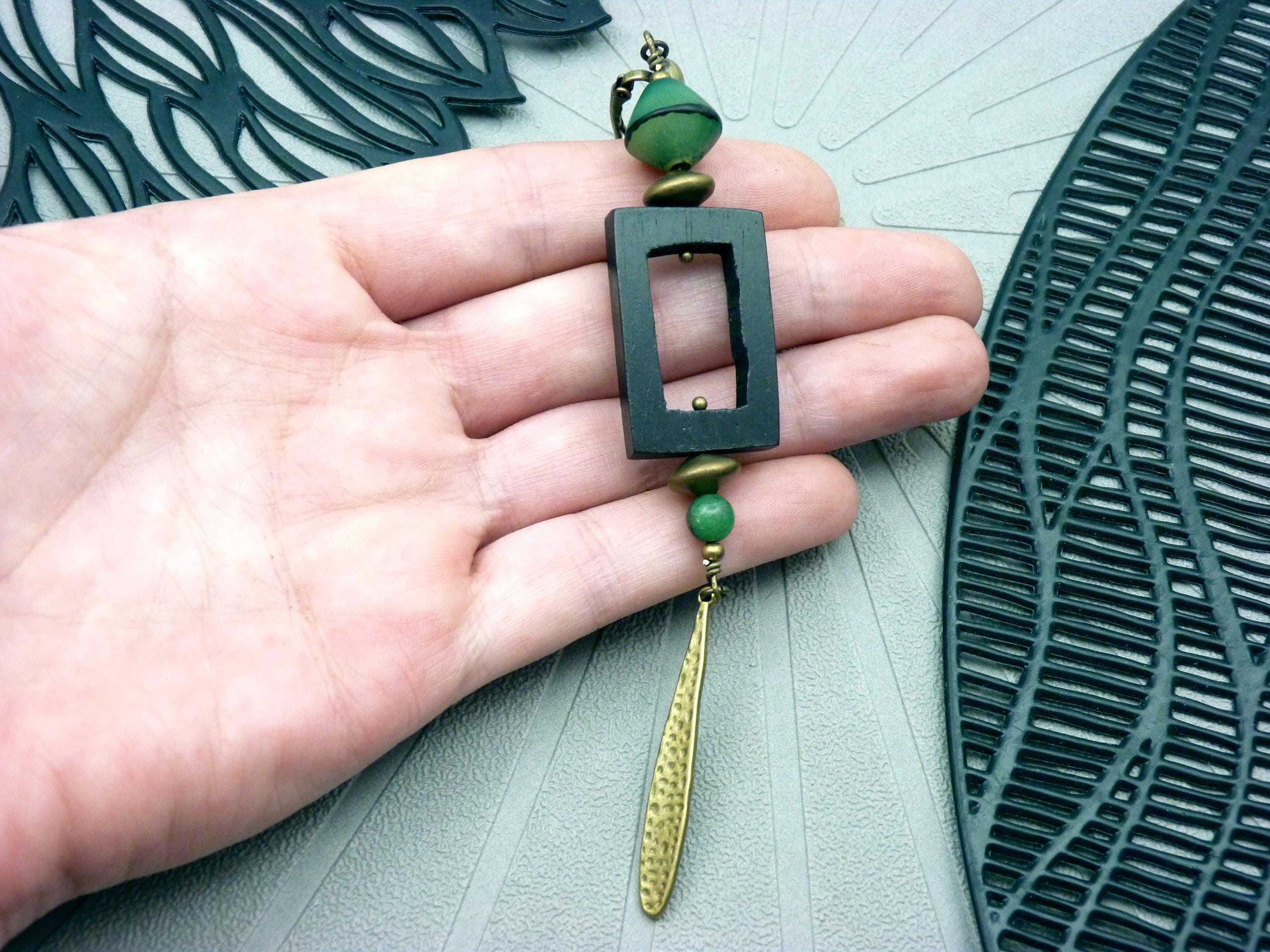Green resin beads, an openwork black wooden rectangle and pieces of hammered bronze metal come together to create a living jewel that dances to the rhythm of your steps.