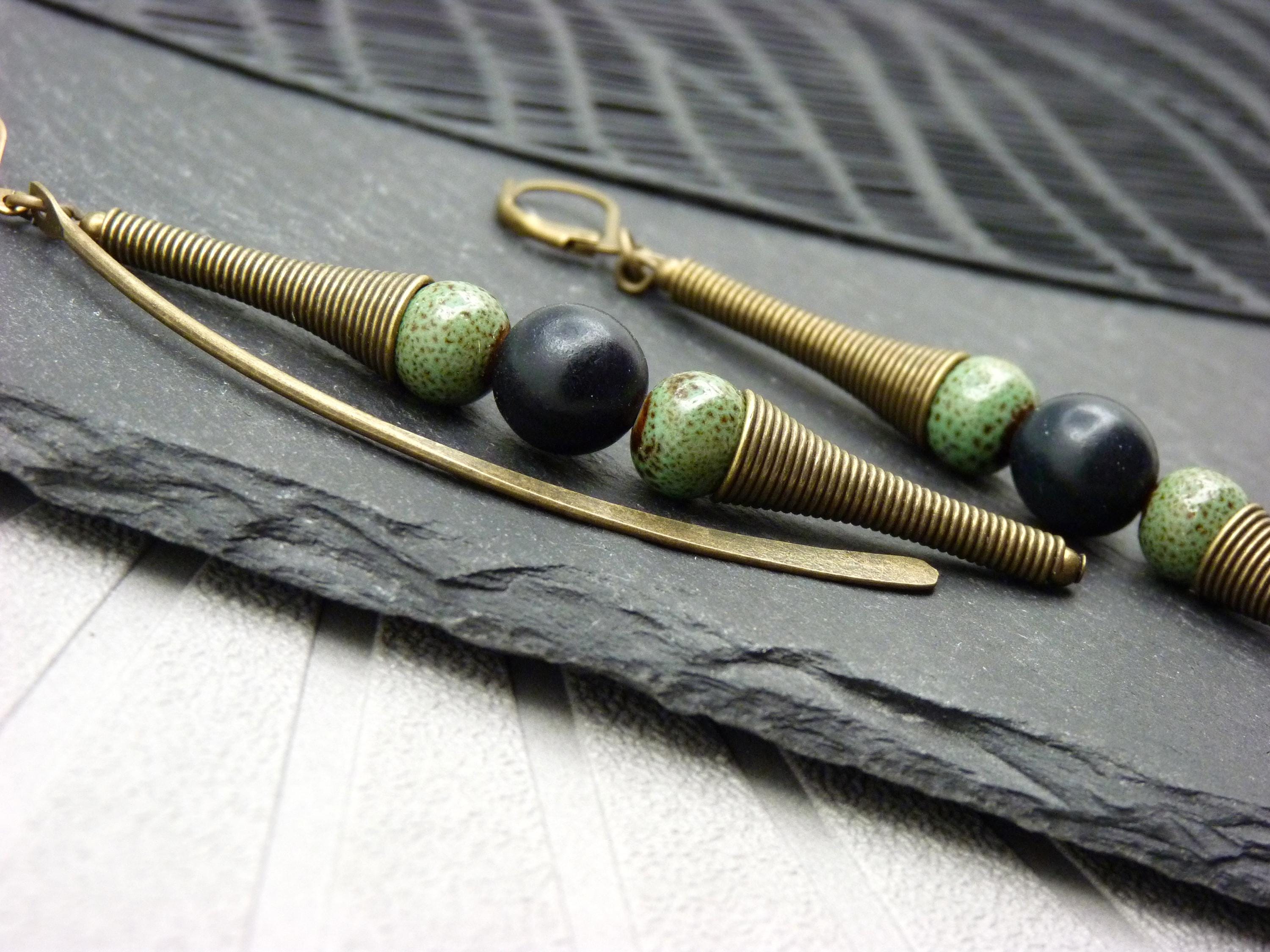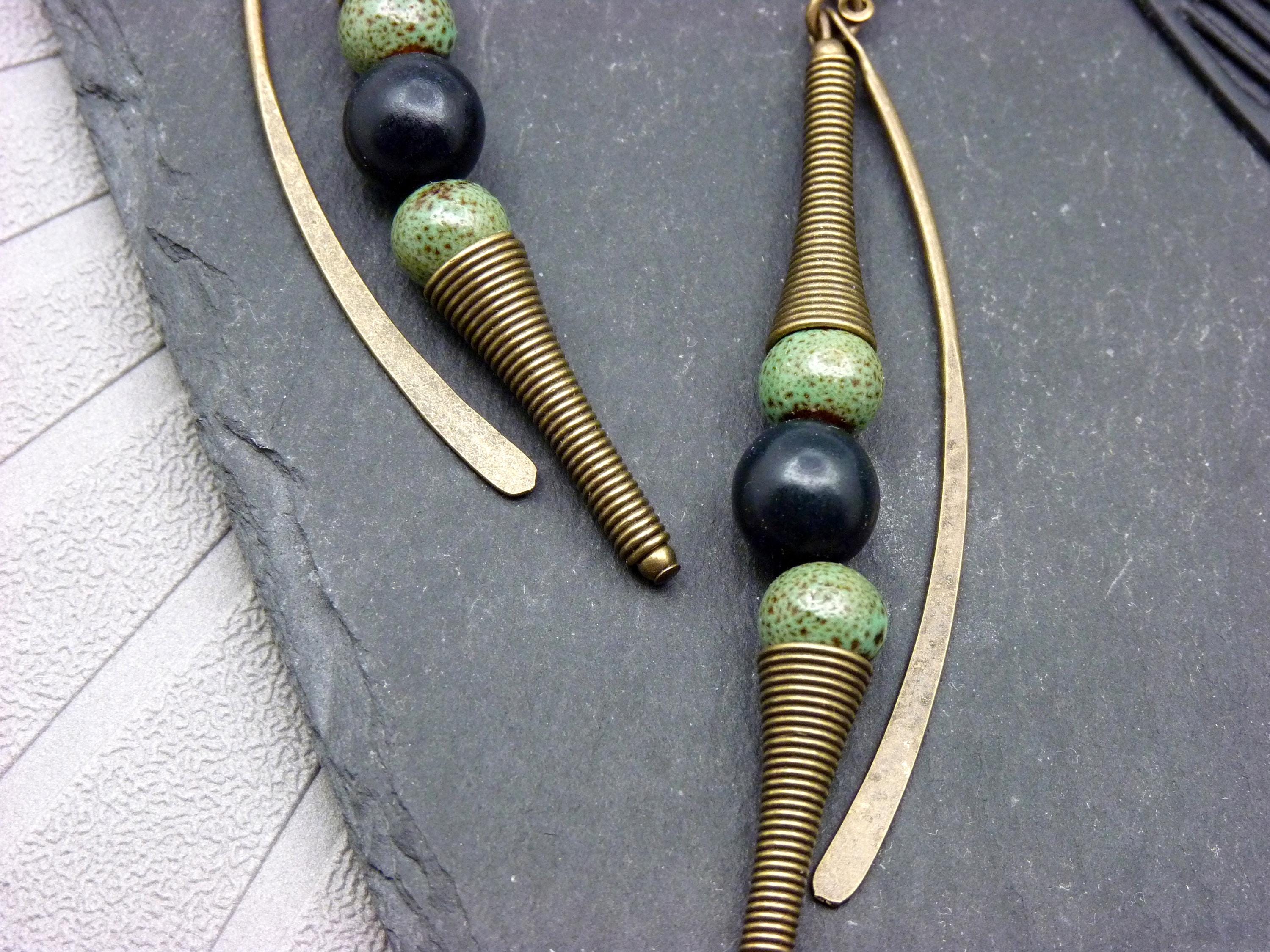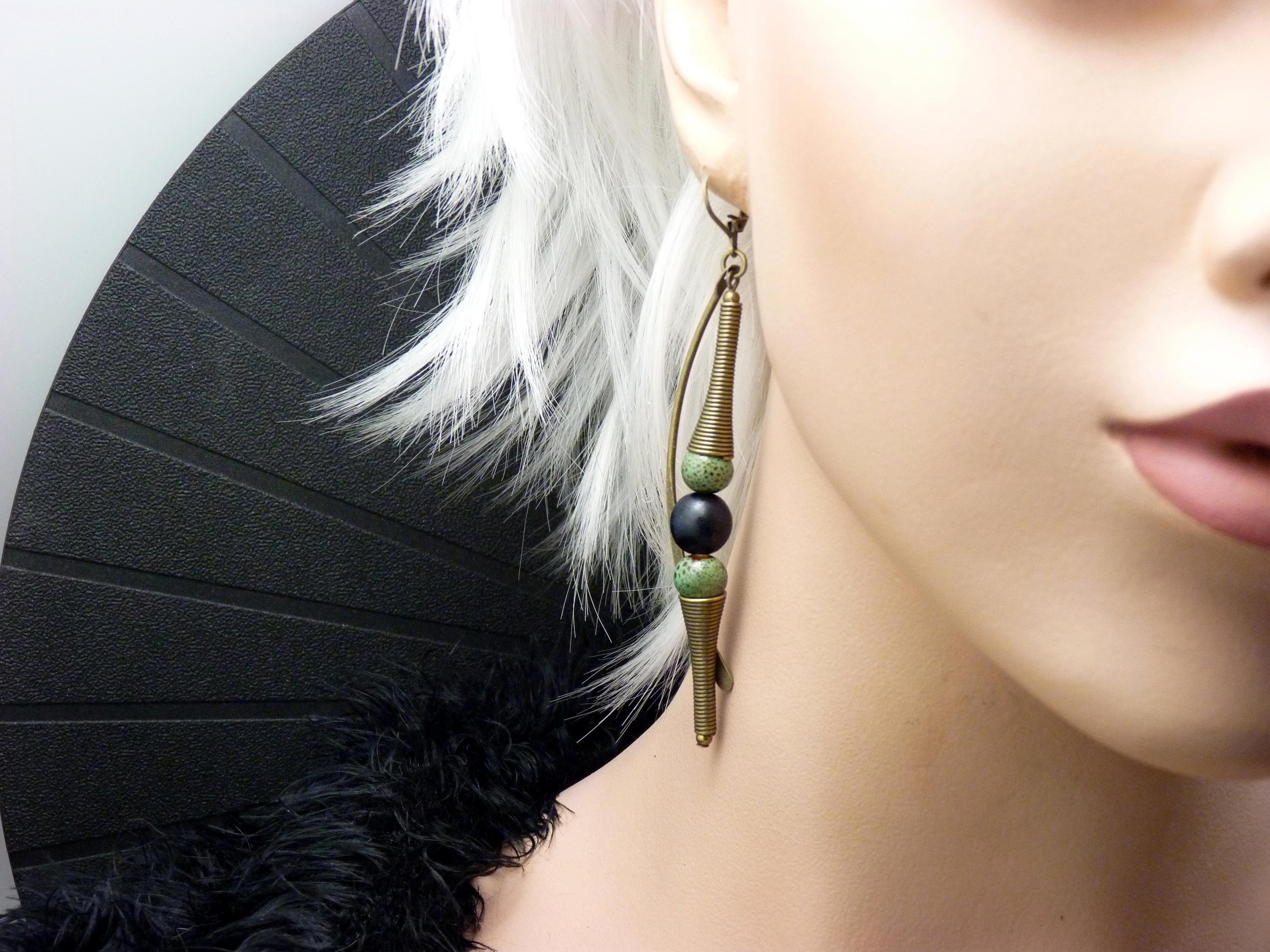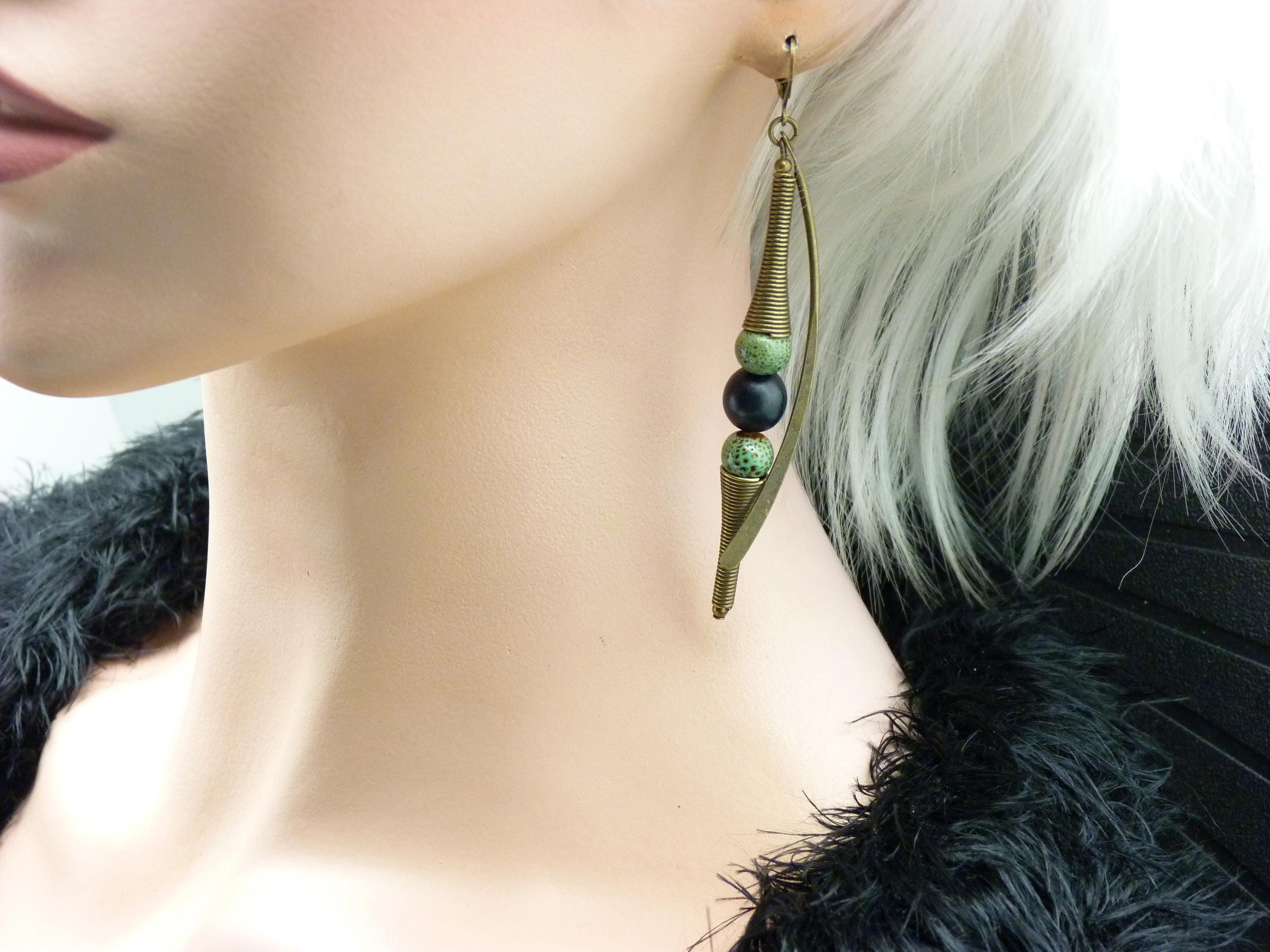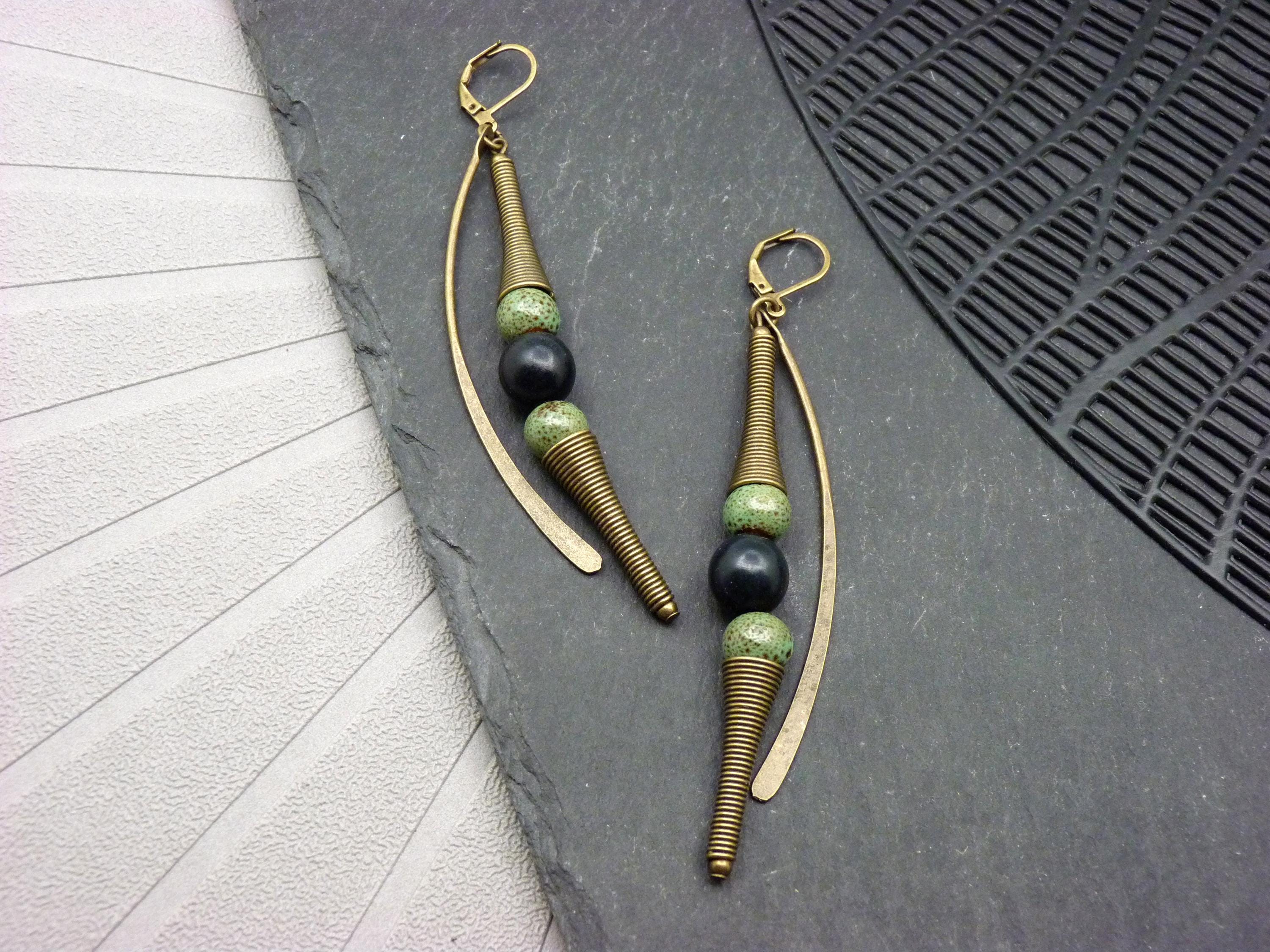 A pair of long earrings, where green ceramic and black wood beads are combined with bronze metal elements.