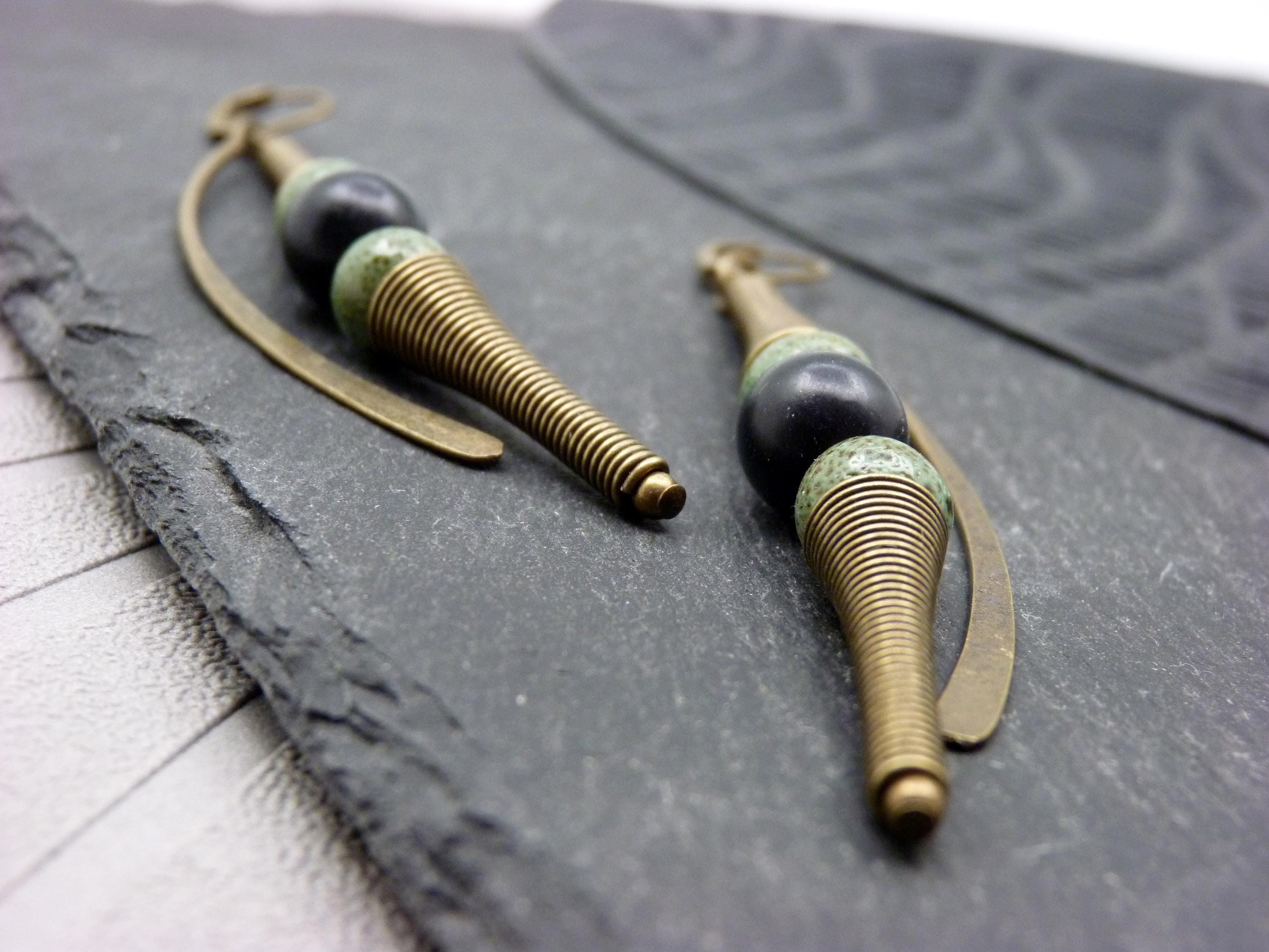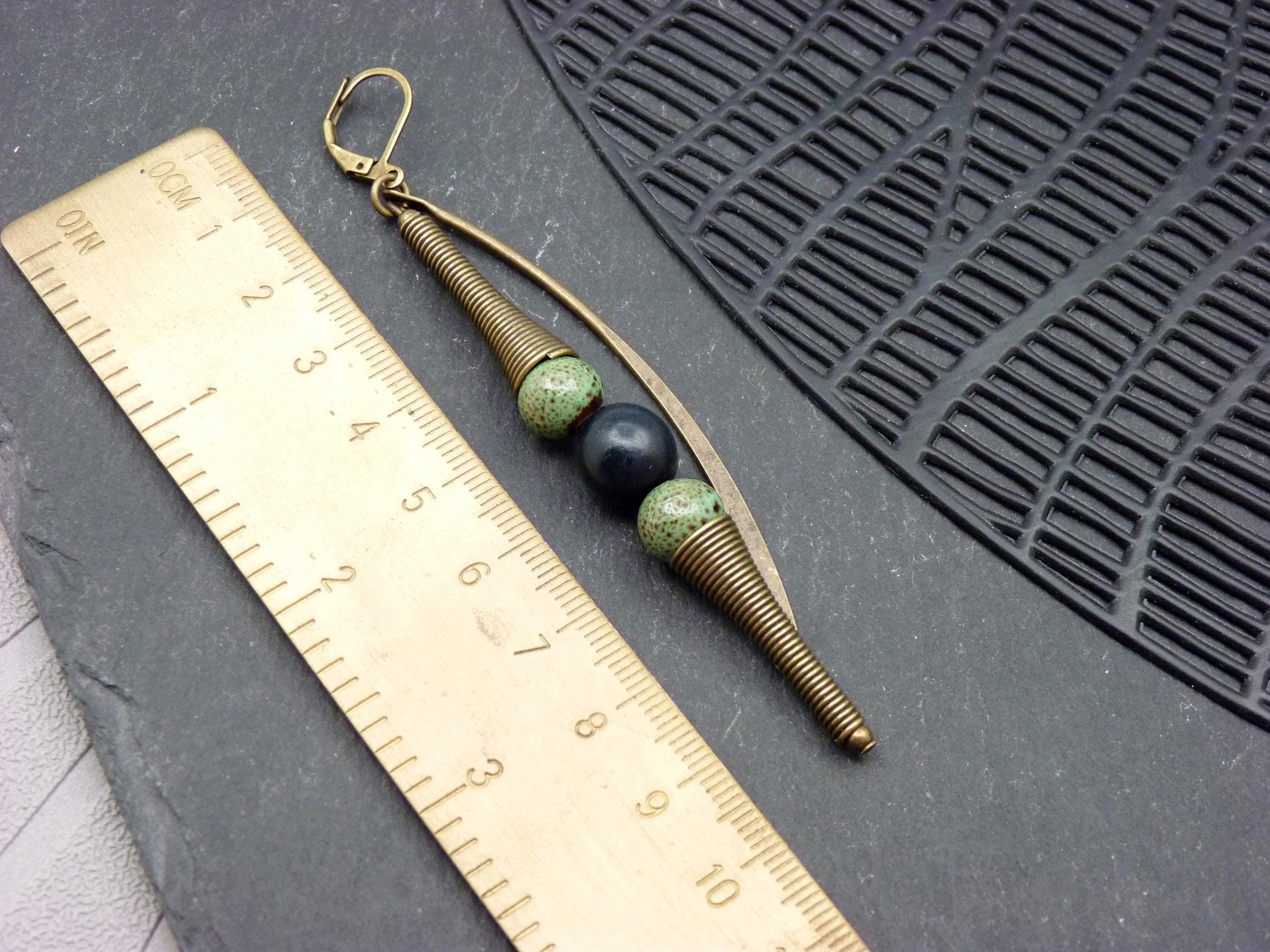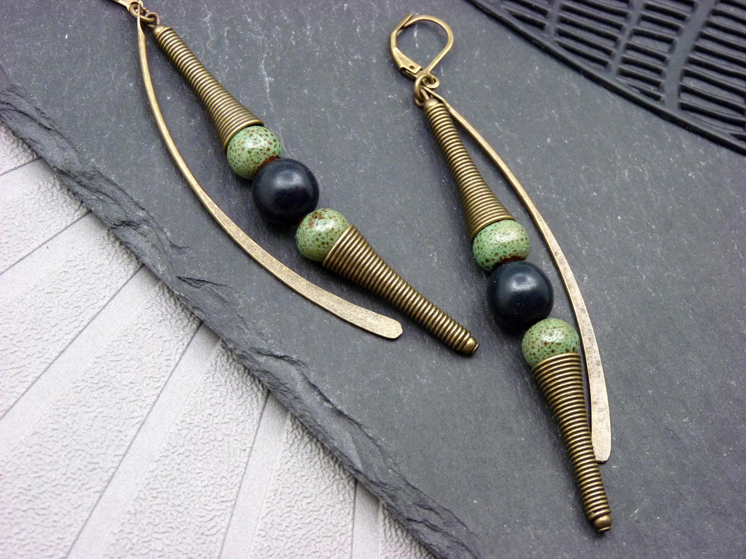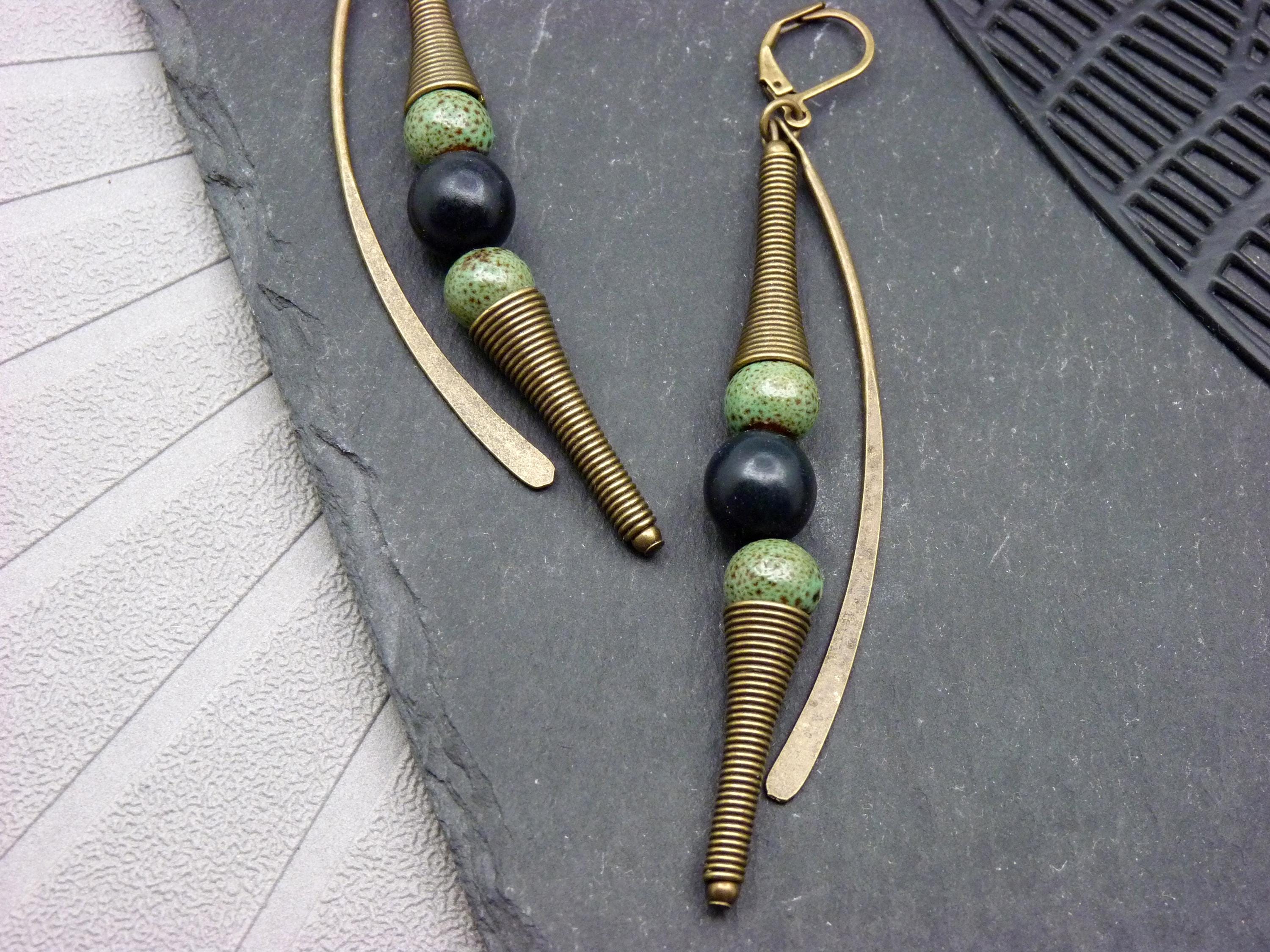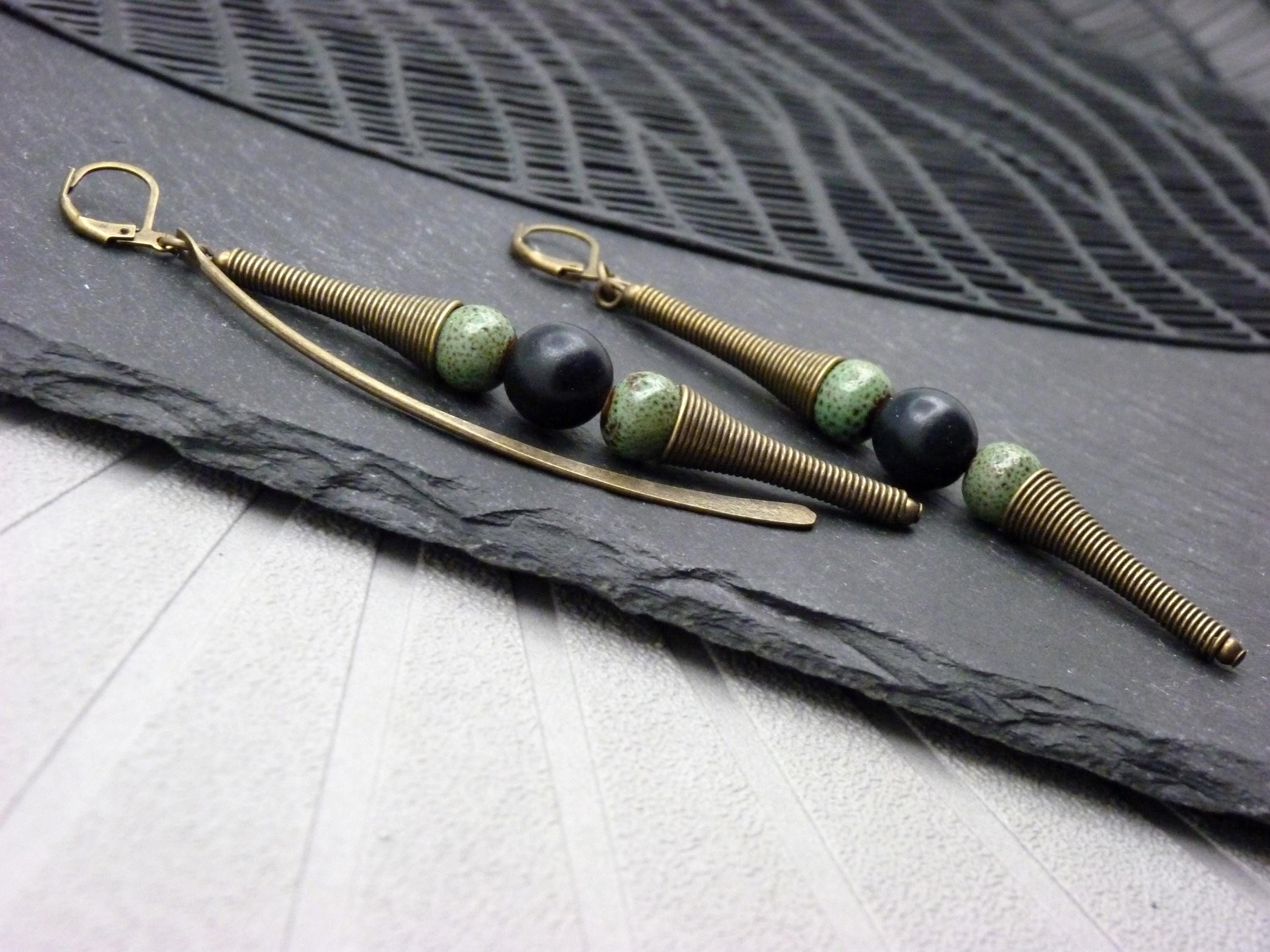 A pair of long earrings, where green ceramic and black wood beads are combined with bronze metal elements.