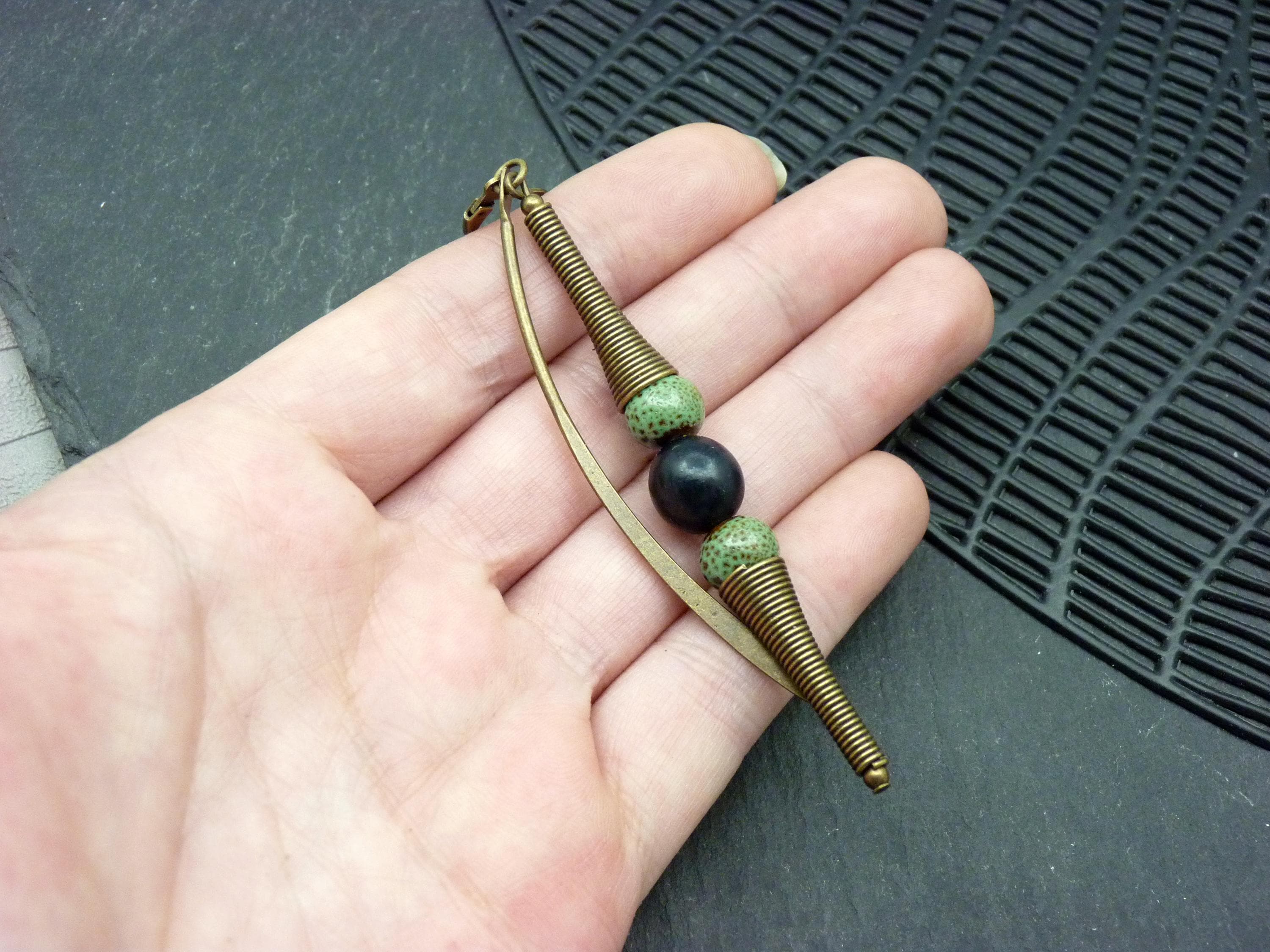 A long bronze spring is pierced by speckled green ceramic beads and a deep black wooden bead. A bronze metal arch completes this unique and characterful composition.