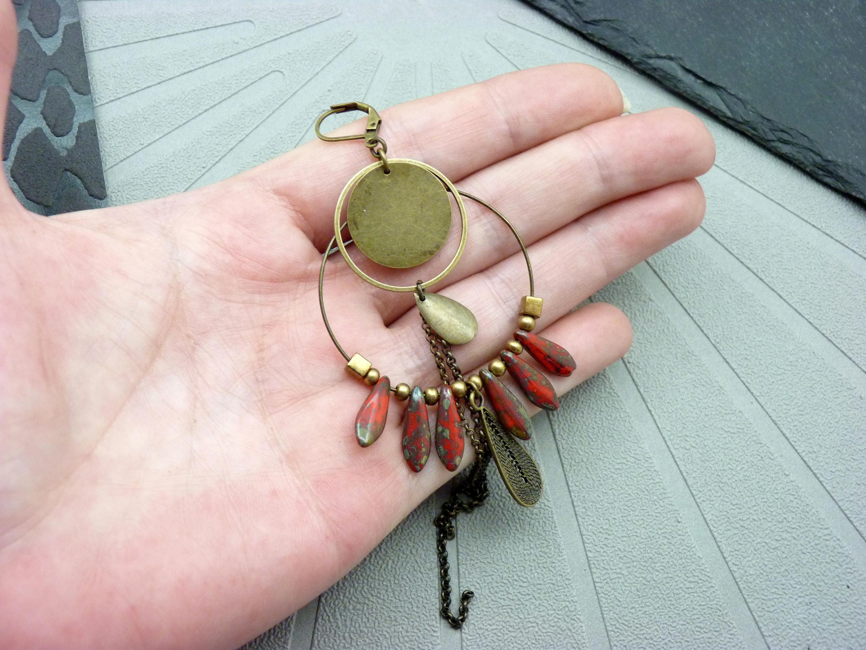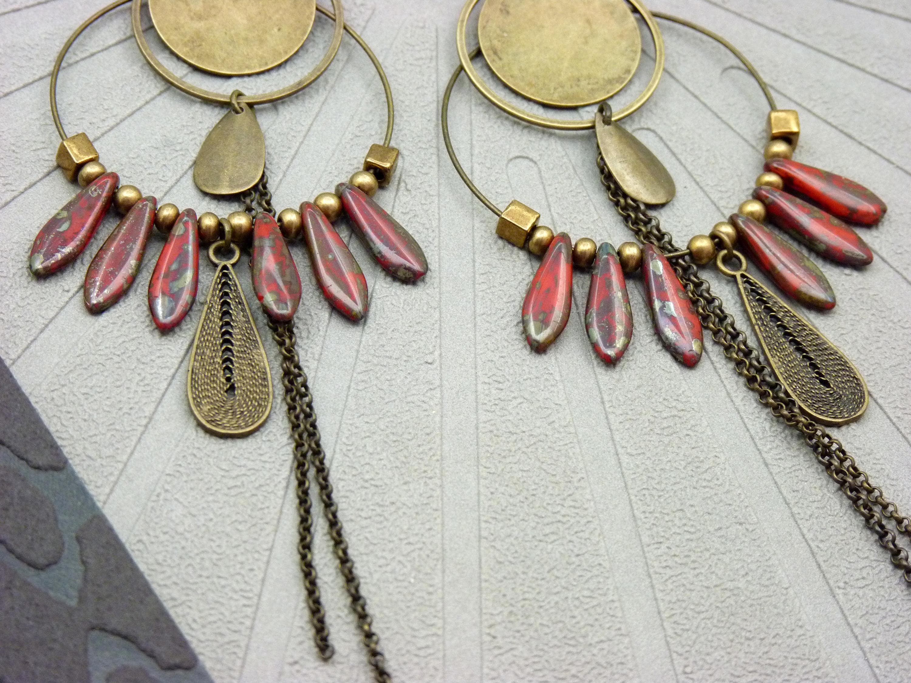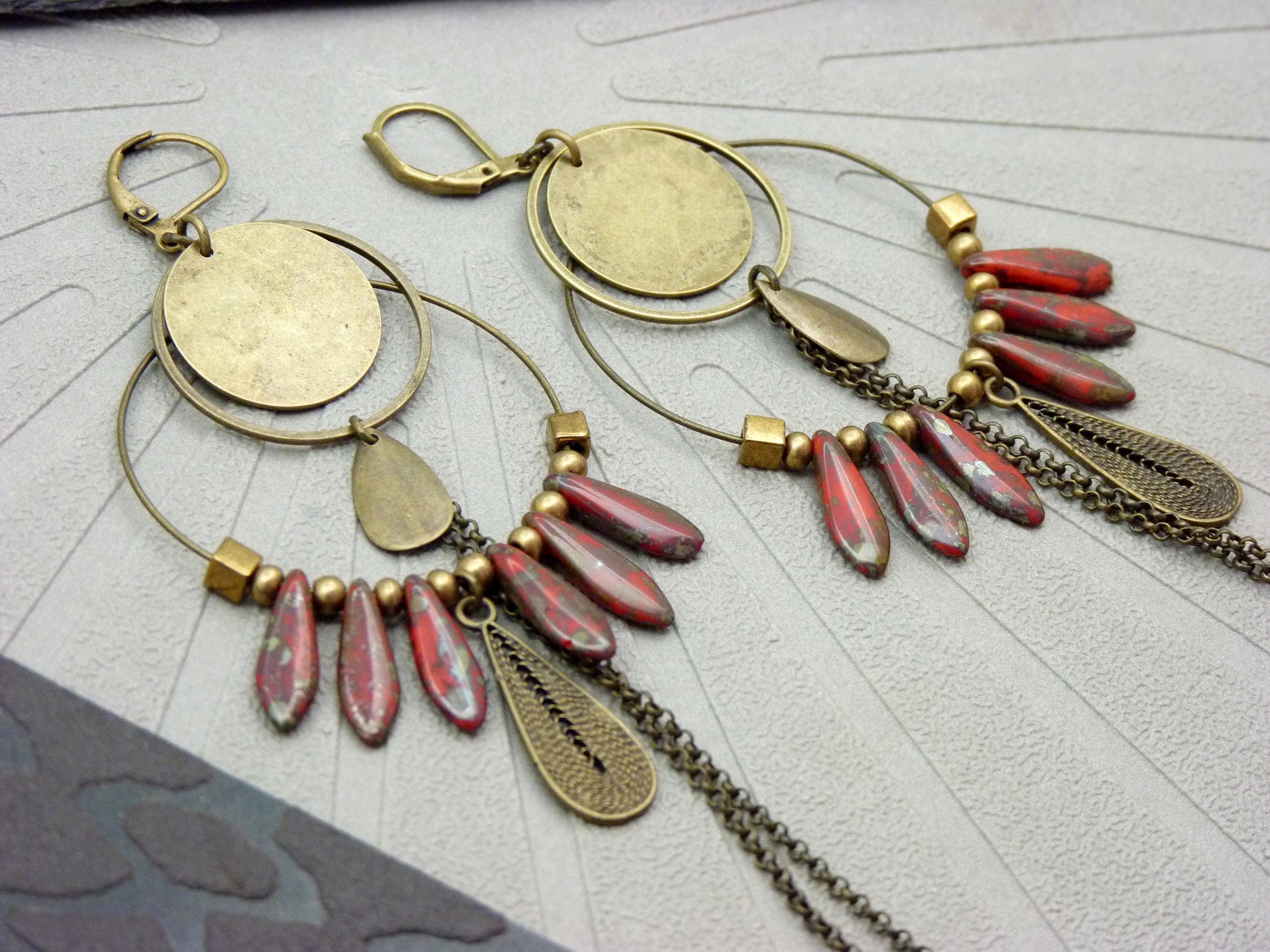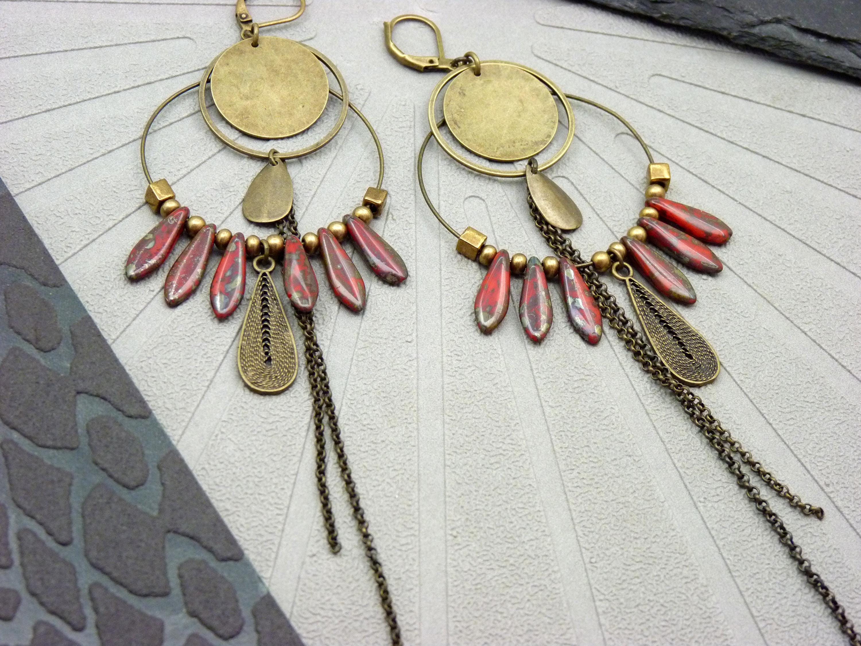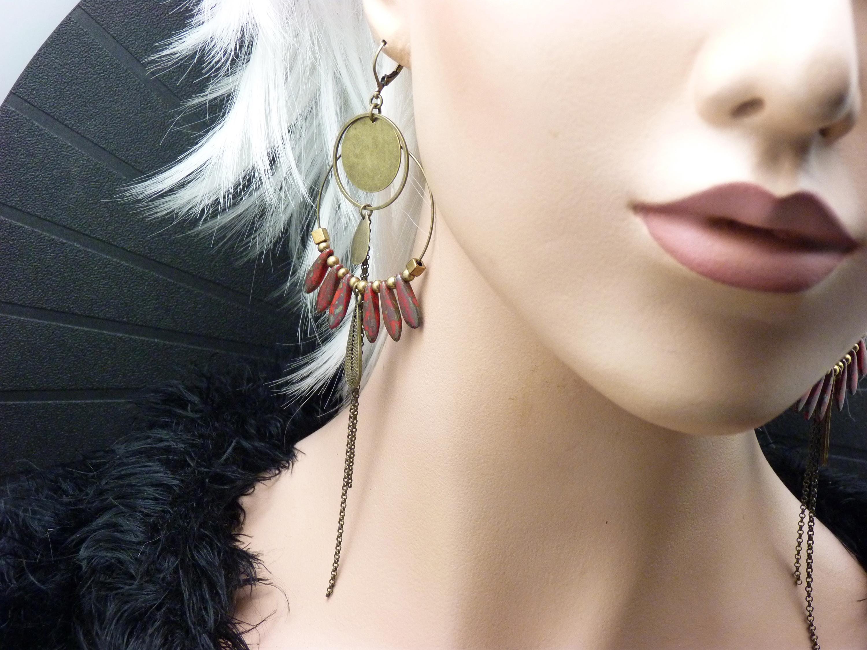 A pair of bohemian hoop earrings where antique bronze embraces marbled red glass, in a cascade of chains that never goes unnoticed.