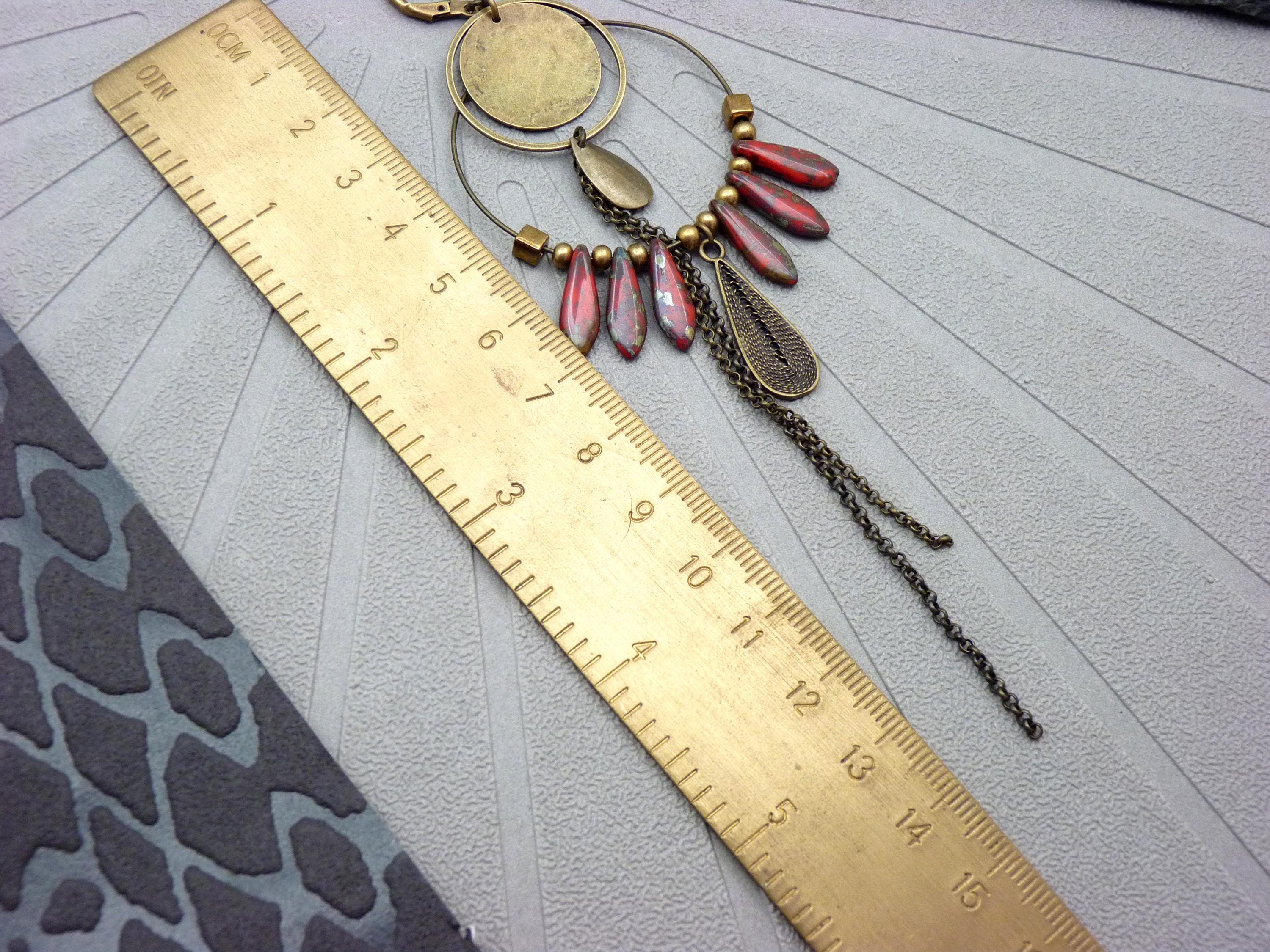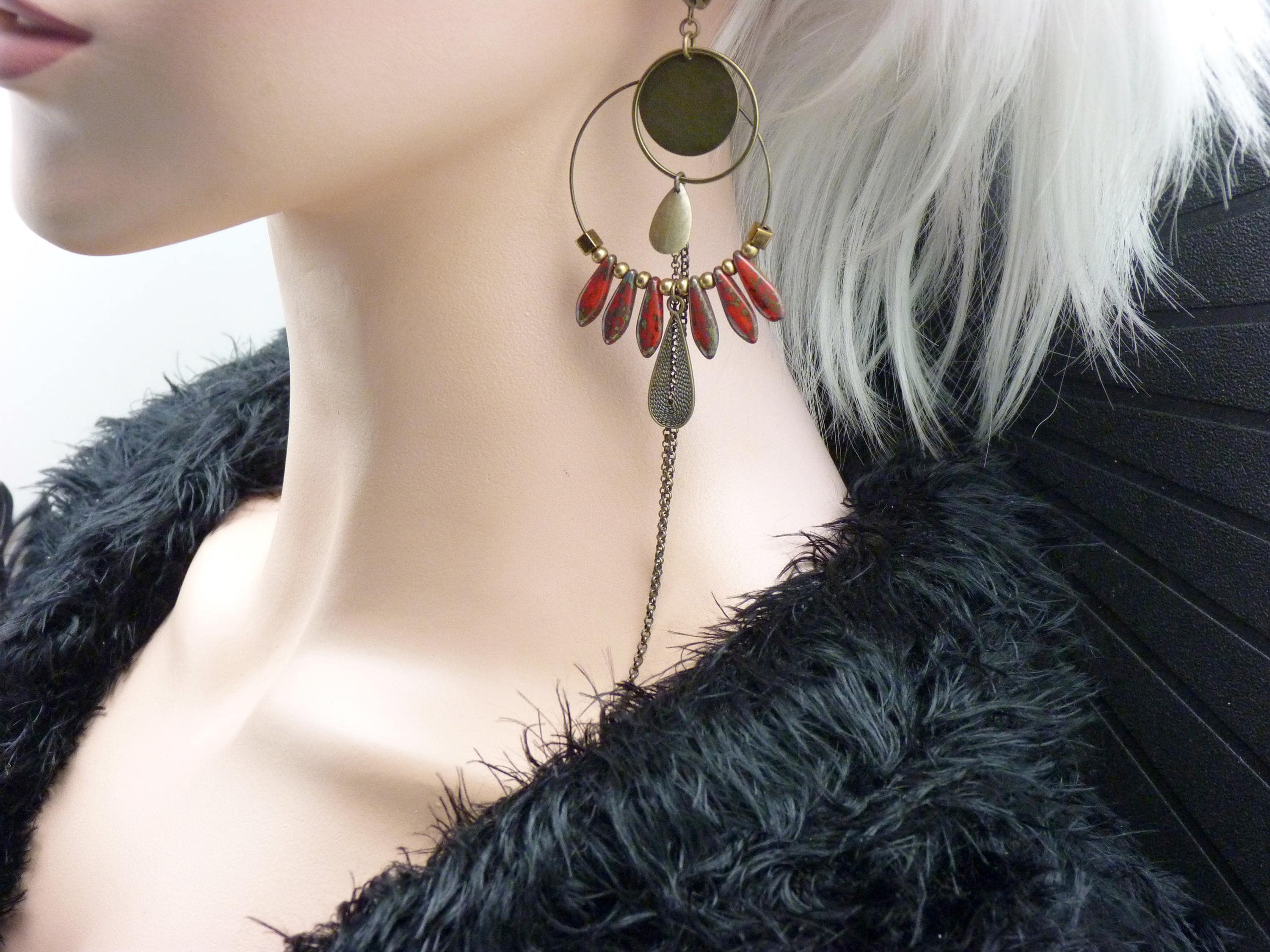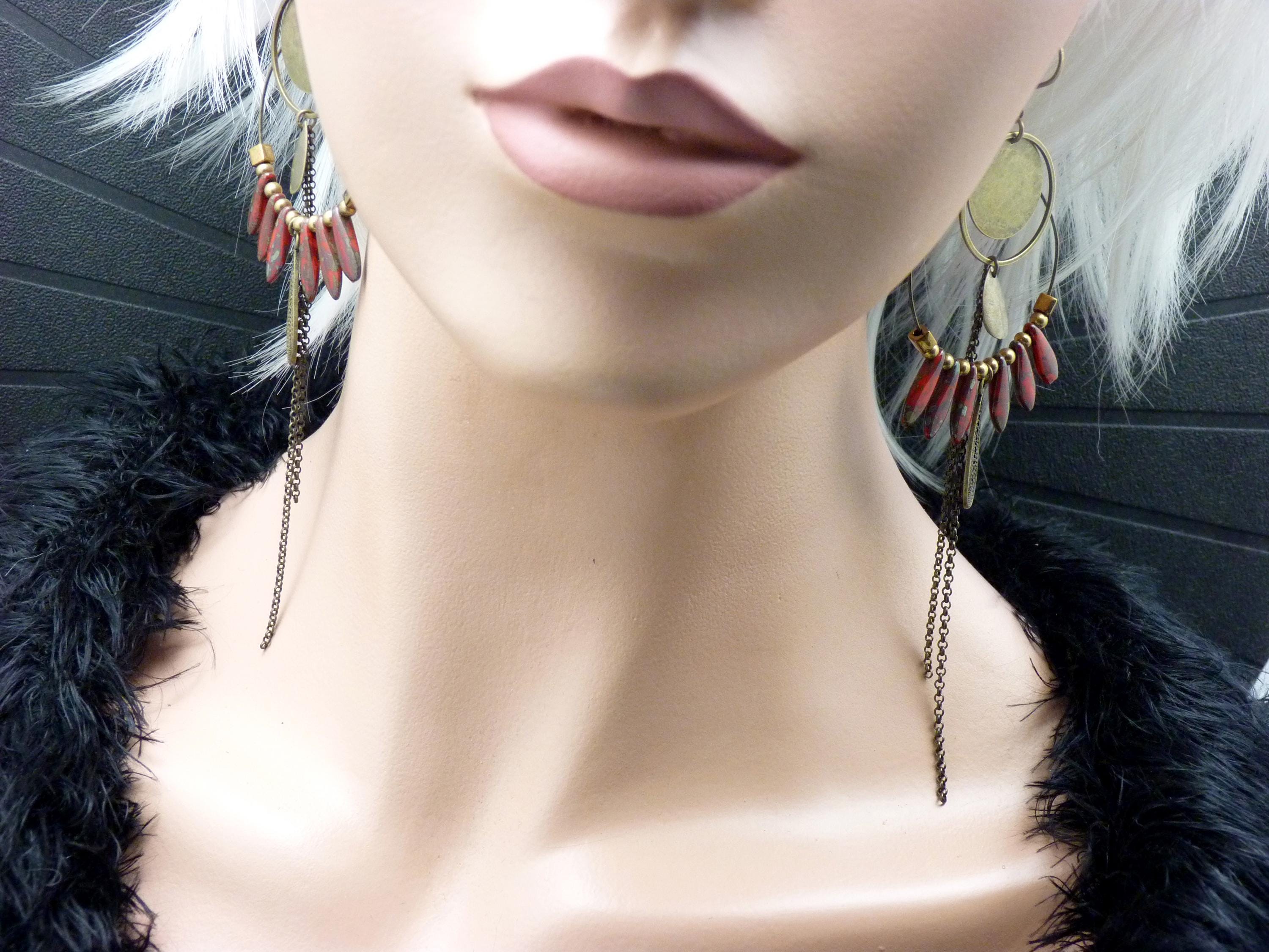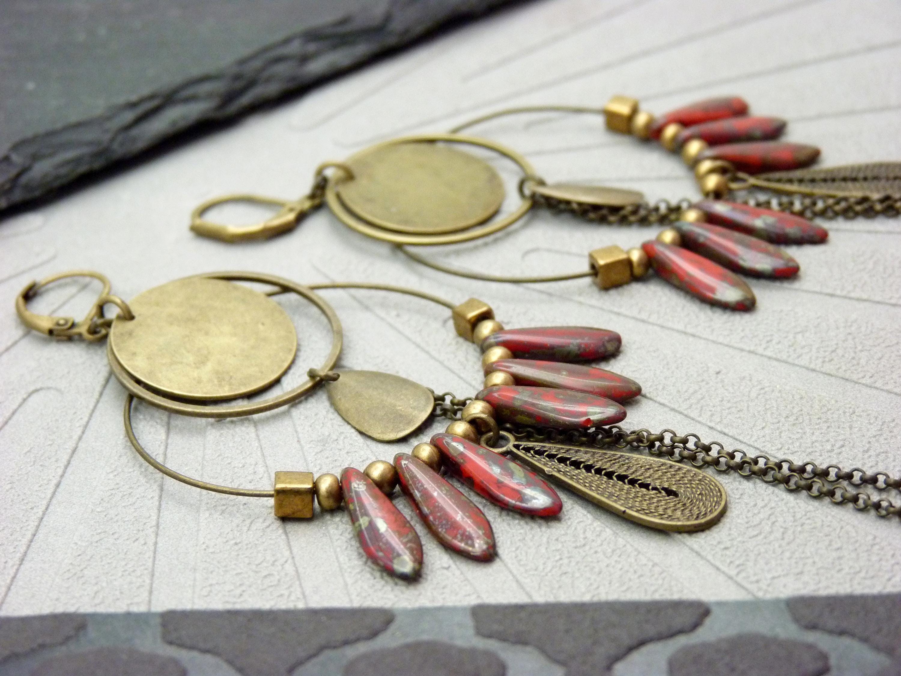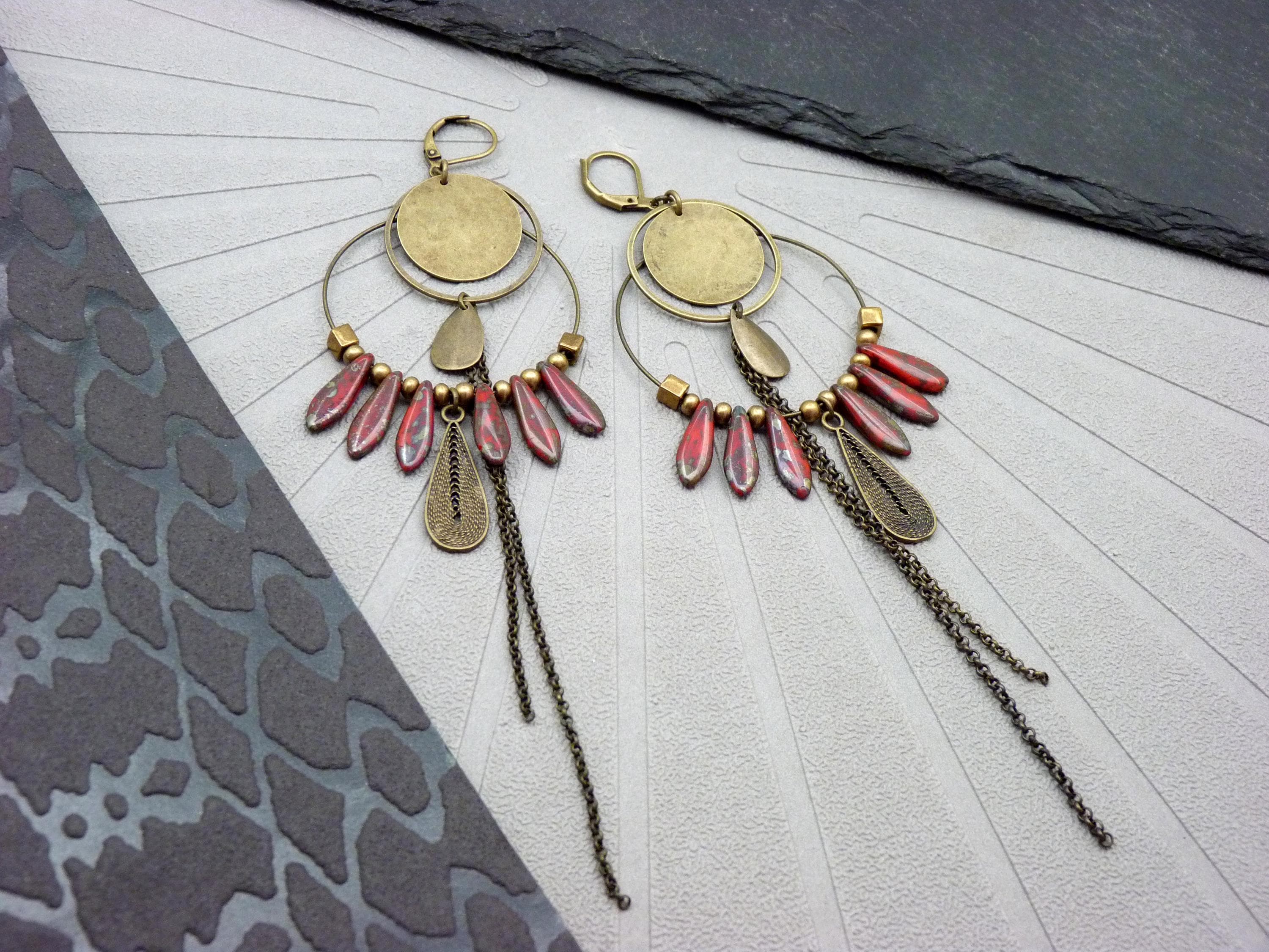 A pair of bohemian hoop earrings where antique bronze embraces marbled red glass, in a cascade of chains that never goes unnoticed.