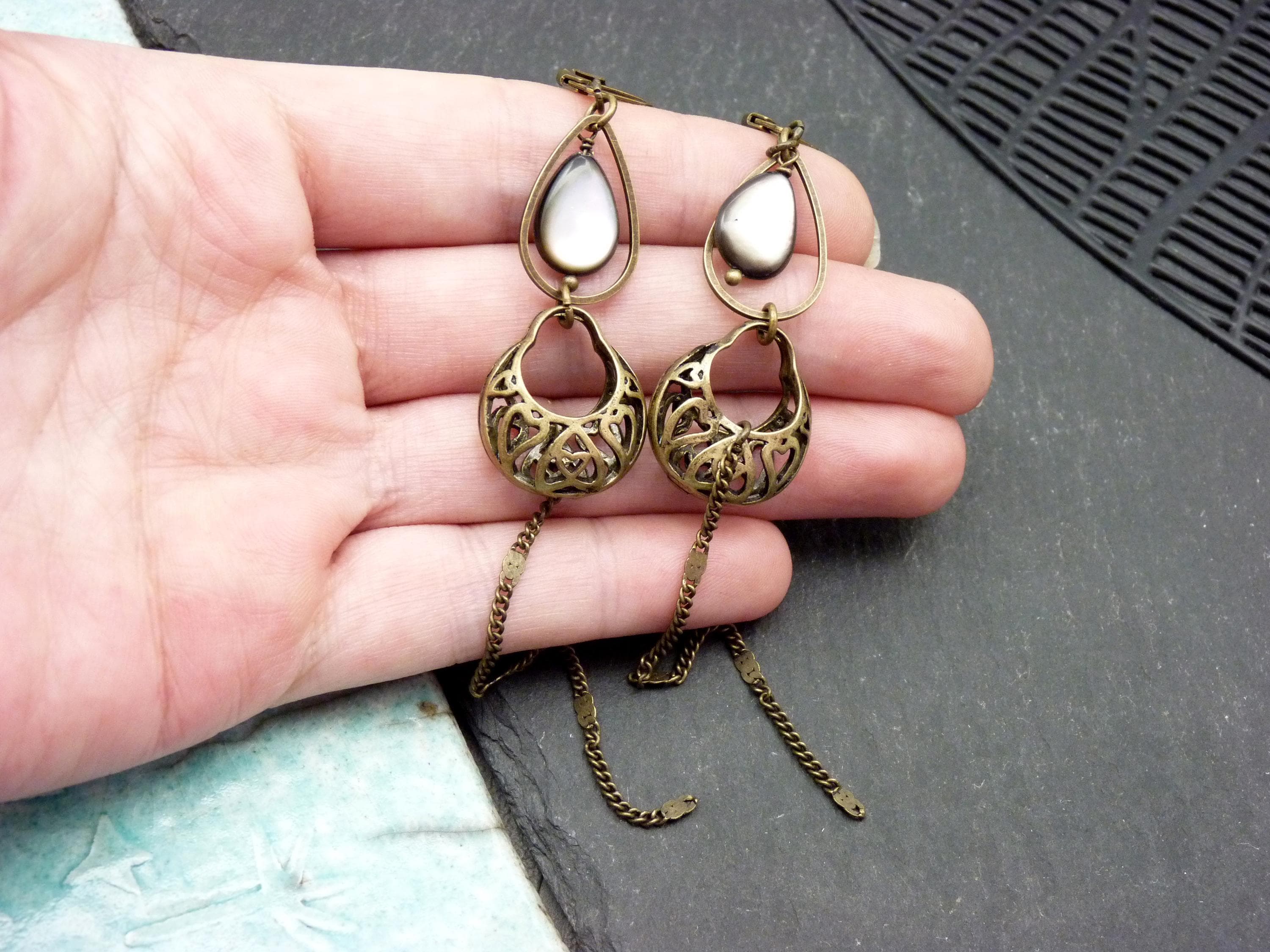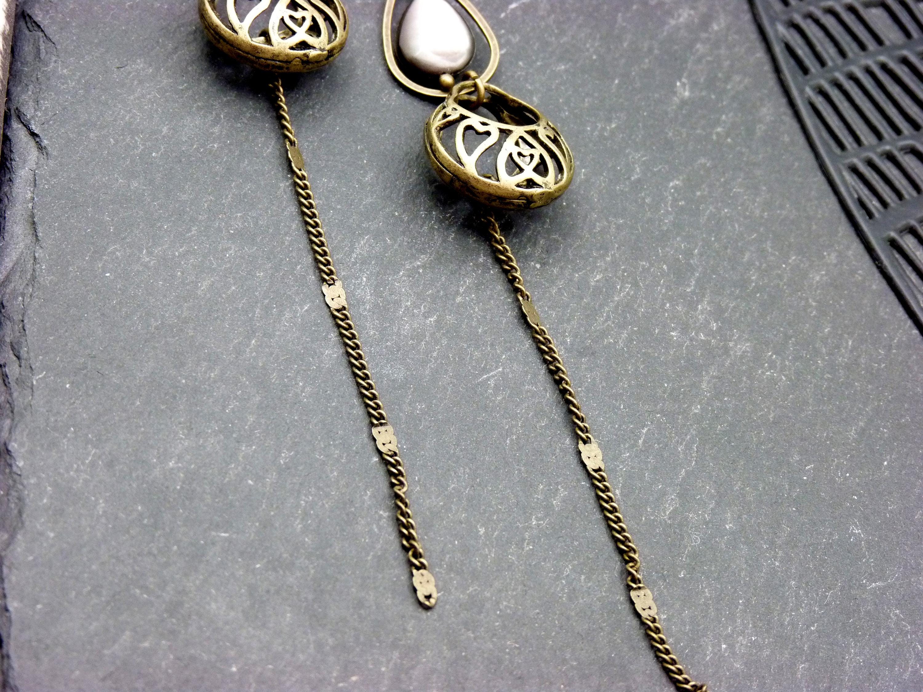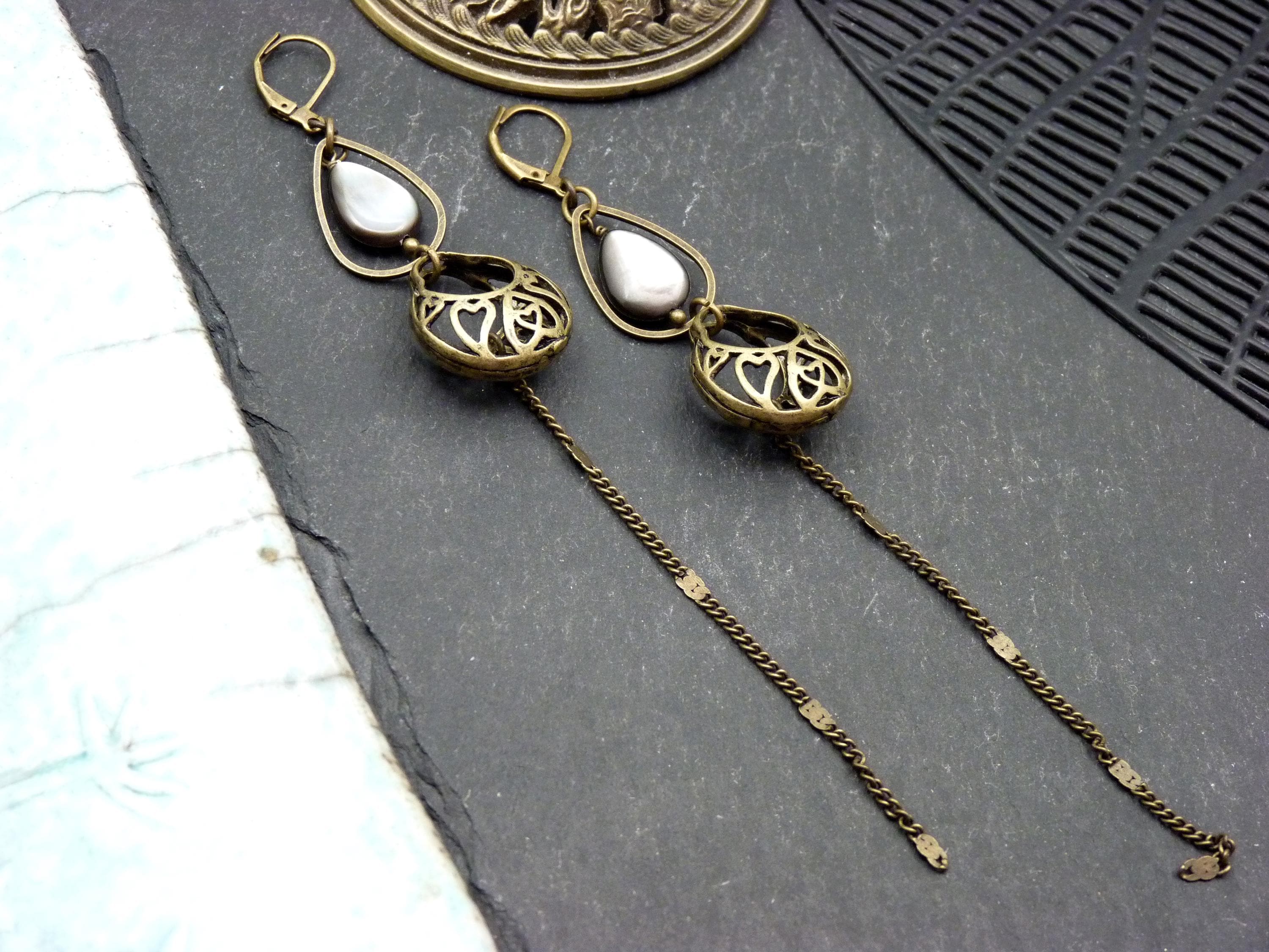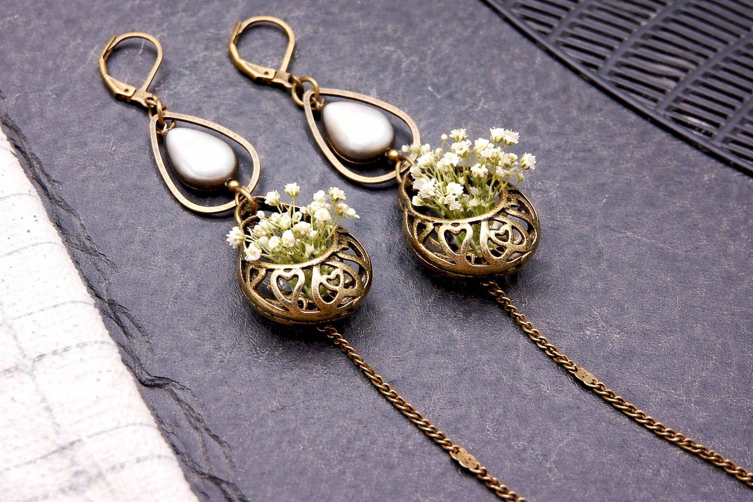 A pair of long earrings where mother-of-pearl meets antique bronze, with a delicate secret at the end: a small filigree basket ready to hold a fresh or dried flower according to your wishes.