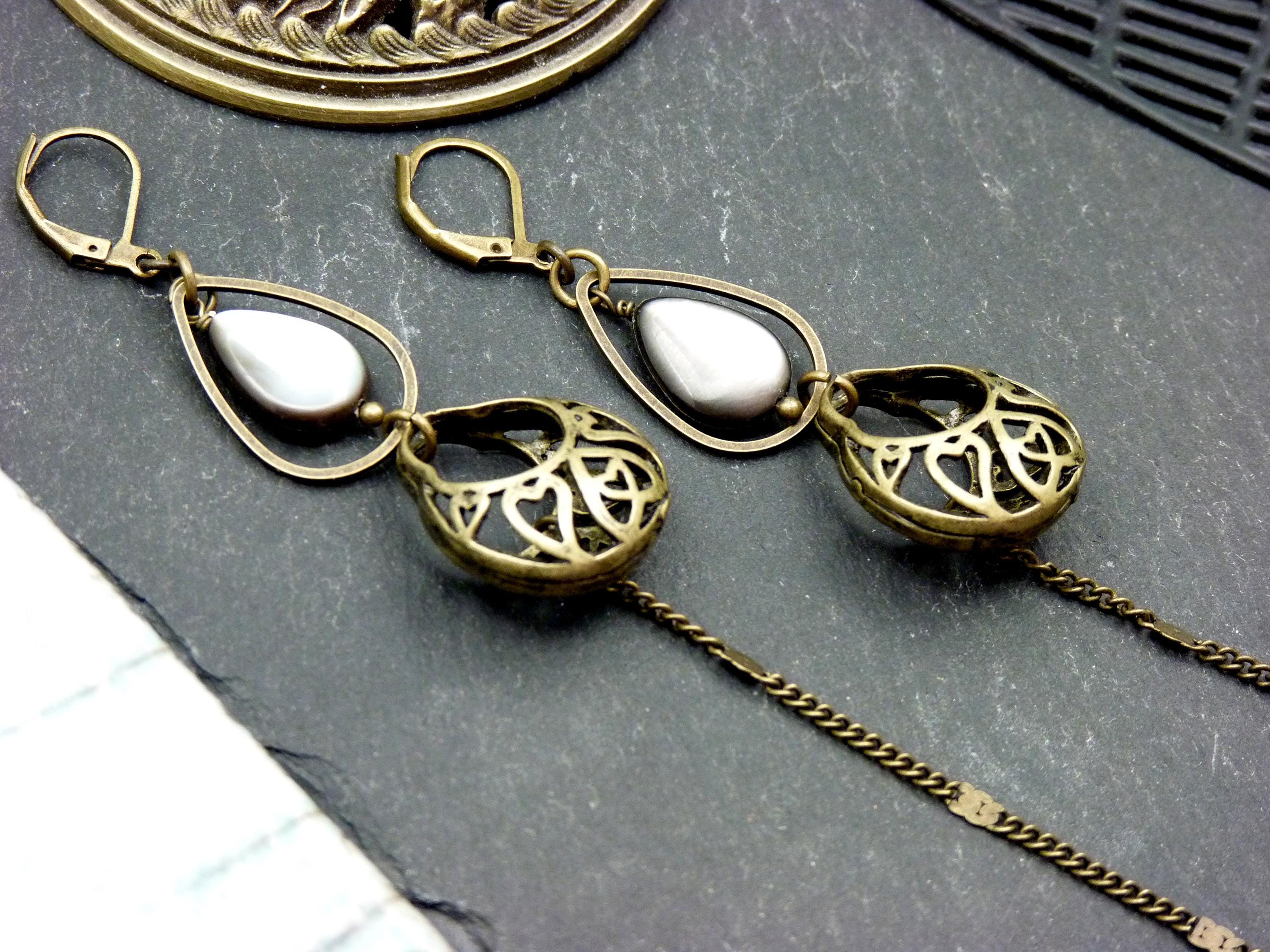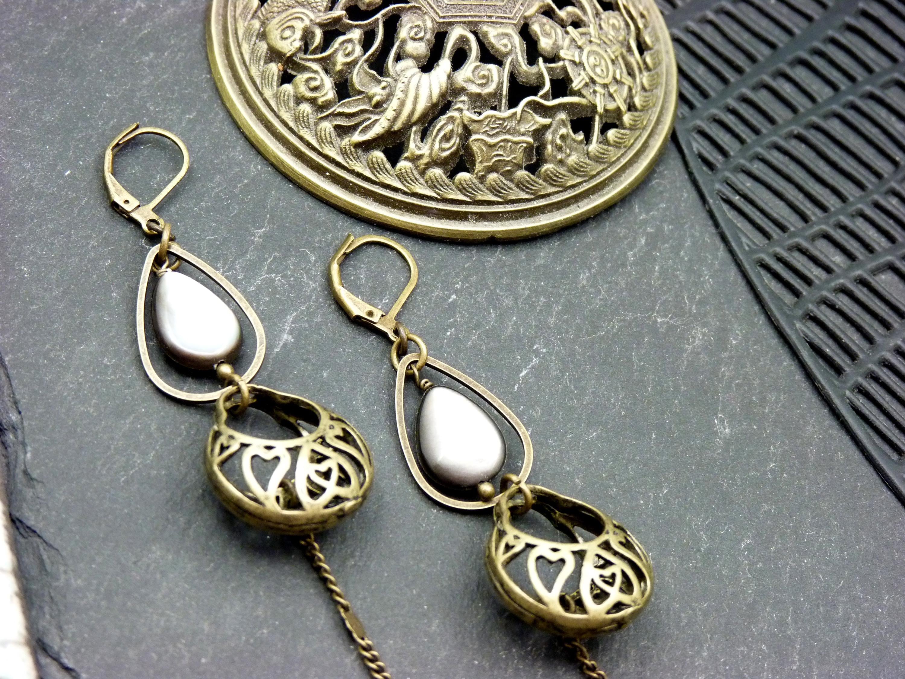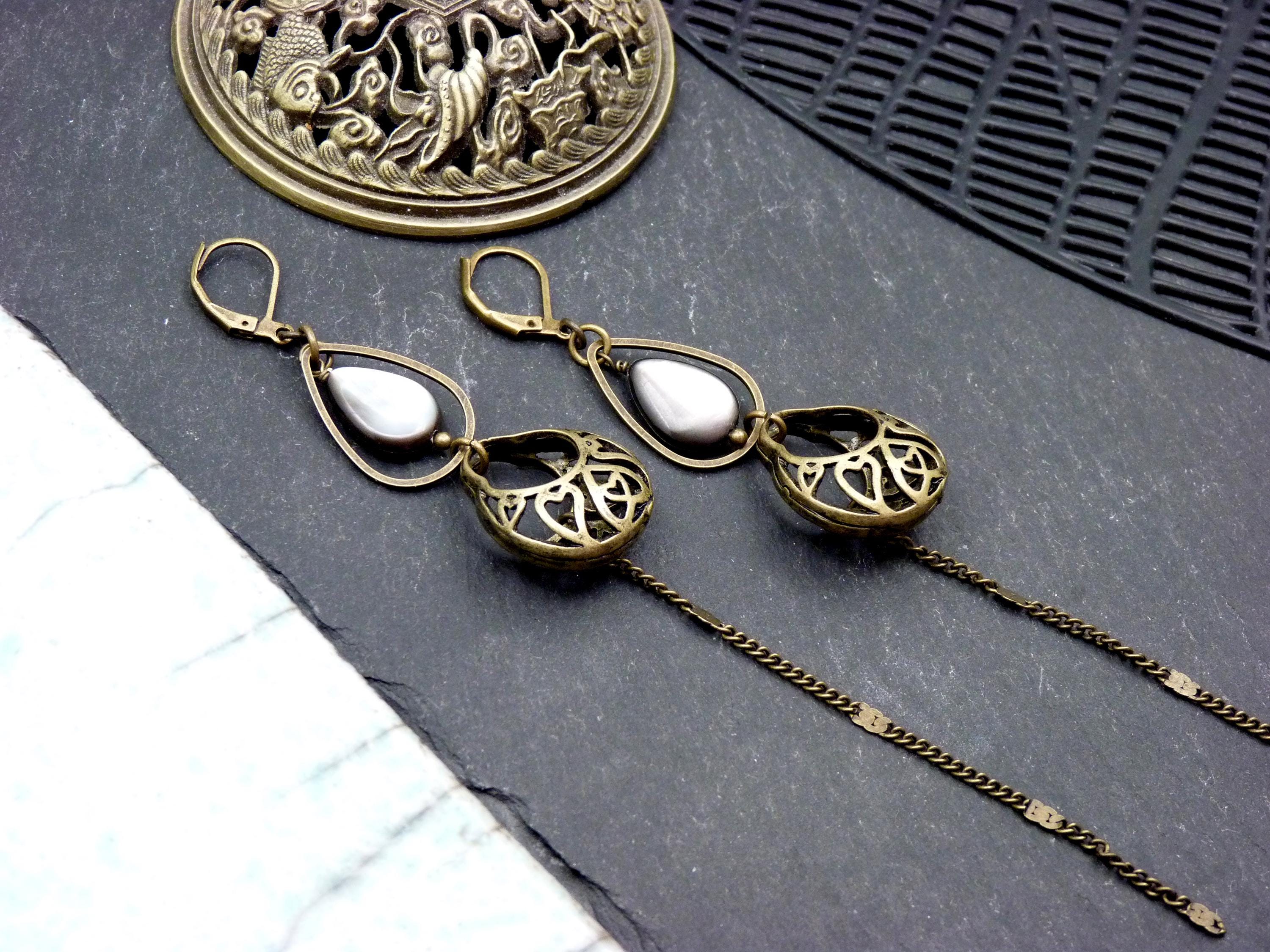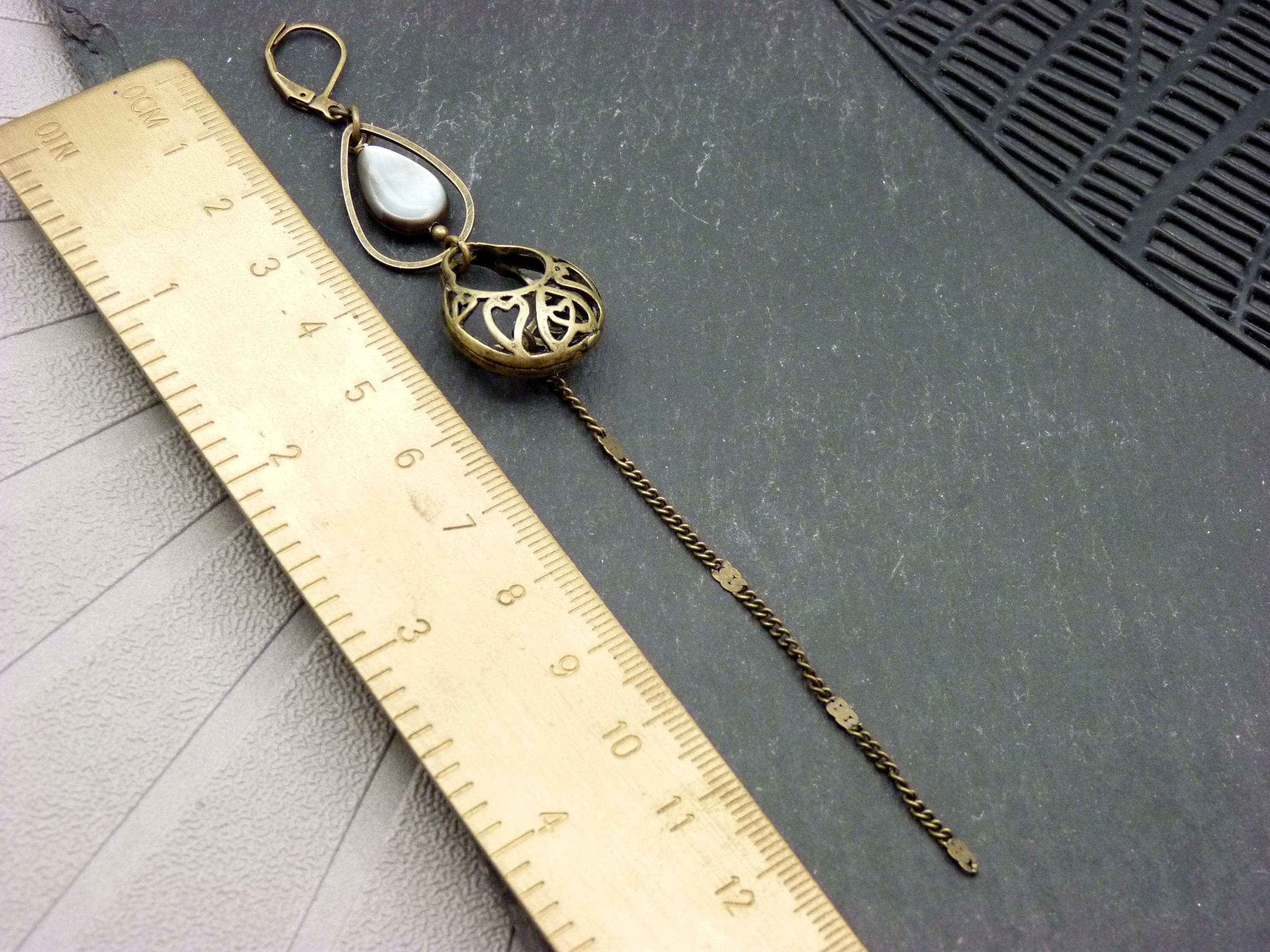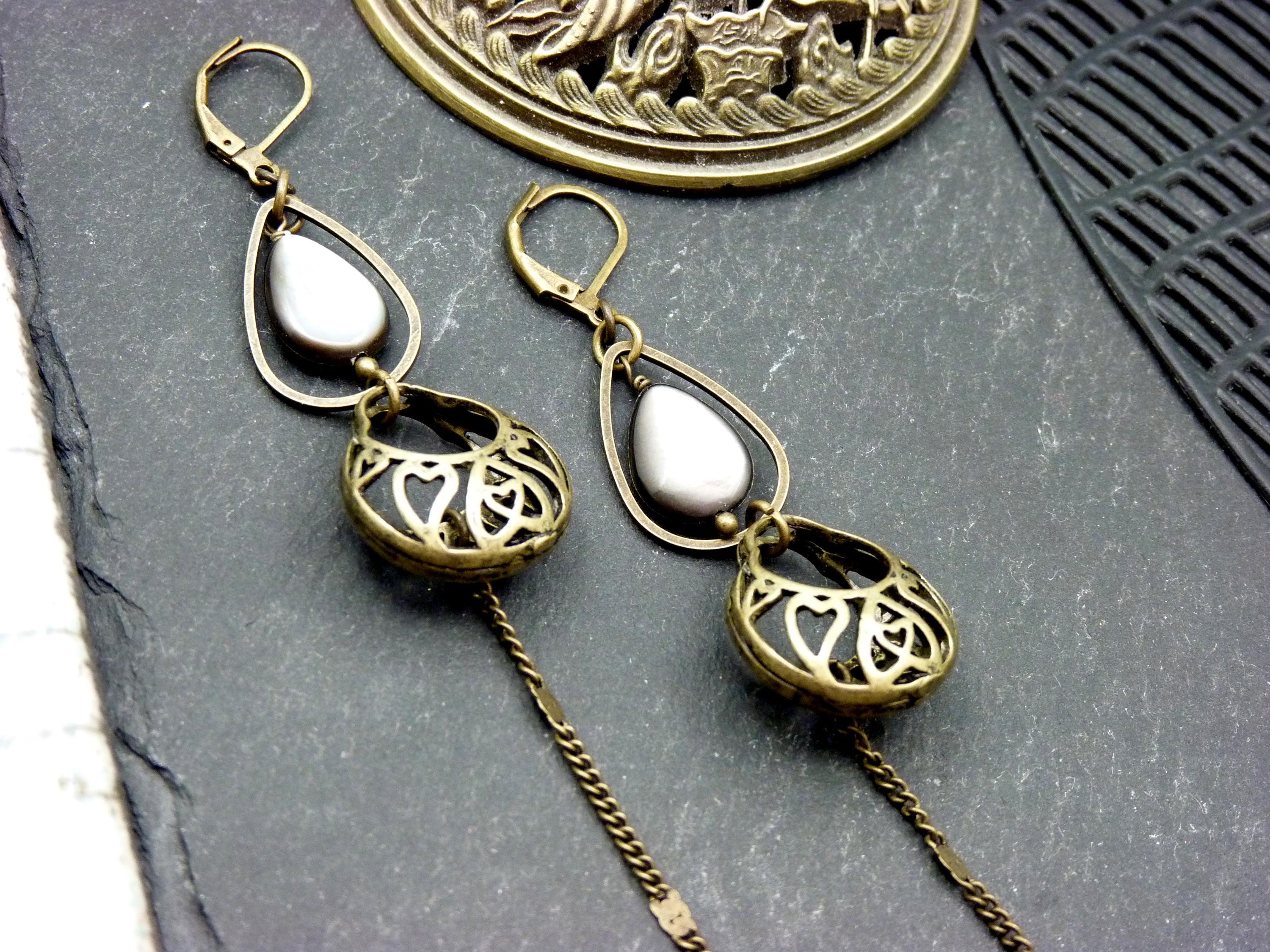 A pair of long earrings where mother-of-pearl meets antique bronze, with a delicate secret at the end: a small filigree basket ready to hold a fresh or dried flower according to your wishes.