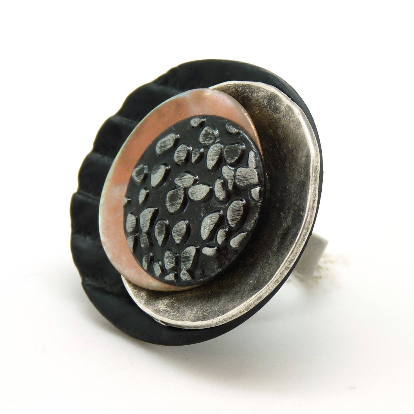 Large textured black ring with an aged silver piece, a peach-colored mother-of-pearl and in the center a gunmetal-colored metal element, with a pattern like small pieces of inlaid metal.